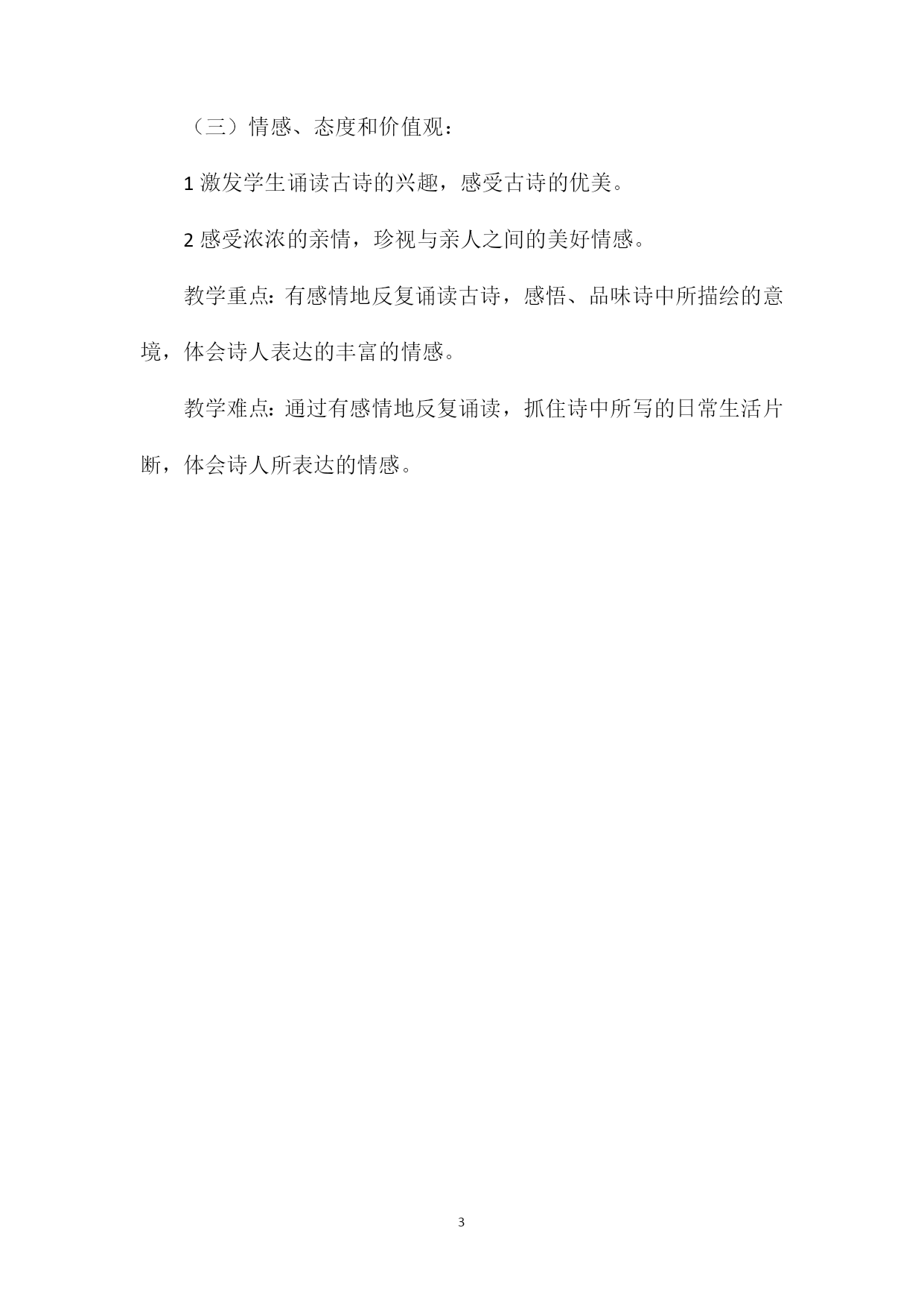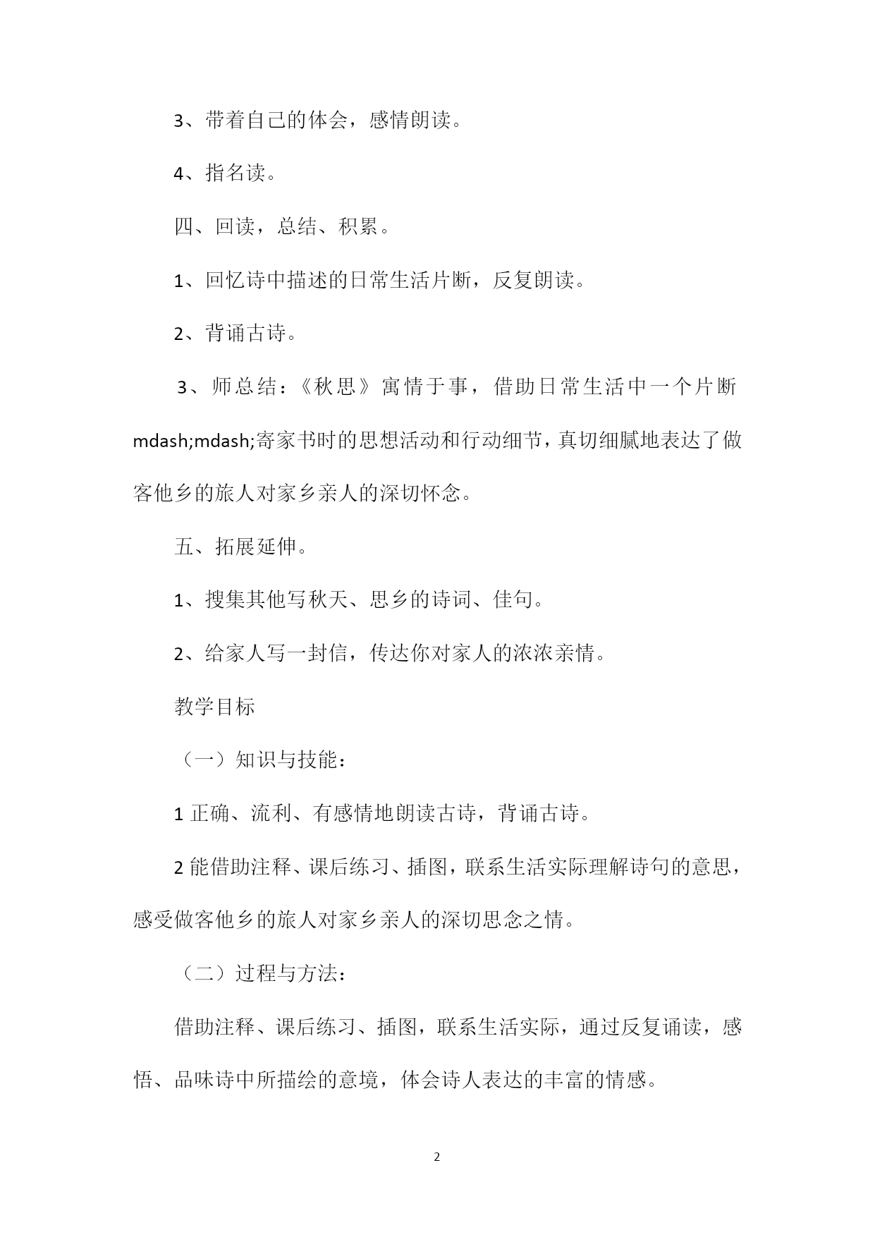 PAGEPAGE3《秋思》教学设计教学过程:一、谈话导入,激发学习兴趣。1、在这秋高气爽的季节,今天,我们切合时宜地来学习一首和秋季有关的诗mdash;mdash;《秋思》。2、板书:秋思。齐读。3、释题:说说你对秋思的理解,再带着你体会到的感情读题。4、质疑:对了这一诗题,你又有什么想要问的吗?二、初读,整体感知。1、自由读诗,读准字音,读通句子。2、指名读,评读。3、反复朗读,思考:这首诗写了一件什么事?表达了作者怎样的情感?4、互动交流。三、品读,感悟情感。1、默读,思考:你从这首诗的哪些地方体会出作者对家乡亲人的深切思念?2、互动交流:(见秋风;意万重;复恐、不尽;又开封)3、带着自己的体会,感情朗读。4、指名读。四、回读,总结、积累。1、回忆诗中描述的日常生活片断,反复朗读。2、背诵古诗。3、师总结:《秋思》寓情于事,借助日常生活中一个片断mdash;mdash;寄家书时的思想活动和行动细节,真切细腻地表达了做客他乡的旅人对家乡亲人的深切怀念。五、拓展延伸。1、搜集其他写秋天、思乡的诗词、佳句。2、给家人写一封信,传达你对家人的浓浓亲情。教学目标(一)知识与技能:1正确、流利、有感情地朗读古诗,背诵古诗。2能借助注释、课后练习、插图,联系生活实际理解诗句的意思,感受做客他乡的旅人对家乡亲人的深切思念之情。(二)过程与方法:借助注释、课后练习、插图,联系生活实际,通过反复诵读,感悟、品味诗中所描绘的意境,体会诗人表达的丰富的情感。(三)情感、态度和价值观:1激发学生诵读古诗的兴趣,感受古诗的优美。2感受浓浓的亲情,珍视与亲人之间的美好情感。教学重点:有感情地反复诵读古诗,感悟、品味诗中所描绘的意境,体会诗人表达的丰富的情感。教学难点:通过有感情地反复诵读,抓住诗中所写的日常生活片断,体会诗人所表达的情感。