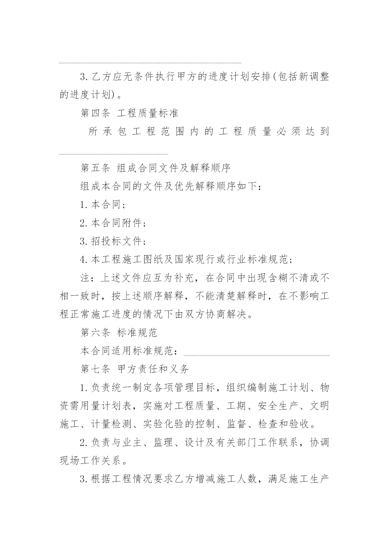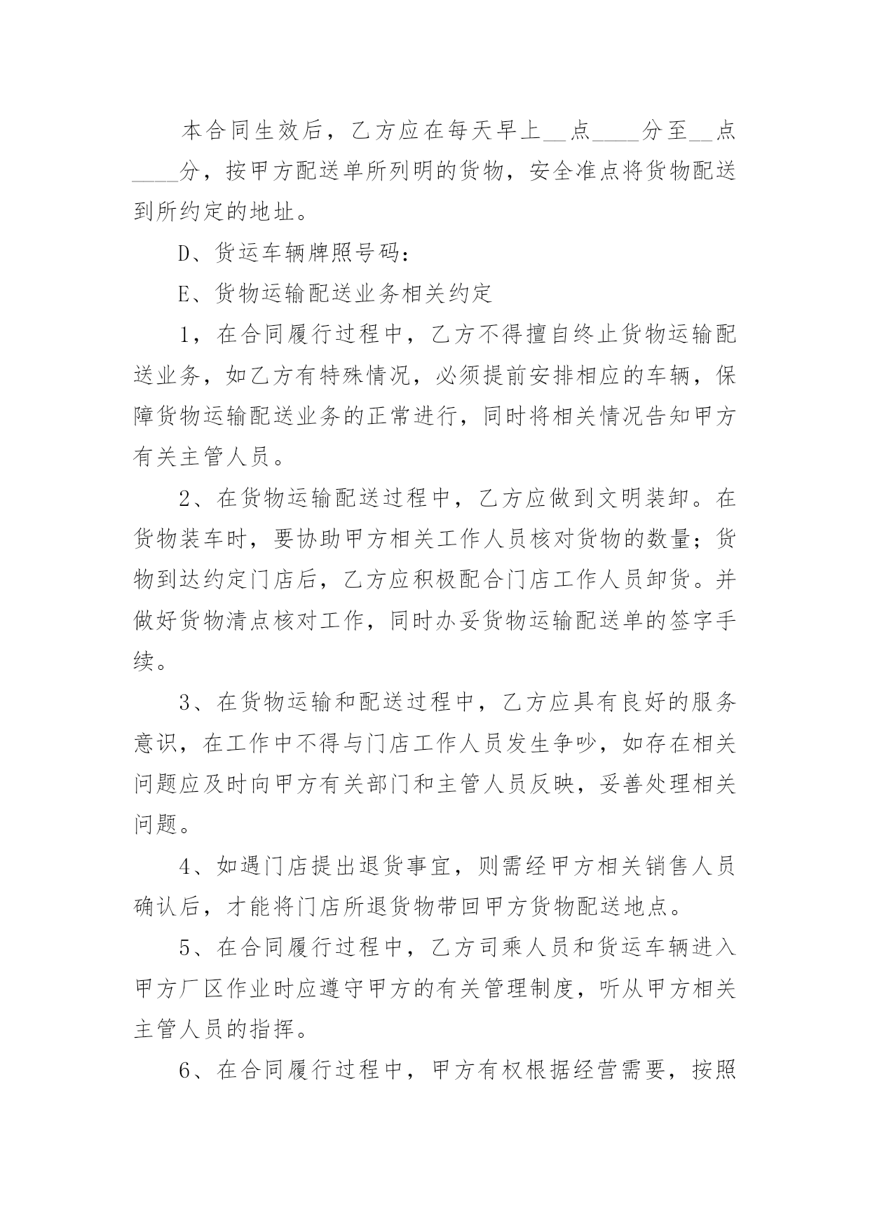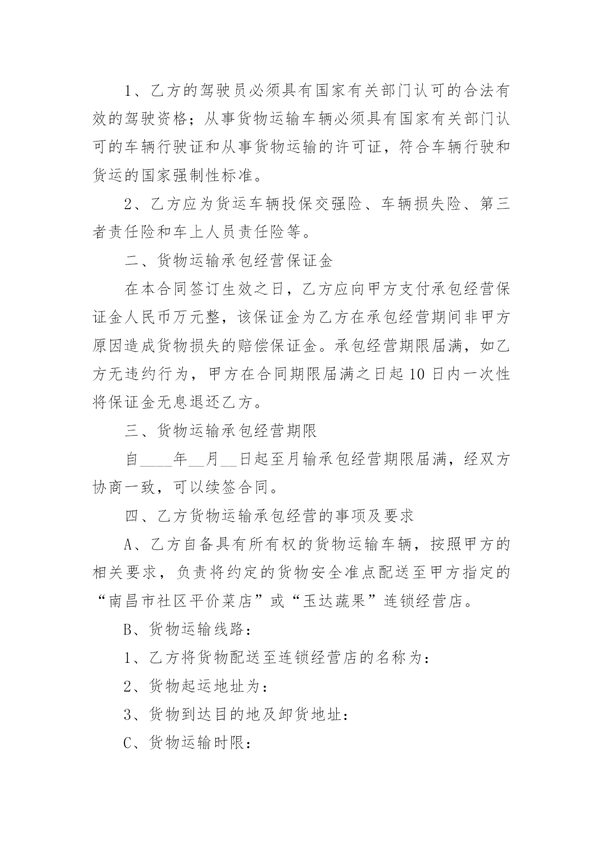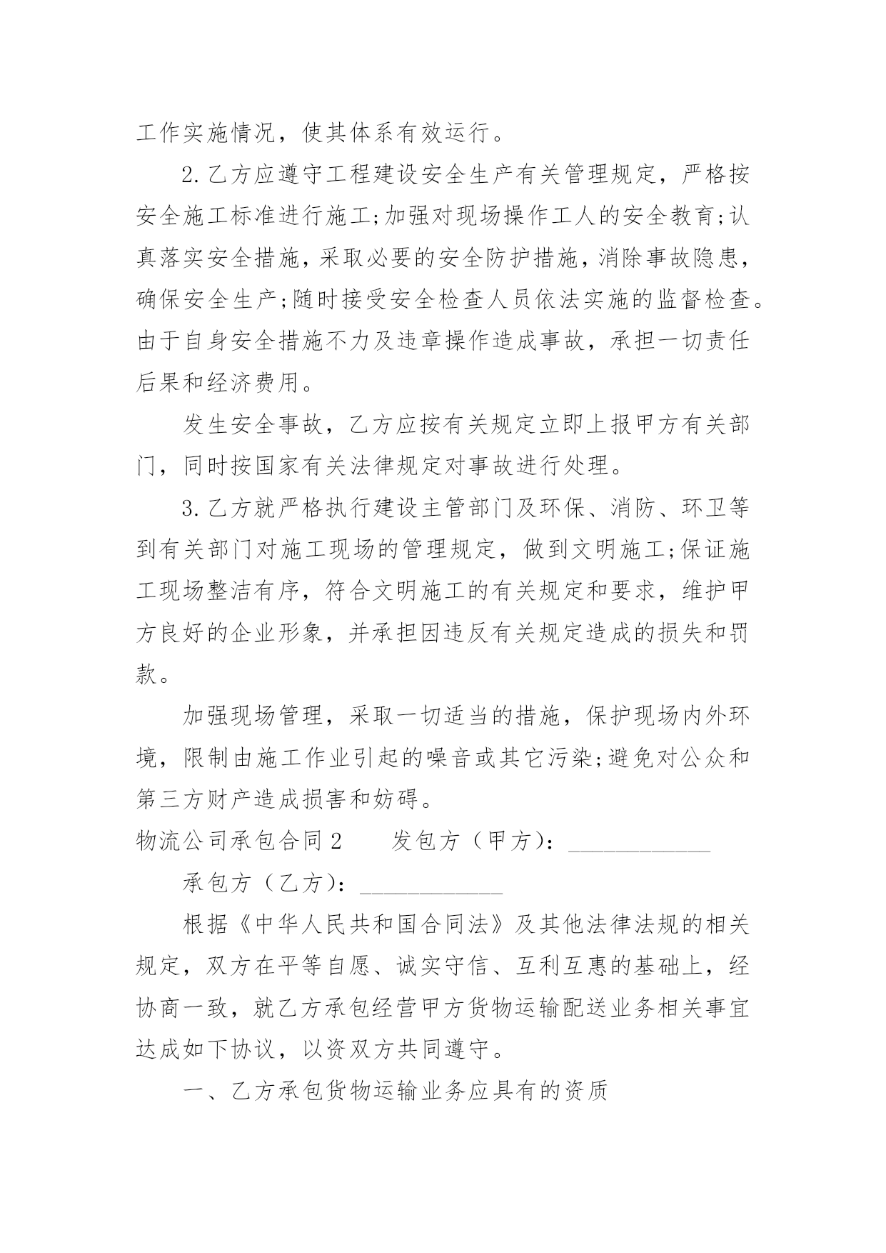 物流公司承包合同物流公司承包合同在当今不断发展的世界,随时随地,各种场景都有可能使用到合同,正常情况下,签订合同必须经过规定的方式。那么合同要怎么拟定?想必这让大家都很苦恼吧,以下是小编整理的物流公司承包合同,仅供参考,欢迎大家阅读。物流公司承包合同1甲方:__________________乙方:__________________依照《中华人民共和国合同法》及国家相关法律、法规和公司文件相关规定,遵循平等、自愿、公平和诚信的原则,甲、乙双方就_______(工程)劳力施工承包事宜协商达成一致。订立本合同。第一条工程概况工程名称:______________工程地点:______________第二条工程承包范围___________________________________第三条工程工期1.计划开工日期:_______年_______月_______日,计划完工日期:_______年_______月_______日,总日历天数_______天;2.主要节点工期:___________________________________3.乙方应无条件执行甲方的进度计划安排(包括新调整的进度计划)。第四条工程质量标准所承包工程范围内的工程质量必须达到_____________________第五条组成合同文件及解释顺序组成本合同的文件及优先解释顺序如下:1.本合同;2.本合同附件;3.招投标文件;4.本工程施工图纸及国家现行或行业标准规范;注:上述文件应互为补充,在合同中出现含糊不清或不相一致时,按上述顺序解释,不能清楚解释时,在不影响工程正常施工进度的情况下由双方协商解决。第六条标准规范本合同适用标准规范:____________________________第七条甲方责任和义务1.负责统一制定各项管理目标,组织编制施工计划、物资需用量计划表,实施对工程质量、工期、安全生产、文明施工、计量检测、实验化验的控制、监督、检查和验收。2.负责与业主、监理、设计及有关部门工作联系,协调现场工作关系。3.根据工程情况要求乙方增减施工人数,满足施工生产需要。对施工质量底劣、技术差、不服从指挥、有违法乱纪行为的人员予以清退。4.及时提供由甲方供应的施工机械设备、周转材料。5.按本合同约定,向乙方支付劳动报酬。6.统筹安排、协调解决乙方施工人员生活临时设施、用水、用______________其费用:7.协助乙方办理现场施工人员出入证件,其费用由乙方自理。第八条乙方责任和义务1.遵守国家政策和法律法规;遵守业主和甲方企业的相关规章制度,做好安全、文明施工、环境和职业健康安全、劳动保护等工作。2.严格按照设计图纸、施工验收规范、有关技术要求及施工组织设计精心组织施工,确保工程质量达到约定的标准,对本合同劳务承包范围内的工程质量向甲方负责;根据业主或甲方的计划要求(包括调整后的计划),合理组织,科学安排作业计划,投入足够的人力、物物力、保证工期;承担由于自身责任造成的质量返修、工期拖延损失及各种罚款。3.应按招标文件要求和承诺的管理人员、安全员(持证)保质保量到位。技术工人必须按国家规定持上岗,技工必须有职业技能操作证,持证率达到100%。特殊工种必须有特种作业操作证,持证率达到100%4.服从甲方和业主的监督、检查、管理;接受甲方和业主有关人员对质量、进度、技术、安全生产、文明施工、环境保护等方面的管理:接受甲方随时检查其设备、材料保管、使用情况及其操作人员的有效证件、持证上岗情况;5.做好施工场地周围建筑物、构筑物和地下管线和已完工程部分的成品保护工作。因乙方责任发生损坏,应自行承担由此引起的一切经济损失及各种罚款:6.按甲方统一规划堆放材料、机具;妥善保管、合理使用甲方提供或租赁给乙方使用的机具、周转材料及其他设施:7.按国家政策规定与每个务工人员签订《劳动合同》并按合同所约定的条款支付务工人员工资(务工人员工资每月造册备案),承担因此项工作不到位而引起的纠纷或当地相关行政部门的处罚及责任后果;8.为其施工人配备必要的劳动保护和安全防护用品(如安全帽、安全带、工作服、手套及其它相关的防护用品);9.进场施工人员要求具备思想素质好、身体健康、技术熟练等条件;禁止18岁以下的未成年人和55岁以上的老人及体弱病残人员;禁止使用不法人员,乙方应承担因使用以上不合格人员而引起的责任和后果。10.甲方在资金暂时不到位,业主未能按时拔付工程款的情况下,乙方不得因此而影响正常施工,不得聚众闹事,做到对甲方的谅解。第九条环境保护、安全生产和文明施工1.甲方应集中组织对乙方进场施工人员进行安全生产、文明施工、环境保护以及公司相关制度等方面的教育;依据国家法律法规及公司相关规章制度、监督、监控乙方的相关工作实施情况,使其体系有效运行。2.乙方应遵守工