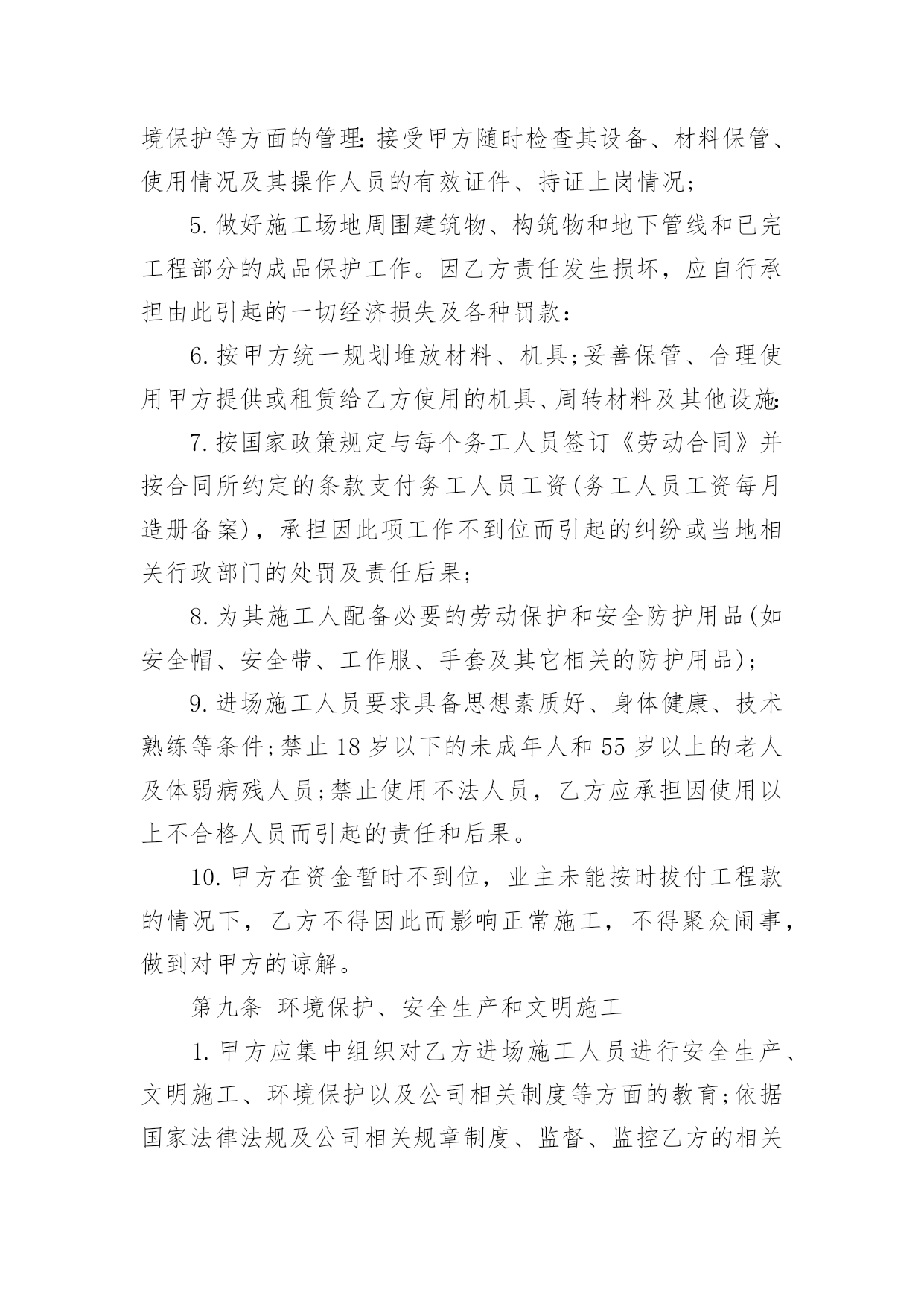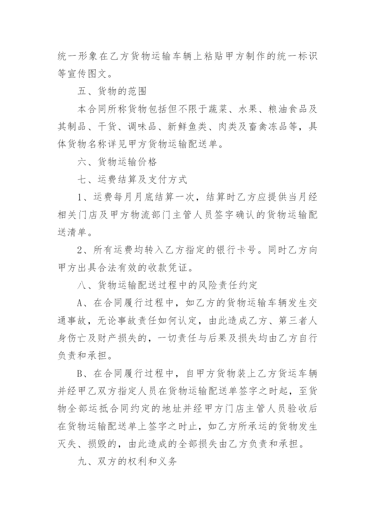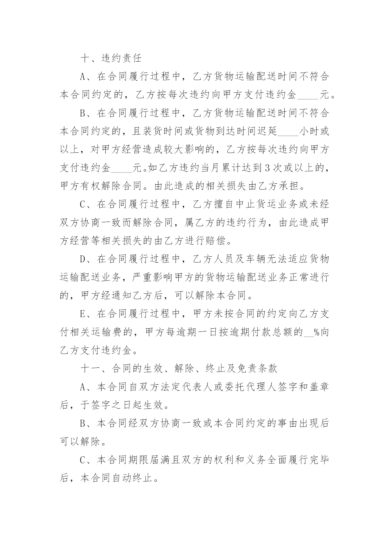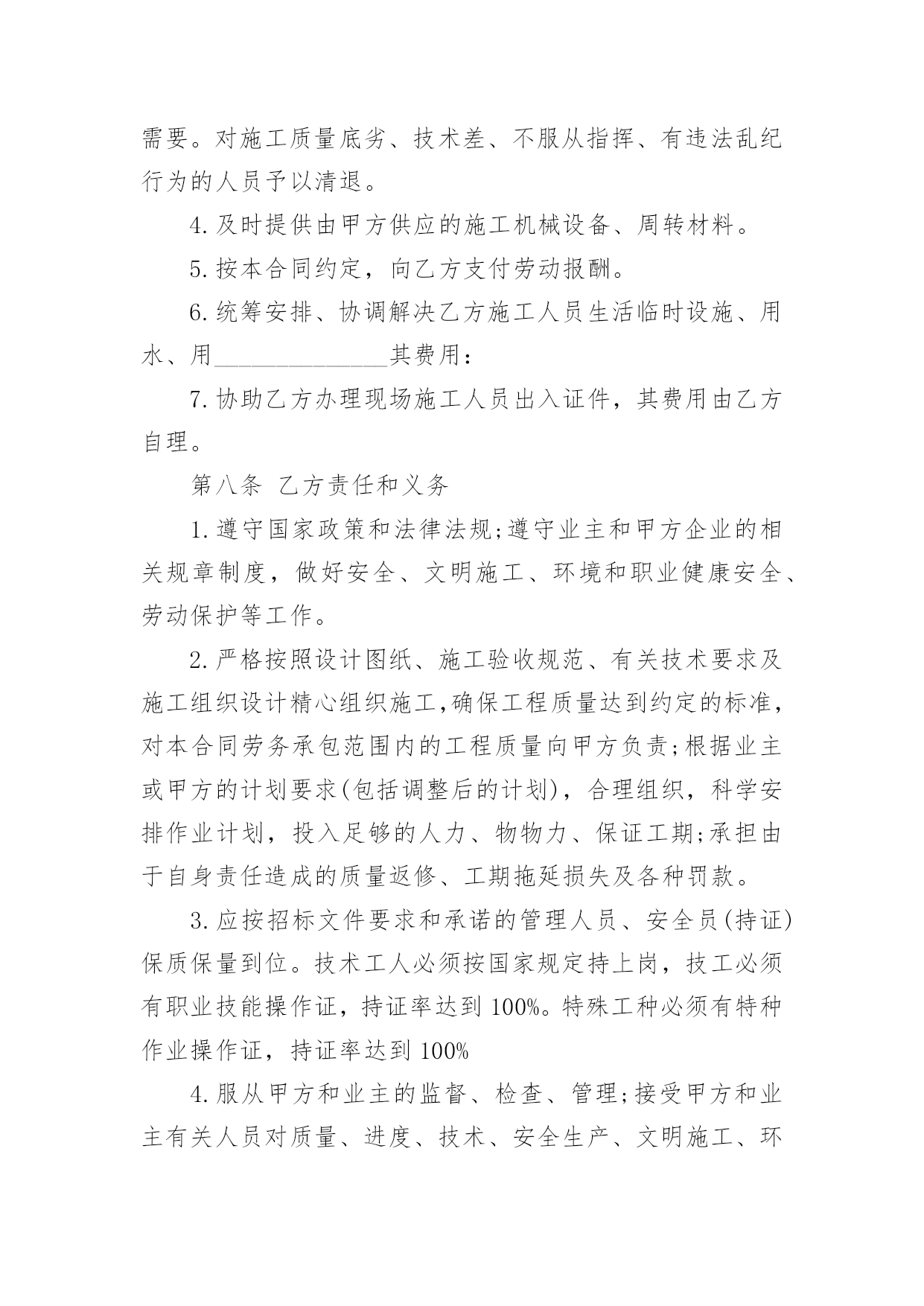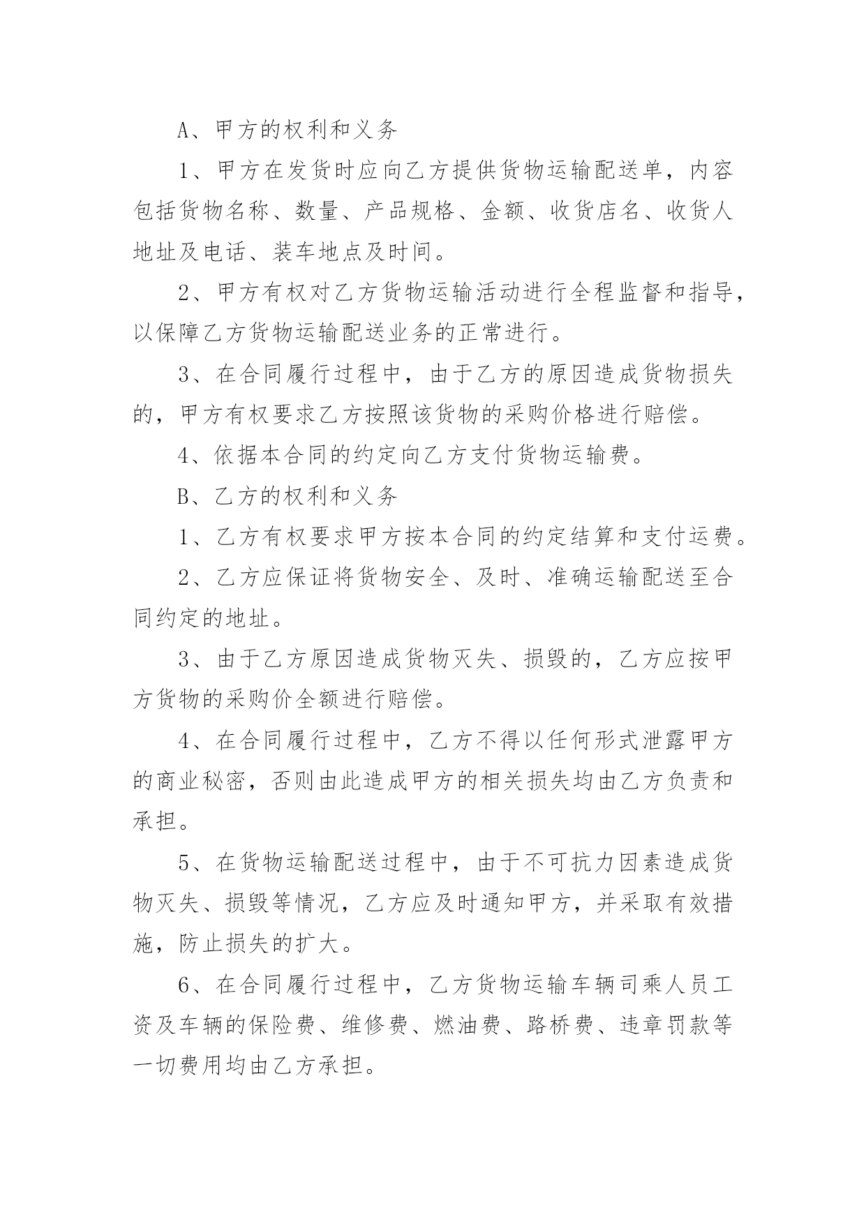 物流公司承包合同物流公司承包合同在当今不断发展的世界,随时随地,各种场景都有可能使用到合同,正常情况下,签订合同必须经过规定的方式。那么合同要怎么拟定?想必这让大家都很苦恼吧,以下是小编整理的物流公司承包合同,仅供参考,欢迎大家阅读。物流公司承包合同1甲方:__________________乙方:__________________依照《中华人民共和国合同法》及国家相关法律、法规和公司文件相关规定,遵循平等、自愿、公平和诚信的原则,甲、乙双方就_______(工程)劳力施工承包事宜协商达成一致。订立本合同。第一条工程概况工程名称:______________工程地点:______________第二条工程承包范围___________________________________第三条工程工期1.计划开工日期:_______年_______月_______日,计划完工日期:_______年_______月_______日,总日历天数_______天;2.主要节点工期:___________________________________3.乙方应无条件执行甲方的进度计划安排(包括新调整的进度计划)。第四条工程质量标准所承包工程范围内的工程质量必须达到_____________________第五条组成合同文件及解释顺序组成本合同的文件及优先解释顺序如下:1.本合同;2.本合同附件;3.招投标文件;4.本工程施工图纸及国家现行或行业标准规范;注:上述文件应互为补充,在合同中出现含糊不清或不相一致时,按上述顺序解释,不能清楚解释时,在不影响工程正常施工进度的情况下由双方协商解决。第六条标准规范本合同适用标准规范:____________________________第七条甲方责任和义务1.负责统一制定各项管理目标,组织编制施工计划、物资需用量计划表,实施对工程质量、工期、安全生产、文明施工、计量检测、实验化验的控制、监督、检查和验收。2.负责与业主、监理、设计及有关部门工作联系,协调现场工作关系。3.根据工程情况要求乙方增减施工人数,满足施工生产需要。对施工质量底劣、技术差、不服从指挥、有违法乱纪行为的人员予以清退。4.及时提供由甲方供应的施工机械设备、周转材料。5.按本合同约定,向乙方支付劳动报酬。6.统筹安排、协调解决乙方施工人员生活临时设施、用水、用______________其费用:7.协助乙方办理现场施工人员出入证件,其费用由乙方自理。第八条乙方责任和义务1.遵守国家政策和法律法规;遵守业主和甲方企业的相关规章制度,做好安全、文明施工、环境和职业健康安全、劳动保护等工作。2.严格按照设计图纸、施工验收规范、有关技术要求及施工组织设计精心组织施工,确保工程质量达到约定的标准,对本合同劳务承包范围内的工程质量向甲方负责;根据业主或甲方的计划要求(包括调整后的计划),合理组织,科学安排作业计划,投入足够的人力、物物力、保证工期;承担由于自身责任造成的质量返修、工期拖延损失及各种罚款。3.应按招标文件要求和承诺的管理人员、安全员(持证)保质保量到位。技术工人必须按国家规定持上岗,技工必须有职业技能操作证,持证率达到100%。特殊工种必须有特种作业操作证,持证率达到100%4.服从甲方和业主的监督、检查、管理;接受甲方和业主有关人员对质量、进度、技术、安全生产、文明施工、环境保护等方面的管理:接受甲方随时检查其设备、材料保管、使用情况及其操作人员的有效证件、持证上岗情况;5.做好施工场地周围建筑物、构筑物和地下管线和已完工程部分的成品保护工作。因乙方责任发生损坏,应自行承担由此引起的一切经济损失及各种罚款:6.按甲方统一规划堆放材料、机具;妥善保管、合理使用甲方提供或租赁给乙方使用的机具、周转材料及其他设施:7.按国家政策规定与每个务工人员签订《劳动合同》并按合同所约定的条款支付务工人员工资(务工人员工资每月造册备案),承担因此项工作不到位而引起的纠纷或当地相关行政部门的处罚及责任后果;8.为其施工人配备必要的劳动保护和安全防护用品(如安全帽、安全带、工作服、手套及其它相关的防护用品);9.进场施工人员要求具备思想素质好、身体健康、技术熟练等条件;禁止18岁以下的未成年人和55岁以上的老人及体弱病残人员;禁止使用不法人员,乙方应承担因使用以上不合格人员而引起的责任和后果。10.甲方在资金暂时不到位,业主未能按时拔付工程款的情况下,乙方不得因此而影响正常施工,不得聚众闹事,做到对甲方的谅解。第九条环境保护、安全生产和文明施工1.甲方应集中组织对乙方进场施工人员进行安全生产、文明施工、环境保护以及公司相关制度等方面的教育;依据国家法律法规及公司相关规章制度、监督、监控乙方的相关工作实施情况,使其体系有效运行。2.乙方应遵守工