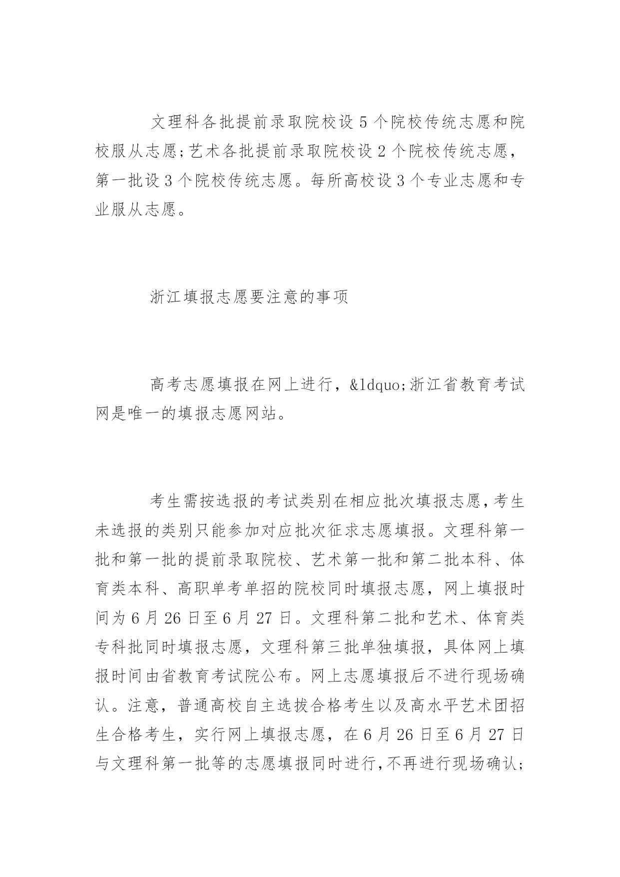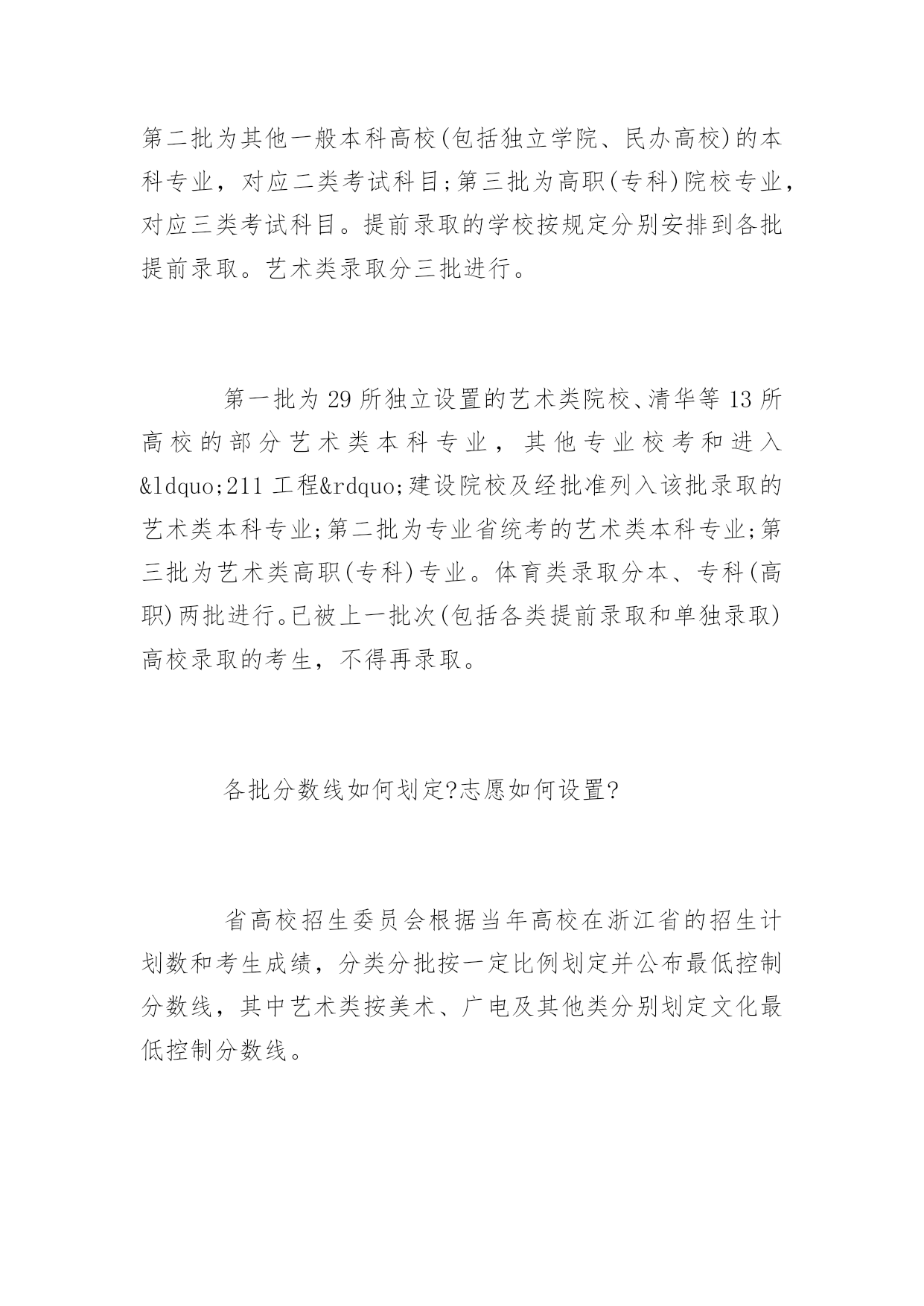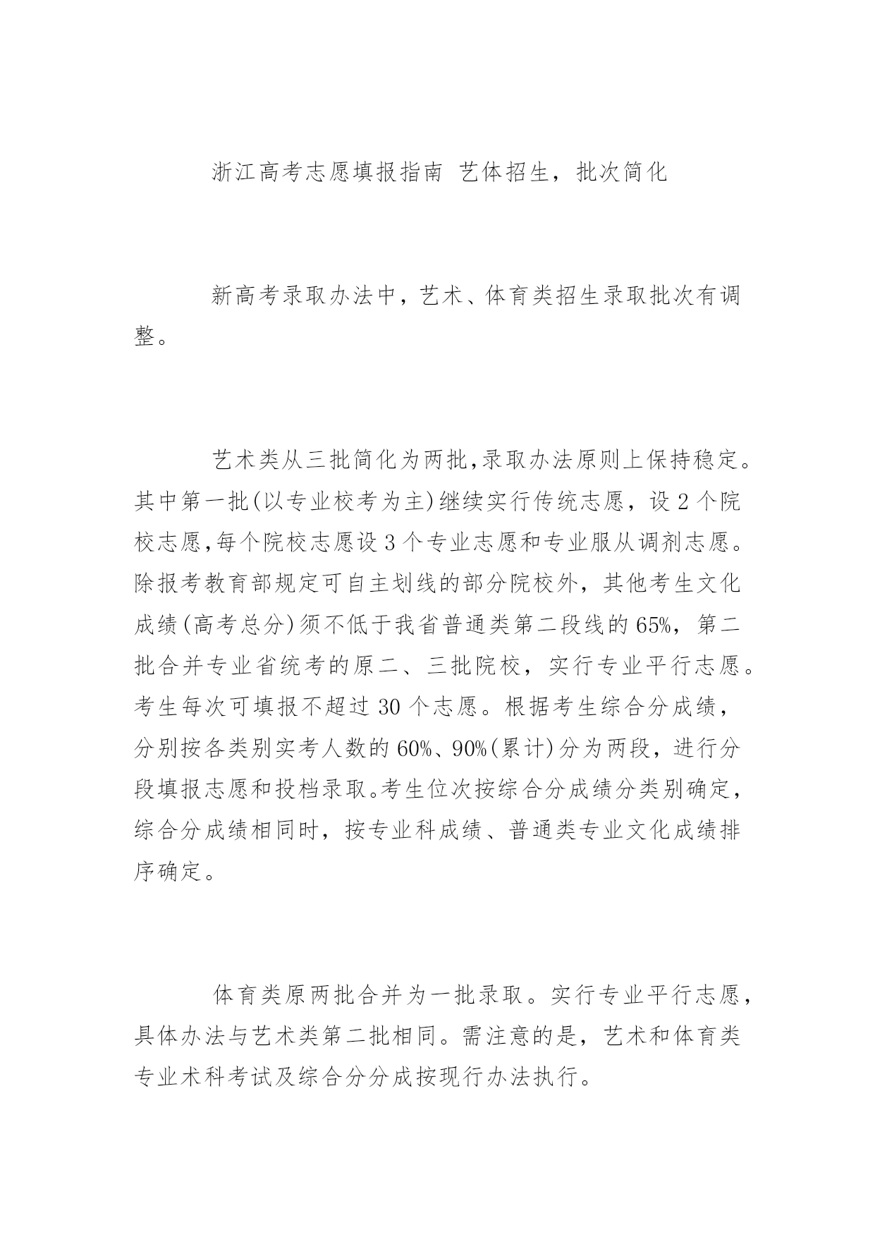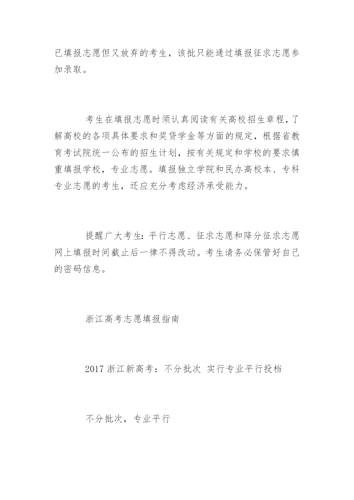 浙江高考志愿填报指导浙江高考志愿填报指导高考志愿填报方式是高考招生录取制度的一部分,采用何种方式作为我国高考志愿填报方式,成为当前热门话题,引起社会各界的广泛关注和一定范围的争议。下面是阳光网小编为你整理的浙江高考志愿填报指导内容,希望对你有帮助。浙江高考志愿填报指导网上填报志愿如何进行录取?普通高校招生录取工作实行分类分批划定并公布分数线、分批填报志愿、分批录取。录取分批次进行文理科统一招生录取工作分三批进行,分别对应三个考试类别科目组。第一批为“985”、“211”高校和经批准列入该批的本科高校专业,对应一类考试科目;第二批为其他一般本科高校(包括独立学院、民办高校)的本科专业,对应二类考试科目;第三批为高职(专科)院校专业,对应三类考试科目。提前录取的学校按规定分别安排到各批提前录取。艺术类录取分三批进行。第一批为29所独立设置的艺术类院校、清华等13所高校的部分艺术类本科专业,其他专业校考和进入“211工程”建设院校及经批准列入该批录取的艺术类本科专业;第二批为专业省统考的艺术类本科专业;第三批为艺术类高职(专科)专业。体育类录取分本、专科(高职)两批进行。已被上一批次(包括各类提前录取和单独录取)高校录取的考生,不得再录取。各批分数线如何划定?志愿如何设置?省高校招生委员会根据当年高校在浙江省的招生计划数和考生成绩,分类分批按一定比例划定并公布最低控制分数线,其中艺术类按美术、广电及其他类分别划定文化最低控制分数线。第一次划定文理科第一批、艺术和体育类本科录取最低控制分数线,并确定其他各批最低控制分数线划线比例;后续其他各批最低控制分数线按照最接近确定比例的分数划定。志愿设置实行平行志愿和传统志愿相结合的方式。文理科第一至三批均设置平行志愿,各批的提前录取院校为传统志愿。艺术类第一批为传统志愿,艺术类第二、三批和体育类的本、专科批均为平行志愿。根据平行志愿录取情况,对未完成招生计划的高校、专业,进行征求志愿。对平行志愿和征求志愿投档录取后仍未完成招生计划的高校、专业,视情进行降分征求志愿。各批平行志愿(即平行一志愿,下同)、征求志愿(即平行二志愿,下同)以及降分征求志愿(即平行三志愿,下同)均设置A、B、C、D、E等5个高校志愿(降分征求志愿另再增设院校服从志愿)。文理科每所高校均设6个专业志愿和专业服从志愿;艺术、体育类每所高校均设3个专业志愿和专业服从志愿。文理科各批提前录取院校设5个院校传统志愿和院校服从志愿;艺术各批提前录取院校设2个院校传统志愿,第一批设3个院校传统志愿。每所高校设3个专业志愿和专业服从志愿。浙江填报志愿要注意的事项高考志愿填报在网上进行,“浙江省教育考试网是唯一的填报志愿网站。考生需按选报的考试类别在相应批次填报志愿,考生未选报的类别只能参加对应批次征求志愿填报。文理科第一批和第一批的提前录取院校、艺术第一批和第二批本科、体育类本科、高职单考单招的院校同时填报志愿,网上填报时间为6月26日至6月27日。文理科第二批和艺术、体育类专科批同时填报志愿,文理科第三批单独填报,具体网上填报时间由省教育考试院公布。网上志愿填报后不进行现场确认。注意,普通高校自主选拔合格考生以及高水平艺术团招生合格考生,实行网上填报志愿,在6月26日至6月27日与文理科第一批等的志愿填报同时进行,不再进行现场确认;已填报志愿但又放弃的考生,该批只能通过填报征求志愿参加录取。考生在填报志愿时须认真阅读有关高校招生章程,了解高校的各项具体要求和奖贷学金等方面的规定,根据省教育考试院统一公布的招生计划,按有关规定和学校的要求慎重填报学校,专业志愿。填报独立学院和民办高校本、专科专业志愿的考生,还应充分考虑经济承受能力。提醒广大考生:平行志愿、征求志愿和降分征求志愿网上填报时间截止后一律不得改动。考生请务必保管好自己的密码信息。浙江高考志愿填报指南2017浙江新高考:不分批次实行专业平行投档不分批次,专业平行普通类招生录取改现行分批招生为不分批次。其中平行录取,改现行分批填报志愿和录取为按学生成绩分段填报志愿分段录取,改以院校为单位的平行志愿为以专业(类)为单位的平行志愿。按实考人数的一定比例分段填报志愿和投档录取,即根据高考总分,分别按实考人数的20%、60%(累计)、90%(累计)分三段,第一段考生先填报志愿,随即投档录取,剩余计划重新分布,未被录取的第一段考生和第二段考生填报志愿,再投档录取,依次类推。第三段志愿填报和录取后,如仍有院校专业(类)未完成计划的,经院校申请可适当扩大比例征求志愿。具体投档时,以考生符合所填报志愿的选考科目范围为前提,根据考生高考总分,实行专业平行志愿投档,