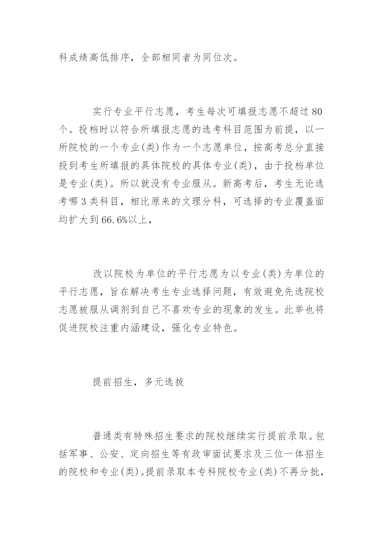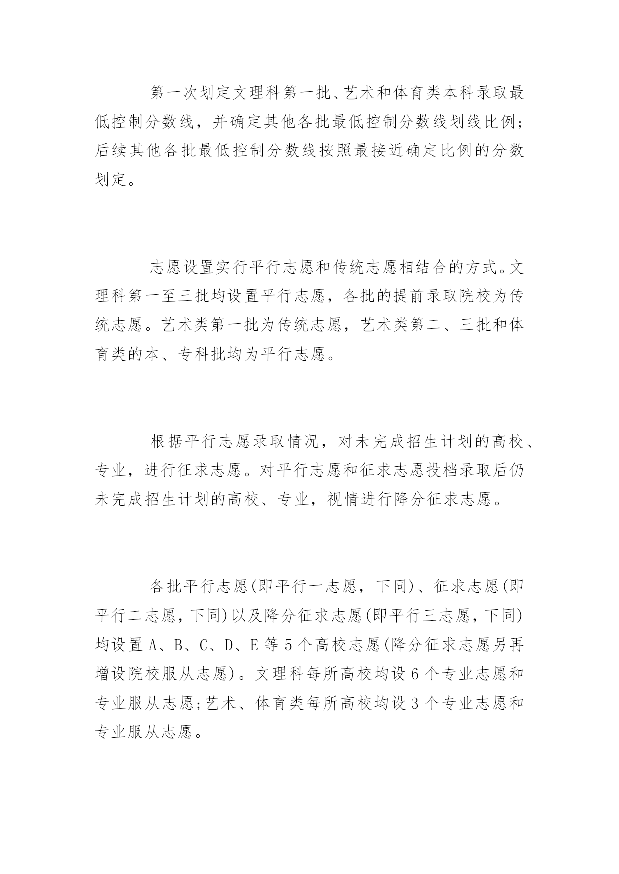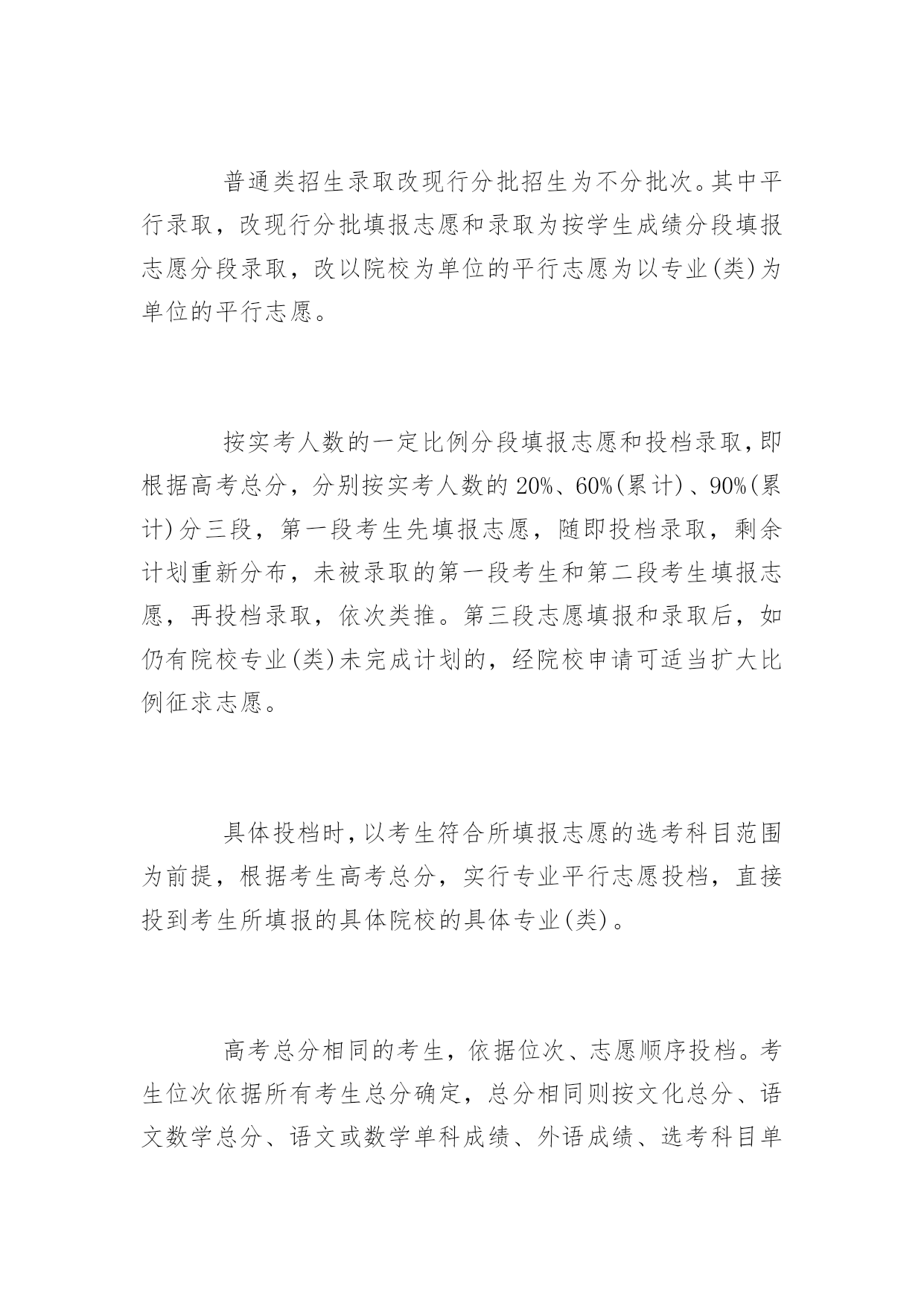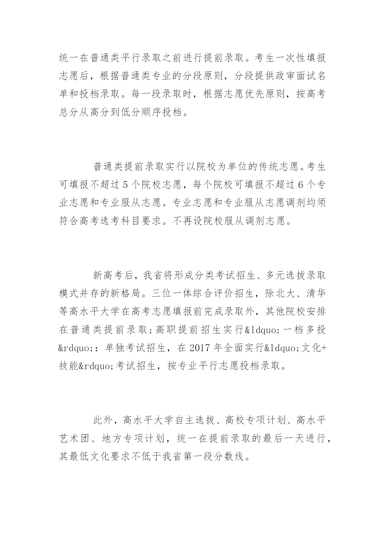 浙江高考志愿填报指导浙江高考志愿填报指导高考志愿填报方式是高考招生录取制度的一部分,采用何种方式作为我国高考志愿填报方式,成为当前热门话题,引起社会各界的广泛关注和一定范围的争议。下面是阳光网小编为你整理的浙江高考志愿填报指导内容,希望对你有帮助。浙江高考志愿填报指导网上填报志愿如何进行录取?普通高校招生录取工作实行分类分批划定并公布分数线、分批填报志愿、分批录取。录取分批次进行文理科统一招生录取工作分三批进行,分别对应三个考试类别科目组。第一批为“985”、“211”高校和经批准列入该批的本科高校专业,对应一类考试科目;第二批为其他一般本科高校(包括独立学院、民办高校)的本科专业,对应二类考试科目;第三批为高职(专科)院校专业,对应三类考试科目。提前录取的学校按规定分别安排到各批提前录取。艺术类录取分三批进行。第一批为29所独立设置的艺术类院校、清华等13所高校的部分艺术类本科专业,其他专业校考和进入“211工程”建设院校及经批准列入该批录取的艺术类本科专业;第二批为专业省统考的艺术类本科专业;第三批为艺术类高职(专科)专业。体育类录取分本、专科(高职)两批进行。已被上一批次(包括各类提前录取和单独录取)高校录取的考生,不得再录取。各批分数线如何划定?志愿如何设置?省高校招生委员会根据当年高校在浙江省的招生计划数和考生成绩,分类分批按一定比例划定并公布最低控制分数线,其中艺术类按美术、广电及其他类分别划定文化最低控制分数线。第一次划定文理科第一批、艺术和体育类本科录取最低控制分数线,并确定其他各批最低控制分数线划线比例;后续其他各批最低控制分数线按照最接近确定比例的分数划定。志愿设置实行平行志愿和传统志愿相结合的方式。文理科第一至三批均设置平行志愿,各批的提前录取院校为传统志愿。艺术类第一批为传统志愿,艺术类第二、三批和体育类的本、专科批均为平行志愿。根据平行志愿录取情况,对未完成招生计划的高校、专业,进行征求志愿。对平行志愿和征求志愿投档录取后仍未完成招生计划的高校、专业,视情进行降分征求志愿。各批平行志愿(即平行一志愿,下同)、征求志愿(即平行二志愿,下同)以及降分征求志愿(即平行三志愿,下同)均设置A、B、C、D、E等5个高校志愿(降分征求志愿另再增设院校服从志愿)。文理科每所高校均设6个专业志愿和专业服从志愿;艺术、体育类每所高校均设3个专业志愿和专业服从志愿。文理科各批提前录取院校设5个院校传统志愿和院校服从志愿;艺术各批提前录取院校设2个院校传统志愿,第一批设3个院校传统志愿。每所高校设3个专业志愿和专业服从志愿。浙江填报志愿要注意的事项高考志愿填报在网上进行,“浙江省教育考试网是唯一的填报志愿网站。考生需按选报的考试类别在相应批次填报志愿,考生未选报的类别只能参加对应批次征求志愿填报。文理科第一批和第一批的提前录取院校、艺术第一批和第二批本科、体育类本科、高职单考单招的院校同时填报志愿,网上填报时间为6月26日至6月27日。文理科第二批和艺术、体育类专科批同时填报志愿,文理科第三批单独填报,具体网上填报时间由省教育考试院公布。网上志愿填报后不进行现场确认。注意,普通高校自主选拔合格考生以及高水平艺术团招生合格考生,实行网上填报志愿,在6月26日至6月27日与文理科第一批等的志愿填报同时进行,不再进行现场确认;已填报志愿但又放弃的考生,该批只能通过填报征求志愿参加录取。考生在填报志愿时须认真阅读有关高校招生章程,了解高校的各项具体要求和奖贷学金等方面的规定,根据省教育考试院统一公布的招生计划,按有关规定和学校的要求慎重填报学校,专业志愿。填报独立学院和民办高校本、专科专业志愿的考生,还应充分考虑经济承受能力。提醒广大考生:平行志愿、征求志愿和降分征求志愿网上填报时间截止后一律不得改动。考生请务必保管好自己的密码信息。浙江高考志愿填报指南2017浙江新高考:不分批次实行专业平行投档不分批次,专业平行普通类招生录取改现行分批招生为不分批次。其中平行录取,改现行分批填报志愿和录取为按学生成绩分段填报志愿分段录取,改以院校为单位的平行志愿为以专业(类)为单位的平行志愿。按实考人数的一定比例分段填报志愿和投档录取,即根据高考总分,分别按实考人数的20%、60%(累计)、90%(累计)分三段,第一段考生先填报志愿,随即投档录取,剩余计划重新分布,未被录取的第一段考生和第二段考生填报志愿,再投档录取,依次类推。第三段志愿填报和录取后,如仍有院校专业(类)未完成计划的,经院校申请可适当扩大比例征求志愿。具体投档时,以考生符合所填报志愿的选考科目范围为前提,根据考生高考总分,实行专业平行志愿投档,