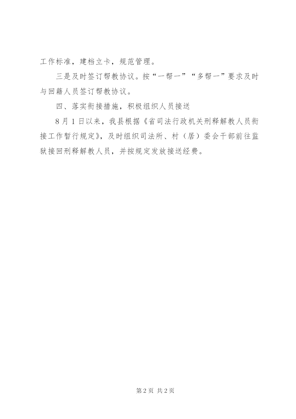 第PAGE\*Arabic\*MERGEFORMAT2页共NUMPAGES\*MERGEFORMAT2页司法机关帮教汇报一、明确指导思想,确定工作目标一是根据省、市文件精神,结合工作实际及时下发了2012年的安置帮教工作要点,对全年的工作予以部署。二是制订了2012年的目标考评办法,年终予以考评。三是在全县司法行政工作会议上进行了全面布置。县政法委罗定贵书记、县政府曾盈昌副县长及局长欧阳四保在会上反复进行了强调与布置。二、加强组织领导,强化机构建设一是各乡镇根据人员变动情况,及时调整和充实了安置帮教工作领导小组,为安置帮教工作奠定了基础。二是县安置帮教办及时建立健全并严格坚持例会、考评等各项工作制度,促进安置帮教工作走上制度化、规范化轨道。三是根据市局要求统一购置安置帮教软件,为安置帮教工作实现“无纸化”办公创造条件。四是领导小组积极协调各方面力量,形成齐抓共管的帮教工作网络。三、做好监管工作,促进帮教水平一是认真做好登记工作,及时把刑释解教人员释放通知书按规定的时间下发至乡镇安置帮教工作站直至所驻村委、家属。二是建档立卡。要求把回籍的人员按一人一卡、一年一档的工作标准,建档立卡,规范管理。三是及时签订帮教协议。按“一帮一”“多帮一”要求及时与回籍人员签订帮教协议。四、落实衔接措施,积极组织人员接送8月1日以来,我县根据《省司法行政机关刑释解教人员衔接工作暂行规定》,及时组织司法所、村(居)委会干部前往监狱接回刑释解教人员,并按规定发放接送经费。