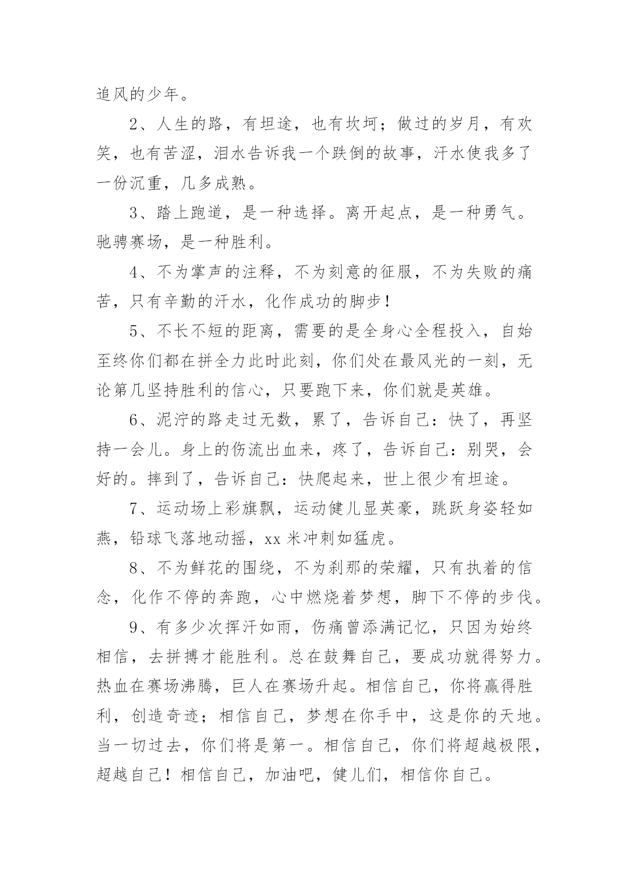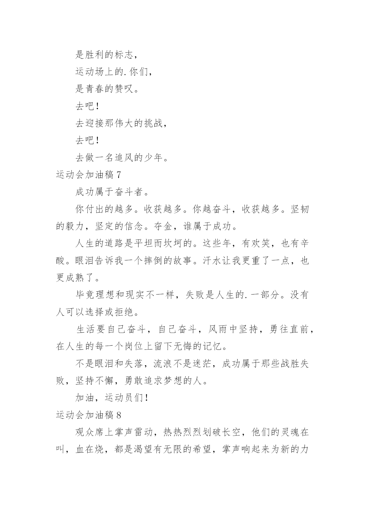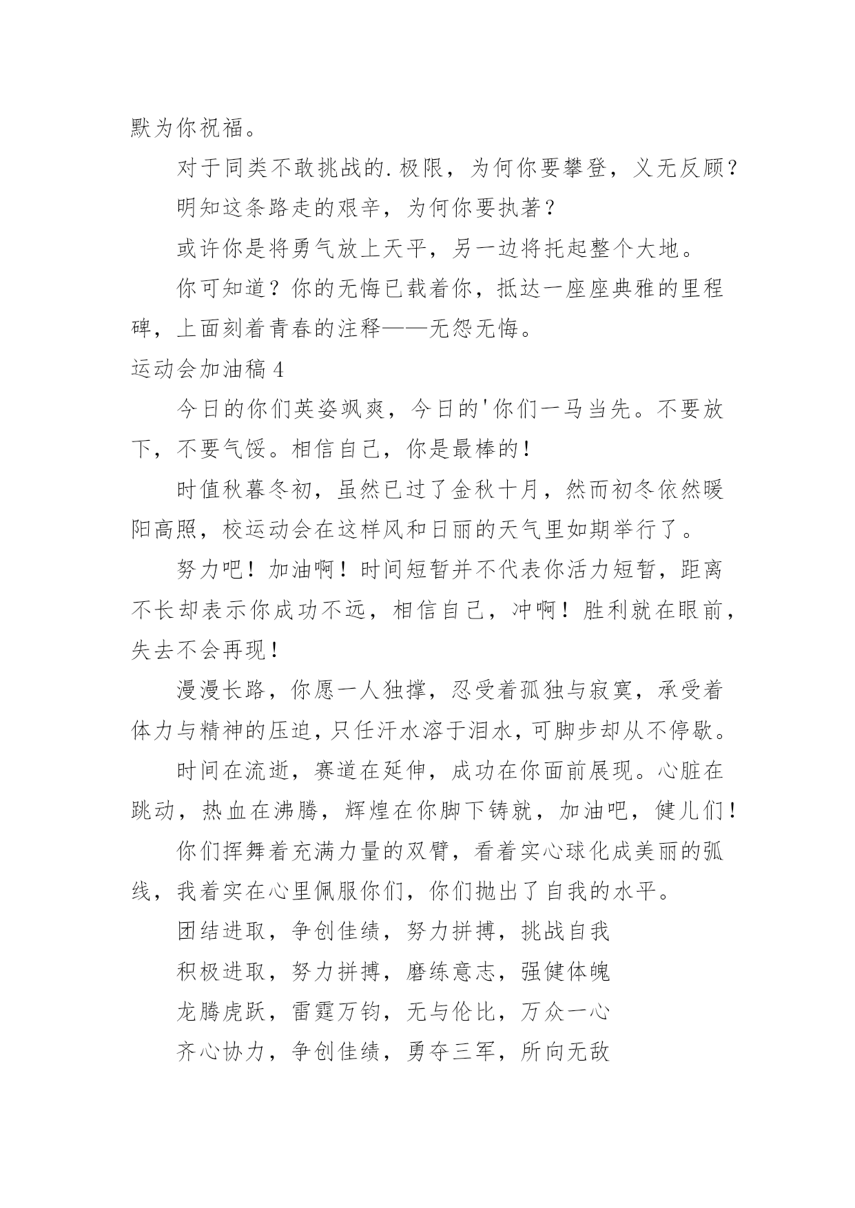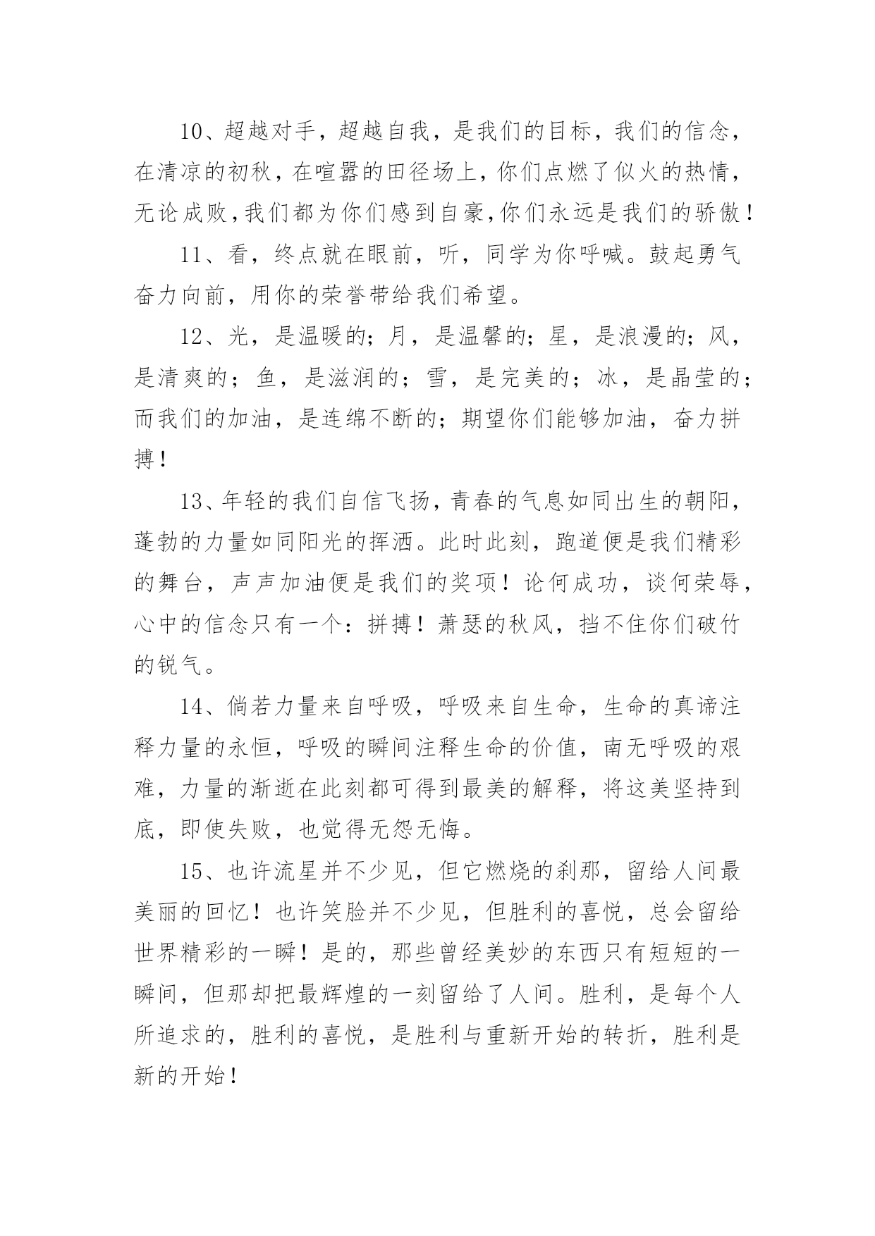 运动会加油稿运动会加油稿15篇(优选)在现在社会,我们使用上加油稿的情况与日俱增,借助加油稿可以活跃气氛,催人奋进。为了让您在写加油稿时更加简单方便,以下是小编帮大家整理的运动会加油稿,欢迎阅读,希望大家能够喜欢。运动会加油稿1为了到达终点时那一刻的辉煌,加油!鸣奏青春旋律,抒写运动乐意!群雄逐鹿,舍我其谁,__健儿,永争第一。我们在为你加油,你是否听到了我们发自心中的呐喊!泥泞的路走过无数累了,告诉自我:快了,再坚持一会儿。夸夫迫日惊华夏,此时平步青云塔黄沙。这炎热的`夏日居然也如此美丽,美丽得让人绝望,你坚毅的目光,终点,加力,冲刺,立刻就是胜利。顽强拼搏,超越极限。无论第几坚持胜利的信心,只要跑下来,你们就是英雄。热血在沸腾,辉煌在你脚下铸就。加油吧,健儿们!运动会加油稿21.团结一心,奋勇向前,追求卓越,争创第一。2.七八七八,精神焕发,强身健体,状态最佳。3.良药苦口,忠言逆耳,顿开茅塞,补偏救弊。4.活力飞扬,气宇轩昂,同心协力,共创辉煌5.顽强拼搏超越极限。6.文安天下,武定江山,得才兼备,智勇双全。7.我们共一队,我们似一人。8.毅然决然,团结勇敢,昂首阔步,勇往直前。9.勇争第一,团结一心,共创佳绩强身健体。10.礼貌四班,鳌头独占,和谐你我,勇争桂冠。11.经济经济,保研胜地,本硕连读,一生孤独。12.三九团结,破茧成蝶,气贯长虹,笑傲苍穹。13.发展体育运动,增强人民体质。14.八二八二,独一无二,心中似火,赵越自我。15.艰苦风斗,铁杵成针,矢志不移,滴水穿石。16.争创佳绩,青春如火。17.严肃活泼,奋勇拼搏,团结争先,荣誉如山。18.思不嫌烦,学不嫌苦,坚持不懈,勇往直前。19.超越极限,超越自我。20.一九一九,一群野狗,谁敢不服,咬他两口!运动会加油稿3望着你赛场上愈渐沉重的步伐,曾用来鼓励你的豪言壮语。此刻变得那么脆弱无力。于是我选择了沉默,在心底默默为你祝福。对于同类不敢挑战的.极限,为何你要攀登,义无反顾?明知这条路走的艰辛,为何你要执著?或许你是将勇气放上天平,另一边将托起整个大地。你可知道?你的无悔已载着你,抵达一座座典雅的里程碑,上面刻着青春的注释——无怨无悔。运动会加油稿4今日的你们英姿飒爽,今日的'你们一马当先。不要放下,不要气馁。相信自己,你是最棒的!时值秋暮冬初,虽然已过了金秋十月,然而初冬依然暖阳高照,校运动会在这样风和日丽的天气里如期举行了。努力吧!加油啊!时间短暂并不代表你活力短暂,距离不长却表示你成功不远,相信自己,冲啊!胜利就在眼前,失去不会再现!漫漫长路,你愿一人独撑,忍受着孤独与寂寞,承受着体力与精神的压迫,只任汗水溶于泪水,可脚步却从不停歇。时间在流逝,赛道在延伸,成功在你面前展现。心脏在跳动,热血在沸腾,辉煌在你脚下铸就,加油吧,健儿们!你们挥舞着充满力量的双臂,看着实心球化成美丽的弧线,我着实在心里佩服你们,你们抛出了自我的水平。团结进取,争创佳绩,努力拼搏,挑战自我积极进取,努力拼搏,磨练意志,强健体魄龙腾虎跃,雷霆万钧,无与伦比,万众一心齐心协力,争创佳绩,勇夺三军,所向无敌运动会加油稿5给予的越多。收获的越多。奋斗的越多收获的'越多坚韧的毅力坚定的信念收获闪光的金牌成功属于谁人生的路,有坦途,也有坎坷;做过的岁月,有欢笑,也有苦涩泪水告诉我一个跌倒的故事汗水使我多了一份沉重,几多成熟。理想毕竟不同于现实,失败是生活的一部分,谁也无法选择,无法拒绝。人生要自己去拼搏,去奋斗,在风雨中百折不挠勇往前进,在集资的每个驿站上都留下一段不悔的回忆流泪不是失落,徘徊不是迷惑,成功属于那些战胜失败,坚持不懈、勇于追求梦想的人。加油吧,运动健儿们!运动会加油稿6看!那一面面迎风飘舞的彩旗,是一朵朵盛开的鲜花;听!那一阵阵惊天动地的欢呼,是回响在耳边胜利的风声。运动场上的你们,是胜利的标志,运动场上的.你们,是青春的赞叹。去吧!去迎接那伟大的挑战,去吧!去做一名追风的少年。运动会加油稿7成功属于奋斗者。你付出的越多。收获越多。你越奋斗,收获越多。坚韧的毅力,坚定的信念。夺金,谁属于成功。人生的道路是平坦而坎坷的。这些年,有欢笑,也有辛酸。眼泪告诉我一个摔倒的故事。汗水让我更重了一点,也更成熟了。毕竟理想和现实不一样,失败是人生的.一部分。没有人可以选择或拒绝。生活要自己奋斗,自己奋斗,风雨中坚持,勇往直前,在人生的每一个岗位上留下无悔的记忆。不是眼泪和失落,流浪不是迷茫,成功属于那些战胜失败,坚持不懈,勇敢追求梦想的人。加油,运动员们!运动会加油稿8观众席上掌声雷动,热热烈烈划破长空,他们的灵魂在叫,血在烧,都是渴望有无限的希望,掌声响起来为新的力量喝彩,掌声响起来,每一棵都精彩。晨风轻轻地唤醒骄阳,校园的操场传来发令枪的声响,彩旗与呐喊声一起在飘荡着,心和起点紧