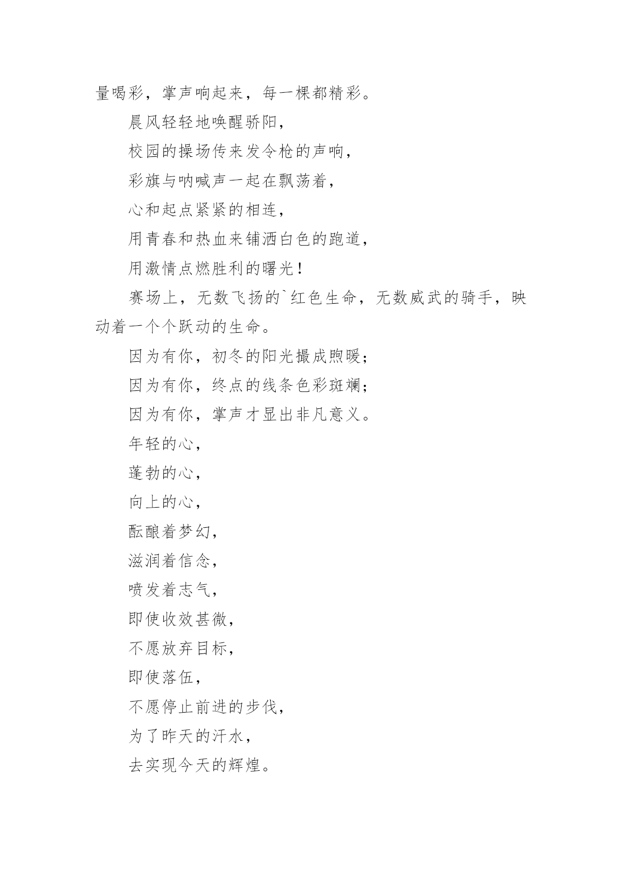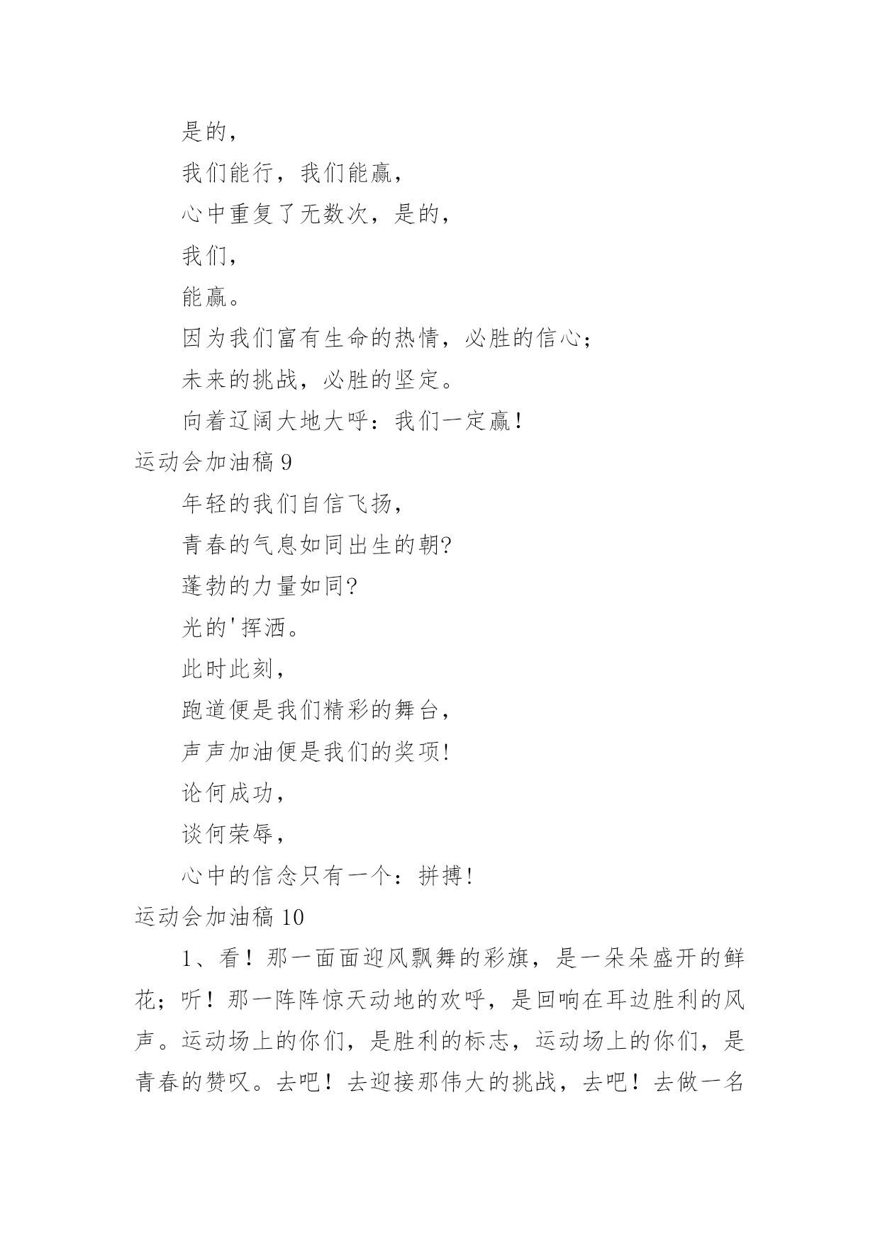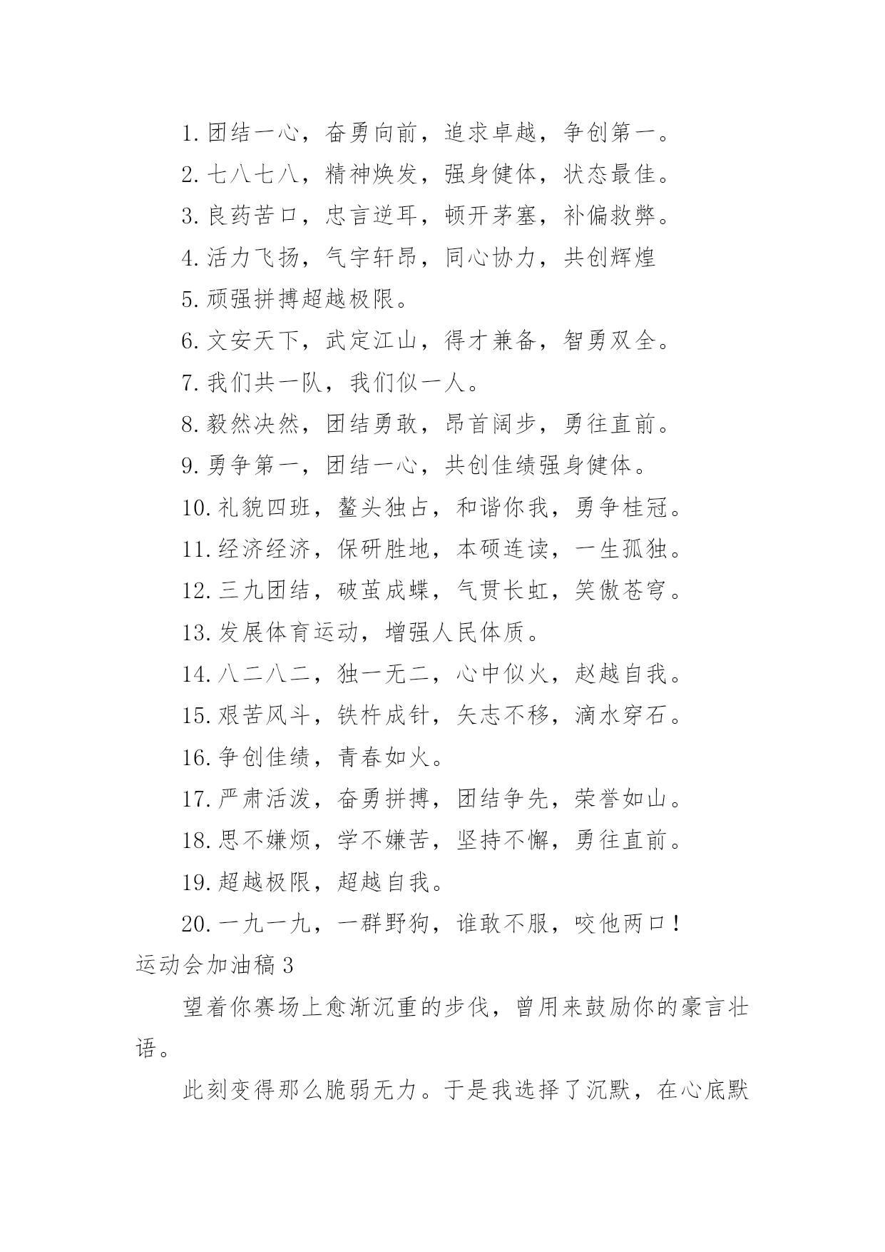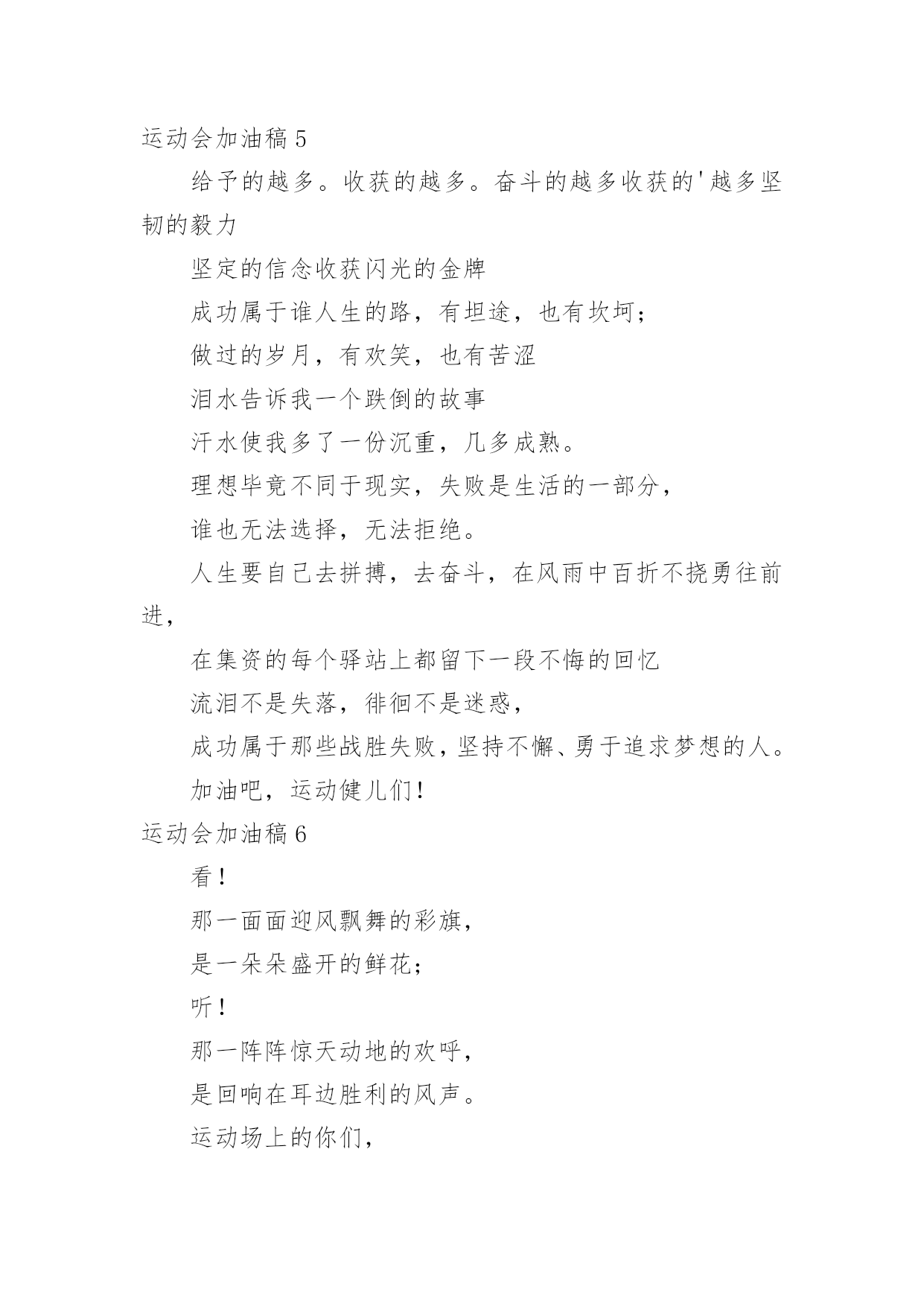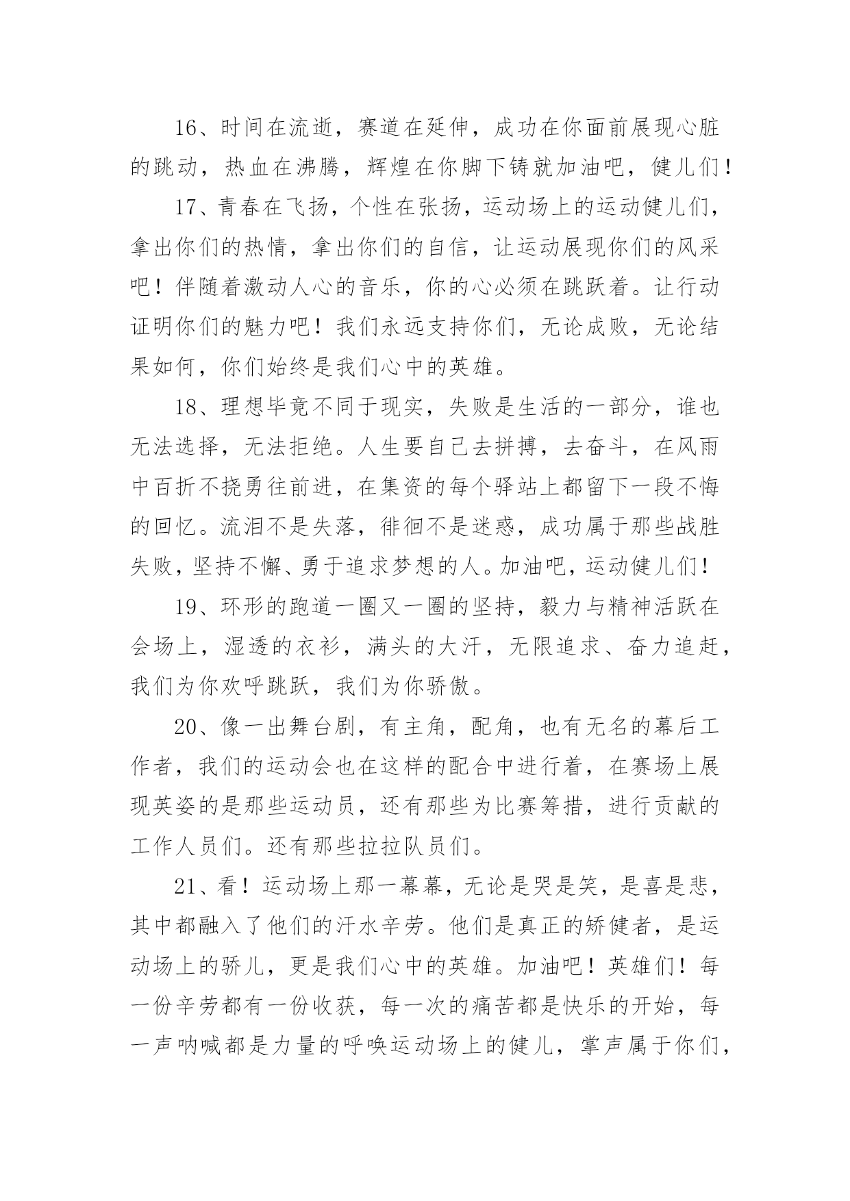 运动会加油稿运动会加油稿15篇(优选)在现在社会,我们使用上加油稿的情况与日俱增,借助加油稿可以活跃气氛,催人奋进。为了让您在写加油稿时更加简单方便,以下是小编帮大家整理的运动会加油稿,欢迎阅读,希望大家能够喜欢。运动会加油稿1为了到达终点时那一刻的辉煌,加油!鸣奏青春旋律,抒写运动乐意!群雄逐鹿,舍我其谁,__健儿,永争第一。我们在为你加油,你是否听到了我们发自心中的呐喊!泥泞的路走过无数累了,告诉自我:快了,再坚持一会儿。夸夫迫日惊华夏,此时平步青云塔黄沙。这炎热的`夏日居然也如此美丽,美丽得让人绝望,你坚毅的目光,终点,加力,冲刺,立刻就是胜利。顽强拼搏,超越极限。无论第几坚持胜利的信心,只要跑下来,你们就是英雄。热血在沸腾,辉煌在你脚下铸就。加油吧,健儿们!运动会加油稿21.团结一心,奋勇向前,追求卓越,争创第一。2.七八七八,精神焕发,强身健体,状态最佳。3.良药苦口,忠言逆耳,顿开茅塞,补偏救弊。4.活力飞扬,气宇轩昂,同心协力,共创辉煌5.顽强拼搏超越极限。6.文安天下,武定江山,得才兼备,智勇双全。7.我们共一队,我们似一人。8.毅然决然,团结勇敢,昂首阔步,勇往直前。9.勇争第一,团结一心,共创佳绩强身健体。10.礼貌四班,鳌头独占,和谐你我,勇争桂冠。11.经济经济,保研胜地,本硕连读,一生孤独。12.三九团结,破茧成蝶,气贯长虹,笑傲苍穹。13.发展体育运动,增强人民体质。14.八二八二,独一无二,心中似火,赵越自我。15.艰苦风斗,铁杵成针,矢志不移,滴水穿石。16.争创佳绩,青春如火。17.严肃活泼,奋勇拼搏,团结争先,荣誉如山。18.思不嫌烦,学不嫌苦,坚持不懈,勇往直前。19.超越极限,超越自我。20.一九一九,一群野狗,谁敢不服,咬他两口!运动会加油稿3望着你赛场上愈渐沉重的步伐,曾用来鼓励你的豪言壮语。此刻变得那么脆弱无力。于是我选择了沉默,在心底默默为你祝福。对于同类不敢挑战的.极限,为何你要攀登,义无反顾?明知这条路走的艰辛,为何你要执著?或许你是将勇气放上天平,另一边将托起整个大地。你可知道?你的无悔已载着你,抵达一座座典雅的里程碑,上面刻着青春的注释——无怨无悔。运动会加油稿4今日的你们英姿飒爽,今日的'你们一马当先。不要放下,不要气馁。相信自己,你是最棒的!时值秋暮冬初,虽然已过了金秋十月,然而初冬依然暖阳高照,校运动会在这样风和日丽的天气里如期举行了。努力吧!加油啊!时间短暂并不代表你活力短暂,距离不长却表示你成功不远,相信自己,冲啊!胜利就在眼前,失去不会再现!漫漫长路,你愿一人独撑,忍受着孤独与寂寞,承受着体力与精神的压迫,只任汗水溶于泪水,可脚步却从不停歇。时间在流逝,赛道在延伸,成功在你面前展现。心脏在跳动,热血在沸腾,辉煌在你脚下铸就,加油吧,健儿们!你们挥舞着充满力量的双臂,看着实心球化成美丽的弧线,我着实在心里佩服你们,你们抛出了自我的水平。团结进取,争创佳绩,努力拼搏,挑战自我积极进取,努力拼搏,磨练意志,强健体魄龙腾虎跃,雷霆万钧,无与伦比,万众一心齐心协力,争创佳绩,勇夺三军,所向无敌运动会加油稿5给予的越多。收获的越多。奋斗的越多收获的'越多坚韧的毅力坚定的信念收获闪光的金牌成功属于谁人生的路,有坦途,也有坎坷;做过的岁月,有欢笑,也有苦涩泪水告诉我一个跌倒的故事汗水使我多了一份沉重,几多成熟。理想毕竟不同于现实,失败是生活的一部分,谁也无法选择,无法拒绝。人生要自己去拼搏,去奋斗,在风雨中百折不挠勇往前进,在集资的每个驿站上都留下一段不悔的回忆流泪不是失落,徘徊不是迷惑,成功属于那些战胜失败,坚持不懈、勇于追求梦想的人。加油吧,运动健儿们!运动会加油稿6看!那一面面迎风飘舞的彩旗,是一朵朵盛开的鲜花;听!那一阵阵惊天动地的欢呼,是回响在耳边胜利的风声。运动场上的你们,是胜利的标志,运动场上的.你们,是青春的赞叹。去吧!去迎接那伟大的挑战,去吧!去做一名追风的少年。运动会加油稿7成功属于奋斗者。你付出的越多。收获越多。你越奋斗,收获越多。坚韧的毅力,坚定的信念。夺金,谁属于成功。人生的道路是平坦而坎坷的。这些年,有欢笑,也有辛酸。眼泪告诉我一个摔倒的故事。汗水让我更重了一点,也更成熟了。毕竟理想和现实不一样,失败是人生的.一部分。没有人可以选择或拒绝。生活要自己奋斗,自己奋斗,风雨中坚持,勇往直前,在人生的每一个岗位上留下无悔的记忆。不是眼泪和失落,流浪不是迷茫,成功属于那些战胜失败,坚持不懈,勇敢追求梦想的人。加油,运动员们!运动会加油稿8观众席上掌声雷动,热热烈烈划破长空,他们的灵魂在叫,血在烧,都是渴望有无限的希望,掌声响起来为新的力量喝彩,掌声响起来,每一棵都精彩。晨风轻轻地唤醒骄阳,校园的操场传来发令枪的声响,彩旗与呐喊声一起在飘荡着,心和起点紧