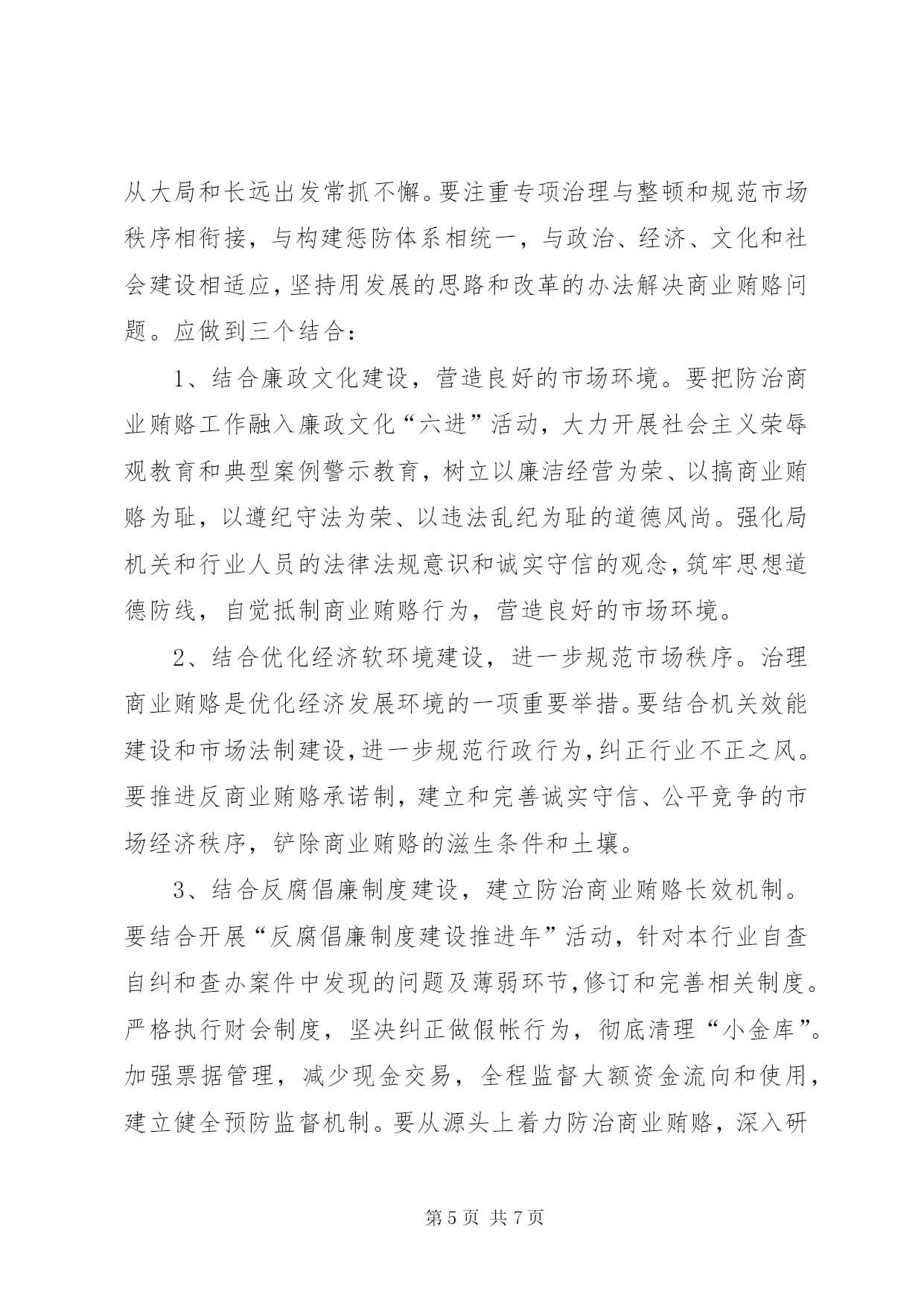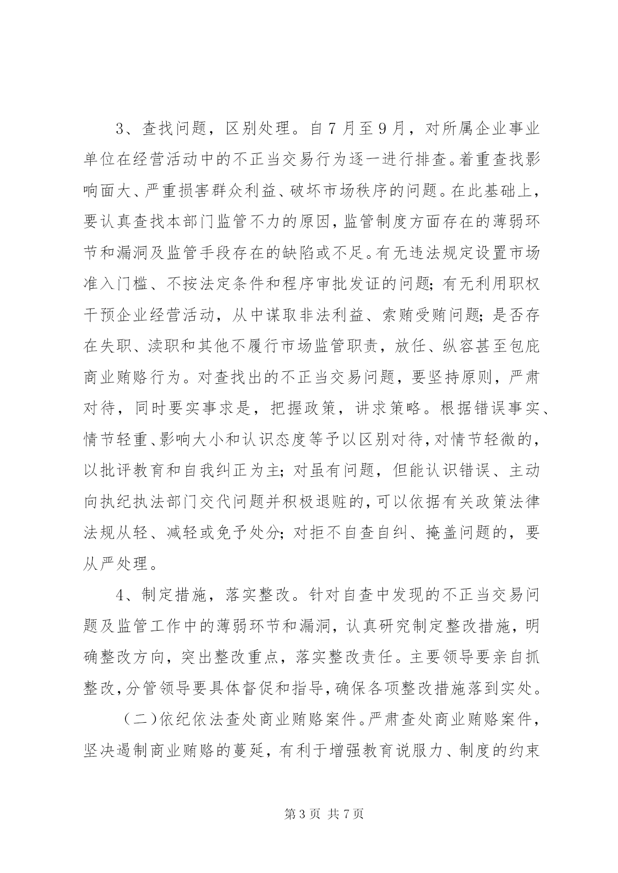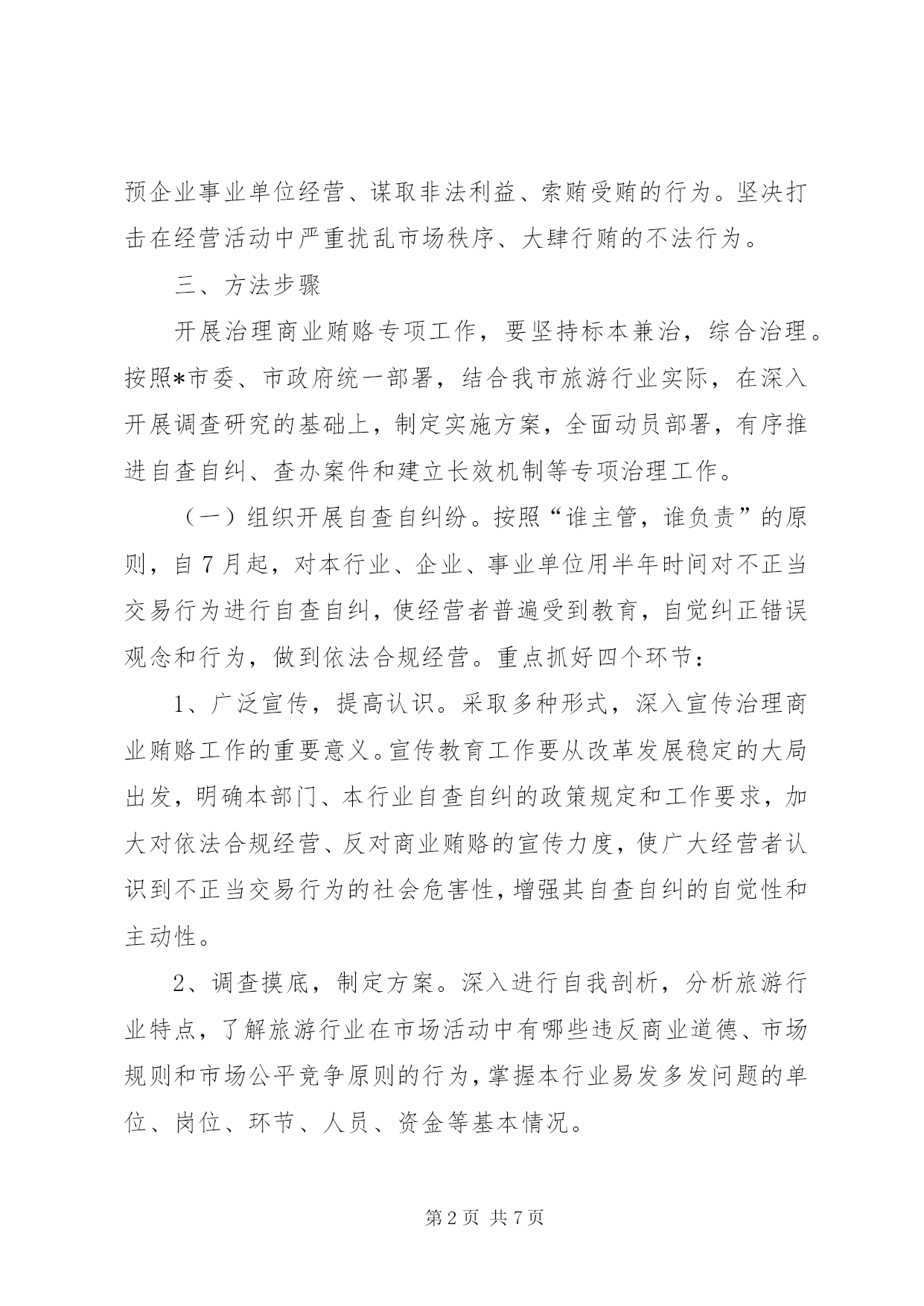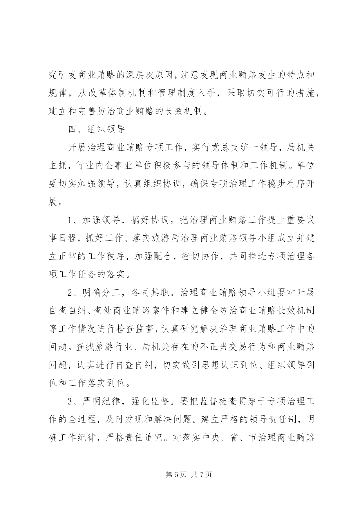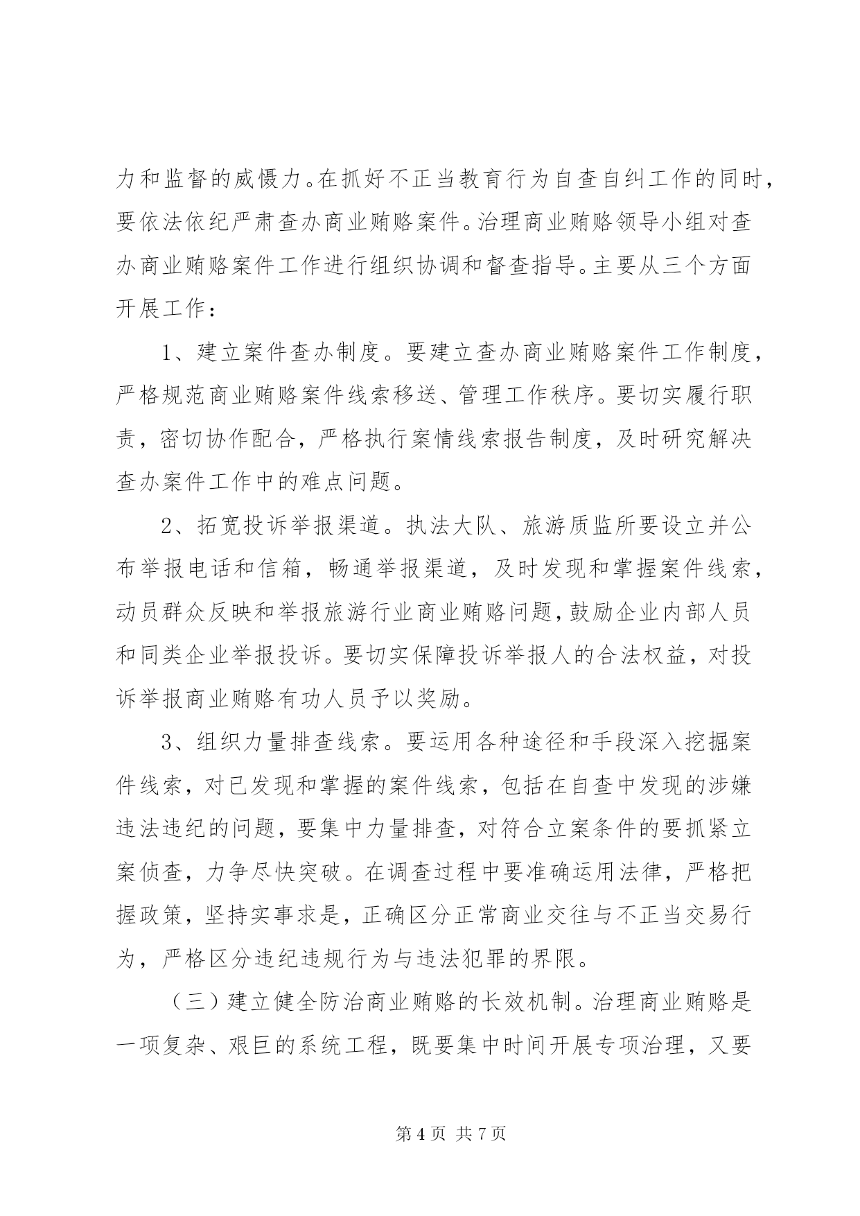 第PAGE\*Arabic\*MERGEFORMAT7页共NUMPAGES\*MERGEFORMAT7页旅游局治理商业贿赂工作方案为贯彻落实中央、省、*市和*市委市政府关于开展治理商业贿赂专项工作的部署,进一步规范旅游市场秩序,深入推进反腐倡廉工作,促进我市旅游业又快又好发展。根据《关于开展治理商业贿赂专项工作的意见》和*市治理商业贿赂领导小组的部署和要求,以及*市开展治理商业贿赂专项工作实施方案,结合我市旅游行业实际,现就全市旅游行业开展治理商业贿赂专项工作提出如下实施方案。一、指导思想坚持以邓小平理论和“三个代表“重要思想为指导,依据中央和省委文件精神及法律法规,统一部署,分类指导,突出重点,稳步推进。坚决纠正旅游行业经济活动中不正当交易行为,依纪依法查处违反法律法规给予和收受财务或其他利益的商业贿赂案件。通过开展专项治理,遏制商业贿赂蔓延势头,逐渐减少商业贿赂案件的发生,进一步规范市场秩序,促进党风、政风、行风建设,建立和完善防治商业贿赂的长效机制,为又快又好地推进我市“两个率先”提供有力保证。二、治理重点综合运用教育、经济、法律和行政等手段对商业贿赂进行综合治理,着力解决公益性强、与人民群众切身利益密切相关、严重破坏市场秩序的问题。严肃查处国家公务员利用职权参与或干预企业事业单位经营、谋取非法利益、索贿受贿的行为。坚决打击在经营活动中严重扰乱市场秩序、大肆行贿的不法行为。三、方法步骤开展治理商业贿赂专项工作,要坚持标本兼治,综合治理。按照*市委、市政府统一部署,结合我市旅游行业实际,在深入开展调查研究的基础上,制定实施方案,全面动员部署,有序推进自查自纠、查办案件和建立长效机制等专项治理工作。(一)组织开展自查自纠纷。按照“谁主管,谁负责”的原则,自7月起,对本行业、企业、事业单位用半年时间对不正当交易行为进行自查自纠,使经营者普遍受到教育,自觉纠正错误观念和行为,做到依法合规经营。重点抓好四个环节:1、广泛宣传,提高认识。采取多种形式,深入宣传治理商业贿赂工作的重要意义。宣传教育工作要从改革发展稳定的大局出发,明确本部门、本行业自查自纠的政策规定和工作要求,加大对依法合规经营、反对商业贿赂的宣传力度,使广大经营者认识到不正当交易行为的社会危害性,增强其自查自纠的自觉性和主动性。2、调查摸底,制定方案。深入进行自我剖析,分析旅游行业特点,了解旅游行业在市场活动中有哪些违反商业道德、市场规则和市场公平竞争原则的行为,掌握本行业易发多发问题的单位、岗位、环节、人员、资金等基本情况。3、查找问题,区别处理。自7月至9月,对所属企业事业单位在经营活动中的不正当交易行为逐一进行排查。着重查找影响面大、严重损害群众利益、破坏市场秩序的问题。在此基础上,要认真查找本部门监管不力的原因,监管制度方面存在的薄弱环节和漏洞及监管手段存在的缺陷或不足。有无违法规定设置市场准入门槛、不按法定条件和程序审批发证的问题;有无利用职权干预企业经营活动,从中谋取非法利益、索贿受贿问题;是否存在失职、渎职和其他不履行市场监管职责,放任、纵容甚至包庇商业贿赂行为。对查找出的不正当交易问题,要坚持原则,严肃对待,同时要实事求是,把握政策,讲求策略。根据错误事实、情节轻重、影响大小和认识态度等予以区别对待,对情节轻微的,以批评教育和自我纠正为主;对虽有问题,但能认识错误、主动向执纪执法部门交代问题并积极退赃的,可以依据有关政策法律法规从轻、减轻或免予处分;对拒不自查自纠、掩盖问题的,要从严处理。4、制定措施,落实整改。针对自查中发现的不正当交易问题及监管工作中的薄弱环节和漏洞,认真研究制定整改措施,明确整改方向,突出整改重点,落实整改责任。主要领导要亲自抓整改,分管领导要具体督促和指导,确保各项整改措施落到实处。(二)依纪依法查处商业贿赂案件。严肃查处商业贿赂案件,坚决遏制商业贿赂的蔓延,有利于增强教育说服力、制度的约束力和监督的威慑力。在抓好不正当教育行为自查自纠工作的同时,要依法依纪严肃查办商业贿赂案件。治理商业贿赂领导小组对查办商业贿赂案件工作进行组织协调和督查指导。主要从三个方面开展工作:1、建立案件查办制度。要建立查办商业贿赂案件工作制度,严格规范商业贿赂案件线索移送、管理工作秩序。要切实履行职责,密切协作配合,严格执行案情线索报告制度,及时研究解决查办案件工作中的难点问题。2、拓宽投诉举报渠道。执法大队、旅游质监所要设立并公布举报电话和信箱,畅通举报渠道,及时发现和掌握案件线索,动员群众反映和举报旅游行业商业贿赂问题,鼓励企业内部人员和同类企业举报投诉。要切实保障投诉举报人的合法权益,对投诉举报商业贿赂有功人员予以奖励。3、组织力量排查线索。要运用各种途径和手段深入挖掘案件线索,对已发现和掌握的案件线索,包括在自查中发现