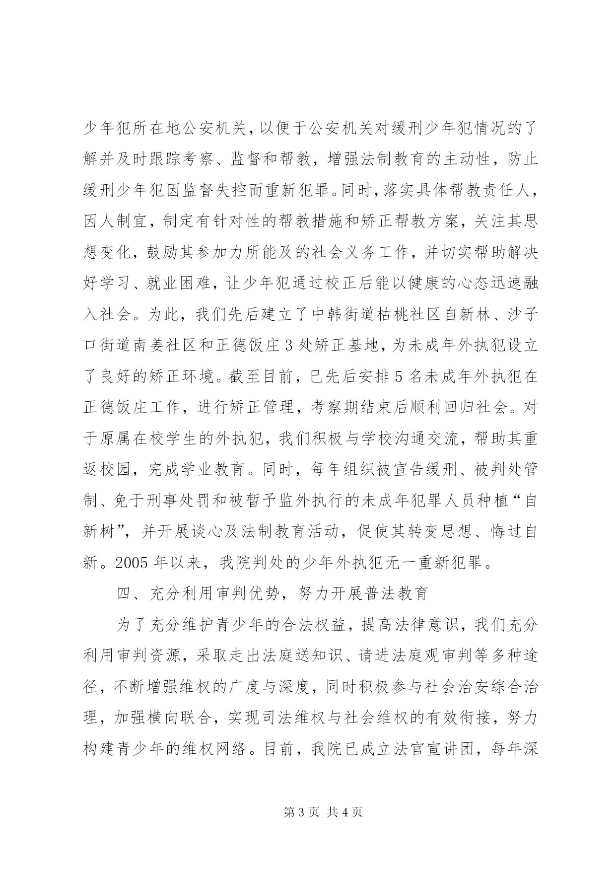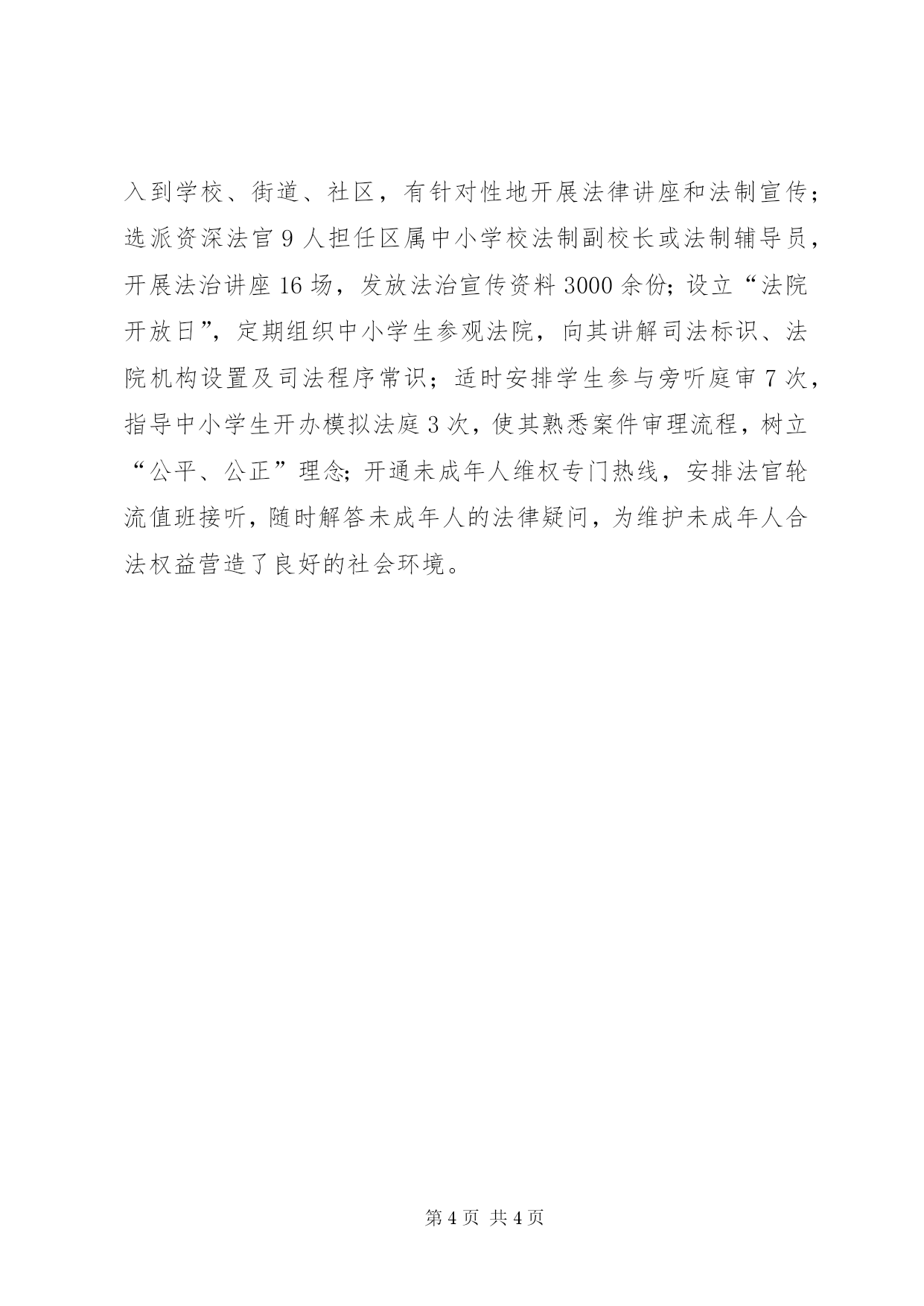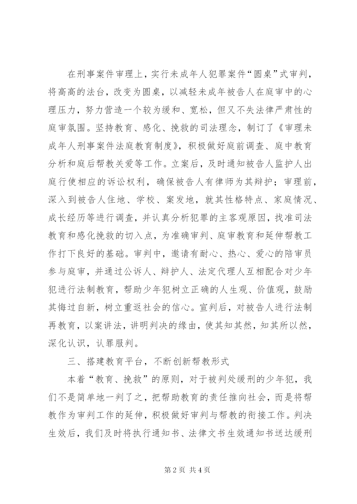第PAGE\*Arabic\*MERGEFORMAT4页共NUMPAGES\*MERGEFORMAT4页司法救助工作经验交流未成年人是特别需要关爱和支持的群体。把陷入困境的未成年人作为司法救助的重要对象,是人民法院延伸司法审判职能,促进社会管理创新的一项重要举措。近几年来,法院积极贯彻“教育、感化、挽救”青少年的方针,从“爱”字出发,从“教”字着眼,从“帮”字入手,稳妥推进“未成年人司法救助”工作,促进未成年当事人积极乐观地生活、学习,为这片特殊的温馨园地播洒了“爱”的阳光和雨露。一、成立少年审判法庭,完善制度加强保障法院于2011年5月设立少年审判综合合议庭,并研究制定了《关于未成年人犯罪的量刑意见》和《未成年人民事案件审判工作制度》,对涉少案件进行单独序列编号,按照刑事、民事、行政案件分类集中审理,实行专门审判。在犯罪案件审判过程中坚持“三个为主”的刑罚适用原则,即可判可不判的,坚持以不判为主;可轻可重的,坚持以轻为主;可缓可不缓的,坚持以缓为主。自少审合议庭成立以来,共受理少审刑事案件22件,审结21件,判处未成年罪犯38人。其中,判处五年以上有期徒刑13人,五年以下有期徒刑11人,拘役1人,缓刑10人,单处罚金2人,免予刑事处罚1人,非监禁刑比例为35%。受理少审民事案件61件,审结60件,案件调撤率达60%。二、改进刑事庭审方式,注重感化挽救在刑事案件审理上,实行未成年人犯罪案件“圆桌”式审判,将高高的法台,改变为圆桌,以减轻未成年被告人在庭审中的心理压力,努力营造一个较为缓和、宽松,但又不失法律严肃性的庭审氛围。坚持教育、感化、挽救的司法理念,制订了《审理未成年人刑事案件法庭教育制度》,积极做好庭前调查、庭中教育分析和庭后帮教关爱等工作。立案后,及时通知被告人监护人出庭行使相应的诉讼权利,确保被告人有律师为其辩护;审理前,深入到被告人住地、学校、案发地,就其性格特点、家庭情况、成长经历等进行调查,并认真分析犯罪的主客观原因,找准司法教育和感化挽救的切入点,为准确审判、庭审教育和延伸帮教工作打下良好的基础。审判中,邀请有耐心、热心、爱心的陪审员参与庭审,并通过公诉人、辩护人、法定代理人互相配合对少年犯进行法制教育,帮助少年犯树立正确的人生观、价值观,鼓励其悔过自新,树立重返社会的信心。宣判后,对被告人进行法制再教育,以案讲法,讲明判决的缘由,使其知其然,知其所以然,深化认识,认罪服判。三、搭建教育平台,不断创新帮教形式本着“教育、挽救”的原则,对于被判处缓刑的少年犯,我们不是简单地一判了之,把帮助教育的责任推向社会,而是将帮教作为审判工作的延伸,积极做好审判与帮教的衔接工作。判决生效后,我们及时将执行通知书、法律文书生效通知书送达缓刑少年犯所在地公安机关,以便于公安机关对缓刑少年犯情况的了解并及时跟踪考察、监督和帮教,增强法制教育的主动性,防止缓刑少年犯因监督失控而重新犯罪。同时,落实具体帮教责任人,因人制宜,制定有针对性的帮教措施和矫正帮教方案,关注其思想变化,鼓励其参加力所能及的社会义务工作,并切实帮助解决好学习、就业困难,让少年犯通过校正后能以健康的心态迅速融入社会。为此,我们先后建立了中韩街道枯桃社区自新林、沙子口街道南姜社区和正德饭庄3处矫正基地,为未成年外执犯设立了良好的矫正环境。截至目前,已先后安排5名未成年外执犯在正德饭庄工作,进行矫正管理,考察期结束后顺利回归社会。对于原属在校学生的外执犯,我们积极与学校沟通交流,帮助其重返校园,完成学业教育。同时,每年组织被宣告缓刑、被判处管制、免于刑事处罚和被暂予监外执行的未成年犯罪人员种植“自新树”,并开展谈心及法制教育活动,促使其转变思想、悔过自新。2005年以来,我院判处的少年外执犯无一重新犯罪。四、充分利用审判优势,努力开展普法教育为了充分维护青少年的合法权益,提高法律意识,我们充分利用审判资源,采取走出法庭送知识、请进法庭观审判等多种途径,不断增强维权的广度与深度,同时积极参与社会治安综合治理,加强横向联合,实现司法维权与社会维权的有效衔接,努力构建青少年的维权网络。目前,我院已成立法官宣讲团,每年深入到学校、街道、社区,有针对性地开展法律讲座和法制宣传;选派资深法官9人担任区属中小学校法制副校长或法制辅导员,开展法治讲座16场,发放法治宣传资料3000余份;设立“法院开放日”,定期组织中小学生参观法院,向其讲解司法标识、法院机构设置及司法程序常识;适时安排学生参与旁听庭审7次,指导中小学生开办模拟法庭3次,使其熟悉案件审理流程,树立“公平、公正”理念;开通未成年人维权专门热线,安排法官轮流值班接听,随时解答未成年人的法律疑问,为维护未成年人合法权益营造了良好的社会环境。