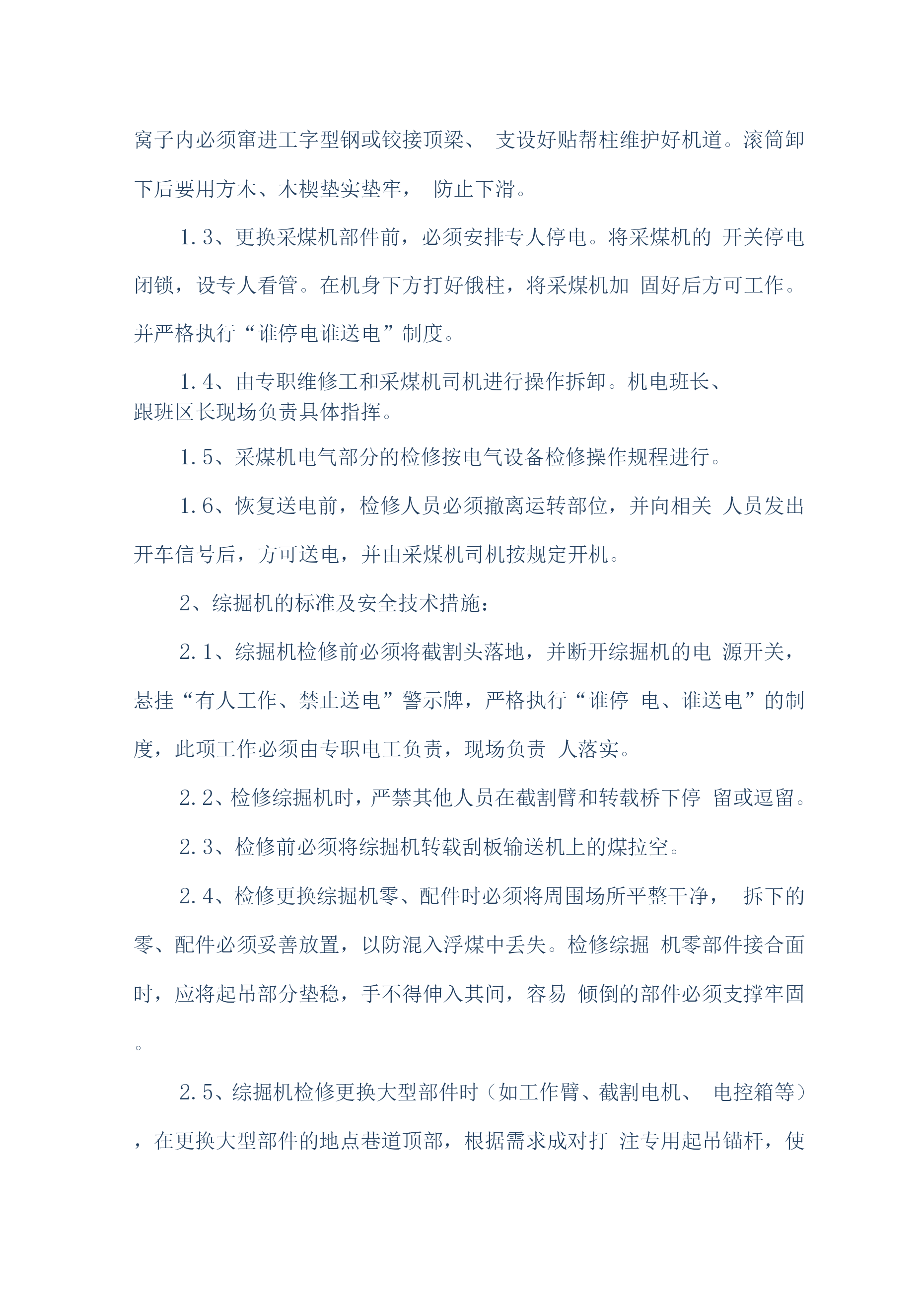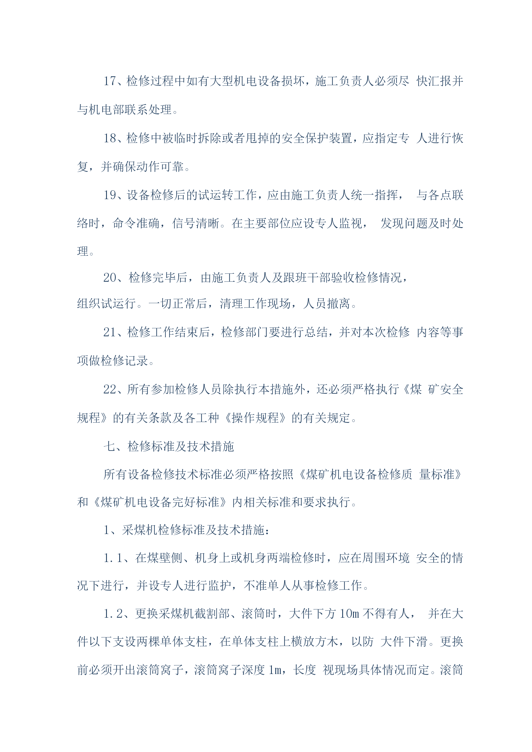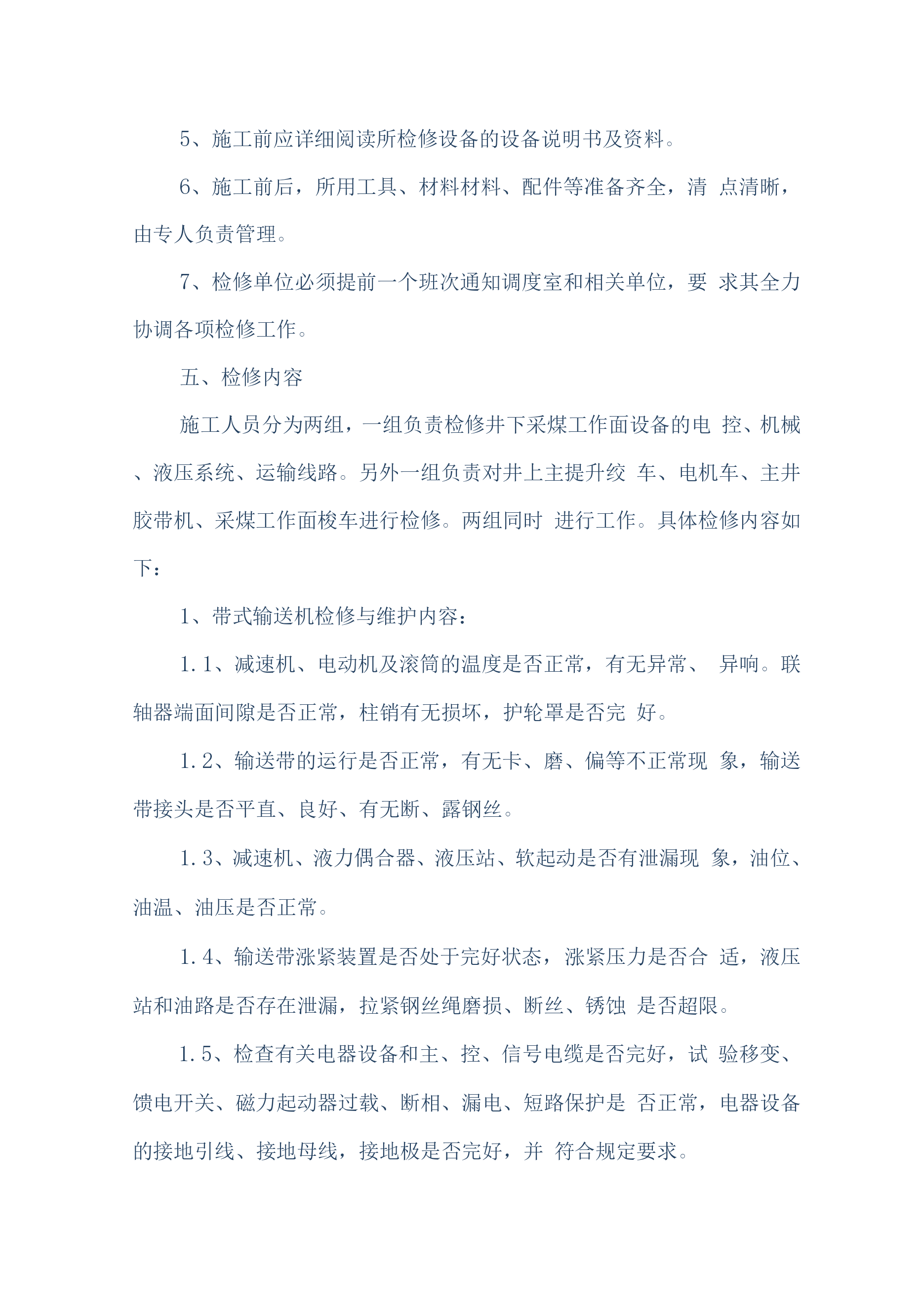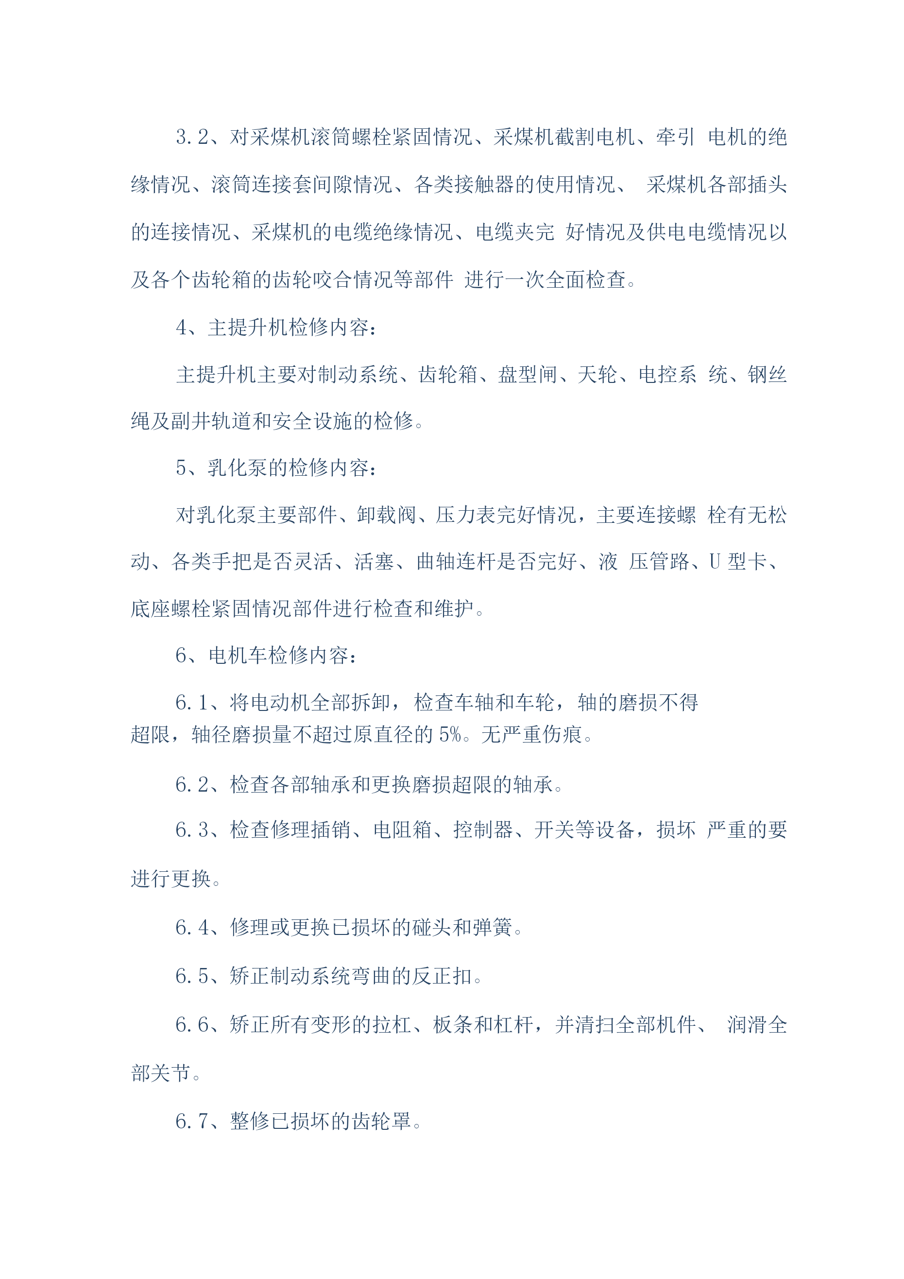 煤矿机电设备检修安全技术措施(通用)一、概述我公司机电设备检修人员计划于2019年6月20日对煤矿机机电设备进行维护、检修,为确保设备检修工作安全顺利的进行,特编制如下安全技术措施:二、检修时间2019年6月20日至2016年8月30日三、检修人员机构总负责:组长:副组长:组员:四、施工前的准备工作1、参加作业人员要分工分组,做到任务明确、安全责任明确。2、必须组织开展专题会议,明确检修任务,熟悉设备检修内容、工艺过程、质量标准和安全技术措施,保证检修质量及安全,做到分工明确,责任到人,并制定检修纪律,要求人人遵守。3、施工前,由安全负责人组织全体参加作业人员认真贯彻本措施,并签名。4、施工前应先对施工环境、设备情况、各系统情况进行了解,不允许在不了解施工环境、设备、系统的情况下冒然进行检修。5、施工前应详细阅读所检修设备的设备说明书及资料。6、施工前后,所用工具、材料材料、配件等准备齐全,清点清晰,由专人负责管理。7、检修单位必须提前一个班次通知调度室和相关单位,要求其全力协调各项检修工作。五、检修内容施工人员分为两组,一组负责检修井下采煤工作面设备的电控、机械、液压系统、运输线路。另外一组负责对井上主提升绞车、电机车、主井胶带机、采煤工作面梭车进行检修。两组同时进行工作。具体检修内容如下:1、带式输送机检修与维护内容:1.1、减速机、电动机及滚筒的温度是否正常,有无异常、异响。联轴器端面间隙是否正常,柱销有无损坏,护轮罩是否完好。1.2、输送带的运行是否正常,有无卡、磨、偏等不正常现象,输送带接头是否平直、良好、有无断、露钢丝。1.3、减速机、液力偶合器、液压站、软起动是否有泄漏现象,油位、油温、油压是否正常。1.4、输送带涨紧装置是否处于完好状态,涨紧压力是否合适,液压站和油路是否存在泄漏,拉紧钢丝绳磨损、断丝、锈蚀是否超限。1.5、检查有关电器设备和主、控、信号电缆是否完好,试验移变、馈电开关、磁力起动器过载、断相、漏电、短路保护是否正常,电器设备的接地引线、接地母线,接地极是否完好,并符合规定要求。1.6、输送机各零部件是否齐全,螺栓是否紧固、可靠。1.7、上下托辊是否齐全,螺栓是否紧固、可靠。1.8、检查、试验信号系统是否通畅,试验照明综保综合保护,是否正常。1.9、检查盘形制动器的工作油压是否正常、闸瓦磨损是否超限,间隙是否超过规定,检查制动器液压站的油位、油温和油压。1.10、检查各装载点和缓冲托辊是否运行正常,装载点是否存在漏煤现象。1.11、检查机头、机尾和皮带机道照明系统,及时更换不亮的照明灯。1.12、检查软起动设备的油压及其液压站以及电磁阀的工作情况。2、刮板机检修内容:对刮板输送机的各个刮板的螺栓紧固情况、链条及象鼻的磨损情况、各锯齿连接环的使用情况、变速箱的油位、油质、变速箱的运转情况、液力偶合器的水位、易容塞和密封情况、液力偶合器的梅花垫的使用情况、溜头组件、分链器的运转情况、溜头、溜尾各部螺栓的紧固以及变速箱齿轮咬合情况等部件进行检查和维护。3、工作面采煤机检修内容:3.1对采煤机的截齿、截齿套磨损情况、采煤机齿轮箱油质油位、采煤机截割电机、牵引电机固定螺栓紧固情况、采煤机各个开关的灵活性、采煤机开关的各种保护、采煤机的防尘喷雾、调高系统的完好情况、液压管路、采煤机的行走滑靴以及导向滑靴等部件进行检查和维护。3.2、对采煤机滚筒螺栓紧固情况、采煤机截割电机、牵引电机的绝缘情况、滚筒连接套间隙情况、各类接触器的使用情况、采煤机各部插头的连接情况、采煤机的电缆绝缘情况、电缆夹完好情况及供电电缆情况以及各个齿轮箱的齿轮咬合情况等部件进行一次全面检查。4、主提升机检修内容:主提升机主要对制动系统、齿轮箱、盘型闸、天轮、电控系统、钢丝绳及副井轨道和安全设施的检修。5、乳化泵的检修内容:对乳化泵主要部件、卸载阀、压力表完好情况,主要连接螺栓有无松动、各类手把是否灵活、活塞、曲轴连杆是否完好、液压管路、U型卡、底座螺栓紧固情况部件进行检查和维护。6、电机车检修内容:6.1、将电动机全部拆卸,检查车轴和车轮,轴的磨损不得超限,轴径磨损量不超过原直径的5%。无严重伤痕。6.2、检查各部轴承和更换磨损超限的轴承。6.3、检查修理插销、电阻箱、控制器、开关等设备,损坏严重的要进行更换。6.4、修理或更换已损坏的碰头和弹簧。6.5、矫正制动系统弯曲的反正扣。6.6、矫正所有变形的拉杠、板条和杠杆,并清扫全部机件、润滑全部关节。6.7、整修已损坏的齿轮罩。6.8、清洗轴承箱、轴承、更换新油。6.9、用摇表测定电气部分的绝缘电阻。绝缘电阻应不低于0.5欧6.10、电枢在转动中有无火花现象。6.11、抽出电阻、紧固