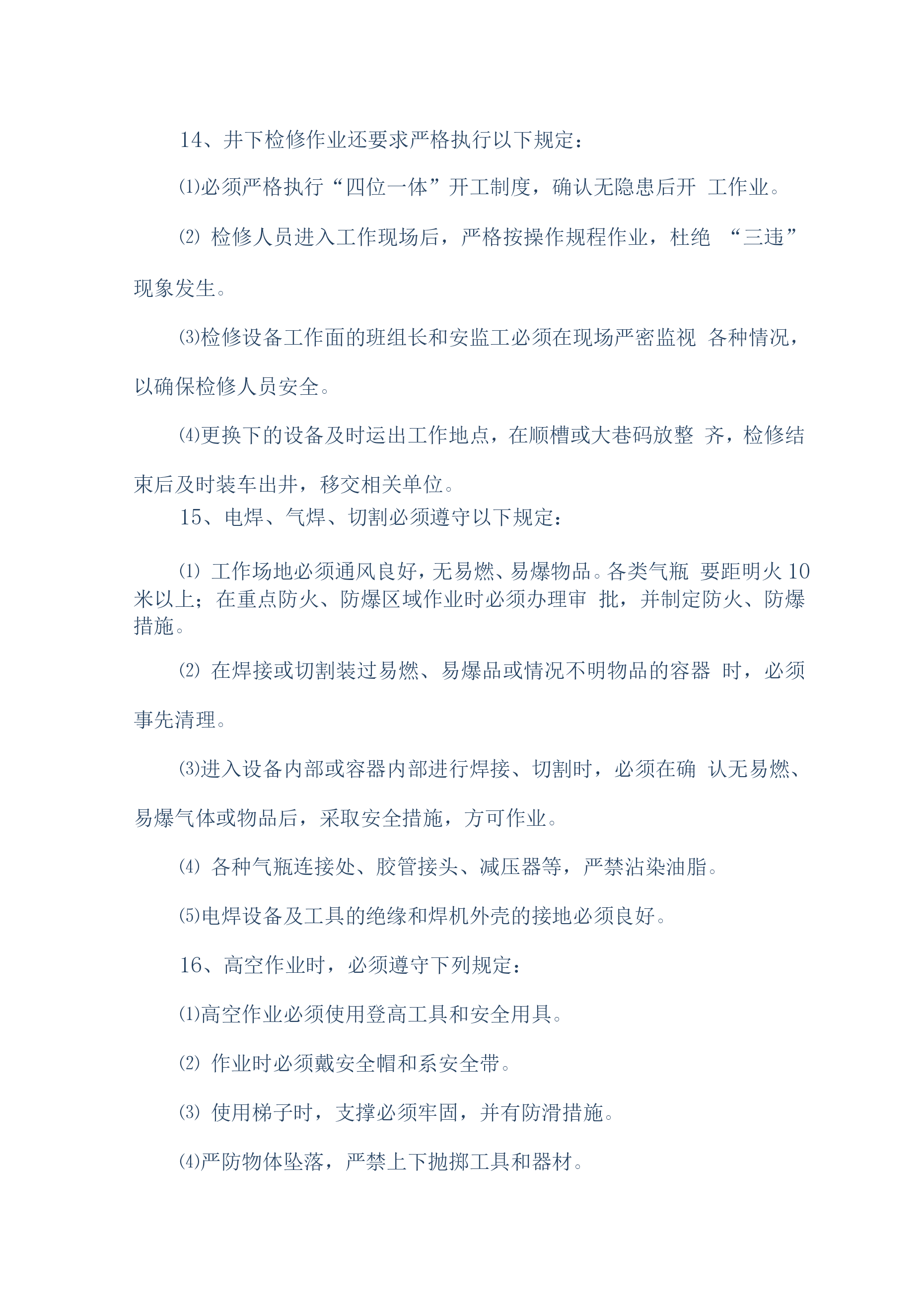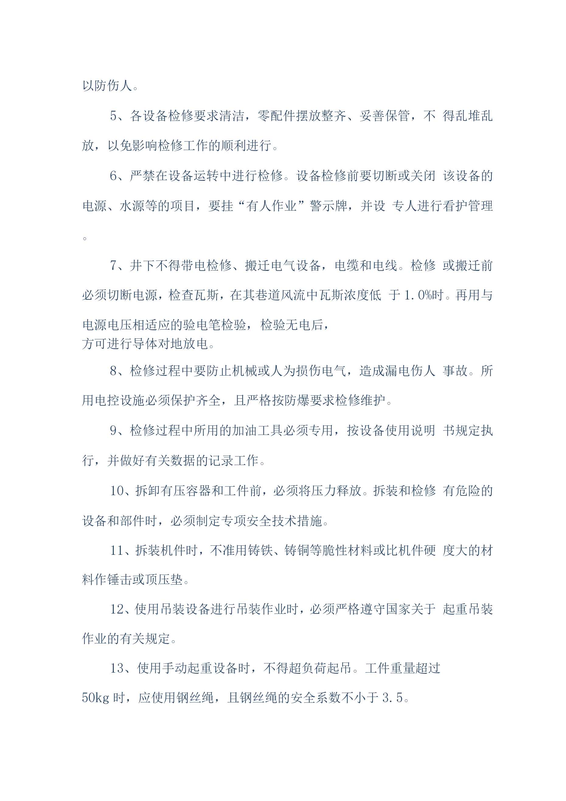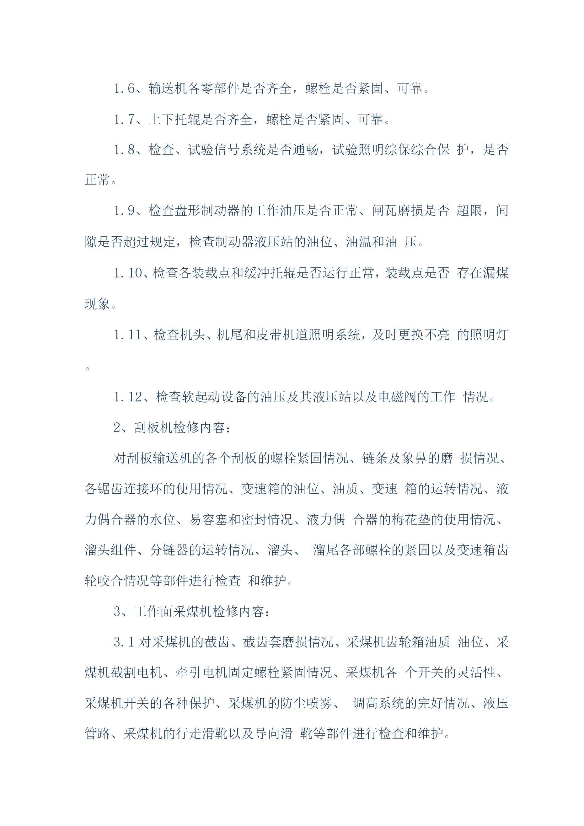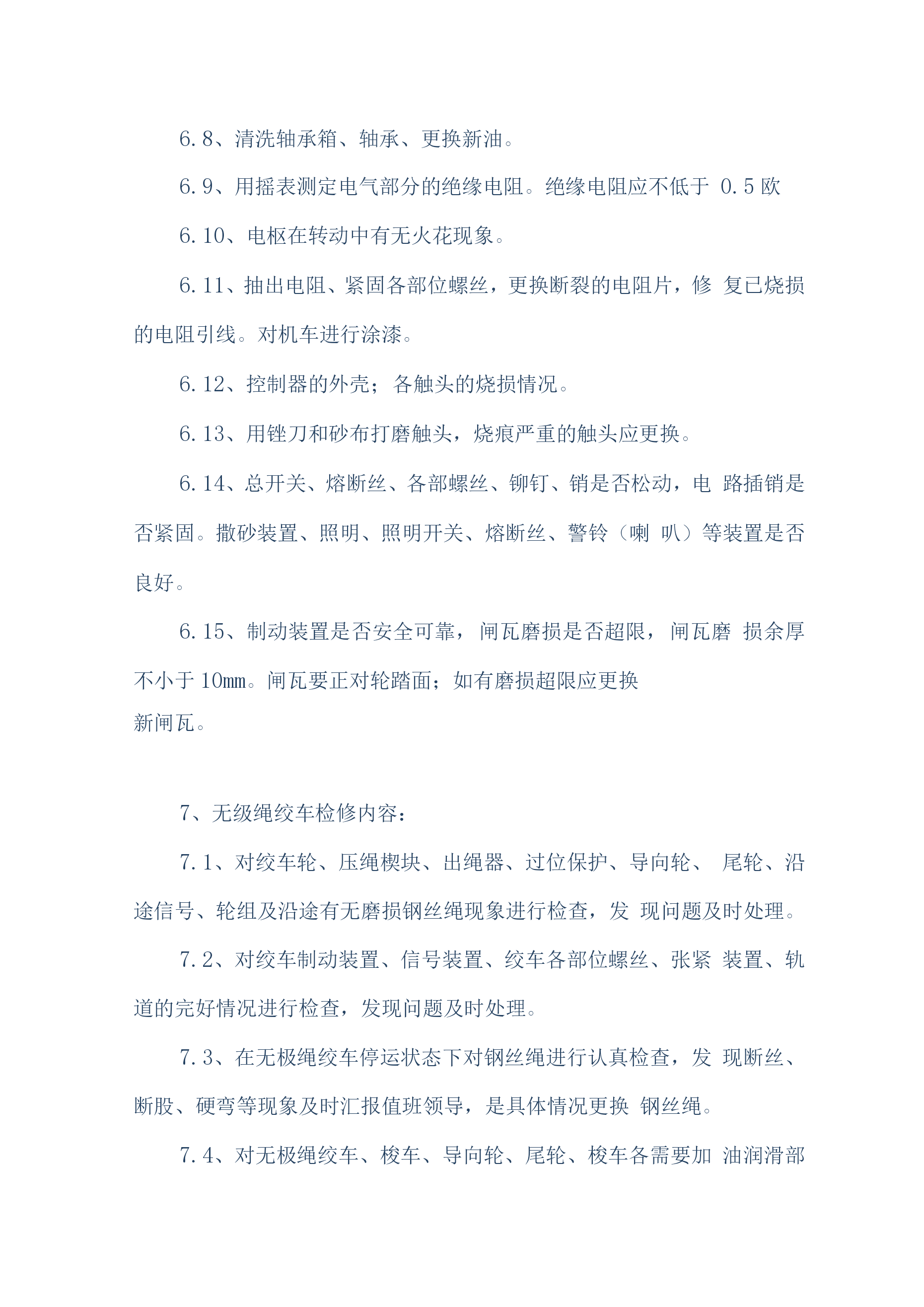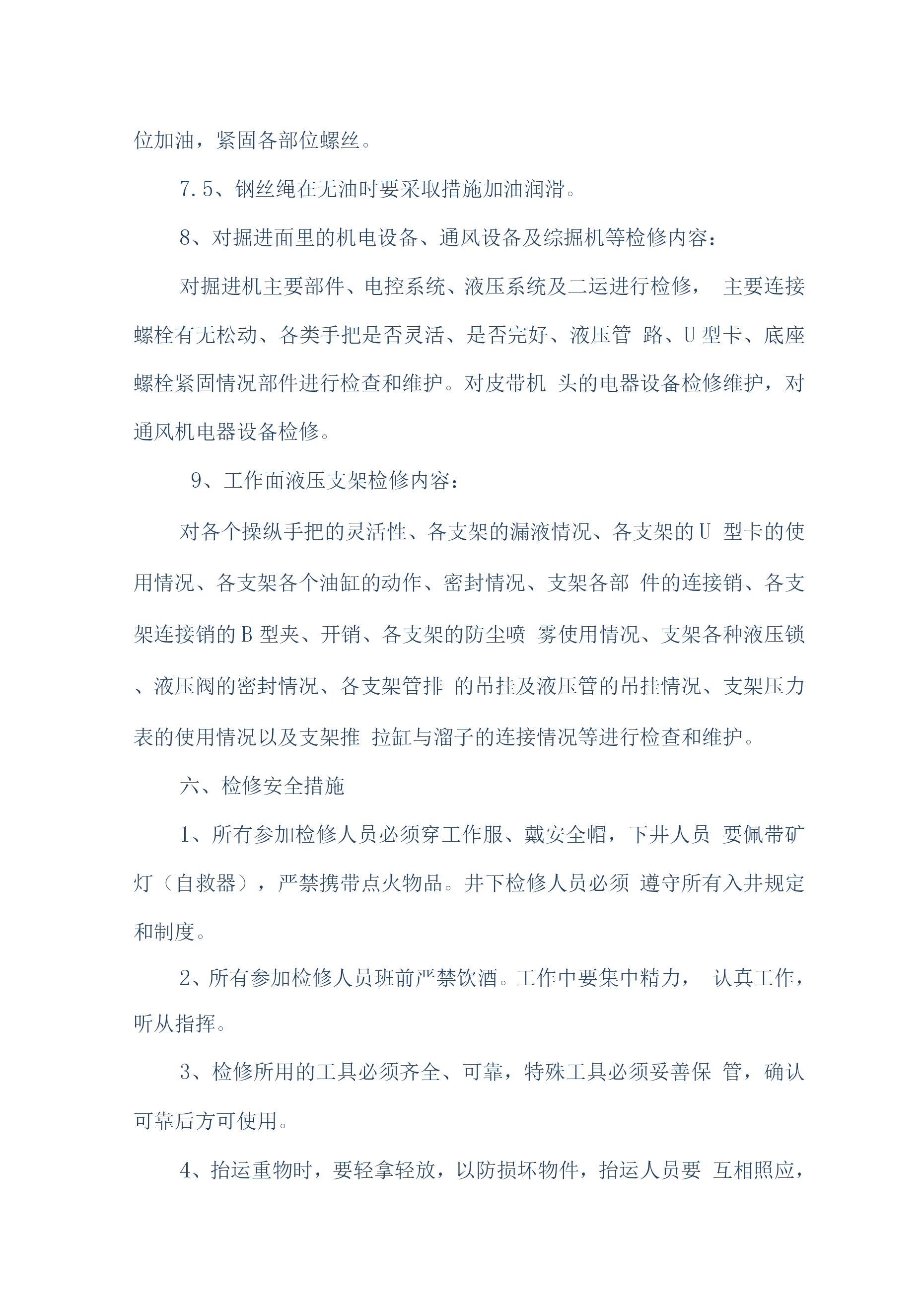 煤矿机电设备检修安全技术措施(通用)一、概述我公司机电设备检修人员计划于2019年6月20日对煤矿机机电设备进行维护、检修,为确保设备检修工作安全顺利的进行,特编制如下安全技术措施:二、检修时间2019年6月20日至2016年8月30日三、检修人员机构总负责:组长:副组长:组员:四、施工前的准备工作1、参加作业人员要分工分组,做到任务明确、安全责任明确。2、必须组织开展专题会议,明确检修任务,熟悉设备检修内容、工艺过程、质量标准和安全技术措施,保证检修质量及安全,做到分工明确,责任到人,并制定检修纪律,要求人人遵守。3、施工前,由安全负责人组织全体参加作业人员认真贯彻本措施,并签名。4、施工前应先对施工环境、设备情况、各系统情况进行了解,不允许在不了解施工环境、设备、系统的情况下冒然进行检修。5、施工前应详细阅读所检修设备的设备说明书及资料。6、施工前后,所用工具、材料材料、配件等准备齐全,清点清晰,由专人负责管理。7、检修单位必须提前一个班次通知调度室和相关单位,要求其全力协调各项检修工作。五、检修内容施工人员分为两组,一组负责检修井下采煤工作面设备的电控、机械、液压系统、运输线路。另外一组负责对井上主提升绞车、电机车、主井胶带机、采煤工作面梭车进行检修。两组同时进行工作。具体检修内容如下:1、带式输送机检修与维护内容:1.1、减速机、电动机及滚筒的温度是否正常,有无异常、异响。联轴器端面间隙是否正常,柱销有无损坏,护轮罩是否完好。1.2、输送带的运行是否正常,有无卡、磨、偏等不正常现象,输送带接头是否平直、良好、有无断、露钢丝。1.3、减速机、液力偶合器、液压站、软起动是否有泄漏现象,油位、油温、油压是否正常。1.4、输送带涨紧装置是否处于完好状态,涨紧压力是否合适,液压站和油路是否存在泄漏,拉紧钢丝绳磨损、断丝、锈蚀是否超限。1.5、检查有关电器设备和主、控、信号电缆是否完好,试验移变、馈电开关、磁力起动器过载、断相、漏电、短路保护是否正常,电器设备的接地引线、接地母线,接地极是否完好,并符合规定要求。1.6、输送机各零部件是否齐全,螺栓是否紧固、可靠。1.7、上下托辊是否齐全,螺栓是否紧固、可靠。1.8、检查、试验信号系统是否通畅,试验照明综保综合保护,是否正常。1.9、检查盘形制动器的工作油压是否正常、闸瓦磨损是否超限,间隙是否超过规定,检查制动器液压站的油位、油温和油压。1.10、检查各装载点和缓冲托辊是否运行正常,装载点是否存在漏煤现象。1.11、检查机头、机尾和皮带机道照明系统,及时更换不亮的照明灯。1.12、检查软起动设备的油压及其液压站以及电磁阀的工作情况。2、刮板机检修内容:对刮板输送机的各个刮板的螺栓紧固情况、链条及象鼻的磨损情况、各锯齿连接环的使用情况、变速箱的油位、油质、变速箱的运转情况、液力偶合器的水位、易容塞和密封情况、液力偶合器的梅花垫的使用情况、溜头组件、分链器的运转情况、溜头、溜尾各部螺栓的紧固以及变速箱齿轮咬合情况等部件进行检查和维护。3、工作面采煤机检修内容:3.1对采煤机的截齿、截齿套磨损情况、采煤机齿轮箱油质油位、采煤机截割电机、牵引电机固定螺栓紧固情况、采煤机各个开关的灵活性、采煤机开关的各种保护、采煤机的防尘喷雾、调高系统的完好情况、液压管路、采煤机的行走滑靴以及导向滑靴等部件进行检查和维护。3.2、对采煤机滚筒螺栓紧固情况、采煤机截割电机、牵引电机的绝缘情况、滚筒连接套间隙情况、各类接触器的使用情况、采煤机各部插头的连接情况、采煤机的电缆绝缘情况、电缆夹完好情况及供电电缆情况以及各个齿轮箱的齿轮咬合情况等部件进行一次全面检查。4、主提升机检修内容:主提升机主要对制动系统、齿轮箱、盘型闸、天轮、电控系统、钢丝绳及副井轨道和安全设施的检修。5、乳化泵的检修内容:对乳化泵主要部件、卸载阀、压力表完好情况,主要连接螺栓有无松动、各类手把是否灵活、活塞、曲轴连杆是否完好、液压管路、U型卡、底座螺栓紧固情况部件进行检查和维护。6、电机车检修内容:6.1、将电动机全部拆卸,检查车轴和车轮,轴的磨损不得超限,轴径磨损量不超过原直径的5%。无严重伤痕。6.2、检查各部轴承和更换磨损超限的轴承。6.3、检查修理插销、电阻箱、控制器、开关等设备,损坏严重的要进行更换。6.4、修理或更换已损坏的碰头和弹簧。6.5、矫正制动系统弯曲的反正扣。6.6、矫正所有变形的拉杠、板条和杠杆,并清扫全部机件、润滑全部关节。6.7、整修已损坏的齿轮罩。6.8、清洗轴承箱、轴承、更换新油。6.9、用摇表测定电气部分的绝缘电阻。绝缘电阻应不低于0.5欧6.10、电枢在转动中有无火花现象。6.11、抽出电阻、紧固