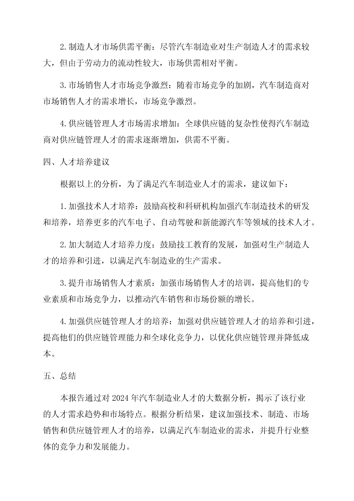 一、引言随着全球汽车工业的不断发展和技术进步,汽车制造业成为了国民经济的支柱产业之一、汽车制造业的重要性使得人才的需求变得尤为重要。本报告将通过对2024年汽车制造业人才的大数据分析,来探讨这一行业的人才趋势和市场需求。二、人才需求分析根据2024年的数据,汽车制造业的人才需求主要集中在以下几个方面:1.工程技术人才:汽车制造业需要大量的研发和技术人才,尤其是在汽车电子、自动驾驶和新能源汽车领域,技术人才需求最为旺盛。2.生产制造人才:汽车制造业需要大量的生产制造人才,包括生产线操作工、装配工、焊工等,以保证汽车生产线的正常运行。3.市场销售人才:随着消费升级和市场竞争的加剧,汽车制造商需要更多的市场销售人才,以推动汽车销售和市场份额的增长。4.供应链管理人才:在全球化的背景下,汽车制造商需要优化供应链管理,以提高效率和降低成本,因此对供应链管理人才的需求逐渐增加。三、人才市场分析根据数据显示,2024年汽车制造业的人才市场呈现以下特点:1.技术人才市场火热:由于技术创新的推动,汽车制造业对研发和技术人才的需求持续增长,技术人才市场竞争激烈。2.制造人才市场供需平衡:尽管汽车制造业对生产制造人才的需求较大,但由于劳动力的流动性较大,市场供需相对平衡。3.市场销售人才市场竞争激烈:随着市场竞争的加剧,汽车制造商对市场销售人才的需求增长,市场竞争激烈。4.供应链管理人才市场需求增加:全球供应链的复杂性使得汽车制造商对供应链管理人才的需求逐渐增加,供需不平衡。四、人才培养建议根据以上的分析,为了满足汽车制造业人才的需求,建议如下:1.加强技术人才培养:鼓励高校和科研机构加强汽车制造技术的研发和培养,培养更多的汽车电子、自动驾驶和新能源汽车等领域的技术人才。2.加大制造人才培养力度:鼓励技工教育的发展,加强对生产制造人才的培养和引进,以满足汽车制造业的生产需求。3.提升市场销售人才素质:加强市场销售人才的培训,提高他们的专业素质和市场竞争力,以推动汽车销售和市场份额的增长。4.加强供应链管理人才的培养:加强对供应链管理人才的培养和引进,提高他们的供应链管理能力和全球化竞争力,以优化供应链管理并降低成本。五、总结本报告通过对2024年汽车制造业人才的大数据分析,揭示了该行业的人才需求趋势和市场特点。根据分析结果,建议加强技术、制造、市场销售和供应链管理人才的培养,以满足汽车制造业的需求,并提升行业整体的竞争力和发展能力。