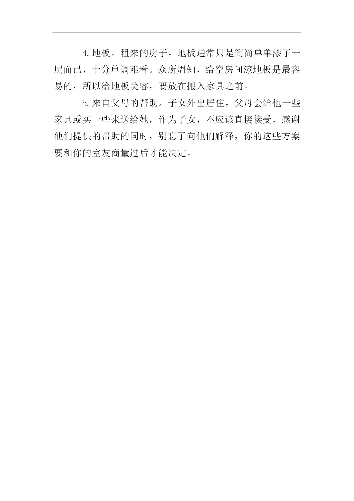 简单生活也可奢侈的礼仪对于一个才踏上工作岗位的女孩,凭着有限的工资,是不可能住上豪华公寓的。即使是两三个人和住,要创造出一个环境幽雅、便于整理且相当舒适的住处,也是很难的事。要创造一个好的居住环境,要注意的事有很多。这里主要是对有限空间的合理布局与装潢问题。1.色彩。要使房间显得明快大方,色彩的合理运用是最简单和最省钱的方法了。颜色的运用和搭配有很大学问,此处不多作介绍,但特别要强调的一点就是,颜色的运用不可太多、太复杂。否则,会给人感觉拥挤不堪,这对空间狭小的房间而言尤其是个禁忌。最简单的方法就是挑选一种感觉舒适的冷色调,颜色要调淡一点,并把它运用在其他物品上,如墙、家具、窗帘等等。2.家具摆设。将那些可以从家里带的和朋友处借的家具放在一边,把注意力转而放在那些必须要购买的物品上吧。毫无疑问的,二手市场上有时是能发现好而不贵的东西,象什么橱子、柜子,还有书橱、写字台之类,应有尽有。所有这些如果看上去太陈旧或颜色你不喜欢,那都是可以重新油漆的。慢慢找,肯定会有意外的惊喜。另外,坐卧两用的长沙发、可变化延伸的空间、钞票和旺盛的精力势必其他任何家具更有用的东西。3.灯光。灯光效果在天黑后就显得尤为重要了。而舒适的光线是不用花费很多钱来购买的。至于残破的天花板,可以用令人舒适、剪裁讲究的纸来覆盖掉。4.地板。租来的房子,地板通常只是简简单单漆了一层而已,十分单调难看。众所周知,给空房间漆地板是最容易的,所以给地板美容,要放在搬入家具之前。5.来自父母的帮助。子女外出居住,父母会给他一些家具或买一些来送给她,作为子女,不应该直接接受,感谢他们提供的帮助的同时,别忘了向他们解释,你的这些方案要和你的室友商量过后才能决定。