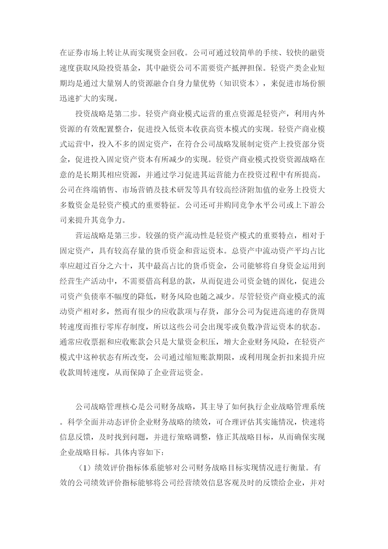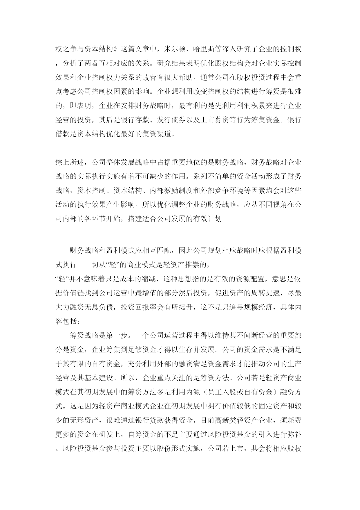在研究分析现代企业财务理论时有着举足轻重作用的理论是资本结构理论。我们将企业的资金来源中股权资本与债务资本之间存在的比例分配称之为资本结构,对资本结构还可以进行更精确的定义即为企业资金来源中优先股、普通股、长期债务以及短期债务这四项分别占有的比例。由于资本结构牵涉了三方(即管理层、股东和利益债权人)之间的利益冲突,研究内容包含了企业为谋求发展进行的筹资投资活动、经营过程中对资源进行配置以及搭建的资本结构是否合理,所以研究资本结构有着巨大的现实意义。依据财务管理基础理论,之所以实行财务管理是为了借助科学手段促进企业合理稳定经营发展,促进企业价值最大化的实现。同时,资本结构理论的重要研究方向还包括债务资本与权益资本在资本结构中的比例关系和资本结构发生变化如何影响企业经营发展方向的变化。首先,是关于激励理论的研究。激励理论指的是研究存在于企业经理行为和资本结构两者之间的关系。该理论经研究表明:收到资本结构影响的不仅包括企业经理层的工作水平、工作能力,还包括了公司的利润收入和其市场未来可获得的价值。研究同时还表明,激励理论将债务看成一种担保机制,在债务融资中起到了更强烈的作用。这一机制能够促进企业经理层自愿不断的将工作量增加,且在决策的时候具有更完善的判断能力,这就可以使自身从能价值得到更好实现,最终能够促使公司由于产权分离造成代理的费成本降低。加入不将公司债券发行在公司经理层,公司就可能面临更大的破产风险,同时因此经理层追求最大化利润思想会有所减小,从而导致市场中对的公司评价变得很不好,最终导致公司产生较高的使用资本成本;然而假如企业将公司债券发行至经理层,这可能会导致公司的债务风险与负担有所增加,由于公司的经营不善导致的资不抵债可能引起的破产风险会致使公司经营管理权从企业经理层的手中剥夺,基于以上问题经理层可能更多的考虑积极经营管理企业事务从而促进公司的最大化价值的实现,公司在市场中的反馈会大幅的提升,企业的利润也会随之提高,企业市场价值可以提升,企业竞争力随之不断增强。其次,是研究控制理论。表现为研究企业经营管理者由于企业的不同资本结构和偏好企业控制权的不同程度可能引起企业控制权的差异。在《公司控制权之争与资本结构》这篇文章中,米尔顿、哈里斯等深入研究了企业的控制权,分析了两者互相对应的关系。研究结果表明优化股权结构会对企业实际控制效果和企业控制权力关系的改善有很大帮助。通常公司在股权投资过程中会重点考虑公司控制权因素的影响。企业想利用改变控制权的结构进行筹资是很难的,即表明,企业在安排财务战略时,最有利的是先利用利润积累来进行企业经营的投资,其后是银行存款、发行债券以及上市募资等行为筹集资金。银行借款是资本结构优化最好的集资渠道。综上所述,公司整体发展战略中占据重要地位的是财务战略,财务战略对企业战略的实际执行实施有着不可缺少的作用。系列不简单的资金活动形成了财务战略,资本控制、资本结构、内部激励制度和外部竞争环境等因素均会对这些活动的执行效果产生影响。所以优化调整企业的财务战略,应从不同视角在公司内部的各环节开始,搭建适合公司发展的有效计划。财务战略和盈利模式应相互匹配,因此公司规划相应战略时应根据盈利模式执行。一切从“轻”的商业模式是轻资产推崇的,“轻”并不意味着只是成本的缩减,这种思想指的是有效的资源配置,意思是依据价值链找到公司运营中最增值的部分然后投资,促进资产的周转提速,尽最大力融资无息负债,投资回报率会有所提升,这不是只追寻规模经济,具体内容包括:筹资战略是第一步。一个公司运营过程中得以维持其不间断经营的重要部分是资金,企业筹集到足够资金才得以生存并发展。公司的资金需求是不满足于其有限的自有资金,充分利用外部的融资满足资金需求才能推动公司的生产经营及其基本建设。所以,企业重点关注的是筹资方法。公司若是轻资产商业模式在其初期发展中的筹资方法多是利用内源(员工入股或自有资金)融资方式。这是因为轻资产商业模式企业在初期发展中拥有价值较低的固定资产和较少的无形资产,很难通过银行贷款获得资金。目前高新类轻资产企业,须耗费更多的资金在研发上,自筹资金的不足主要通过风险投资基金的引入进行弥补。风险投资基金参与投资主要以股份形式实施,公司若上市,其会将相应股权在证券市场上转让从而实现资金回收。公司可通过较简单的手续、较快的融资速度获取风险投资基金,其中融资公司不需要资产抵押担保。轻资产类企业短期均是通过大量别人的资源融合自身力量优势(知识资本),来促进市场份额迅速扩大的实现。投资战略是第二步。轻资产商业模式运营的重点资源是轻资产,利用内外资源的有效配置整合,促进投入低资本收获高资本模式的实现。轻资产商业模式运营中,投入不多的固定资产,在符合公司战略发展制定资产上投资部分资金,促进投入固定资产资本有所减少的实现。轻