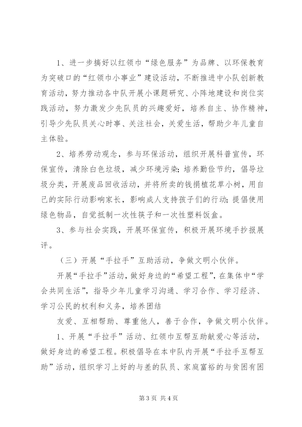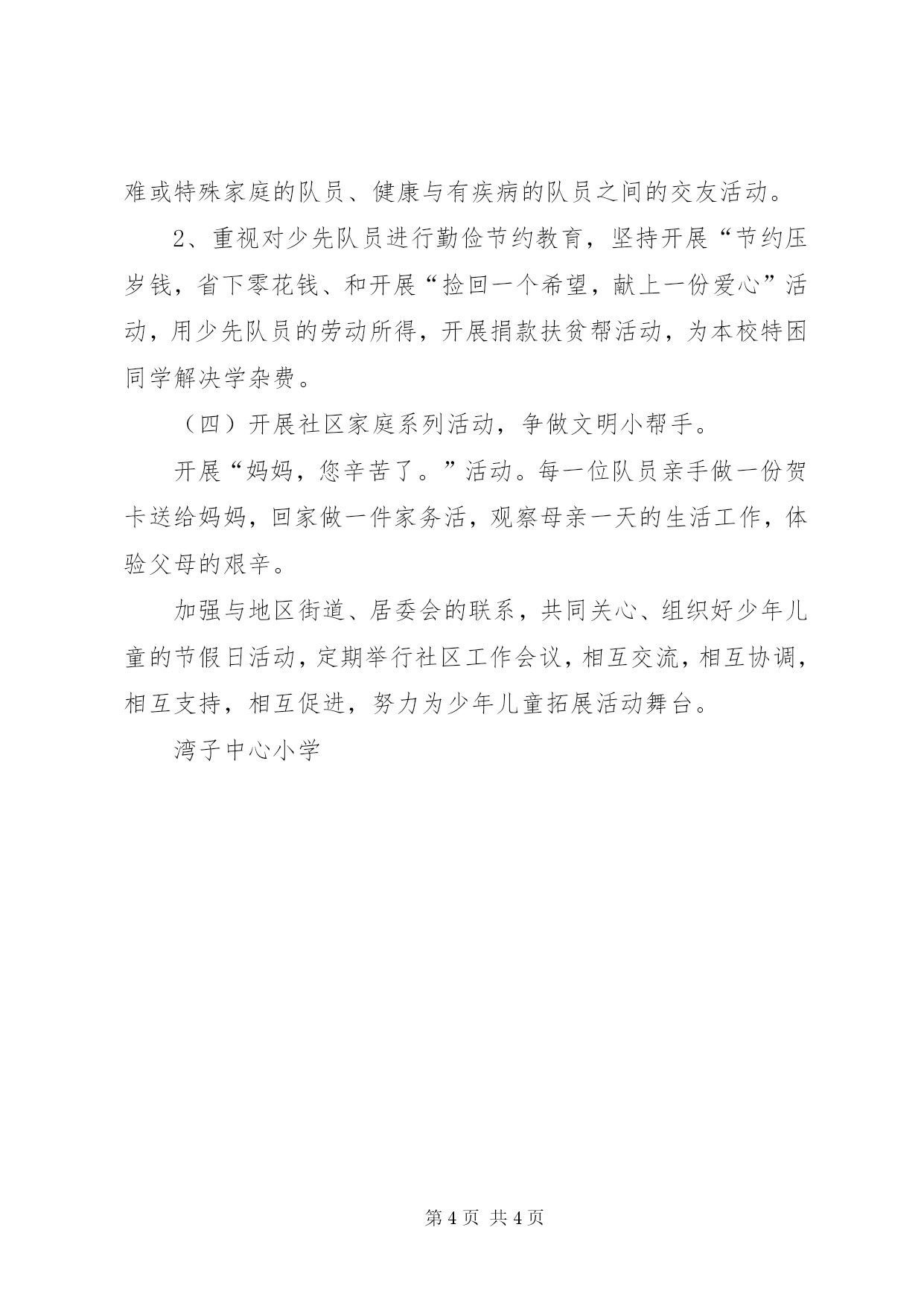 第PAGE\*Arabic\*MERGEFORMAT4页共NUMPAGES\*MERGEFORMAT4页道德实践活动方案道德教育实践活动方案倡导家庭、学校、社会支持儿童从小事做起,从身边事做起,引导儿童自主开展丰富多彩的道德实践活动,全面培养儿童的道德观念和社会责任感,逐渐养成良好的道德行为习惯。广泛开展“洁净家园,从我做起”“爱护校园,从我做起”等形式多样的、健康有益的活动。并在全校组织开展“我做合格小公民”的竞赛活动,培养少年儿童团结友爱、互相帮助、尊重他人、善于合作的精神。活动主题:一、在家里做孝敬父母、关心亲人、勤俭节约、热爱劳动的“小帮手”;二、在社会做热爱祖国、文明礼貌、诚实守信、遵纪守法的“小标兵”;三、在学校做团结友爱、互相帮助、尊重他人、善于合作的“小伙伴”;四、在社区爱护公物、讲究卫生、保护环境、遵守秩序的“小卫士”;五、在独处时做胸怀开阔、心理健康、勤奋自立、勇于创新的“小主人”。具体工作:(一)开展公民道德教育,争做文明小标兵。围绕公民道德实施纲要,分层次开展公民道德教育,进行爱国主义、集体主义和革命传统教育活动,培养少年儿童热爱祖国、文明礼貌、诚实守信、遵纪守法,争做文明小标兵。1、以雷锋为榜样,开展“发扬雷锋精神,续写雷锋日记”活动,通过多种形式的学雷锋活动,培养少先队员关心集体,关心他人。2、开展“我最喜欢的道德格言”征集。组织少年儿童围绕“爱国守法、明礼诚信、团结友善、勤俭自强、敬业奉献”二十字基本道德规范要求,发动学生用自己的语言创作富有少儿特色的道德格言。3、努力搞好学规范、见行动教育,促进文明礼貌、道德纪律、卫生习惯、勤俭节约等方面的养成,通过岗位实践,服务体验,培养少年儿童讲礼仪、守纪律、诚实节俭的好习惯。4、认真落实《公民道德实施纲要》,分层次地进行行为规范的教育和训练,低年级进行《中小学生守则》教育,中年级进行《小学生日常行为规范》的学习和训练,高年级进行《公民道德实施纲要》学习、理解和训练。(二)参加“红领巾环保小事业”建设,争做文明小卫士。以环境教育为特色,开展卫生习惯、保护环境和劳动观念的教育,培养少年儿童爱护公物、讲究卫生、保护环境、遵守秩序;孝顺父母关心亲人、勤俭节约、热爱劳动,争做文明小卫士、小帮手。1、进一步搞好以红领巾“绿色服务”为品牌、以环保教育为突破口的“红领巾小事业”建设活动,不断推进中小队创新教育活动,努力推动各中队开展小课题研究、小阵地建设和岗位实践活动,努力激发少先队员的兴趣爱好,培养自主、协作精神,引导少先队员关心时事、关注社会,关爱生活,帮助少年儿童自主体验。2、培养劳动观念,参与环保活动,组织开展科普宣传,环保宣传,清除白色垃圾,减少环境污染;培养勤俭节约,倡导垃圾分类,开展废品回收活动,并将所卖的钱捐植花草小树,用自己的实际行动影响家长,影响成人支持孩子们的行动;提倡使用绿色物品,自觉抵制一次性筷子和一次性塑料饭盒。3、参与社会实践,开展环保宣传,积极开展环境手抄报展评。(三)开展“手拉手”互助活动,争做文明小伙伴。开展“手拉手”活动,做好身边的“希望工程”,在集体中“学会共同生活”,指导少年儿童学习沟通、学习合作、学习经济、学习公民的权利和义务,培养团结友爱、互相帮助、尊重他人,善于合作,争做文明小伙伴。1、开展“手拉手”活动、红领巾互帮互助献爱心等活动,做好身边的希望工程。积极倡导在本中队内开展“手拉手互帮互助”活动,组织学习上好的与差的队员、家庭富裕的与贫困有困难或特殊家庭的队员、健康与有疾病的队员之间的交友活动。2、重视对少先队员进行勤俭节约教育,坚持开展“节约压岁钱,省下零花钱、和开展“捡回一个希望,献上一份爱心”活动,用少先队员的劳动所得,开展捐款扶贫帮活动,为本校特困同学解决学杂费。(四)开展社区家庭系列活动,争做文明小帮手。开展“妈妈,您辛苦了。”活动。每一位队员亲手做一份贺卡送给妈妈,回家做一件家务活,观察母亲一天的生活工作,体验父母的艰辛。加强与地区街道、居委会的联系,共同关心、组织好少年儿童的节假日活动,定期举行社区工作会议,相互交流,相互协调,相互支持,相互促进,努力为少年儿童拓展活动舞台。湾子中心小学
