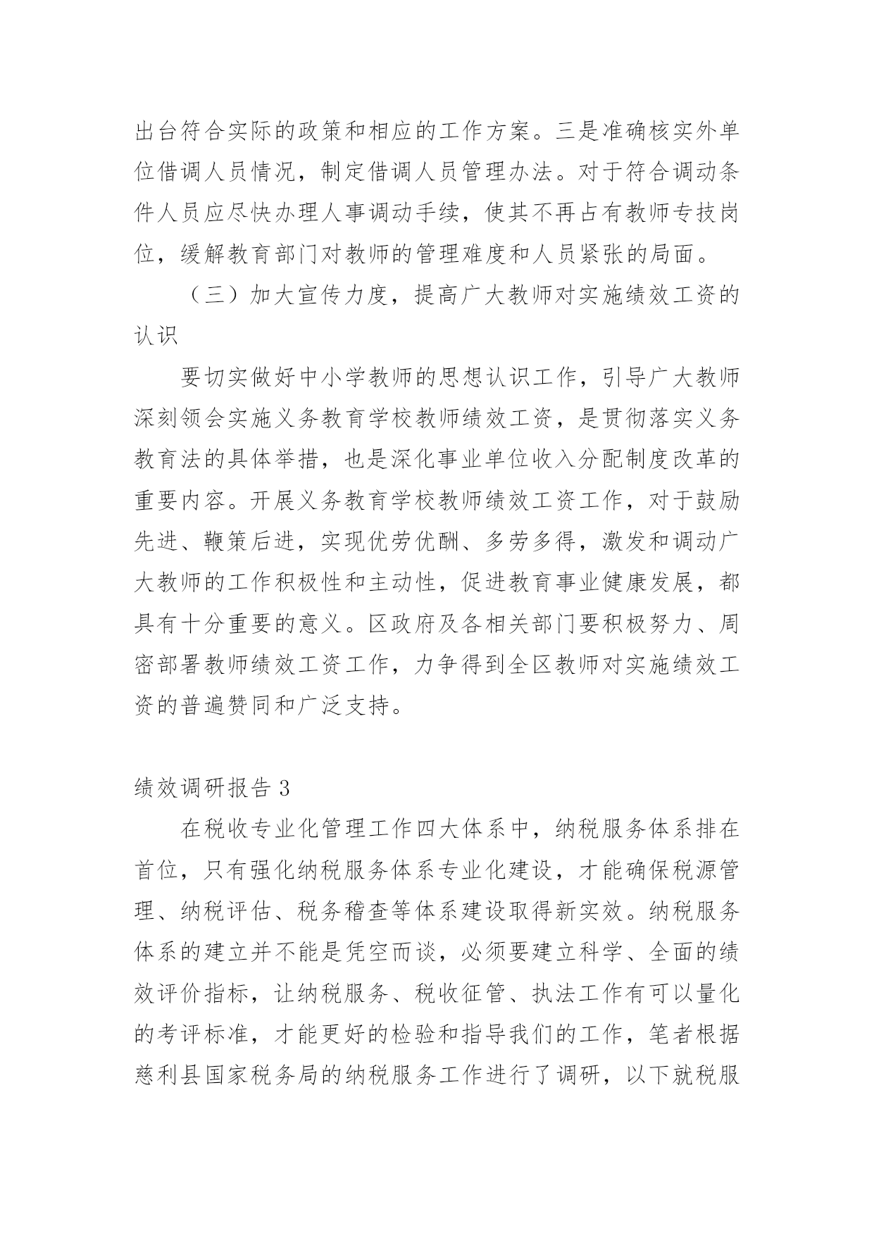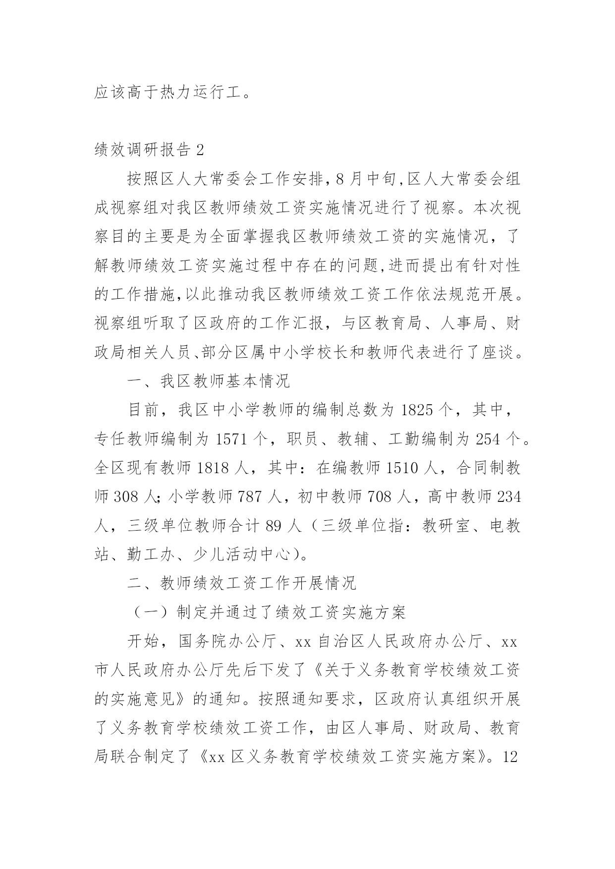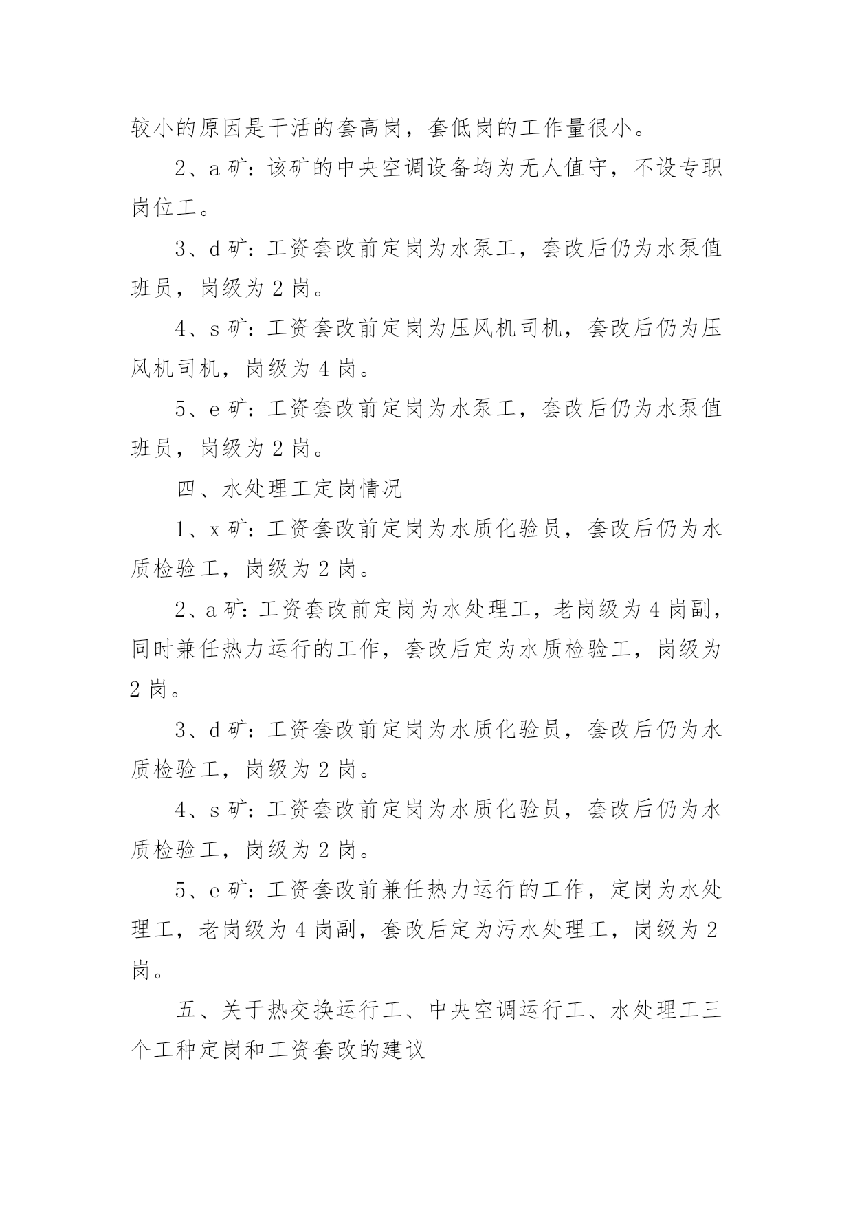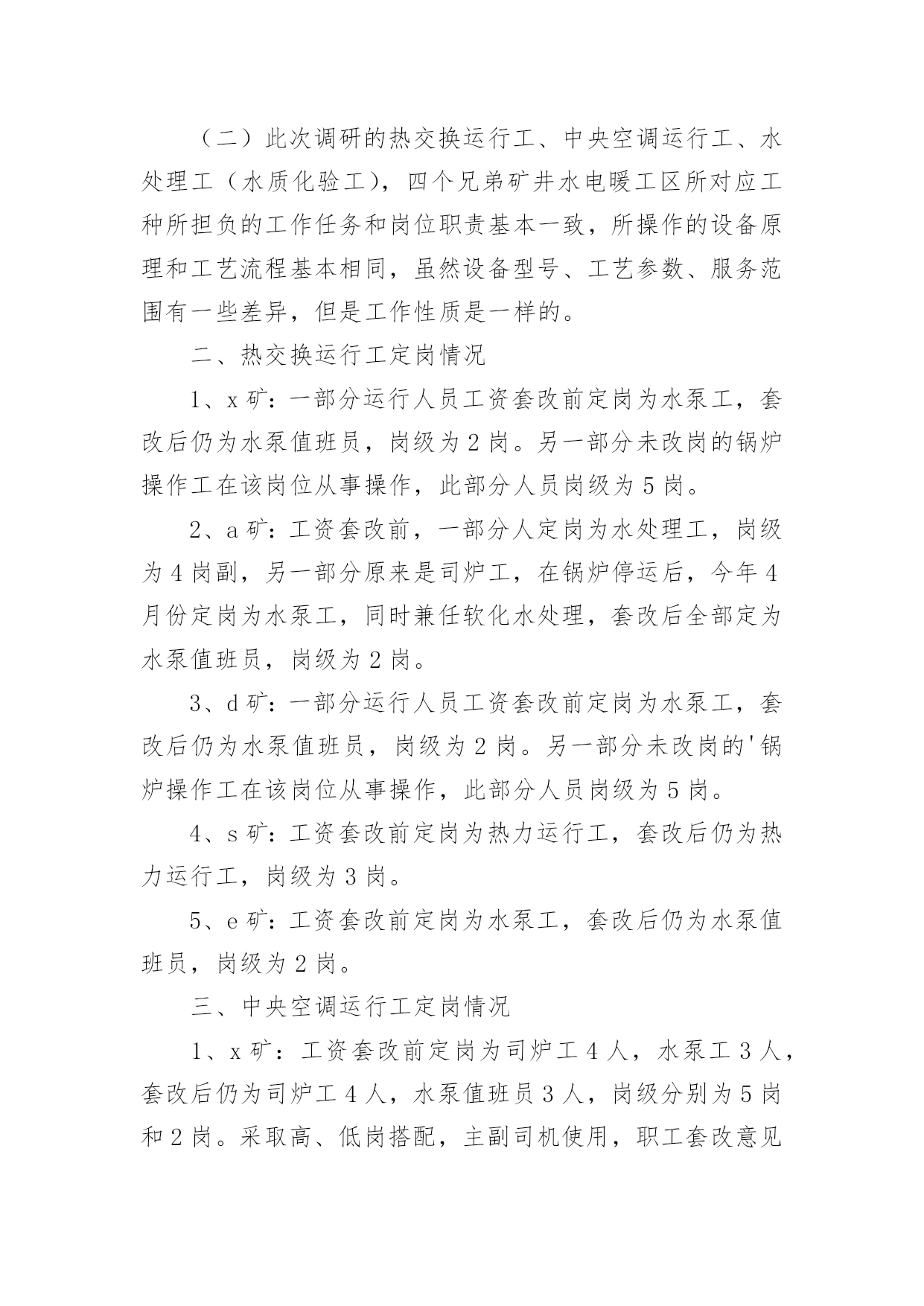 绩效调研报告绩效调研报告15篇【推荐】在经济发展迅速的今天,报告的使用成为日常生活的常态,不同种类的报告具有不同的用途。那么一般报告是怎么写的呢?下面是小编整理的绩效调研报告,仅供参考,希望能够帮助到大家。绩效调研报告1矿领导:集团公司实施岗位绩效工资制改革,全区职工坚决拥护和支持,但是存在部分职工套改工种岗位与实际从事的工作岗位不相符的问题,职工们反映强烈,思想波动大,给工区管理带来不稳定因素。为了维护正常的工作秩序,实现全年安全生产的目标,我区坚持以人为本、实事求是、公平公正的原则,于11月9日-12日,由党支部书记张献斌带队,成员有技术主管葛令浩、副班长薛杰、职工代表许尔春、梅红卫、李庆兰、江升,前往济三煤矿、鲍店煤矿、南屯煤矿、兴隆庄煤矿四家兄弟单位进行调研,现将调研情况汇报如下。一、工作性质及职责范围(一)四个兄弟矿井水电暖工区管辖范围基本相近,其主要工作都是负责全矿水电暖供应及维修、水源井设备检修、矿井水处理、办公楼水电暖维修、工广区照明维护和更换。(二)此次调研的热交换运行工、中央空调运行工、水处理工(水质化验工),四个兄弟矿井水电暖工区所对应工种所担负的工作任务和岗位职责基本一致,所操作的设备原理和工艺流程基本相同,虽然设备型号、工艺参数、服务范围有一些差异,但是工作性质是一样的。二、热交换运行工定岗情况1、x矿:一部分运行人员工资套改前定岗为水泵工,套改后仍为水泵值班员,岗级为2岗。另一部分未改岗的锅炉操作工在该岗位从事操作,此部分人员岗级为5岗。2、a矿:工资套改前,一部分人定岗为水处理工,岗级为4岗副,另一部分原来是司炉工,在锅炉停运后,今年4月份定岗为水泵工,同时兼任软化水处理,套改后全部定为水泵值班员,岗级为2岗。3、d矿:一部分运行人员工资套改前定岗为水泵工,套改后仍为水泵值班员,岗级为2岗。另一部分未改岗的'锅炉操作工在该岗位从事操作,此部分人员岗级为5岗。4、s矿:工资套改前定岗为热力运行工,套改后仍为热力运行工,岗级为3岗。5、e矿:工资套改前定岗为水泵工,套改后仍为水泵值班员,岗级为2岗。三、中央空调运行工定岗情况1、x矿:工资套改前定岗为司炉工4人,水泵工3人,套改后仍为司炉工4人,水泵值班员3人,岗级分别为5岗和2岗。采取高、低岗搭配,主副司机使用,职工套改意见较小的原因是干活的套高岗,套低岗的工作量很小。2、a矿:该矿的中央空调设备均为无人值守,不设专职岗位工。3、d矿:工资套改前定岗为水泵工,套改后仍为水泵值班员,岗级为2岗。4、s矿:工资套改前定岗为压风机司机,套改后仍为压风机司机,岗级为4岗。5、e矿:工资套改前定岗为水泵工,套改后仍为水泵值班员,岗级为2岗。四、水处理工定岗情况1、x矿:工资套改前定岗为水质化验员,套改后仍为水质检验工,岗级为2岗。2、a矿:工资套改前定岗为水处理工,老岗级为4岗副,同时兼任热力运行的工作,套改后定为水质检验工,岗级为2岗。3、d矿:工资套改前定岗为水质化验员,套改后仍为水质检验工,岗级为2岗。4、s矿:工资套改前定岗为水质化验员,套改后仍为水质检验工,岗级为2岗。5、e矿:工资套改前兼任热力运行的工作,定岗为水处理工,老岗级为4岗副,套改后定为污水处理工,岗级为2岗。五、关于热交换运行工、中央空调运行工、水处理工三个工种定岗和工资套改的建议为了维护职工的合法权益,稳定职工思想,根据兄弟矿井同工种、同岗位的定岗情况,并结合我矿实际从事的工种岗位和性质,特提出以下建议和意见,望上级组织给予采纳和解决:1、热交换运行工:套改工种为水泵值班员,岗级为2岗,建议改为热力运行工,岗级为3岗。其定岗理由为:(1)兄弟矿井同样工种设置:s矿从事同样工作的人员现定岗为热力运行工,岗级为3岗。(2)生产工艺方面:岗位工持有地方劳动部门颁发的压力容器操作证,属于具备专业技能的特殊工种,供热面积大,安全生产责任大,生产工艺流程复杂,应定岗为热力运行工。2、中央空调运行工:套改工种为水泵值班员,岗级为2岗,建议改为压风机司机,岗级为4岗。其定岗理由为:(1)兄弟矿井同样工种设置:s矿从事同样工作的人员现定岗为压风机司机,岗级为4岗。(2)生产工艺方面:岗位工持有地方劳动部门颁发的压力容器操作证,属于具备专业技能的特殊工种,供热、制冷面积大,安全生产责任大,生产工艺流程复杂,且噪音污染突出,应定岗为压风机司机。3、水处理工:套改工种为污水处理工,岗级为2岗,属于套错工种名称,造成了无故下调了这个岗位的工资级别,从原先的水处理工4岗副,套改成现在的污水处理工2岗,建议恢复水处理工的工种,或新增软化水处理工工种,岗级应该高于热力运行工。绩效调研报告2按照区人大常委会工作安排,8月中旬,区人大常委会组成视察组对我区教师绩效工资实施情况进行了视察。本次视察目的主要是为全面掌握