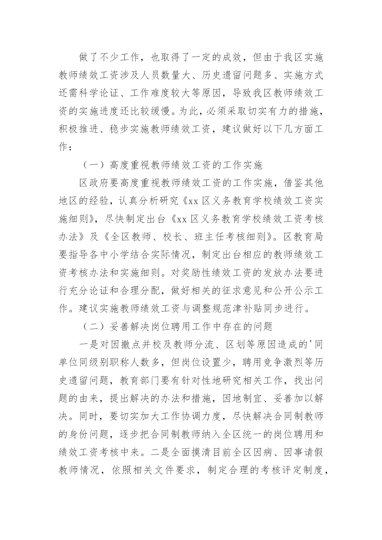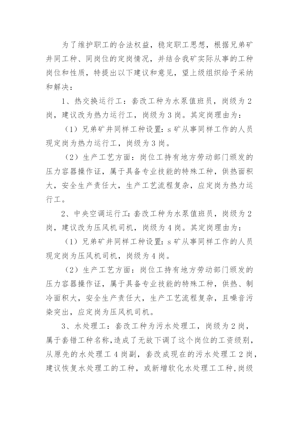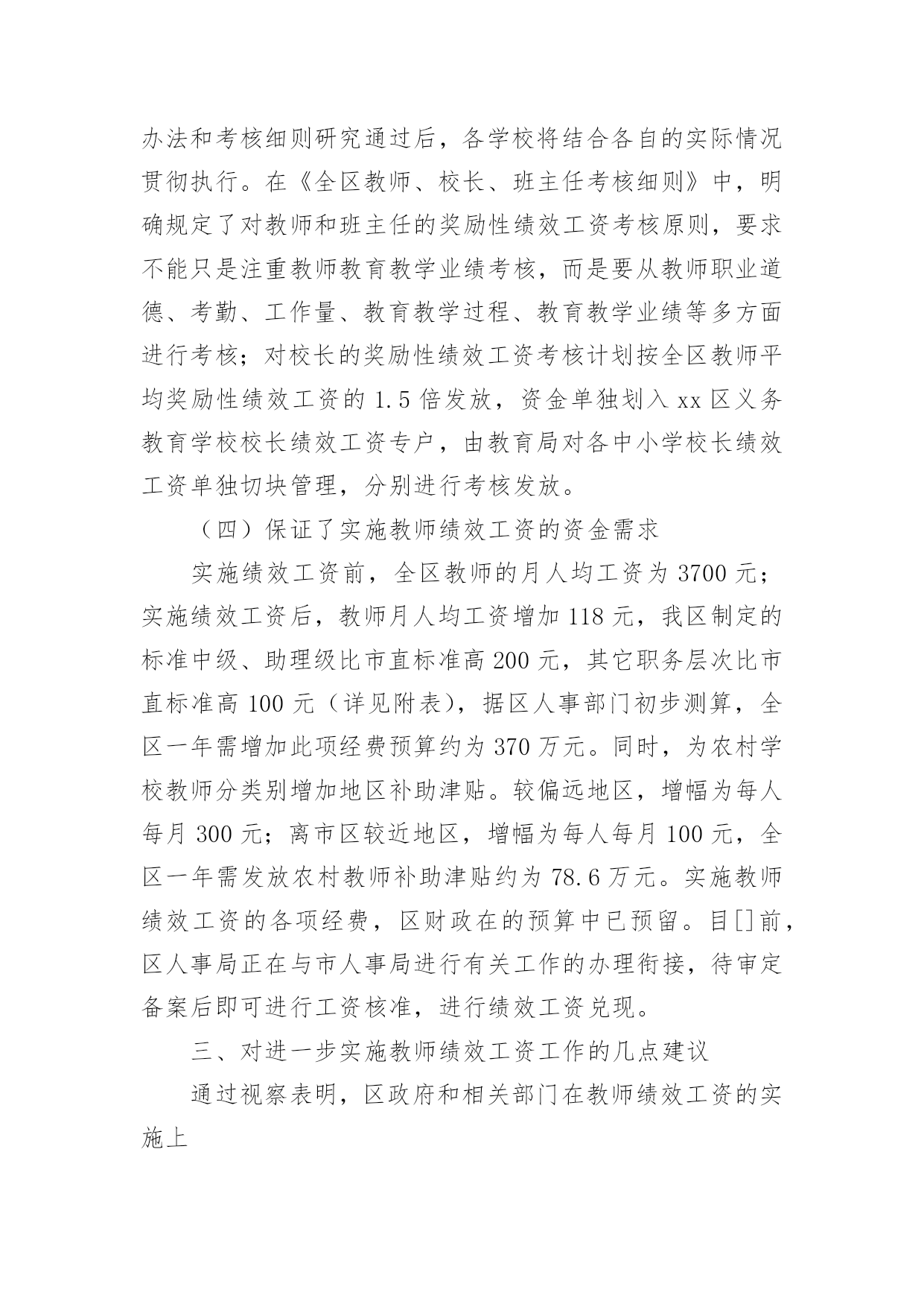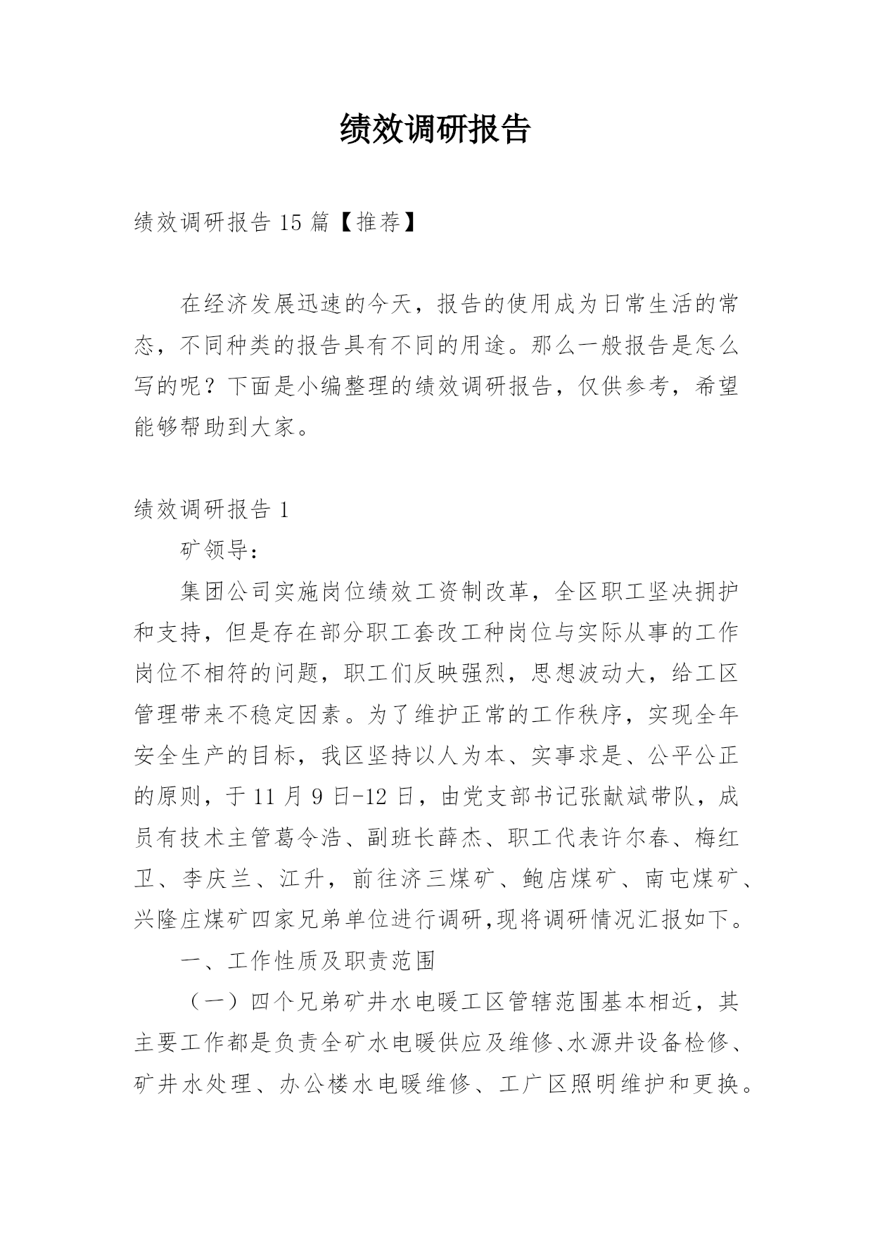 绩效调研报告绩效调研报告15篇【推荐】在经济发展迅速的今天,报告的使用成为日常生活的常态,不同种类的报告具有不同的用途。那么一般报告是怎么写的呢?下面是小编整理的绩效调研报告,仅供参考,希望能够帮助到大家。绩效调研报告1矿领导:集团公司实施岗位绩效工资制改革,全区职工坚决拥护和支持,但是存在部分职工套改工种岗位与实际从事的工作岗位不相符的问题,职工们反映强烈,思想波动大,给工区管理带来不稳定因素。为了维护正常的工作秩序,实现全年安全生产的目标,我区坚持以人为本、实事求是、公平公正的原则,于11月9日-12日,由党支部书记张献斌带队,成员有技术主管葛令浩、副班长薛杰、职工代表许尔春、梅红卫、李庆兰、江升,前往济三煤矿、鲍店煤矿、南屯煤矿、兴隆庄煤矿四家兄弟单位进行调研,现将调研情况汇报如下。一、工作性质及职责范围(一)四个兄弟矿井水电暖工区管辖范围基本相近,其主要工作都是负责全矿水电暖供应及维修、水源井设备检修、矿井水处理、办公楼水电暖维修、工广区照明维护和更换。(二)此次调研的热交换运行工、中央空调运行工、水处理工(水质化验工),四个兄弟矿井水电暖工区所对应工种所担负的工作任务和岗位职责基本一致,所操作的设备原理和工艺流程基本相同,虽然设备型号、工艺参数、服务范围有一些差异,但是工作性质是一样的。二、热交换运行工定岗情况1、x矿:一部分运行人员工资套改前定岗为水泵工,套改后仍为水泵值班员,岗级为2岗。另一部分未改岗的锅炉操作工在该岗位从事操作,此部分人员岗级为5岗。2、a矿:工资套改前,一部分人定岗为水处理工,岗级为4岗副,另一部分原来是司炉工,在锅炉停运后,今年4月份定岗为水泵工,同时兼任软化水处理,套改后全部定为水泵值班员,岗级为2岗。3、d矿:一部分运行人员工资套改前定岗为水泵工,套改后仍为水泵值班员,岗级为2岗。另一部分未改岗的'锅炉操作工在该岗位从事操作,此部分人员岗级为5岗。4、s矿:工资套改前定岗为热力运行工,套改后仍为热力运行工,岗级为3岗。5、e矿:工资套改前定岗为水泵工,套改后仍为水泵值班员,岗级为2岗。三、中央空调运行工定岗情况1、x矿:工资套改前定岗为司炉工4人,水泵工3人,套改后仍为司炉工4人,水泵值班员3人,岗级分别为5岗和2岗。采取高、低岗搭配,主副司机使用,职工套改意见较小的原因是干活的套高岗,套低岗的工作量很小。2、a矿:该矿的中央空调设备均为无人值守,不设专职岗位工。3、d矿:工资套改前定岗为水泵工,套改后仍为水泵值班员,岗级为2岗。4、s矿:工资套改前定岗为压风机司机,套改后仍为压风机司机,岗级为4岗。5、e矿:工资套改前定岗为水泵工,套改后仍为水泵值班员,岗级为2岗。四、水处理工定岗情况1、x矿:工资套改前定岗为水质化验员,套改后仍为水质检验工,岗级为2岗。2、a矿:工资套改前定岗为水处理工,老岗级为4岗副,同时兼任热力运行的工作,套改后定为水质检验工,岗级为2岗。3、d矿:工资套改前定岗为水质化验员,套改后仍为水质检验工,岗级为2岗。4、s矿:工资套改前定岗为水质化验员,套改后仍为水质检验工,岗级为2岗。5、e矿:工资套改前兼任热力运行的工作,定岗为水处理工,老岗级为4岗副,套改后定为污水处理工,岗级为2岗。五、关于热交换运行工、中央空调运行工、水处理工三个工种定岗和工资套改的建议为了维护职工的合法权益,稳定职工思想,根据兄弟矿井同工种、同岗位的定岗情况,并结合我矿实际从事的工种岗位和性质,特提出以下建议和意见,望上级组织给予采纳和解决:1、热交换运行工:套改工种为水泵值班员,岗级为2岗,建议改为热力运行工,岗级为3岗。其定岗理由为:(1)兄弟矿井同样工种设置:s矿从事同样工作的人员现定岗为热力运行工,岗级为3岗。(2)生产工艺方面:岗位工持有地方劳动部门颁发的压力容器操作证,属于具备专业技能的特殊工种,供热面积大,安全生产责任大,生产工艺流程复杂,应定岗为热力运行工。2、中央空调运行工:套改工种为水泵值班员,岗级为2岗,建议改为压风机司机,岗级为4岗。其定岗理由为:(1)兄弟矿井同样工种设置:s矿从事同样工作的人员现定岗为压风机司机,岗级为4岗。(2)生产工艺方面:岗位工持有地方劳动部门颁发的压力容器操作证,属于具备专业技能的特殊工种,供热、制冷面积大,安全生产责任大,生产工艺流程复杂,且噪音污染突出,应定岗为压风机司机。3、水处理工:套改工种为污水处理工,岗级为2岗,属于套错工种名称,造成了无故下调了这个岗位的工资级别,从原先的水处理工4岗副,套改成现在的污水处理工2岗,建议恢复水处理工的工种,或新增软化水处理工工种,岗级应该高于热力运行工。绩效调研报告2按照区人大常委会工作安排,8月中旬,区人大常委会组成视察组对我区教师绩效工资实施情况进行了视察。本次视察目的主要是为全面掌握
