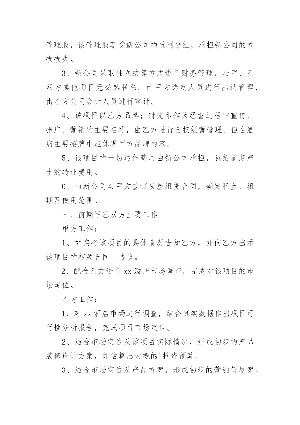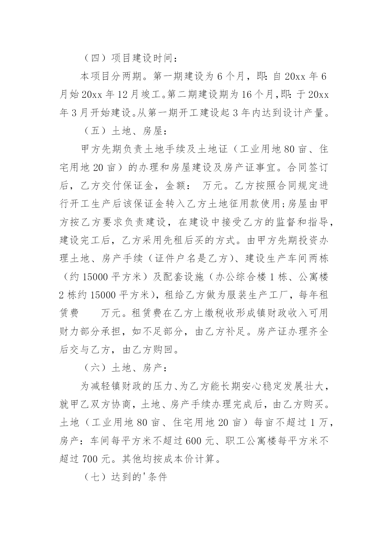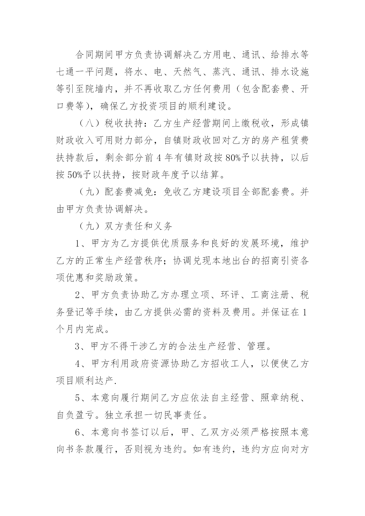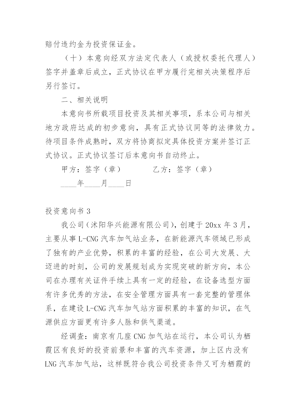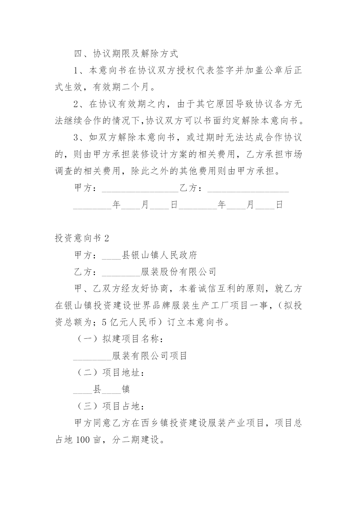 投资意向书【热门】投资意向书在现实社会中,我们很多时候都使用到意向书,需要注意的是法律并没有对意向书的效力作出规定,那么相关的意向书到底怎么写呢?以下是小编精心整理的投资意向书,仅供参考,欢迎大家阅读。投资意向书1甲方:_____________________乙方:_____________________根据中华人民共和国相关法律、法规,甲、乙双方经过友好协商,就_______市_______路_______酒店项目的改造、经营合作事宜,达成意向如下,并共同遵守执行。一、合作事项1、项目名称:现名xx园酒店(以下简称该项目)2、项目地址:_______省______市______路______号3、合作范围:现xx园酒店3-6层(含一层酒店前厅)二、合作方式1、由甲、乙双方共同出资注册拥有独立法人资格的公司(以下简称新公司)对该项目进行装修改造及后期经营管理。2、出资占股比例:甲方出资59%占股59%,乙方出资41%占股41%。甲方给予乙方新公司整体10%的股份作为乙方的管理股,该管理股享受新公司的盈利分红,承担新公司的亏损损失。3、新公司采取独立结算方式进行财务管理,与甲、乙双方其他项目无必然联系。由甲方选定人员进行出纳管理,由乙方公司会计人员进行审计。4、该项目以乙方品牌;时光印作为经营过程中宣传、推广、营销的主要名称,由乙方进行全权经营管理。但在酒店主要招牌中应体现甲方品牌内容。5、该项目的一切运作费用由新公司承担,包括前期产生的转让费用。6、由新公司与甲方签订房屋租赁合同,确定租金、租期及使用范围。三、前期甲乙双方主要工作甲方工作:1、如实将该项目的具体情况告知乙方,并向乙方出示该项目的相关合同、协议。2、配合乙方进行xx酒店市场调查,完成对该项目的市场定位。乙方工作:1、对xx酒店市场进行调查,结合真实数据作出项目可行性分析报告,完成项目市场定位。2、结合市场定位及该项目实际情况,形成初步的产品装修设计方案,并估算出大概的'投资预算。3、结合市场定位及产品方案,形成初步的营销策划案。四、协议期限及解除方式1、本意向书在协议双方授权代表签字并加盖公章后正式生效,有效期二个月。2、在协议有效期之内,由于其它原因导致协议各方无法继续合作的情况下,协议双方可以书面约定解除本意向书。3、如双方解除本意向书,或过期时无法达成合作协议的,则由甲方承担装修设计方案的相关费用,乙方承担市场调查的相关费用,除此之外的其他费用则由甲方承担。甲方:________________乙方:_________________________年____月____日________年____月____日投资意向书2甲方:____县银山镇人民政府乙方:________服装股份有限公司甲、乙双方经友好协商,本着诚信互利的原则,就乙方在银山镇投资建设世界品牌服装生产工厂项目一事,(拟投资总额为;5亿元人民币)订立本意向书。(一)拟建项目名称:________服装有限公司项目(二)项目地址:____县____镇(三)项目占地:甲方同意乙方在西乡镇投资建设服装产业项目,项目总占地100亩,分二期建设。(四)项目建设时间:本项目分两期。第一期建设为6个月,即:自20xx年6月始20xx年12月竣工。第二期建设期为16个月,即:于20xx年3月开始建设。从第一期开工建设起3年内达到设计产量。(五)土地、房屋:甲方先期负责土地手续及土地证(工业用地80亩、住宅用地20亩)的办理和房屋建设及房产证事宜。合同签订后,乙方交付保证金,金额:万元。乙方按照合同规定进行开工生产后该保证金转入乙方土地征用款使用;房屋由甲方按乙方要求负责建设,在建设中接受乙方的监督和指导,建设完工后,乙方采用先租后买的方式。由甲方先期投资办理土地、房产手续(证件户名是乙方)、建设生产车间两栋(约15000平方米)及配套设施(办公综合楼1栋、公寓楼2栋约15000平方米),租给乙方做为服装生产工厂,每年租赁费万元。租赁费在乙方上缴税收形成镇财政收入可用财力部分承担,如不足部分,由乙方补足。房产证办理齐全后交与乙方,由乙方购回。(六)土地、房产:为减轻镇财政的压力、为乙方能长期安心稳定发展壮大,就甲乙双方协商,土地、房产手续办理完成后,由乙方购买。土地(工业用地80亩、住宅用地20亩)每亩不超过1万,房产:车间每平方米不超过600元、职工公寓楼每平方米不超过700元。其他均按成本价计算。(七)达到的'条件合同期间甲方负责协调解决乙方用电、通讯、给排水等七通一平问题,将水、电、天然气、蒸汽、通讯、排水设施等引至院墙内,并不再收取乙方任何费用(包含配套费、开口费等),确保乙方投资项目的顺利建设。(八)税收扶持:乙方生产经营期间上缴税收,形成镇财政收入可用财力部分,自镇财政收回对乙方的房产租赁费扶