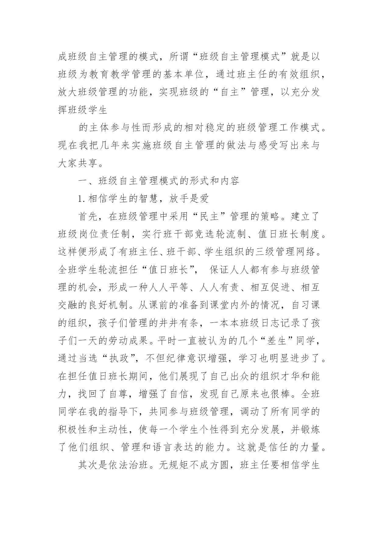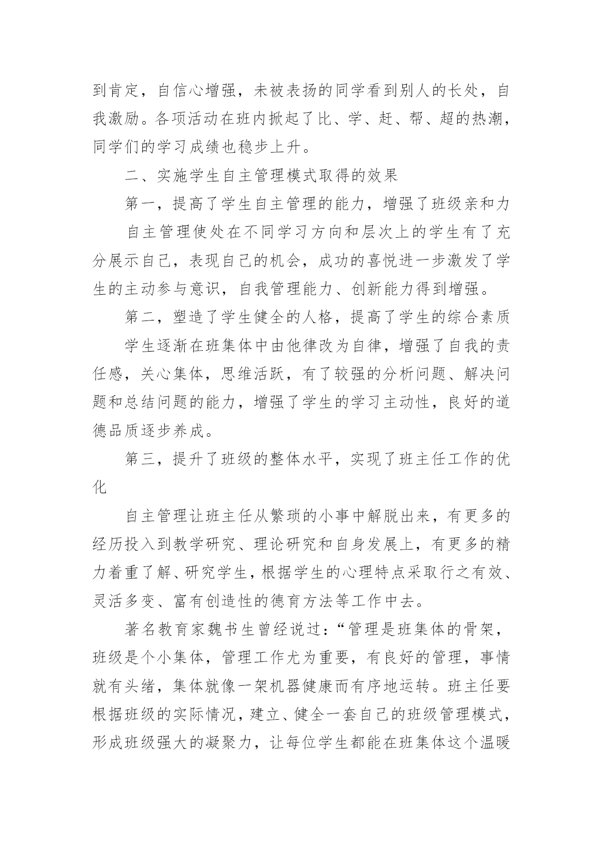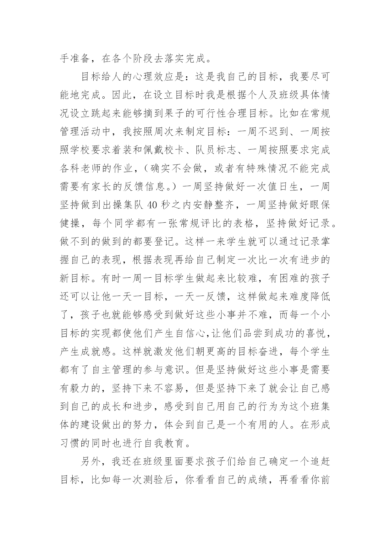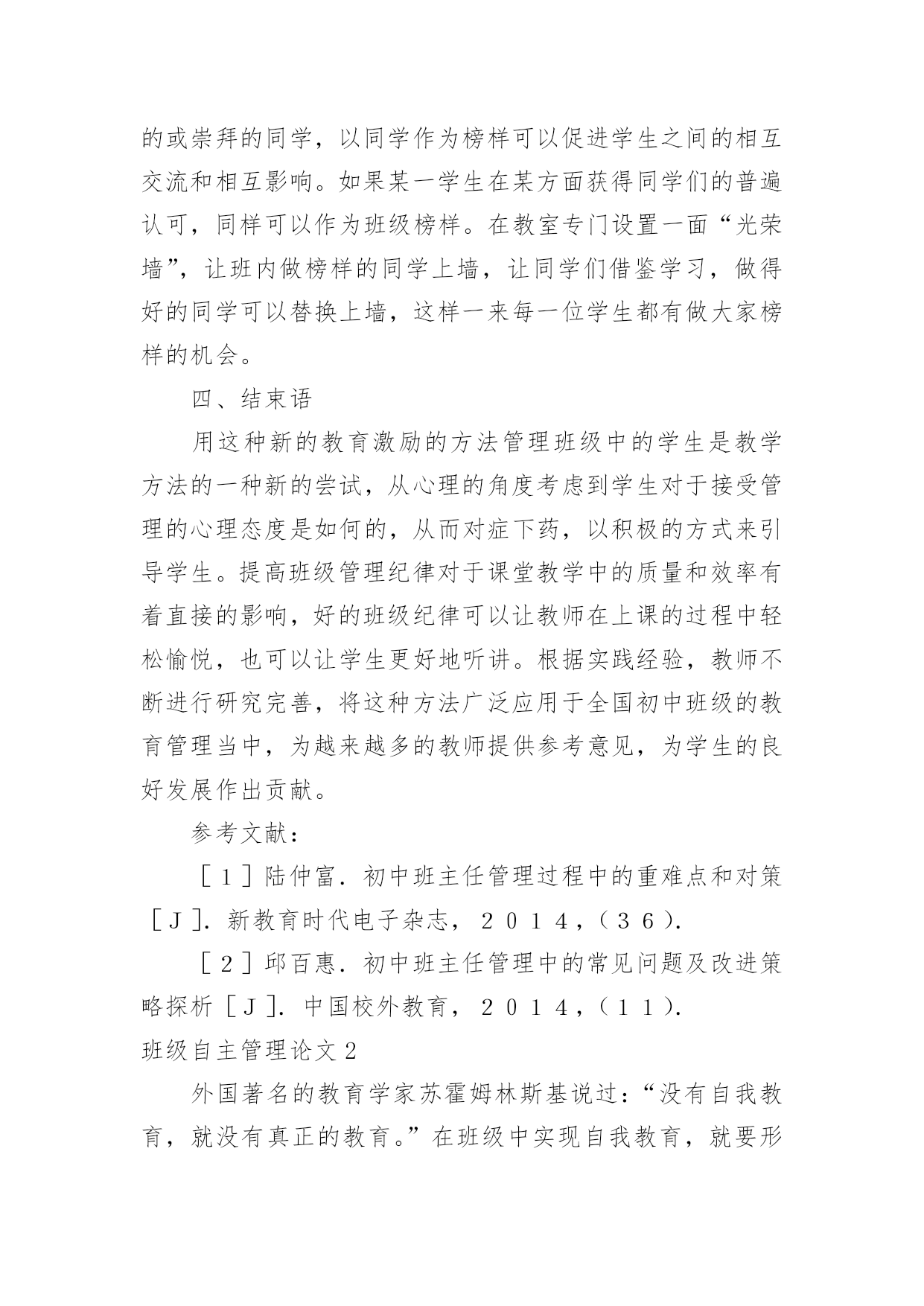 班级自主管理论文班级自主管理论文在平平淡淡的日常中,许多人都写过论文吧,借助论文可以有效提高我们的写作水平。那么你知道一篇好的论文该怎么写吗?下面是小编收集整理的班级自主管理论文,仅供参考,希望能够帮助到大家。班级自主管理论文1摘要:在初中班级的管理当中,越来越需要教师注重方式方法。初中阶段的学生正在处于青春期,叛逆心理较强,不愿意被束缚,而且对于新鲜事物也有很强的好奇心。所以教师的管理方法变得尤为重要,否则对于学生只会起到反作用,让学生越来越讨厌学校、厌倦学习。将教育激励理论应用在班里的管理当中,有利于培养学生对于学校班级的喜爱度。不再以批评教育的方式来教导学生,而是更多的以鼓励、表扬的方式,不再单一的以成绩好坏为标准来评判学生,使其逐渐抵消抗拒心理,教师慢慢引导学生走向正确的学习乃至人生方向。关键词:班级管理;初中生叛逆期;激励教育激励理论最先并非是应用在教育体系当中,但随着时代的变迁,越来越多的教师经过研究,得出了如今的教育激励理论。将教育激励理论有利于调动学生的主动性和积极性,以科学的方法进行班级管理,营造一个班级秩序好、积极向上的环境。国外相关于教育激励方面的理论研究早在近一百年前就开始了研究,我国在十年前才开始借鉴国外的相关经验进行研究,但是只有在近些年来此理论才逐渐地应用于班级管理教学中,许多教师对于这一方法还不是很熟悉,应用方法等方面也不是很完善。一、以鼓励的方式教育学生根据以往的调查研究,学生在受到信任的人鼓励过后会增强自信心,对于学习的兴趣也会成倍的增加,并且在今后更容易接受教导。在学生表现好的时候,教师对学生进行鼓励,有助于学生的心理发育,使学生内心感到教师对其的信任与认可,而学生需要的正是这种教师的认可,让他们感到自己的努力得到了回报,对于班集体更加放在心上。而班集体正是由一个一个的学生组成,只有每一个学生的态度都是积极向上的,那么班级管理亦不需要教师的过多操心。但是鼓励是有一定限度的,或许一张小小的奖状、一句全班同学面前的表扬、一个赞许的眼神、一个安慰鼓励的动作,都会无意之间在学生的内心中生根发芽,让学生摆脱自卑心理,相信自己的能力。然而,这样的鼓励不适宜太多,当表扬变为习惯的时候,一些自控能力较差的学生就开始停滞不前、沾沾自喜,认为自己已经足够好,不需要再有什么进步,从而导致学生没有办法认清自己的真实情况而过于自大。学生在犯错误时教师还是应该进行批评教育,让学生认识到问题的严重性,及时地改正错误。二、提供竞争压力,刺激学生积极向上在如今的社会中到处都是竞争,竞争压力无处不在,在班级中也同样存在竞争。教师往往会利用这种竞争,再根据学生争强好胜的心理,激励学生不断进步,往往在竞争的情况下可以挖掘出学生内心存在的潜能。最多的竞争是在学习方面的竞争,但为了学生的全面发展,教师可以在各方面都设立一个目标让学生完成,根据完成目标的好坏程度再评判学生是否可以得到印章。例如,教师可以设置如下的环节:各个科目学习好的同学可以获得印章,不同的劳动可以获得印章,体育课中的锻炼可以获得印章,参加各种比赛活动等,在多个方面获得过印章,再根据获得印章的数量评选“学期王”。此外还可以评选单个方面表现优异的学生,分别进行相应的奖励。这种良性的竞争可以激发学生的兴趣和积极性,促进学生在校的全面发展,但教师所确定的目标应该适合于大部分的学生,不适合过于简单或者困难,否则这样就缺失了竞争所要取得的效果,只有经过努力才能有回报。三、树立榜样的标准,激励学生向其看齐现在看到许多学生在初中时期变得不爱学习等等,都是因为在学校不听教师的管理,回家之后父母有关方面的教育缺失,再加上青春期的叛逆,导致学生在离正确的道路上越走越远。而教师为学生树立一个可以让学生触动内心的榜样,可以使学生在某些方面产生共鸣,从而对于榜样产生渴望,希望也可以像榜样一样优秀。以往优秀的人物有很多,但学生在没有亲眼看到的情况下很难产生共鸣,因此教师可以在班级内树立榜样学生。例如,在班级内推选学生们心中喜爱的或崇拜的同学,以同学作为榜样可以促进学生之间的相互交流和相互影响。如果某一学生在某方面获得同学们的普遍认可,同样可以作为班级榜样。在教室专门设置一面“光荣墙”,让班内做榜样的同学上墙,让同学们借鉴学习,做得好的同学可以替换上墙,这样一来每一位学生都有做大家榜样的机会。四、结束语用这种新的教育激励的方法管理班级中的学生是教学方法的一种新的尝试,从心理的角度考虑到学生对于接受管理的心理态度是如何的,从而对症下药,以积极的方式来引导学生。提高班级管理纪律对于课堂教学中的质量和效率有着直接的影响,好的班级纪律可以让教师在上课的过程中轻松愉悦,也可以让学生更好地听讲。根据实践经验,教师不断进行研究完善,将这种方法广泛应用于全国初中班级的教育管理当中,为越来越多的教师提供参考意见