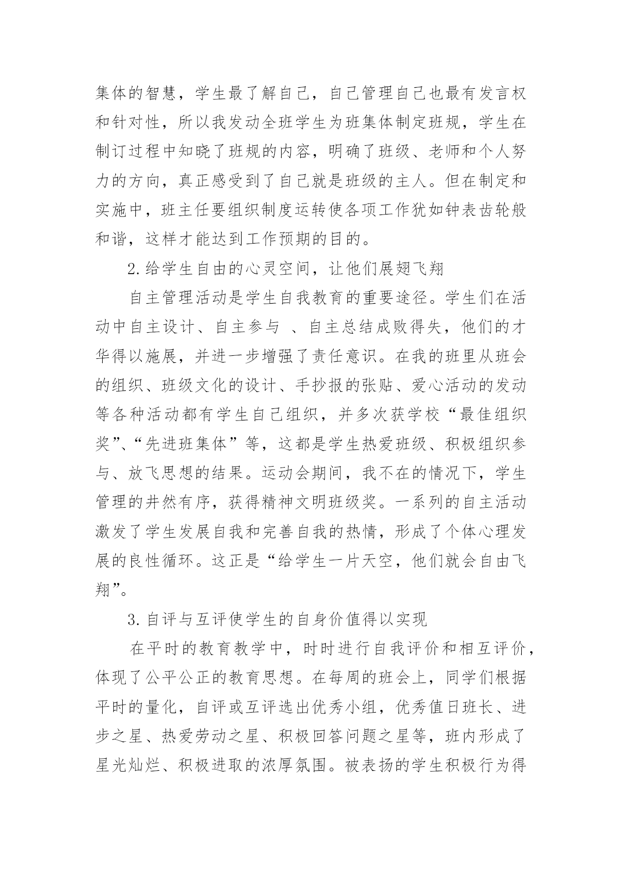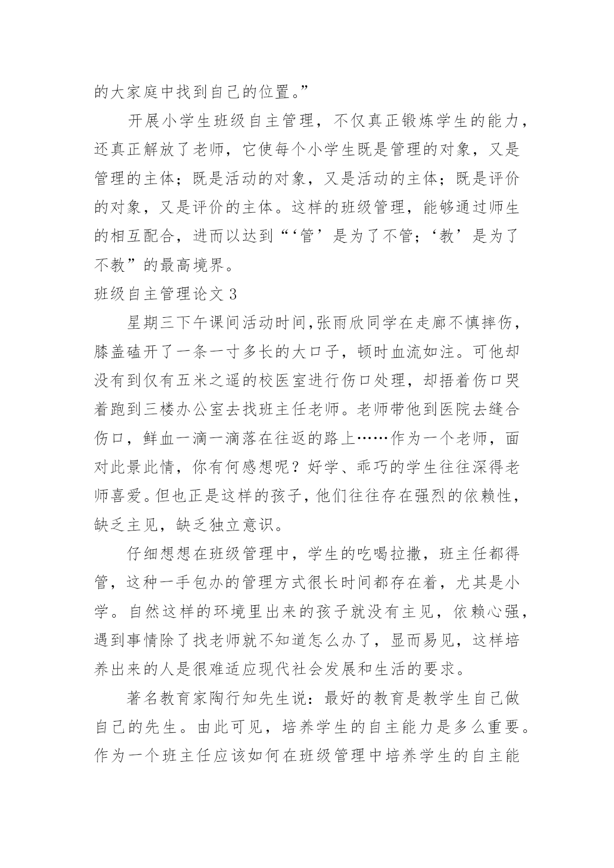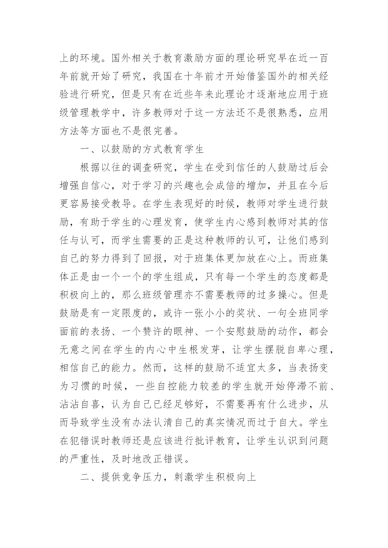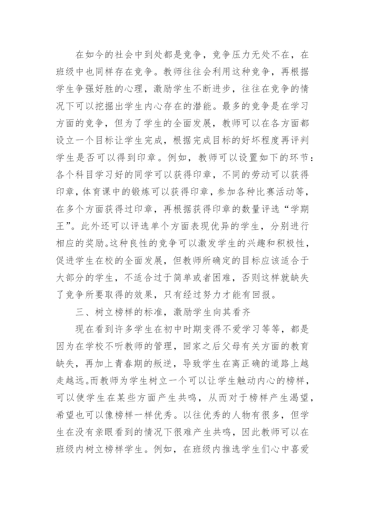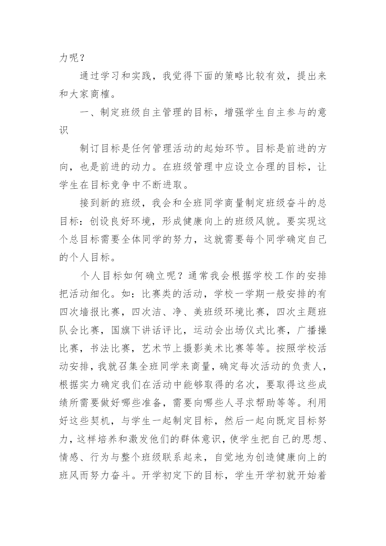 班级自主管理论文班级自主管理论文在平平淡淡的日常中,许多人都写过论文吧,借助论文可以有效提高我们的写作水平。那么你知道一篇好的论文该怎么写吗?下面是小编收集整理的班级自主管理论文,仅供参考,希望能够帮助到大家。班级自主管理论文1摘要:在初中班级的管理当中,越来越需要教师注重方式方法。初中阶段的学生正在处于青春期,叛逆心理较强,不愿意被束缚,而且对于新鲜事物也有很强的好奇心。所以教师的管理方法变得尤为重要,否则对于学生只会起到反作用,让学生越来越讨厌学校、厌倦学习。将教育激励理论应用在班里的管理当中,有利于培养学生对于学校班级的喜爱度。不再以批评教育的方式来教导学生,而是更多的以鼓励、表扬的方式,不再单一的以成绩好坏为标准来评判学生,使其逐渐抵消抗拒心理,教师慢慢引导学生走向正确的学习乃至人生方向。关键词:班级管理;初中生叛逆期;激励教育激励理论最先并非是应用在教育体系当中,但随着时代的变迁,越来越多的教师经过研究,得出了如今的教育激励理论。将教育激励理论有利于调动学生的主动性和积极性,以科学的方法进行班级管理,营造一个班级秩序好、积极向上的环境。国外相关于教育激励方面的理论研究早在近一百年前就开始了研究,我国在十年前才开始借鉴国外的相关经验进行研究,但是只有在近些年来此理论才逐渐地应用于班级管理教学中,许多教师对于这一方法还不是很熟悉,应用方法等方面也不是很完善。一、以鼓励的方式教育学生根据以往的调查研究,学生在受到信任的人鼓励过后会增强自信心,对于学习的兴趣也会成倍的增加,并且在今后更容易接受教导。在学生表现好的时候,教师对学生进行鼓励,有助于学生的心理发育,使学生内心感到教师对其的信任与认可,而学生需要的正是这种教师的认可,让他们感到自己的努力得到了回报,对于班集体更加放在心上。而班集体正是由一个一个的学生组成,只有每一个学生的态度都是积极向上的,那么班级管理亦不需要教师的过多操心。但是鼓励是有一定限度的,或许一张小小的奖状、一句全班同学面前的表扬、一个赞许的眼神、一个安慰鼓励的动作,都会无意之间在学生的内心中生根发芽,让学生摆脱自卑心理,相信自己的能力。然而,这样的鼓励不适宜太多,当表扬变为习惯的时候,一些自控能力较差的学生就开始停滞不前、沾沾自喜,认为自己已经足够好,不需要再有什么进步,从而导致学生没有办法认清自己的真实情况而过于自大。学生在犯错误时教师还是应该进行批评教育,让学生认识到问题的严重性,及时地改正错误。二、提供竞争压力,刺激学生积极向上在如今的社会中到处都是竞争,竞争压力无处不在,在班级中也同样存在竞争。教师往往会利用这种竞争,再根据学生争强好胜的心理,激励学生不断进步,往往在竞争的情况下可以挖掘出学生内心存在的潜能。最多的竞争是在学习方面的竞争,但为了学生的全面发展,教师可以在各方面都设立一个目标让学生完成,根据完成目标的好坏程度再评判学生是否可以得到印章。例如,教师可以设置如下的环节:各个科目学习好的同学可以获得印章,不同的劳动可以获得印章,体育课中的锻炼可以获得印章,参加各种比赛活动等,在多个方面获得过印章,再根据获得印章的数量评选“学期王”。此外还可以评选单个方面表现优异的学生,分别进行相应的奖励。这种良性的竞争可以激发学生的兴趣和积极性,促进学生在校的全面发展,但教师所确定的目标应该适合于大部分的学生,不适合过于简单或者困难,否则这样就缺失了竞争所要取得的效果,只有经过努力才能有回报。三、树立榜样的标准,激励学生向其看齐现在看到许多学生在初中时期变得不爱学习等等,都是因为在学校不听教师的管理,回家之后父母有关方面的教育缺失,再加上青春期的叛逆,导致学生在离正确的道路上越走越远。而教师为学生树立一个可以让学生触动内心的榜样,可以使学生在某些方面产生共鸣,从而对于榜样产生渴望,希望也可以像榜样一样优秀。以往优秀的人物有很多,但学生在没有亲眼看到的情况下很难产生共鸣,因此教师可以在班级内树立榜样学生。例如,在班级内推选学生们心中喜爱的或崇拜的同学,以同学作为榜样可以促进学生之间的相互交流和相互影响。如果某一学生在某方面获得同学们的普遍认可,同样可以作为班级榜样。在教室专门设置一面“光荣墙”,让班内做榜样的同学上墙,让同学们借鉴学习,做得好的同学可以替换上墙,这样一来每一位学生都有做大家榜样的机会。四、结束语用这种新的教育激励的方法管理班级中的学生是教学方法的一种新的尝试,从心理的角度考虑到学生对于接受管理的心理态度是如何的,从而对症下药,以积极的方式来引导学生。提高班级管理纪律对于课堂教学中的质量和效率有着直接的影响,好的班级纪律可以让教师在上课的过程中轻松愉悦,也可以让学生更好地听讲。根据实践经验,教师不断进行研究完善,将这种方法广泛应用于全国初中班级的教育管理当中,为越来越多的教师提供参考意见
