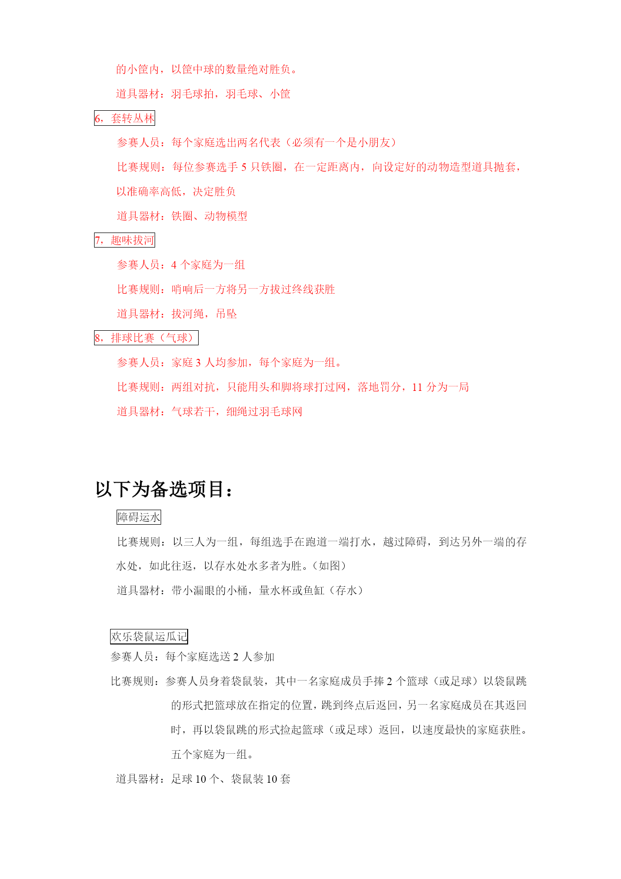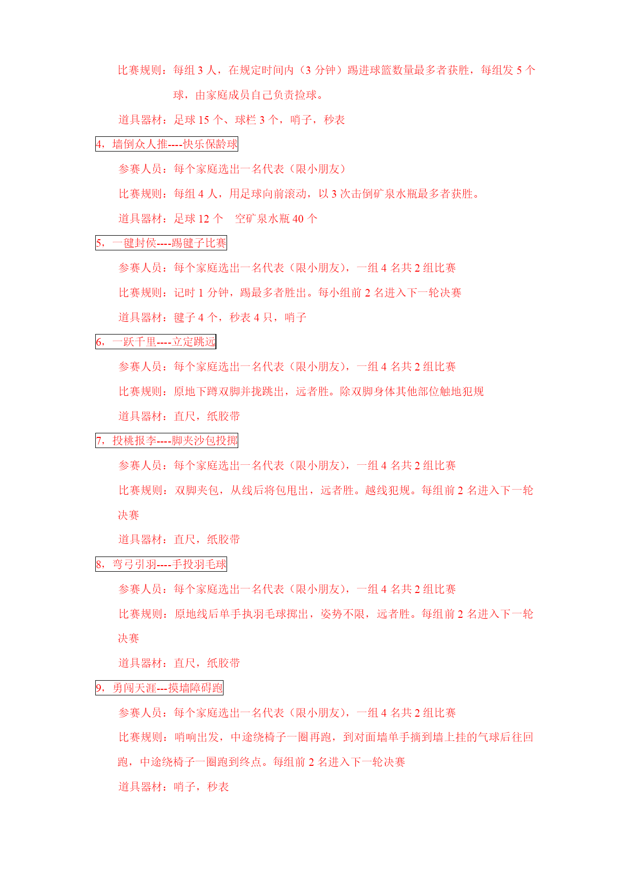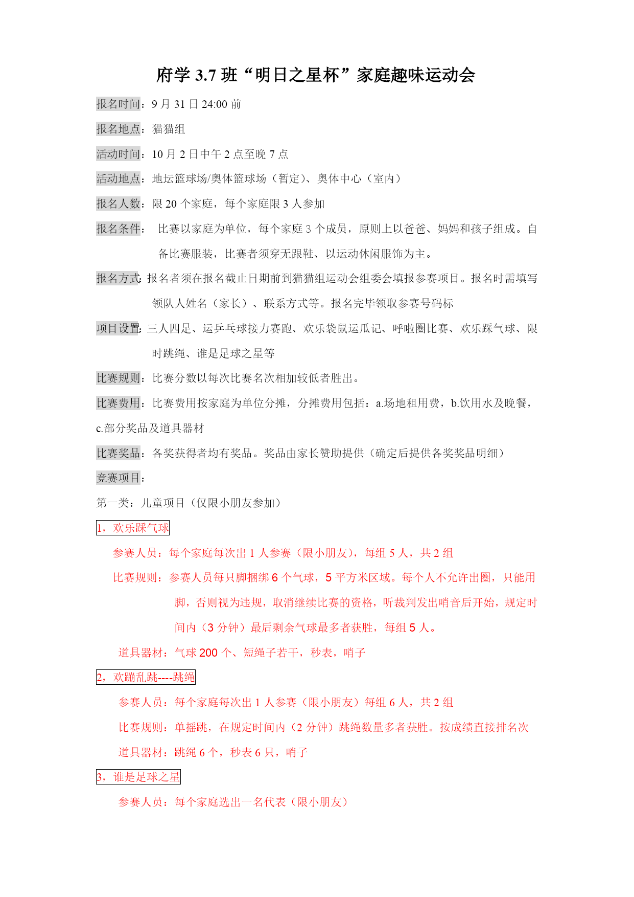府学3.7班“明日之星杯”家庭趣味运动会报名时间:9月31日24:00前报名地点:猫猫组活动时间:10月2日中午2点至晚7点活动地点:地坛篮球场/奥体篮球场(暂定)、奥体中心(室内)报名人数:限20个家庭,每个家庭限3人参加报名条件:比赛以家庭为单位,每个家庭3个成员,原则上以爸爸、妈妈和孩子组成。自备比赛服装,比赛者须穿无跟鞋、以运动休闲服饰为主。报名方式:报名者须在报名截止日期前到猫猫组运动会组委会填报参赛项目。报名时需填写领队人姓名(家长)、联系方式等。报名完毕领取参赛号码标项目设置:三人四足、运乒乓球接力赛跑、欢乐袋鼠运瓜记、呼啦圈比赛、欢乐踩气球、限时跳绳、谁是足球之星等比赛规则:比赛分数以每次比赛名次相加较低者胜出。比赛费用:比赛费用按家庭为单位分摊,分摊费用包括:a.场地租用费,b.饮用水及晚餐,c.部分奖品及道具器材比赛奖品:各奖获得者均有奖品。奖品由家长赞助提供(确定后提供各奖奖品明细)竞赛项目:第一类:儿童项目(仅限小朋友参加)1,欢乐踩气球参赛人员:每个家庭每次出1人参赛(限小朋友),每组5人,共2组比赛规则:参赛人员每只脚捆绑6个气球,5平方米区域。每个人不允许出圈,只能用脚,否则视为违规,取消继续比赛的资格,听裁判发出哨音后开始,规定时间内(3分钟)最后剩余气球最多者获胜,每组5人。道具器材:气球200个、短绳子若干,秒表,哨子2,欢蹦乱跳----跳绳参赛人员:每个家庭每次出1人参赛(限小朋友)每组6人,共2组比赛规则:单摇跳,在规定时间内(2分钟)跳绳数量多者获胜。按成绩直接排名次道具器材:跳绳6个,秒表6只,哨子3,谁是足球之星参赛人员:每个家庭选出一名代表(限小朋友)比赛规则:每组3人,在规定时间内(3分钟)踢进球篮数量最多者获胜,每组发5个球,由家庭成员自己负责捡球。道具器材:足球15个、球栏3个,哨子,秒表4,墙倒众人推----快乐保龄球参赛人员:每个家庭选出一名代表(限小朋友)比赛规则:每组4人,用足球向前滚动,以3次击倒矿泉水瓶最多者获胜。道具器材:足球12个空矿泉水瓶40个5,一毽封侯----踢毽子比赛参赛人员:每个家庭选出一名代表(限小朋友),一组4名共2组比赛比赛规则:记时1分钟,踢最多者胜出。每小组前2名进入下一轮决赛道具器材:毽子4个,秒表4只,哨子6,一跃千里----立定跳远参赛人员:每个家庭选出一名代表(限小朋友),一组4名共2组比赛比赛规则:原地下蹲双脚并拢跳出,远者胜。除双脚身体其他部位触地犯规道具器材:直尺,纸胶带7,投桃报李----脚夹沙包投掷参赛人员:每个家庭选出一名代表(限小朋友),一组4名共2组比赛比赛规则:双脚夹包,从线后将包甩出,远者胜。越线犯规。每组前2名进入下一轮决赛道具器材:直尺,纸胶带8,弯弓引羽----手投羽毛球参赛人员:每个家庭选出一名代表(限小朋友),一组4名共2组比赛比赛规则:原地线后单手执羽毛球掷出,姿势不限,远者胜。每组前2名进入下一轮决赛道具器材:直尺,纸胶带9,勇闯天涯---摸墙障碍跑参赛人员:每个家庭选出一名代表(限小朋友),一组4名共2组比赛比赛规则:哨响出发,中途绕椅子一圈再跑,到对面墙单手摘到墙上挂的气球后往回跑,中途绕椅子一圈跑到终点。每组前2名进入下一轮决赛道具器材:哨子,秒表第二类:亲子游戏1,三人四足参赛人数:每个家庭3人比赛规则:四个家庭为一组,每个家庭3人并排站立,相临两脚用绳子系住,利用三人四足的方法进行比赛。听口令后,各个家庭向比赛终点处跑进。以那个家庭用时多少排列名次,少者列前。中途绑带松开,必须在原地绑好,违者不计成绩。道具器材:短绳子若干2,运乒乓球接力赛跑参赛人数:每个家庭3人比赛规则:参赛人员手持乒乓球拍,上放乒乓球1枚,然后运球走,传至下一位,依次类推,运球至终点,按所用时间确定名次,如果中途气球掉下,必须原地捡起继续比赛,每组参赛者限捡球1次,2次及2次以上者不计成绩。四个家庭为一组。道具器材:乒乓球拍4付、乒乓球10个3,呼啦圈比赛参赛人员:家庭所有成员参与比赛规则:参赛家庭一块进行,在规定时间内(3分钟)三人合计数量为准,数量多者获胜,每组两个家庭共同进行。道具器材:呼啦圈6个4,齐心协力参赛人员:每个家庭选出两名代表(必须有一个是小朋友)比赛规则:两人一组参加比赛,参赛选手背靠背顶住篮球进行赛跑,最先到达重点的参赛组为胜。道具器材:篮球若干5,亲情大投射参赛人员:每个家庭选出两名代表(必须有一个是小朋友)比赛规则:一个大人一个儿童为一组进行比赛,儿童利用羽毛球拍将羽毛球击入大人手的小筐内,以筐中球的数量绝对胜负。道具器材:羽毛球拍,羽毛球