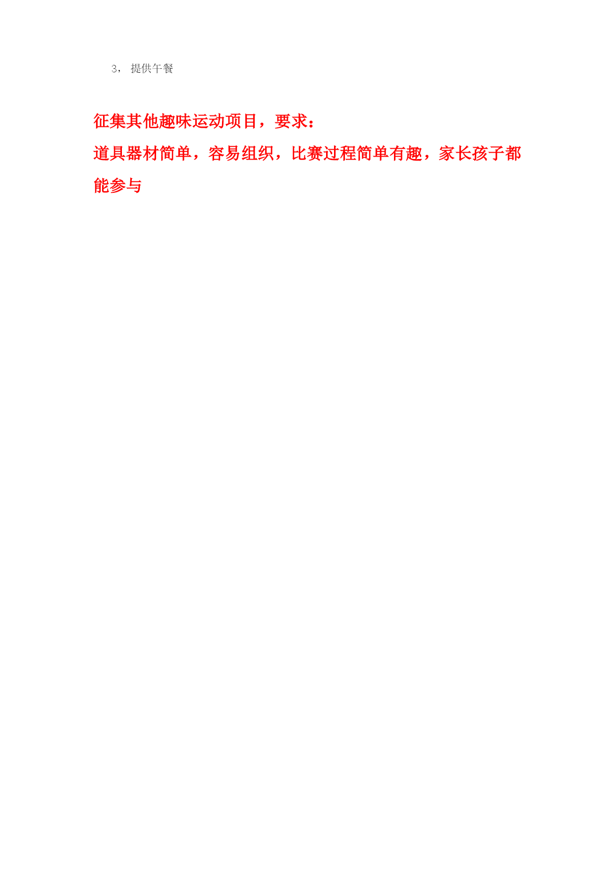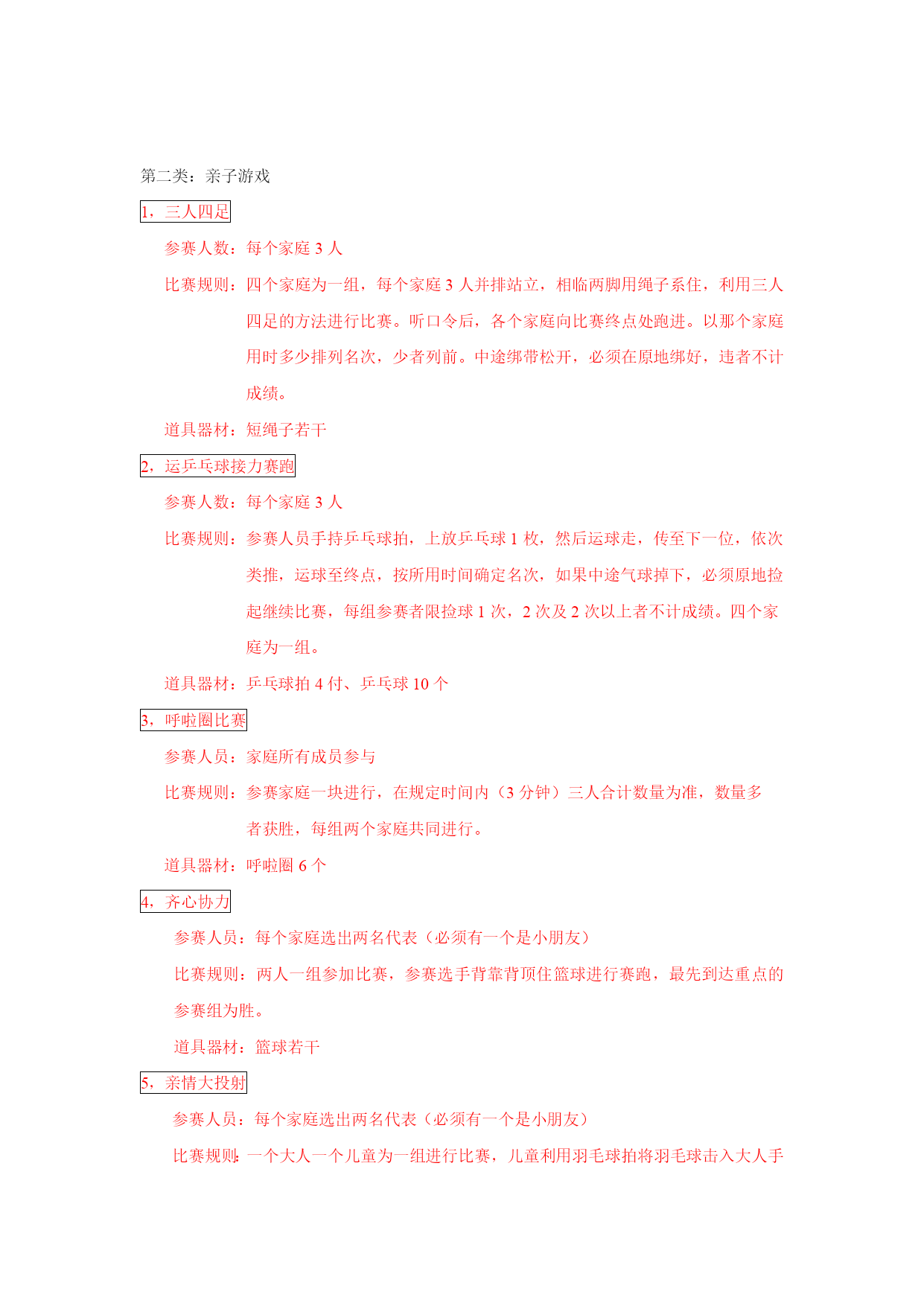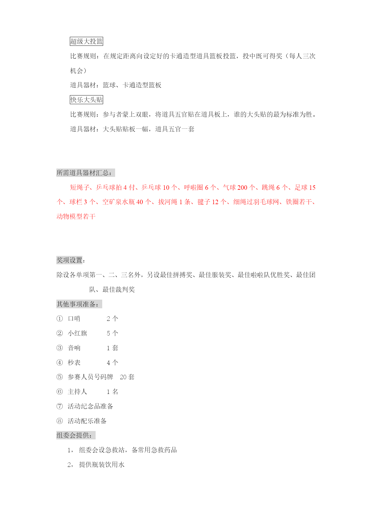 府学3.7班“明日之星杯”家庭趣味运动会报名时间:9月31日24:00前报名地点:猫猫组活动时间:10月2日中午2点至晚7点活动地点:地坛篮球场/奥体篮球场(暂定)、奥体中心(室内)报名人数:限20个家庭,每个家庭限3人参加报名条件:比赛以家庭为单位,每个家庭3个成员,原则上以爸爸、妈妈和孩子组成。自备比赛服装,比赛者须穿无跟鞋、以运动休闲服饰为主。报名方式:报名者须在报名截止日期前到猫猫组运动会组委会填报参赛项目。报名时需填写领队人姓名(家长)、联系方式等。报名完毕领取参赛号码标项目设置:三人四足、运乒乓球接力赛跑、欢乐袋鼠运瓜记、呼啦圈比赛、欢乐踩气球、限时跳绳、谁是足球之星等比赛规则:比赛分数以每次比赛名次相加较低者胜出。比赛费用:比赛费用按家庭为单位分摊,分摊费用包括:a.场地租用费,b.饮用水及晚餐,c.部分奖品及道具器材比赛奖品:各奖获得者均有奖品。奖品由家长赞助提供(确定后提供各奖奖品明细)竞赛项目:第一类:儿童项目(仅限小朋友参加)1,欢乐踩气球参赛人员:每个家庭每次出1人参赛(限小朋友),每组5人,共2组比赛规则:参赛人员每只脚捆绑6个气球,5平方米区域。每个人不允许出圈,只能用脚,否则视为违规,取消继续比赛的资格,听裁判发出哨音后开始,规定时间内(3分钟)最后剩余气球最多者获胜,每组5人。道具器材:气球200个、短绳子若干,秒表,哨子2,欢蹦乱跳----跳绳参赛人员:每个家庭每次出1人参赛(限小朋友)每组6人,共2组比赛规则:单摇跳,在规定时间内(2分钟)跳绳数量多者获胜。按成绩直接排名次道具器材:跳绳6个,秒表6只,哨子3,谁是足球之星参赛人员:每个家庭选出一名代表(限小朋友)比赛规则:每组3人,在规定时间内(3分钟)踢进球篮数量最多者获胜,每组发5个球,由家庭成员自己负责捡球。道具器材:足球15个、球栏3个,哨子,秒表4,墙倒众人推----快乐保龄球参赛人员:每个家庭选出一名代表(限小朋友)比赛规则:每组4人,用足球向前滚动,以3次击倒矿泉水瓶最多者获胜。道具器材:足球12个空矿泉水瓶40个5,一毽封侯----踢毽子比赛参赛人员:每个家庭选出一名代表(限小朋友),一组4名共2组比赛比赛规则:记时1分钟,踢最多者胜出。每小组前2名进入下一轮决赛道具器材:毽子4个,秒表4只,哨子6,一跃千里----立定跳远参赛人员:每个家庭选出一名代表(限小朋友),一组4名共2组比赛比赛规则:原地下蹲双脚并拢跳出,远者胜。除双脚身体其他部位触地犯规道具器材:直尺,纸胶带7,投桃报李----脚夹沙包投掷参赛人员:每个家庭选出一名代表(限小朋友),一组4名共2组比赛比赛规则:双脚夹包,从线后将包甩出,远者胜。越线犯规。每组前2名进入下一轮决赛道具器材:直尺,纸胶带8,弯弓引羽----手投羽毛球参赛人员:每个家庭选出一名代表(限小朋友),一组4名共2组比赛比赛规则:原地线后单手执羽毛球掷出,姿势不限,远者胜。每组前2名进入下一轮决赛道具器材:直尺,纸胶带9,勇闯天涯---摸墙障碍跑参赛人员:每个家庭选出一名代表(限小朋友),一组4名共2组比赛比赛规则:哨响出发,中途绕椅子一圈再跑,到对面墙单手摘到墙上挂的气球后往回跑,中途绕椅子一圈跑到终点。每组前2名进入下一轮决赛道具器材:哨子,秒表第二类:亲子游戏1,三人四足参赛人数:每个家庭3人比赛规则:四个家庭为一组,每个家庭3人并排站立,相临两脚用绳子系住,利用三人四足的方法进行比赛。听口令后,各个家庭向比赛终点处跑进。以那个家庭用时多少排列名次,少者列前。中途绑带松开,必须在原地绑好,违者不计成绩。道具器材:短绳子若干2,运乒乓球接力赛跑参赛人数:每个家庭3人比赛规则:参赛人员手持乒乓球拍,上放乒乓球1枚,然后运球走,传至下一位,依次类推,运球至终点,按所用时间确定名次,如果中途气球掉下,必须原地捡起继续比赛,每组参赛者限捡球1次,2次及2次以上者不计成绩。四个家庭为一组。道具器材:乒乓球拍4付、乒乓球10个3,呼啦圈比赛参赛人员:家庭所有成员参与比赛规则:参赛家庭一块进行,在规定时间内(3分钟)三人合计数量为准,数量多者获胜,每组两个家庭共同进行。道具器材:呼啦圈6个4,齐心协力参赛人员:每个家庭选出两名代表(必须有一个是小朋友)比赛规则:两人一组参加比赛,参赛选手背靠背顶住篮球进行赛跑,最先到达重点的参赛组为胜。道具器材:篮球若干5,亲情大投射参赛人员:每个家庭选出两名代表(必须有一个是小朋友)比赛规则:一个大人一个儿童为一组进行比赛,儿童利用羽毛球拍将羽毛球击入大人手的小筐内,以筐中球的数量绝对胜负。道具器材:羽毛球拍,羽毛球