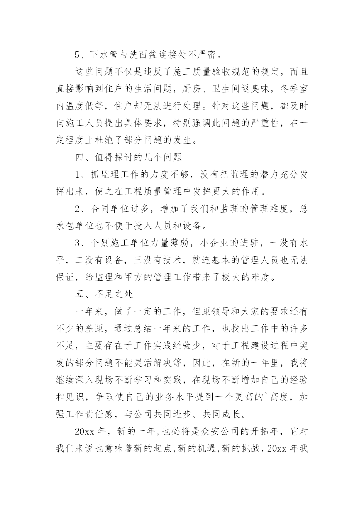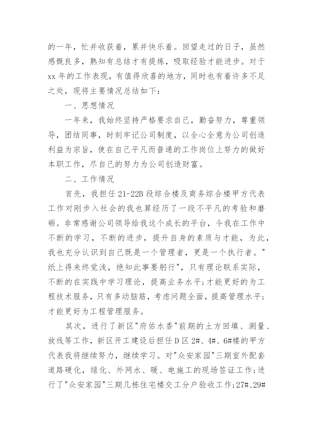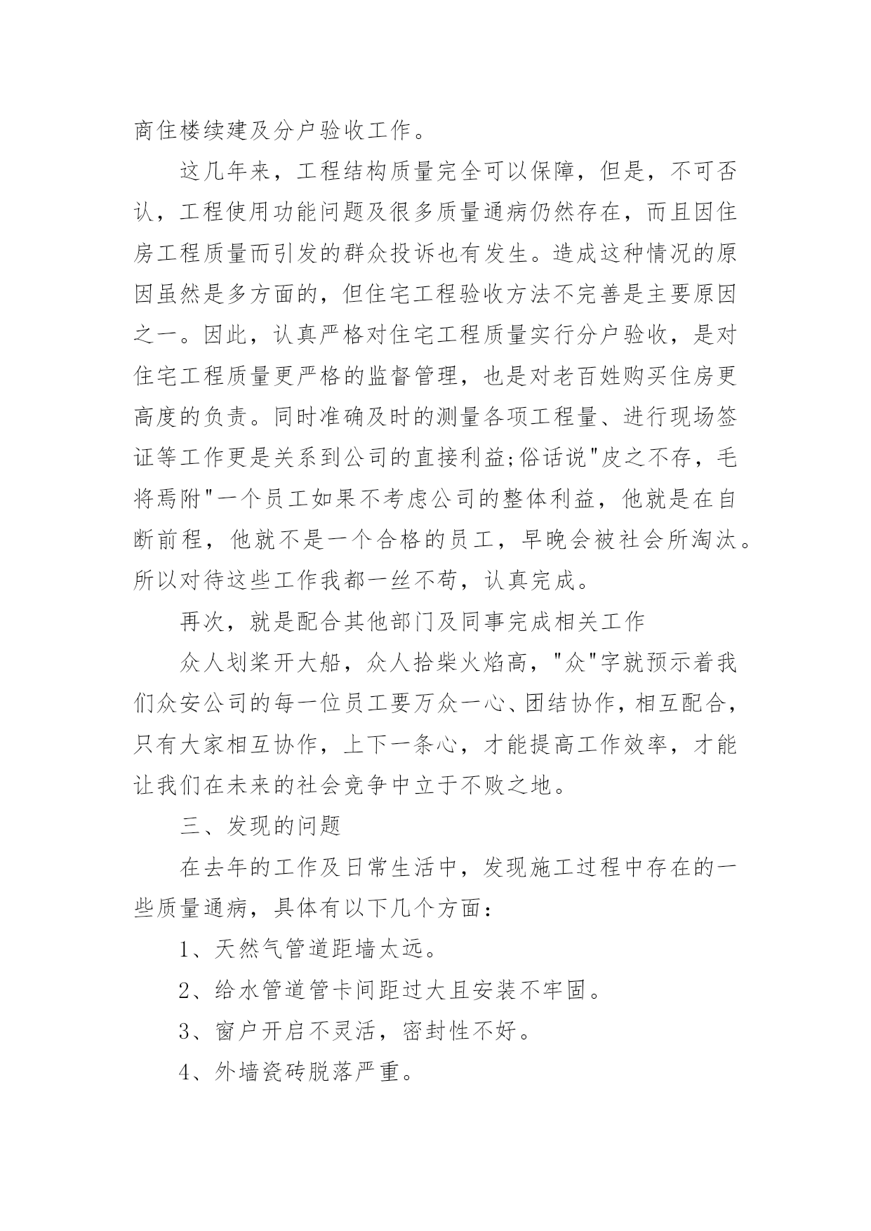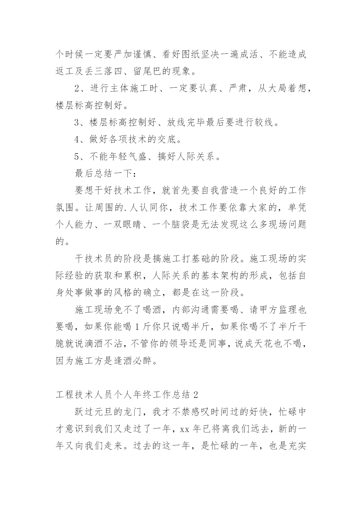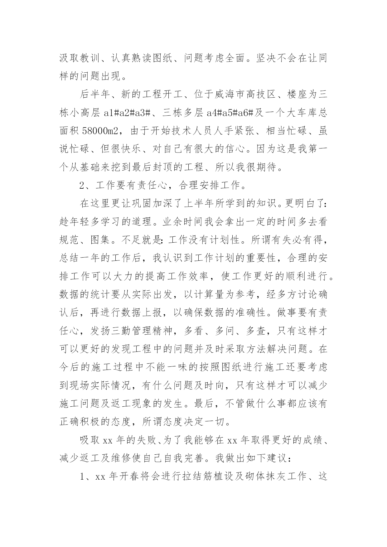 工程技术人员个人年终工作总结总结是事后对某一阶段的学习、工作或其完成情况加以回顾和分析的一种书面材料,它可以使我们更有效率,不妨让我们认真地完成总结吧。总结怎么写才不会千篇一律呢?下面是小编为大家整理的工程技术人员个人年终工作总结,欢迎阅读与收藏。工程技术人员个人年终工作总结1转眼间,辞旧迎新、平凡而又不太忙碌的一年已到尽头,不知不觉时间过的真快,悄然无息、xx年的日历即将翻过去。伴随着时代前进的步伐、回首自己一年来经历的风雨路程、对自己工作中的不足、我做出如下工作总结:1、务实工作、自我加压、认真工作、有得有失。xx前半年、值得一庆,(威海文平和谐家园高层c5#楼)自己着手参加的第一个住宅工程已经竣工,我们主抓质量、进度使规定期间内竣工。同时也让我学会了一些施工工序、包括图纸的一些细部构造、及公司规定的一些细部做法、及技术资料的整理等。包括为人处事都有很大的改进,也为自己积累了一定的经验。主体施工完毕后、主要参与砌体的放线、拉结筋的植设、及最后砌体的验收等。后期主要和甲方人员及监理人员做分户验收、及室外污水管道的标高抄测。泛泛的工作岗位维护的是一团氛围。作为一名新手、同样也出现了很多的错误、(楼层外飘窗的砌筑)造成返工、但我会汲取教训、认真熟读图纸、问题考虑全面。坚决不会在让同样的问题出现。后半年、新的工程开工、位于威海市高技区、楼座为三栋小高层a1#a2#a3#、三栋多层a4#a5#a6#及一个大车库总面积58000m2,由于开始技术人员人手紧张、相当忙碌、虽说忙碌、但很快乐、对自己有很大的信心。因为这是我第一个从基础来挖到最后封顶的工程、所以我很期待。2、工作要有责任心,合理安排工作。在这里更让巩固加深了上半年所学到的知识。更明白了:趁年轻多学习的道理。业余时间我会拿出一定的时间多去看规范、图集。不足就是:工作没有计划性。所谓有失必有得,总结一年的工作后,我认识到工作计划的重要性,合理的安排工作可以大力的提高工作效率,使工作更好的顺利进行。数据的统计要从实际出发,以计算量为参考,经多方讨论确认后,再进行数据上报,以确保数据的准确性。做事要有责任心,发扬三勤管理精神,多看、多问、多查,只有这样才可以更好的发现工程中的问题并及时采取方法解决问题。在今后的施工过程中不能一味的按照图纸进行施工还要考虑到现场实际情况,有什么问题及时向,只有这样才可以减少施工问题及返工现象的发生。最后,不管做什么事都应该有正确积极的态度,所谓态度决定一切。吸取xx年的失败、为了我能够在xx年取得更好的成绩、减少返工及维修使自己自我完善。我做出如下建议:1、xx年开春将会进行拉结筋植设及砌体抹灰工作、这个时候一定要严加谨慎、看好图纸坚决一遍成活、不能造成返工及丢三落四、留尾巴的现象。2、进行主体施工时、一定要认真、严肃,从大局着想,楼层标高控制好。3、楼层标高控制好、放线完毕最后要进行较线。4、做好各项技术的交底。5、不能年轻气盛、搞好人际关系。最后总结一下:要想干好技术工作,就首先要自我营造一个良好的工作氛围。让周围的.人认同你,技术工作要依靠大家的,单凭个人能力、一双眼睛、一个脑袋是无法发现这么多现场问题的。干技术员的阶段是搞施工打基础的阶段。施工现场的实际经验的获取和累积,人际关系的基本架构的形成,包括自身处事做事的风格的确立,都是在这一阶段。施工现场免不了喝酒,内部沟通需要喝、请甲方监理也要喝,如果你能喝1斤你只说喝半斤,如果你喝不了半斤干脆就说滴酒不沾,不管你的领导还是同事,说成天花也不喝,因为施工方是逢酒必醉。工程技术人员个人年终工作总结2跃过元旦的龙门,我才不禁感叹时间过的好快,忙碌中才意识到我们又走过了一年,xx年已将离我们远去,新的一年又向我们走来。过去的这一年,是忙碌的一年,也是充实的一年,忙并收获着,累并快乐着。回望走过的日子,虽然感慨良多,熟知有总结才有提炼,吸取经验才能进步。对于xx年的工作表现,有值得欣喜的地方,同时也有着许多不足之处,现将主要情况总结如下:一、思想情况一年来,我始终坚持严格要求自己,勤奋努力,尊重领导,团结同事,时刻牢记公司制度,以全心全意为公司创造利益为宗旨,使在自己平凡而普通的工作岗位上努力的做好本职工作,尽自己的努力为公司创造财富。二、工作情况首先,我担任21-22B段综合楼及商务综合楼甲方代表工作对刚步入社会的我也算经历了一段不平凡的考验和磨砺。非常感谢公司领导给我这个成长的平台,令我在工作中不断的学习,不断的进步,提升自身的素质与才能,为此,我也充分认识到自己既是一个管理者,更是一个执行者。"纸上得来终觉浅,绝知此事要躬行",只有理论联系实际,不断的在实践中学习理论,提高业务水平;才能更好的为工程技术服务,只有多动脑筋,考虑问题全面,提高管理水平;才能更好为工程管理服务。其次,进行了新区"府