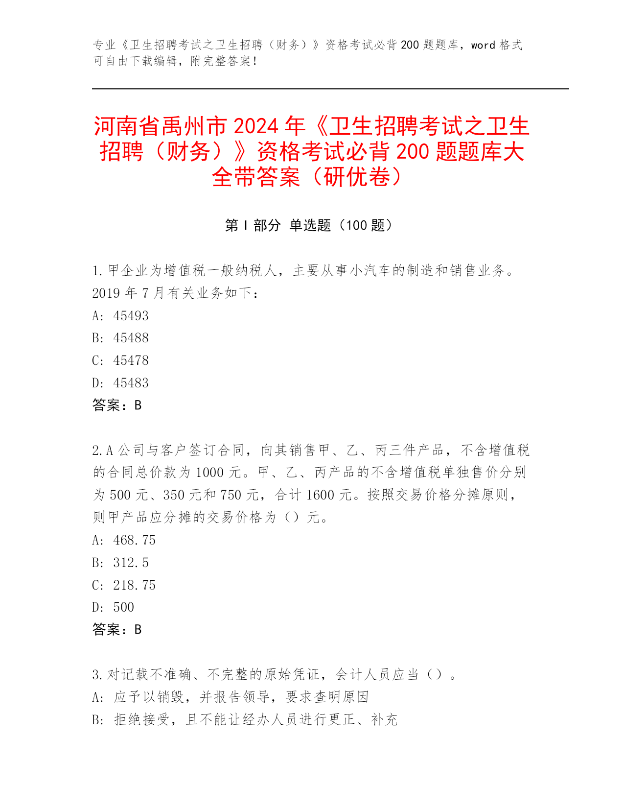 河南省禹州市2024年《卫生招聘考试之卫生招聘(财务)》资格考试必背200题题库大全带答案(研优卷)