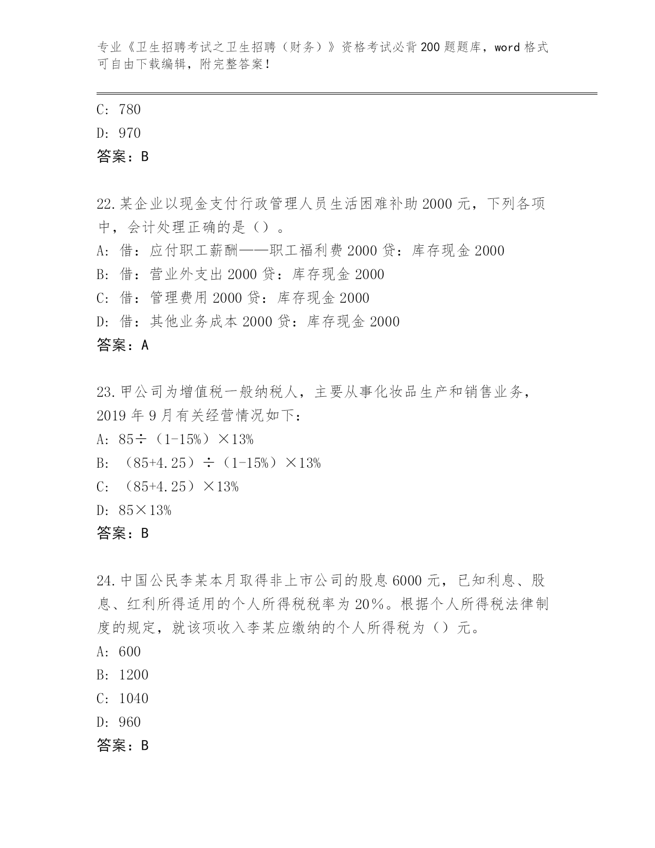 河南省禹州市2024年《卫生招聘考试之卫生招聘(财务)》资格考试必背200题题库带答案