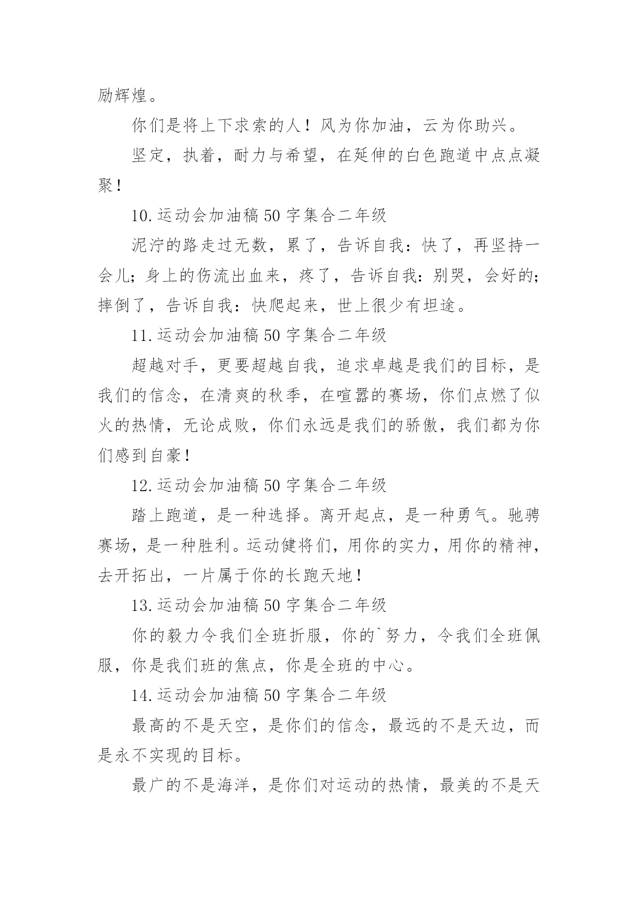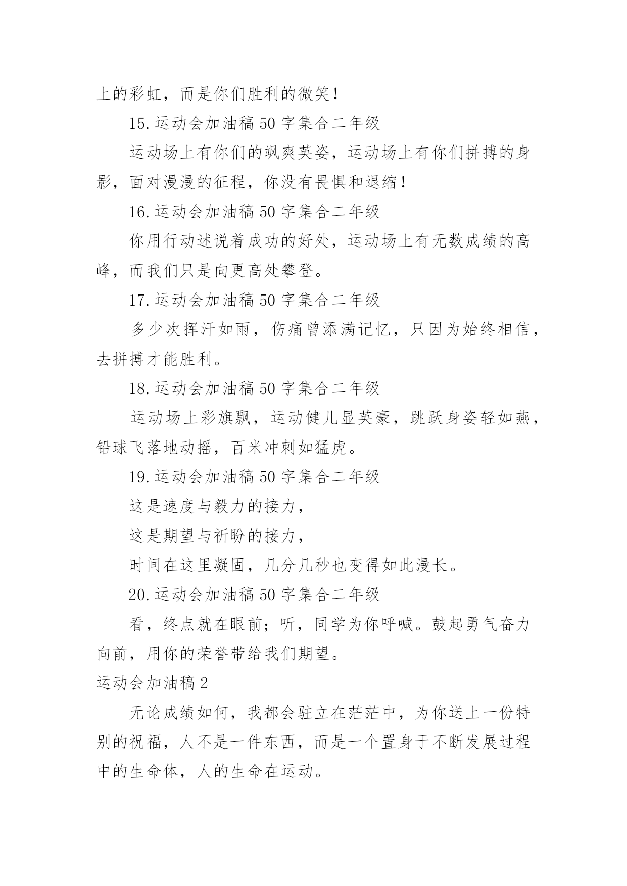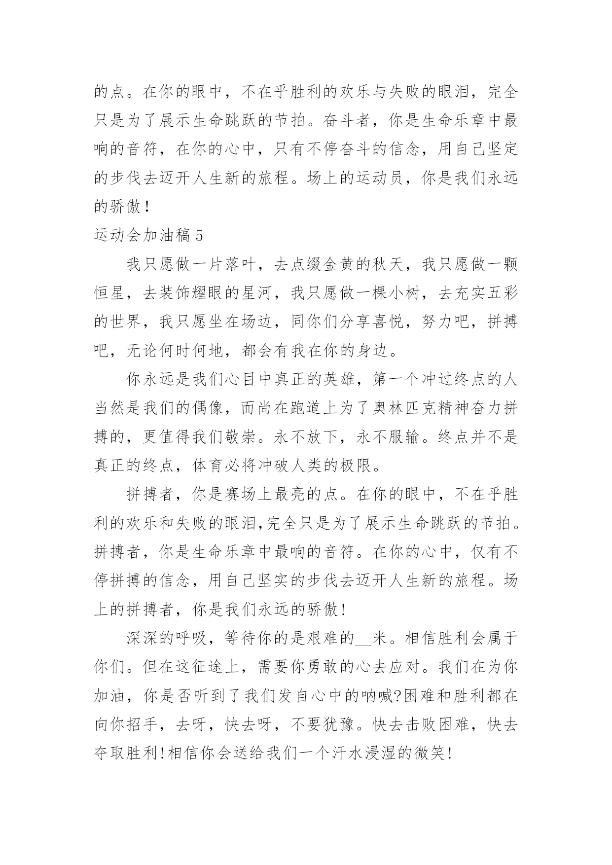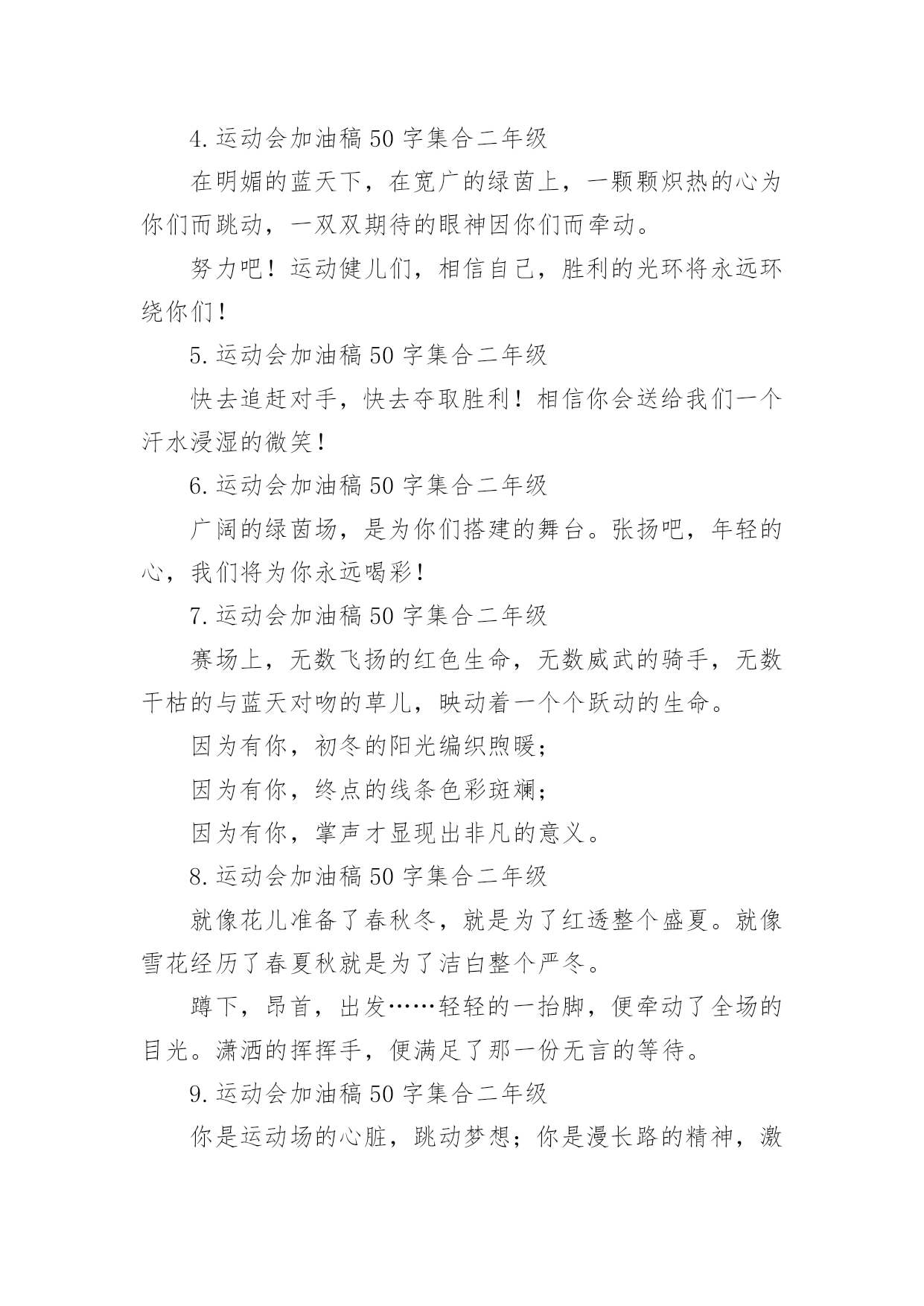 运动会加油稿运动会加油稿在当今社会生活中,需要使用加油稿的场合越来越多,加油稿是一种对他人有正向激励作用的文稿。怎样写加油稿才能更好地发挥其做用呢?下面是小编精心整理的运动会加油稿,欢迎大家借鉴与参考,希望对大家有所帮助。运动会加油稿11.运动会加油稿50字集合二年级虽然你们在场上的时间很短暂,但你们的身影依然停留在人们的脑海里,因为你们是赛场上最可爱的人。2.运动会加油稿50字集合二年级晨风轻轻地唤醒骄阳校园的操场传来发令枪的声响彩旗与呐喊声一起在飘荡着心和起点紧紧的相连用青春和热血来铺洒白色的跑道用激情点燃胜利的曙光3.运动会加油稿50字集合二年级环形的跑道一圈又一圈的坚持,毅力与精神活跃在会场上,湿透的衣衫,满头的大汗,无限追求奋力追赶,我们为你欢呼跳跃,我们为你骄傲。4.运动会加油稿50字集合二年级在明媚的蓝天下,在宽广的绿茵上,一颗颗炽热的心为你们而跳动,一双双期待的眼神因你们而牵动。努力吧!运动健儿们,相信自己,胜利的光环将永远环绕你们!5.运动会加油稿50字集合二年级快去追赶对手,快去夺取胜利!相信你会送给我们一个汗水浸湿的微笑!6.运动会加油稿50字集合二年级广阔的绿茵场,是为你们搭建的舞台。张扬吧,年轻的心,我们将为你永远喝彩!7.运动会加油稿50字集合二年级赛场上,无数飞扬的红色生命,无数威武的骑手,无数干枯的与蓝天对吻的草儿,映动着一个个跃动的生命。因为有你,初冬的阳光编织煦暖;因为有你,终点的线条色彩斑斓;因为有你,掌声才显现出非凡的意义。8.运动会加油稿50字集合二年级就像花儿准备了春秋冬,就是为了红透整个盛夏。就像雪花经历了春夏秋就是为了洁白整个严冬。蹲下,昂首,出发……轻轻的一抬脚,便牵动了全场的目光。潇洒的挥挥手,便满足了那一份无言的等待。9.运动会加油稿50字集合二年级你是运动场的心脏,跳动梦想;你是漫长路的精神,激励辉煌。你们是将上下求索的人!风为你加油,云为你助兴。坚定,执着,耐力与希望,在延伸的白色跑道中点点凝聚!10.运动会加油稿50字集合二年级泥泞的路走过无数,累了,告诉自我:快了,再坚持一会儿;身上的伤流出血来,疼了,告诉自我:别哭,会好的;摔倒了,告诉自我:快爬起来,世上很少有坦途。11.运动会加油稿50字集合二年级超越对手,更要超越自我,追求卓越是我们的目标,是我们的信念,在清爽的秋季,在喧嚣的赛场,你们点燃了似火的热情,无论成败,你们永远是我们的骄傲,我们都为你们感到自豪!12.运动会加油稿50字集合二年级踏上跑道,是一种选择。离开起点,是一种勇气。驰骋赛场,是一种胜利。运动健将们,用你的实力,用你的精神,去开拓出,一片属于你的长跑天地!13.运动会加油稿50字集合二年级你的毅力令我们全班折服,你的`努力,令我们全班佩服,你是我们班的焦点,你是全班的中心。14.运动会加油稿50字集合二年级最高的不是天空,是你们的信念,最远的不是天边,而是永不实现的目标。最广的不是海洋,是你们对运动的热情,最美的不是天上的彩虹,而是你们胜利的微笑!15.运动会加油稿50字集合二年级运动场上有你们的飒爽英姿,运动场上有你们拼搏的身影,面对漫漫的征程,你没有畏惧和退缩!16.运动会加油稿50字集合二年级你用行动述说着成功的好处,运动场上有无数成绩的高峰,而我们只是向更高处攀登。17.运动会加油稿50字集合二年级多少次挥汗如雨,伤痛曾添满记忆,只因为始终相信,去拼搏才能胜利。18.运动会加油稿50字集合二年级运动场上彩旗飘,运动健儿显英豪,跳跃身姿轻如燕,铅球飞落地动摇,百米冲刺如猛虎。19.运动会加油稿50字集合二年级这是速度与毅力的接力,这是期望与祈盼的接力,时间在这里凝固,几分几秒也变得如此漫长。20.运动会加油稿50字集合二年级看,终点就在眼前;听,同学为你呼喊。鼓起勇气奋力向前,用你的荣誉带给我们期望。运动会加油稿2无论成绩如何,我都会驻立在茫茫中,为你送上一份特别的祝福,人不是一件东西,而是一个置身于不断发展过程中的生命体,人的生命在运动。为何不让我们运动起来,让生命现出光彩呢?为何不让这个生命展现出无尽的光茫呢?让我们运动起来,一起展示我们的色彩。让我们解脱过重的学习负担,飞驰在运动场上。让我们为自已飞奔吧,把握住这一刻吧终于,迎来了这一刻;这是激动人心的一刻;这是今人兴奋的`一刻;这是千钧一发的一刻;这是关键的一刻,这是储蓄了好久的力量,终于要爆发的一刻。为了它,洒下了多少汗水,为了它,付出了多少心血。因此,把握住这一刻吧。运动会加油稿31.九年级男子200米预赛即将开始,虽然你没有身高上的优势,但我们相信你的努力不会白费,在微微湿润的跑道上,尽情挥洒你的汗水吧!加油,叶志向,金忠恒!我们为你加油!2.现在要进行的是男子200米的比赛。冬天盛开的梅花不畏严寒开出花朵,运动员们就仿