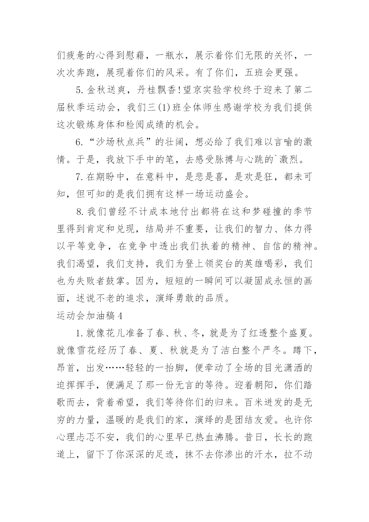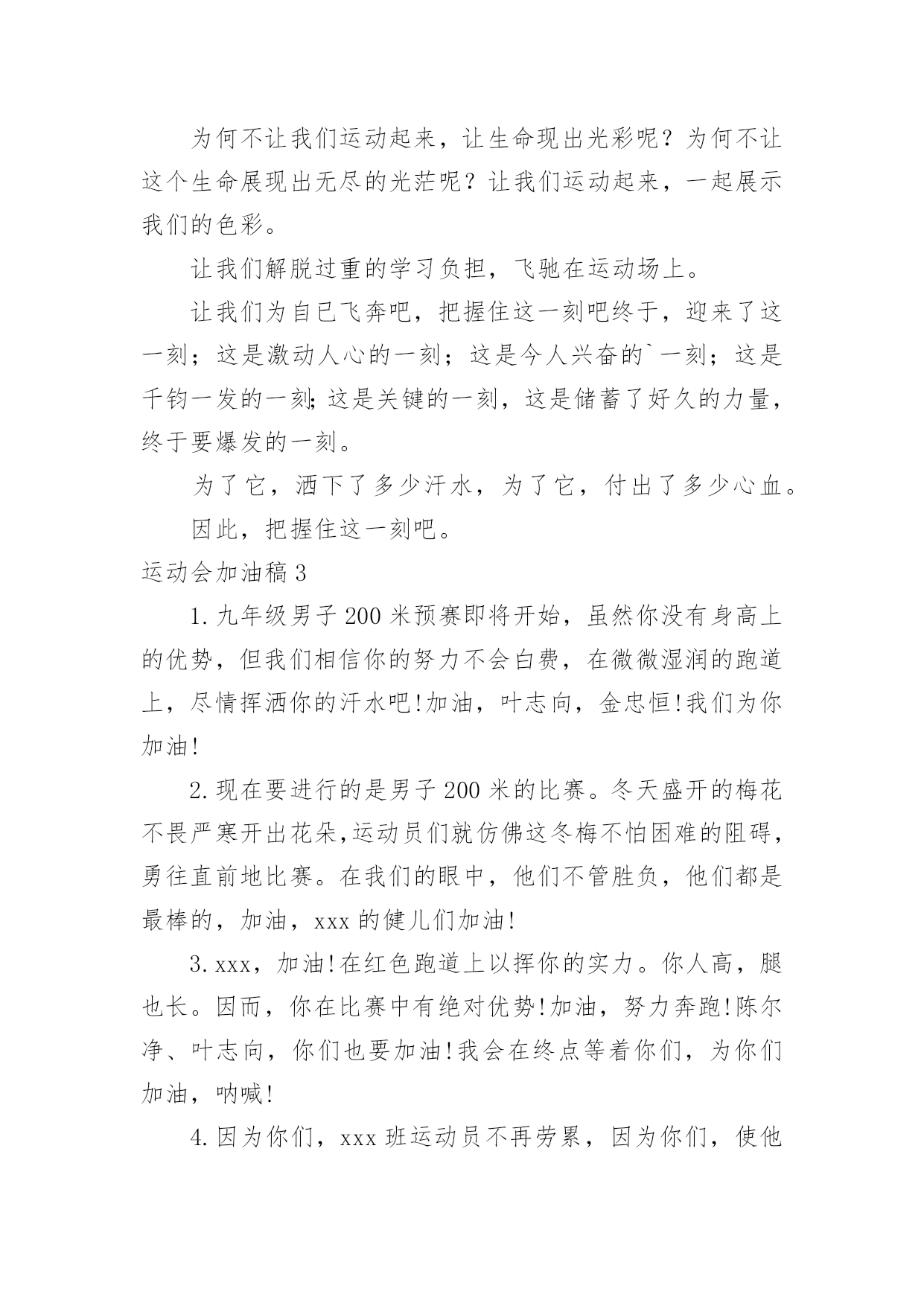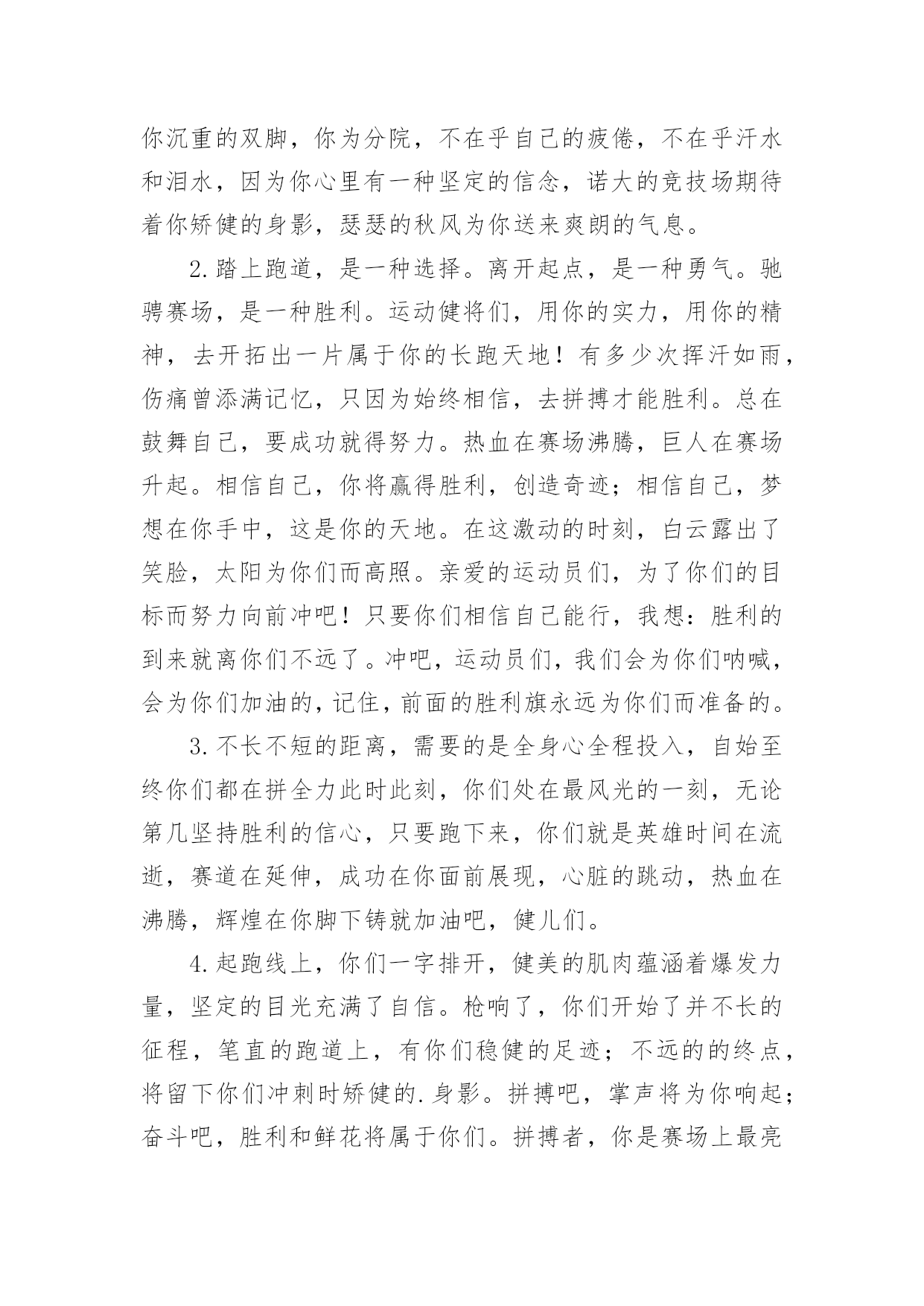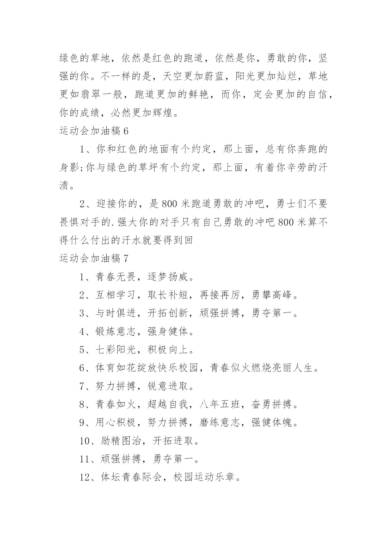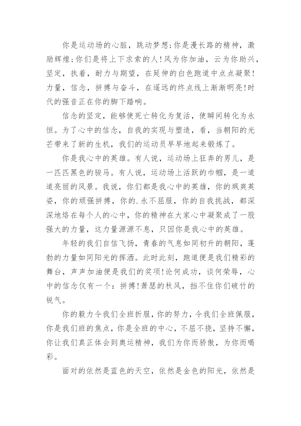 运动会加油稿运动会加油稿在当今社会生活中,需要使用加油稿的场合越来越多,加油稿是一种对他人有正向激励作用的文稿。怎样写加油稿才能更好地发挥其做用呢?下面是小编精心整理的运动会加油稿,欢迎大家借鉴与参考,希望对大家有所帮助。运动会加油稿11.运动会加油稿50字集合二年级虽然你们在场上的时间很短暂,但你们的身影依然停留在人们的脑海里,因为你们是赛场上最可爱的人。2.运动会加油稿50字集合二年级晨风轻轻地唤醒骄阳校园的操场传来发令枪的声响彩旗与呐喊声一起在飘荡着心和起点紧紧的相连用青春和热血来铺洒白色的跑道用激情点燃胜利的曙光3.运动会加油稿50字集合二年级环形的跑道一圈又一圈的坚持,毅力与精神活跃在会场上,湿透的衣衫,满头的大汗,无限追求奋力追赶,我们为你欢呼跳跃,我们为你骄傲。4.运动会加油稿50字集合二年级在明媚的蓝天下,在宽广的绿茵上,一颗颗炽热的心为你们而跳动,一双双期待的眼神因你们而牵动。努力吧!运动健儿们,相信自己,胜利的光环将永远环绕你们!5.运动会加油稿50字集合二年级快去追赶对手,快去夺取胜利!相信你会送给我们一个汗水浸湿的微笑!6.运动会加油稿50字集合二年级广阔的绿茵场,是为你们搭建的舞台。张扬吧,年轻的心,我们将为你永远喝彩!7.运动会加油稿50字集合二年级赛场上,无数飞扬的红色生命,无数威武的骑手,无数干枯的与蓝天对吻的草儿,映动着一个个跃动的生命。因为有你,初冬的阳光编织煦暖;因为有你,终点的线条色彩斑斓;因为有你,掌声才显现出非凡的意义。8.运动会加油稿50字集合二年级就像花儿准备了春秋冬,就是为了红透整个盛夏。就像雪花经历了春夏秋就是为了洁白整个严冬。蹲下,昂首,出发……轻轻的一抬脚,便牵动了全场的目光。潇洒的挥挥手,便满足了那一份无言的等待。9.运动会加油稿50字集合二年级你是运动场的心脏,跳动梦想;你是漫长路的精神,激励辉煌。你们是将上下求索的人!风为你加油,云为你助兴。坚定,执着,耐力与希望,在延伸的白色跑道中点点凝聚!10.运动会加油稿50字集合二年级泥泞的路走过无数,累了,告诉自我:快了,再坚持一会儿;身上的伤流出血来,疼了,告诉自我:别哭,会好的;摔倒了,告诉自我:快爬起来,世上很少有坦途。11.运动会加油稿50字集合二年级超越对手,更要超越自我,追求卓越是我们的目标,是我们的信念,在清爽的秋季,在喧嚣的赛场,你们点燃了似火的热情,无论成败,你们永远是我们的骄傲,我们都为你们感到自豪!12.运动会加油稿50字集合二年级踏上跑道,是一种选择。离开起点,是一种勇气。驰骋赛场,是一种胜利。运动健将们,用你的实力,用你的精神,去开拓出,一片属于你的长跑天地!13.运动会加油稿50字集合二年级你的毅力令我们全班折服,你的`努力,令我们全班佩服,你是我们班的焦点,你是全班的中心。14.运动会加油稿50字集合二年级最高的不是天空,是你们的信念,最远的不是天边,而是永不实现的目标。最广的不是海洋,是你们对运动的热情,最美的不是天上的彩虹,而是你们胜利的微笑!15.运动会加油稿50字集合二年级运动场上有你们的飒爽英姿,运动场上有你们拼搏的身影,面对漫漫的征程,你没有畏惧和退缩!16.运动会加油稿50字集合二年级你用行动述说着成功的好处,运动场上有无数成绩的高峰,而我们只是向更高处攀登。17.运动会加油稿50字集合二年级多少次挥汗如雨,伤痛曾添满记忆,只因为始终相信,去拼搏才能胜利。18.运动会加油稿50字集合二年级运动场上彩旗飘,运动健儿显英豪,跳跃身姿轻如燕,铅球飞落地动摇,百米冲刺如猛虎。19.运动会加油稿50字集合二年级这是速度与毅力的接力,这是期望与祈盼的接力,时间在这里凝固,几分几秒也变得如此漫长。20.运动会加油稿50字集合二年级看,终点就在眼前;听,同学为你呼喊。鼓起勇气奋力向前,用你的荣誉带给我们期望。运动会加油稿2无论成绩如何,我都会驻立在茫茫中,为你送上一份特别的祝福,人不是一件东西,而是一个置身于不断发展过程中的生命体,人的生命在运动。为何不让我们运动起来,让生命现出光彩呢?为何不让这个生命展现出无尽的光茫呢?让我们运动起来,一起展示我们的色彩。让我们解脱过重的学习负担,飞驰在运动场上。让我们为自已飞奔吧,把握住这一刻吧终于,迎来了这一刻;这是激动人心的一刻;这是今人兴奋的`一刻;这是千钧一发的一刻;这是关键的一刻,这是储蓄了好久的力量,终于要爆发的一刻。为了它,洒下了多少汗水,为了它,付出了多少心血。因此,把握住这一刻吧。运动会加油稿31.九年级男子200米预赛即将开始,虽然你没有身高上的优势,但我们相信你的努力不会白费,在微微湿润的跑道上,尽情挥洒你的汗水吧!加油,叶志向,金忠恒!我们为你加油!2.现在要进行的是男子200米的比赛。冬天盛开的梅花不畏严寒开出花朵,运动员们就仿