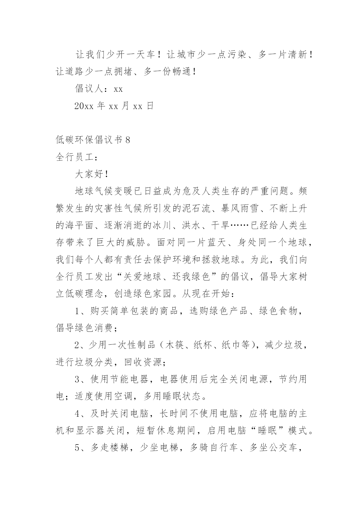 低碳环保倡议书低碳环保倡议书(集合15篇)在现在的社会生活中,我们都跟倡议书有着直接或间接的联系,倡议书作为一种公开提议性的专用书信,其在写作上有一定的规范。如何写一份恰当的倡议书呢?下面是小编为大家整理的低碳环保倡议书,希望对大家有所帮助。低碳环保倡议书1老师、同学们:你们好!我们的地球已经伤痕累累,我们应当行动起来,保护地球。如今:大气污染、温室效应、臭氧层破坏、土地沙漠化、水污染、海洋生态危机、物种濒危、垃圾难题、人口增长等各种难题让我们困绕。所以我们应当保护环境。我提出以下意见:一、学习有关环境保护知识,收听、收看广播保护节目,阅读环境知识读物、报纸,与同学、朋友和家长讨论环境保护知识,与破坏环境的现象作斗争。二、不浪费纸张,不浪费粮食,节俭用水,节俭用电,节俭燃料。共同节俭我们有限的资源。三、把损坏的物品修理好再用,延长使用期,多用可循环再利用的物品,不用或少用一次性纸制品和木制品。四、购买有“环境标志”和“绿色标志”的物品,不吸烟,不随地吐痰,不使用还有破坏臭氧层的物品(如发胶)。五、不向下水道排放污油、丢垃圾,不向海洋、湖泊、江河,分类处理垃圾,把旧书本、报纸、饮料罐卖给废品回收部门,少用塑料包装袋。六、保护野生动物,不摘采花草,不砍伐树木,不踏草坪。同学们,让我们共同创造一个完美的家园吧!低碳环保倡议书2亲爱同学们:大家好!为鼓励广大同学积极投身节约型校园建设,全面推进节约型校园建设,结合学校实际情况,我们向学校全体同学发出环保节能倡议:1、抵制商品过度包装,节约粮食,养成健康科学的饮食习惯,树立节俭文明的生活消费理念。2、养成离开教室、办公室及其他公共场所时随手关灯、关空调、关电脑,下班关饮水机的良好习惯。水龙头随用随关,避免长流水。3、会议室、办公室做到冬天空调温度不高于20度、夏天空调温度不低于26度,下班时提前30分钟关闭空调,寒、暑假以及长假期间长久不使用空调的时候或者把插头拔掉,或者把插电板的电门关上。4、天气晴朗、光线充足时,建议教室、办公室、会议室以采用自然光为宜。5、发现他人有浪费行为时及时规劝,发现因设备损坏或施工造成的浪费现象要及时通知学校有关部门。同学们,让我们从自身做起,从生活中的一点一滴做起,积极参与节能减排。为从根本上改变能源浪费及环境污染的现状,为实现国家的节能减排目标、为创建和谐的节约型校园做出自己的贡献。倡议人:xx20xx年xx月xx日低碳环保倡议书3全县广大家庭:地球是我们共同的家园,环境与我们的生活息息相关。合理使用资源,减少人为浪费是全社会共同的责任。家庭是社会的细胞,是推动绿色低碳的重要力量。如果每个家庭都能自觉参与到“绿色环保、低碳生活”活动中来,必将为经济社会的可持续发展带来巨大效益。为进一步倡导低碳生活方式,让“绿色环保、妇女带头、家庭先行”的理念深入人心,我们向全县广大妇女和家庭发出如下倡议:做节能低碳、保护环境的倡导者。广大妇女和家庭成员要牢固树立“绿色环保、低碳生活”的意识,弘扬中华民族勤俭节约的传统美德,倡导广大家庭实行低能量、低消耗、低开支、低代价的低碳生活方式,享受绿色时尚生活,努力营造节约能源、合理消费、健康生活的良好氛围。做节能低碳、保护环境的实践者。广大妇女和家庭成员要积极参与节能减排、低碳家庭等活动,从现在做起,从点滴小事做起,切实做好“家庭低碳计划十五件事”。内容是:(1)使用节能灯,随手关灯、拔插头;(2)少用空调多开窗;(3)使用节水型洁具,循环用水;(4)温水洗衣自然晾晒;(5)随身自备饮水杯,不用一次性纸杯;(6)少喝瓶装饮料,多喝白开水;(7)外出用餐自备筷、勺等便携餐具;(8)购物使用布袋子,尽量不用塑料袋;(9)电梯少乘几层,楼梯多爬几层;(10)每周少开两天车,多坐公交车;(11)坚持上班走路或骑自行车;(12)多在户外运动锻炼,少去健身房;(13)提倡减少荤食,合理健康饮食;(14)家里多养花种草,绿化居室环境;(15)建立家庭低碳档案,核算每月家庭减少的碳排放量。做节能低碳、保护环境的志愿者。广大妇女和家庭成员要积极向邻里、朋友宣传节能低碳意义、介绍节能低碳知识、推广节能低碳技巧;要对发生在身边的浪费资源、污染环境的现象,认真监督,推进节能低碳进社区、进家庭。全县广大妇女和家庭,让我们立即行动起来,同心协力,以实际行动爱护资源,保护环境,用行动肩负环保重任,同享低碳生活,共建绿色家园!低碳环保倡议书4低碳生活,创造绿色家园,我们要行动起来。绿色是生命的基调,绿色是文明的组成,植树造林不但可以增添绿意,还能达到减碳的效果。恰逢春季,正是植树造林的好时机,请您亲手种下一棵树,为自己,为家人,为地球添一份绿,许一份美好的愿望,积极带头掀起低碳生活、植树造林的高潮。从现在开始:1、购买简单包装的商品,选购绿色产品、绿色食物