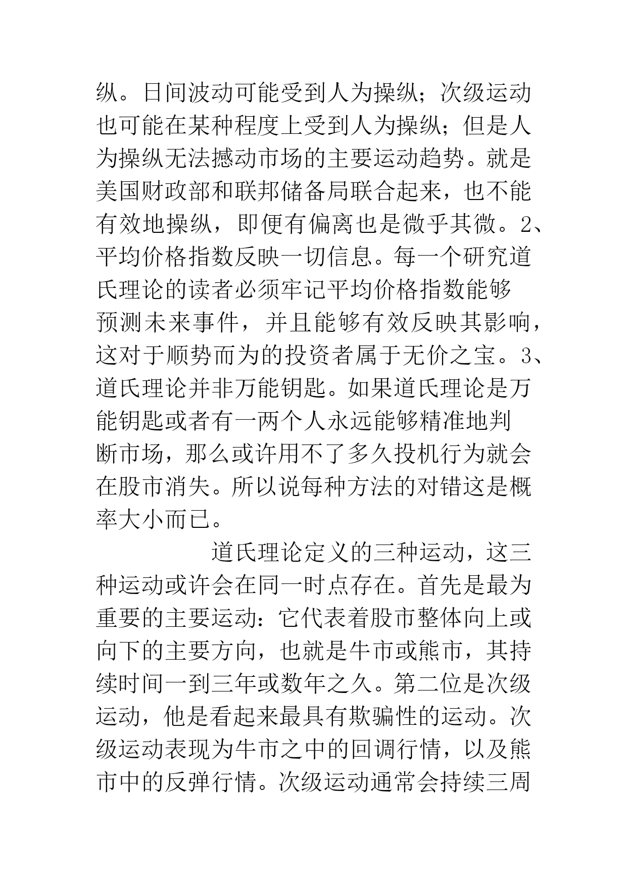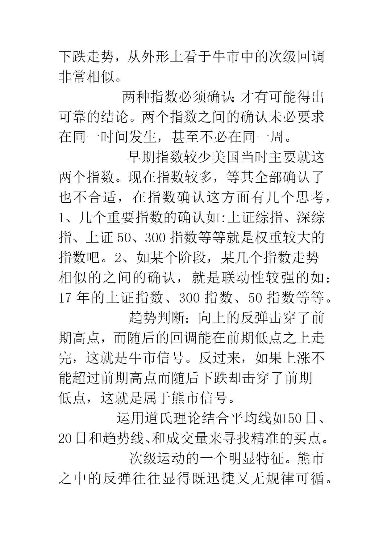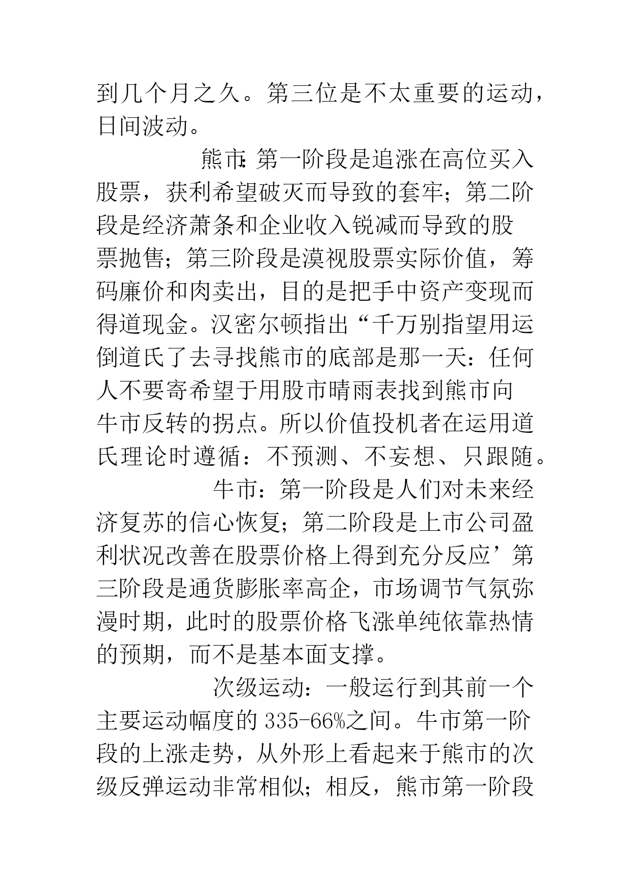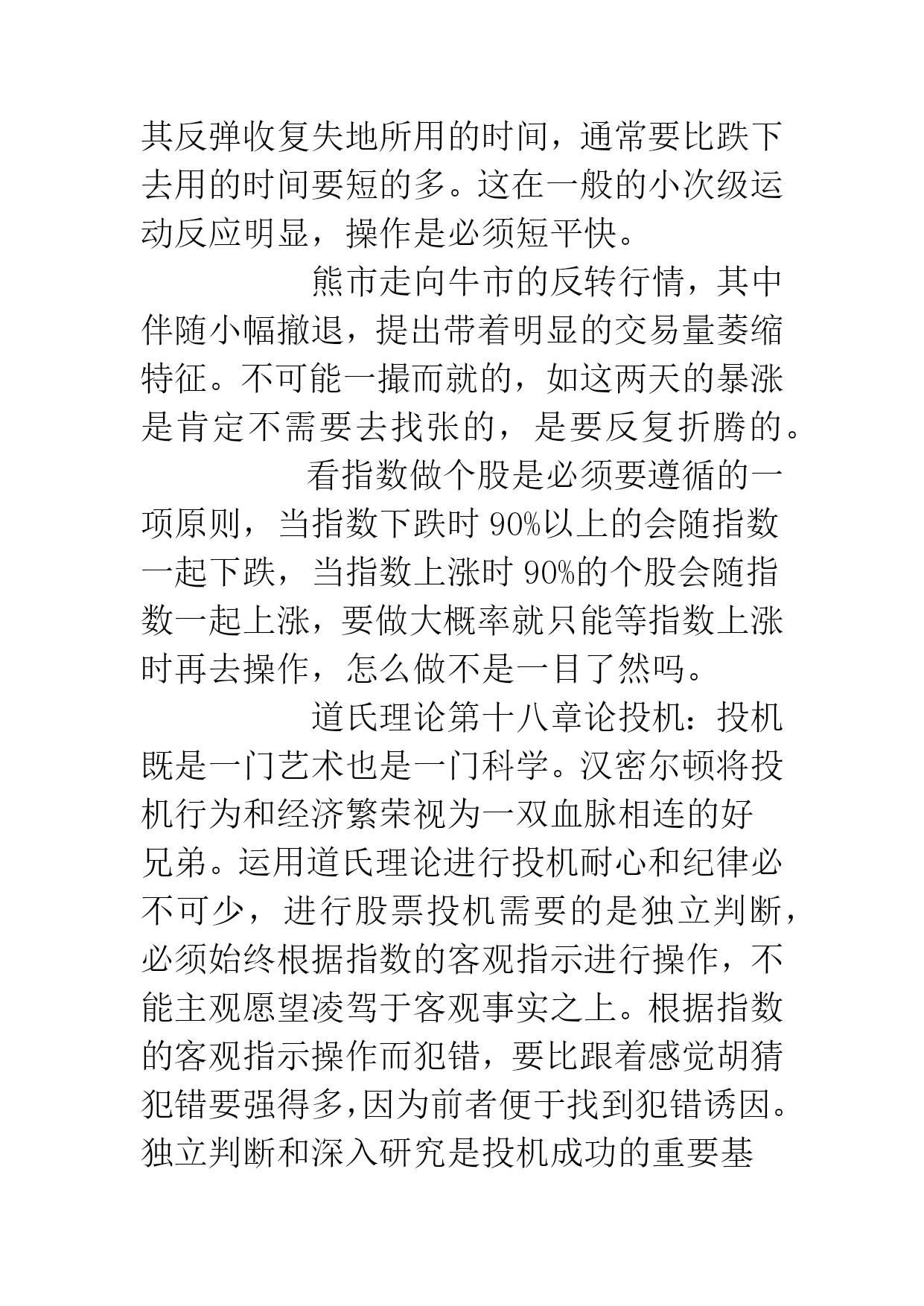 《道氏理论》读后感1800字这本书讲的是投资,投机中需要有耐心和纪律,需要借助客观实际进行分析,不可借助主观因素进行操作,下面是小编带来的《道氏理论》读后感1800字,有兴趣的可以看一看。人们通常所称的道氏理论,实际上是已故的查尔斯.道与威廉姆.普特.汉密尔顿两人共同的研究成果。查尔斯.道士道琼斯公司的创始人之一,该公司为全美提供金融新闻服务。查尔斯.道士《华尔街日报》的开创者,并亲自担任该报的编辑工作。雷亚先生在深入研究查尔斯.道与汉密尔顿的作品的基础上,写出了这本书。从1897年的年初开始,细分铁路和工业两类上市公司股份。过去35年的平均价格的走势,就好比航海图对于水手一样重要。道氏理论的三大假设:1、人为操纵。日间波动可能受到人为操纵;次级运动也可能在某种程度上受到人为操纵;但是人为操纵无法撼动市场的主要运动趋势。就是美国财政部和联邦储备局联合起来,也不能有效地操纵,即便有偏离也是微乎其微。2、平均价格指数反映一切信息。每一个研究道氏理论的读者必须牢记平均价格指数能够预测未来事件,并且能够有效反映其影响,这对于顺势而为的投资者属于无价之宝。3、道氏理论并非万能钥匙。如果道氏理论是万能钥匙或者有一两个人永远能够精准地判断市场,那么或许用不了多久投机行为就会在股市消失。所以说每种方法的对错这是概率大小而已。道氏理论定义的三种运动,这三种运动或许会在同一时点存在。首先是最为重要的主要运动:它代表着股市整体向上或向下的主要方向,也就是牛市或熊市,其持续时间一到三年或数年之久。第二位是次级运动,他是看起来最具有欺骗性的运动。次级运动表现为牛市之中的回调行情,以及熊市中的反弹行情。次级运动通常会持续三周到几个月之久。第三位是不太重要的运动,日间波动。熊市:第一阶段是追涨在高位买入股票,获利希望破灭而导致的套牢;第二阶段是经济萧条和企业收入锐减而导致的股票抛售;第三阶段是漠视股票实际价值,筹码廉价和肉卖出,目的是把手中资产变现而得道现金。汉密尔顿指出“千万别指望用运倒道氏了去寻找熊市的底部是那一天:任何人不要寄希望于用股市晴雨表找到熊市向牛市反转的拐点。所以价值投机者在运用道氏理论时遵循:不预测、不妄想、只跟随。牛市:第一阶段是人们对未来经济复苏的信心恢复;第二阶段是上市公司盈利状况改善在股票价格上得到充分反应’第三阶段是通货膨胀率高企,市场调节气氛弥漫时期,此时的股票价格飞涨单纯依靠热情的预期,而不是基本面支撑。次级运动:一般运行到其前一个主要运动幅度的335-66%之间。牛市第一阶段的上涨走势,从外形上看起来于熊市的次级反弹运动非常相似;相反,熊市第一阶段下跌走势,从外形上看于牛市中的次级回调非常相似。两种指数必须确认:才有可能得出可靠的结论。两个指数之间的确认未必要求在同一时间发生,甚至不必在同一周。早期指数较少美国当时主要就这两个指数。现在指数较多,等其全部确认了也不合适,在指数确认这方面有几个思考,1、几个重要指数的确认如:上证综指、深综指、上证50、300指数等等就是权重较大的指数吧。2、如某个阶段,某几个指数走势相似的之间的确认,就是联动性较强的如:17年的上证指数、300指数、50指数等等。趋势判断:向上的反弹击穿了前期高点,而随后的回调能在前期低点之上走完,这就是牛市信号。反过来,如果上涨不能超过前期高点而随后下跌却击穿了前期低点,这就是属于熊市信号。运用道氏理论结合平均线如50日、20日和趋势线、和成交量来寻找精准的买点。次级运动的一个明显特征。熊市之中的反弹往往显得既迅捷又无规律可循。其反弹收复失地所用的时间,通常要比跌下去用的时间要短的多。这在一般的小次级运动反应明显,操作是必须短平快。熊市走向牛市的反转行情,其中伴随小幅撤退,提出带着明显的交易量萎缩特征。不可能一撮而就的,如这两天的暴涨是肯定不需要去找张的,是要反复折腾的。看指数做个股是必须要遵循的一项原则,当指数下跌时90%以上的会随指数一起下跌,当指数上涨时90%的个股会随指数一起上涨,要做大概率就只能等指数上涨时再去操作,怎么做不是一目了然吗。道氏理论第十八章论投机:投机既是一门艺术也是一门科学。汉密尔顿将投机行为和经济繁荣视为一双血脉相连的好兄弟。运用道氏理论进行投机耐心和纪律必不可少,进行股票投机需要的是独立判断,必须始终根据指数的客观指示进行操作,不能主观愿望凌驾于客观事实之上。根据指数的客观指示操作而犯错,要比跟着感觉胡猜犯错要强得多,因为前者便于找到犯错诱因。独立判断和深入研究是投机成功的重要基础,投机成功的概率大约是二十分之一。汉密尔顿忠告投机者应该学会止损和止盈。骄傲自大与固执己见,是投机失败的两大罪魁祸首。