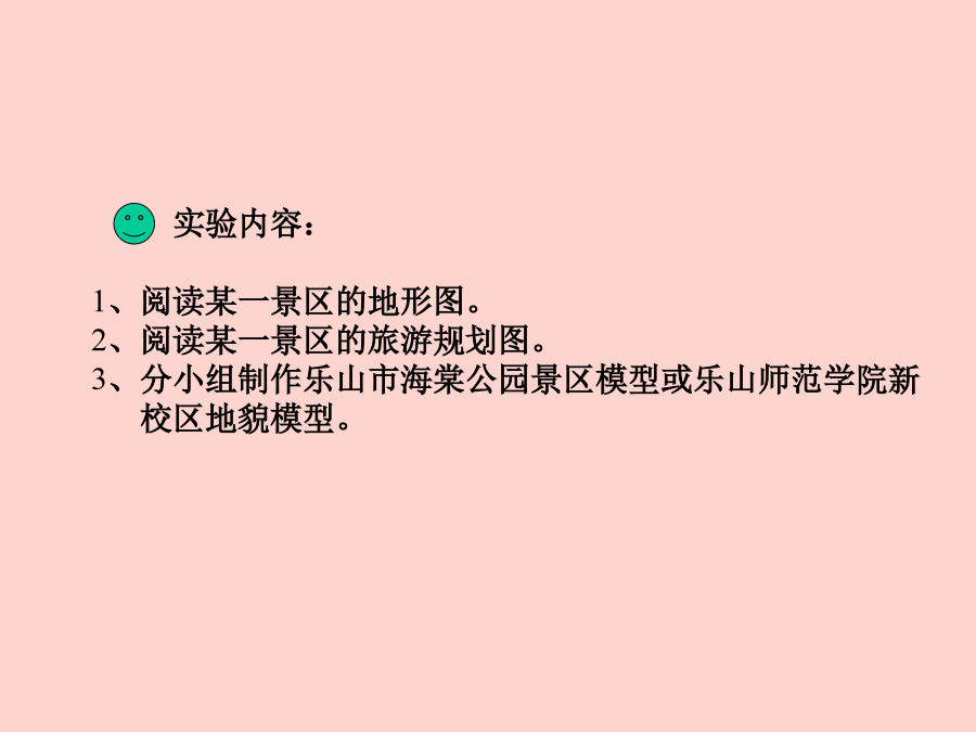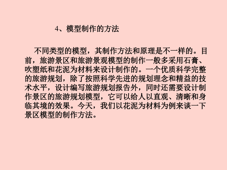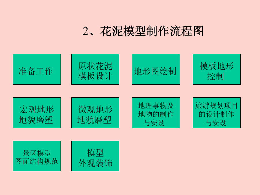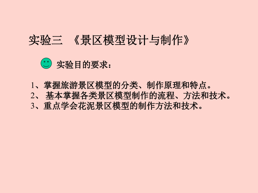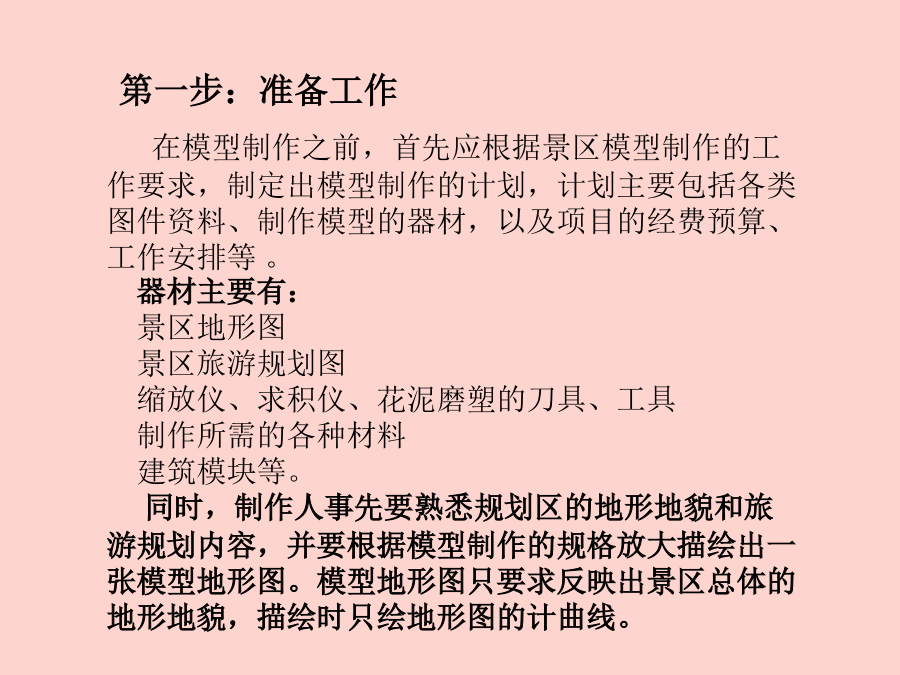 《旅游资源开发与规划》实验内容:1、阅读某一景区的地形图。2、阅读某一景区的旅游规划图。3、分小组制作乐山市海棠公园景区模型或乐山师范学院新校区地貌模型。一、模型概念1、模型的定义3、模型的特点4、模型制作的方法二、花泥景区模型制作:1、原理和方法(地貌磨塑法)花泥景区模型制作方法也称地貌磨塑法,它是将插花用的花泥材料,利用花泥所具有的塑性、易粘和易刻的特性,将景区的地形地貌依照地形图,用手工磨塑的方法将其塑造恢复出来。这种制作方法要求制作者应懂得地形图的基本知识和基本技能,并有一般雕塑、美术的基础。2、花泥模型制作流程图在模型制作之前,首先应根据景区模型制作的工作要求,制定出模型制作的计划,计划主要包括各类图件资料、制作模型的器材,以及项目的经费预算、工作安排等。器材主要有:景区地形图景区旅游规划图缩放仪、求积仪、花泥磨塑的刀具、工具制作所需的各种材料建筑模块等。同时,制作人事先要熟悉规划区的地形地貌和旅游规划内容,并要根据模型制作的规格放大描绘出一张模型地形图。模型地形图只要求反映出景区总体的地形地貌,描绘时只绘地形图的计曲线。实验器材:景区地形图、规划图、模型地形图、花泥板、刀具、白乳胶等实验器材:景区地形图、模型地形图、原状花泥模板、铅笔、刻刀、大头针等实验器材:磨塑刻绘好的花泥地形模板,模型制作工具,量具,景区地形图实验器材:已刻塑好的地形控制模板、刻磨刀具、地形图实验器材:宏观地貌模型、刻磨刀具、地形图实验器材:已磨塑好的地貌模型,地形图,模型制作刀具,量具,工具,多股铜导线。泡沫薄片,各类颜料、颜色水及胶水等实验器材:前面已磨塑好的地形地貌模型,旅游规划图、相关模型制作工具和旅游规划项目制作所涉及到的有关工具材料等。实验器材:前面已制作好的景区模型。实验器材:前面已制作好的景区模型。总设计:XXX