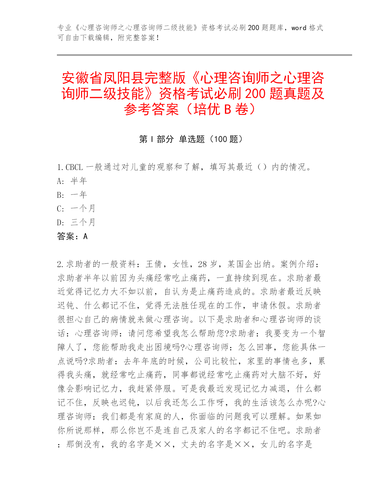 安徽省凤阳县完整版《心理咨询师之心理咨询师二级技能》资格考试必刷200题真题及参考答案(培优B卷)