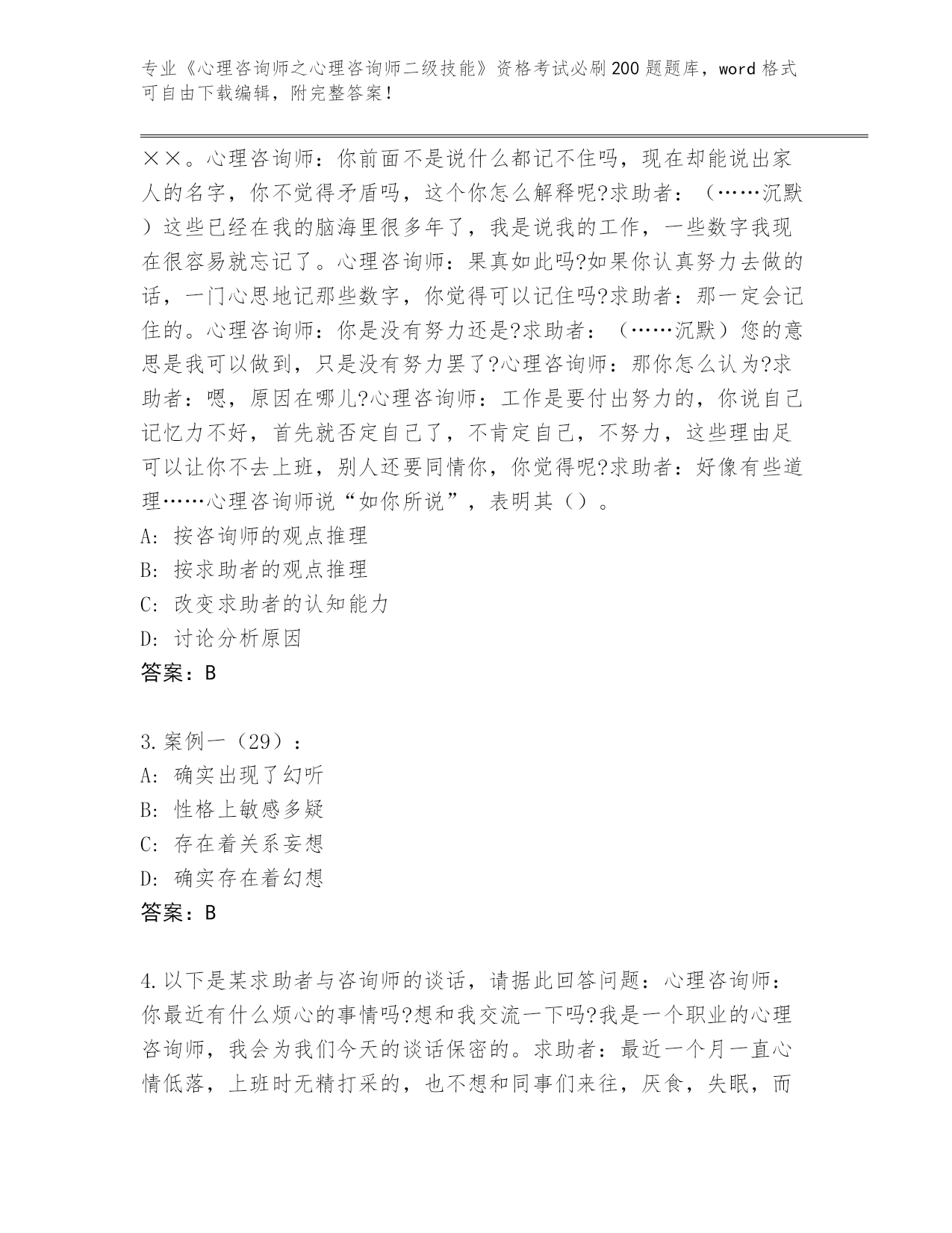 完整版江西省于都县《心理咨询师之心理咨询师二级技能》资格考试必刷200题真题及参考答案(培优B卷)