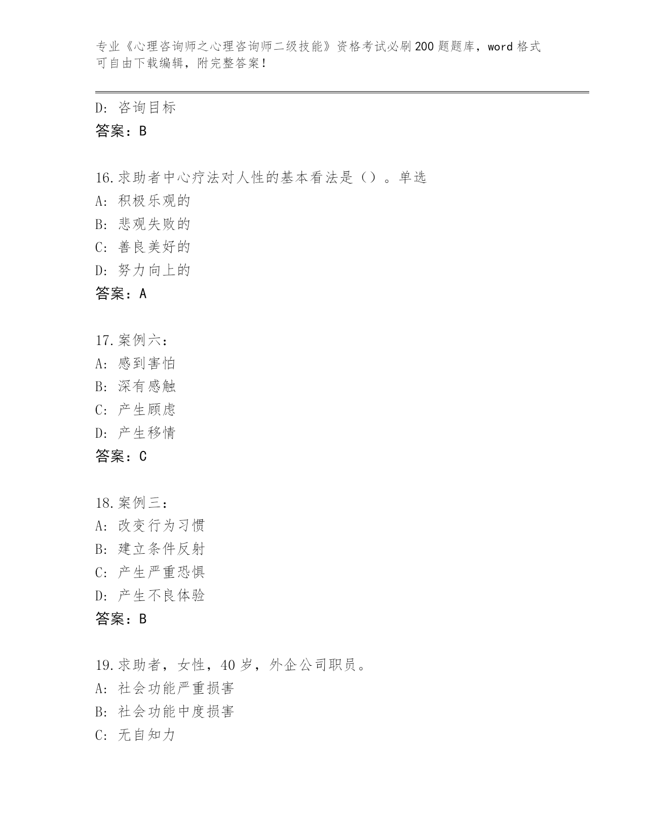 完整版山西省城区《心理咨询师之心理咨询师二级技能》资格考试必刷200题真题附答案(培优B卷)