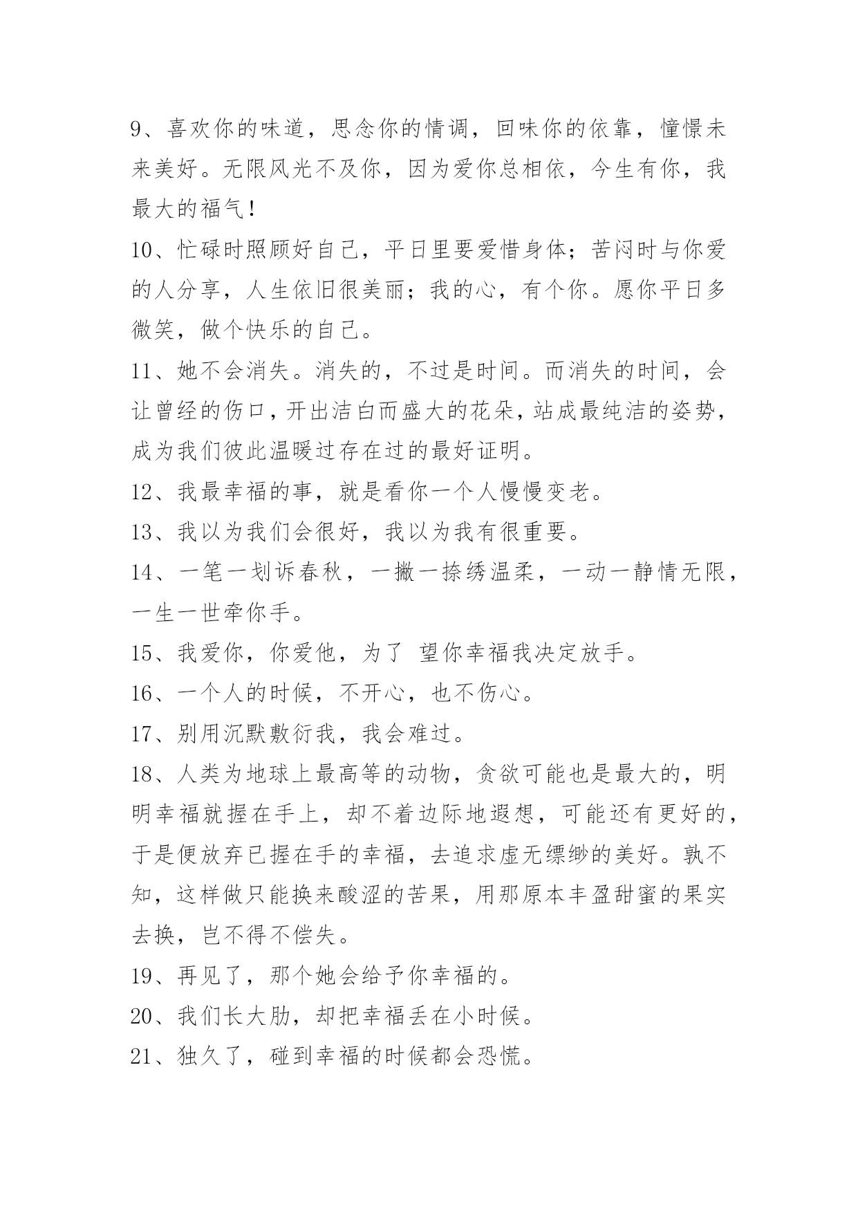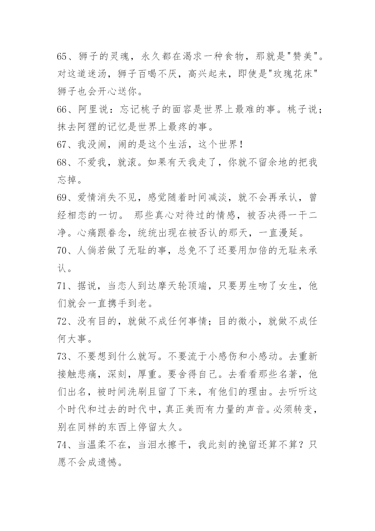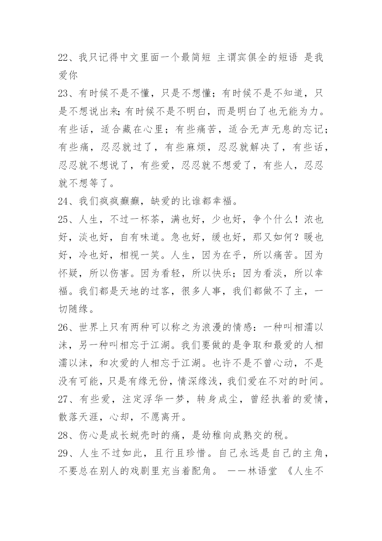 感人爱情语录75条通用感人爱情语录集锦75条女人的气质一百种,温柔的女人味通杀。以下是小编收集整理的感人爱情语录75条,欢迎阅读与收藏。1、天边的烟云抹去了淡淡的忧伤,或许我该学会调和等待与惆怅。2、一叶遮目,可以不见森林,如果有了片碧绿的叶子,我就不要森林,我喜欢的就是最好的,比如你。3、感谢上天赐予我这么美好的一段相遇,无论如何,你都是我今生最美的相遇。4、牵着你的手,我要你听我说爱你。5、有时候,一个拥抱就足够让你高兴了很久有时候一眼便知你心。6、你的出现,让我本来的人生剧本从庸俗的生活剧变成了灿烂夺目的喜剧,我会尽更大努力演绎出更多璀璨的浪漫剧情。7、我这个人运气一向不好,我这辈子最幸运的事大概就是遇见你,所以我特别特别珍惜,长这么大唯一坚持下来的事情就是爱你。8、你的一颦一笑,让我销魂;你的一举一动,让我着迷;你的一言一行,让我沉醉;你的一切一切,让我留恋。亲爱的,想着你是甜蜜的,爱上你是幸福的!9、喜欢你的味道,思念你的情调,回味你的依靠,憧憬未来美好。无限风光不及你,因为爱你总相依,今生有你,我最大的福气!10、忙碌时照顾好自己,平日里要爱惜身体;苦闷时与你爱的人分享,人生依旧很美丽;我的心,有个你。愿你平日多微笑,做个快乐的自己。11、她不会消失。消失的,不过是时间。而消失的时间,会让曾经的伤口,开出洁白而盛大的花朵,站成最纯洁的姿势,成为我们彼此温暖过存在过的最好证明。12、我最幸福的事,就是看你一个人慢慢变老。13、我以为我们会很好,我以为我有很重要。14、一笔一划诉春秋,一撇一捺绣温柔,一动一静情无限,一生一世牵你手。15、我爱你,你爱他,为了望你幸福我决定放手。16、一个人的时候,不开心,也不伤心。17、别用沉默敷衍我,我会难过。18、人类为地球上最高等的动物,贪欲可能也是最大的,明明幸福就握在手上,却不着边际地遐想,可能还有更好的,于是便放弃已握在手的幸福,去追求虚无缥缈的美好。孰不知,这样做只能换来酸涩的苦果,用那原本丰盈甜蜜的果实去换,岂不得不偿失。19、再见了,那个她会给予你幸福的。20、我们长大肋,却把幸福丢在小时候。21、独久了,碰到幸福的时候都会恐慌。22、我只记得中文里面一个最简短主谓宾俱全的短语是我爱你23、有时候不是不懂,只是不想懂;有时候不是不知道,只是不想说出来;有时候不是不明白,而是明白了也无能为力。有些话,适合藏在心里;有些痛苦,适合无声无息的忘记;有些痛,忍忍就过了,有些麻烦,忍忍就解决了,有些话,忍忍就不想说了,有些爱,忍忍就不想爱了,有些人,忍忍就不想等了。24、我们疯疯癫癫,缺爱的比谁都幸福。25、人生,不过一杯茶,满也好,少也好,争个什么!浓也好,淡也好,自有味道。急也好,缓也好,那又如何?暖也好,冷也好,相视一笑。人生,因为在乎,所以痛苦。因为怀疑,所以伤害。因为看轻,所以快乐;因为看淡,所以幸福。我们都是天地的过客,很多人事,我们都做不了主,一切随缘。26、世界上只有两种可以称之为浪漫的情感:一种叫相濡以沫,另一种叫相忘于江湖。我们要做的是争取和最爱的人相濡以沫,和次爱的人相忘于江湖。也许不是不曾心动,不是没有可能,只是有缘无份,情深缘浅,我们爱在不对的时间。27、有些爱,注定浮华一梦,转身成尘,曾经执着的爱情,散落天涯,心却,不愿离开。28、伤心是成长蜕壳时的痛,是幼稚向成熟交的税。29、人生不过如此,且行且珍惜。自己永远是自己的主角,不要总在别人的戏剧里充当着配角。――林语堂《人生不过如此》30、我希望找到一个人,担心失去我的人。31、你什么都抢不走,因为我什么也没有如果你看懂我的表情,我想你会懂我的心情。32、当爱已成往事就让它随风飘散用沉默和时间来诠释忧伤。在想,到底是感情成全了时间还是时间成全了感情。只是曾经的我告诉自己,我爱你胜过爱自己。望此时朦胧的雾气,点点的氤氲会给我们祝福。33、时间会埋葬一切,悲伤马上就会过去。34、爱也有遗憾。十年前,你爱我,我逃避不见,十年后,我爱你,你不在身边。错过爱情如人生一般,一刹便是永恒,追悔只是纪念。在爱的修行途中,绝不允许投机,面具必被撕毁,谎言必被揭穿,谁也无法幸免。35、总以为我们爱上一个人,我们就必须是一辈子不变心,总以为我们还能等到冥冥中的缘分再度重逢。千里姻缘一线牵,当云雾散尽,当两条相交线错开,我们才知道自己不过是当局者迷。36、容许我酒醉,放下防备我好喜欢你。37、很多时候,我们看不到美丽的风景,是因为我们站的'还不够高。38、一个真正爱你的人,并不会想尽办法来得到你,不会满口谎言,而是用心的帮你,一心为将来打算。爱你的人有时候连死缠烂打都做不到,只默默受伤,默默看你。爱的越深,就爱的越胆怯。39、是我活该,还是你在哄我笑给我一个拥抱。40、爱情如此仓促,我们不要有太多的犹豫,是你的就牢牢地抓