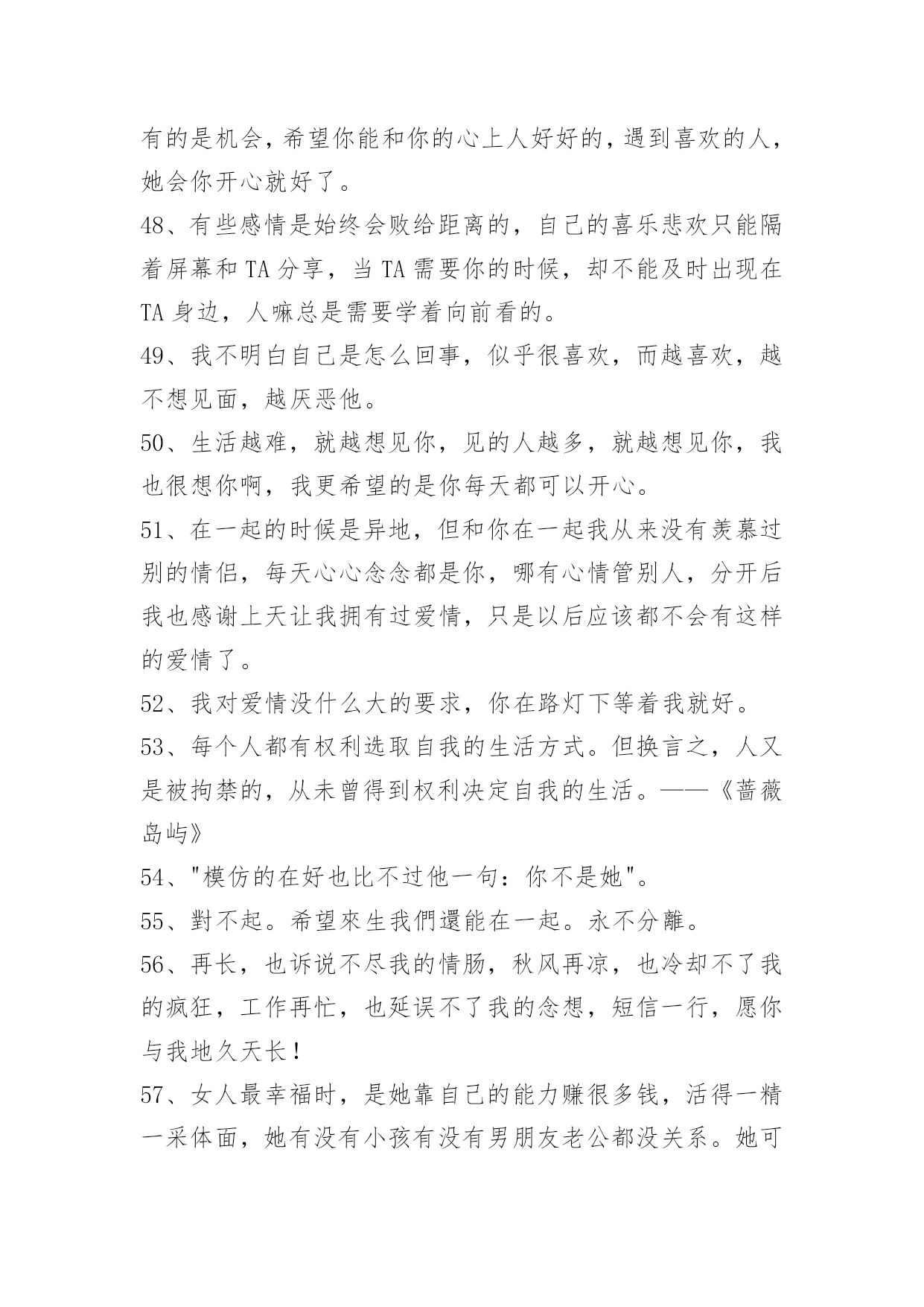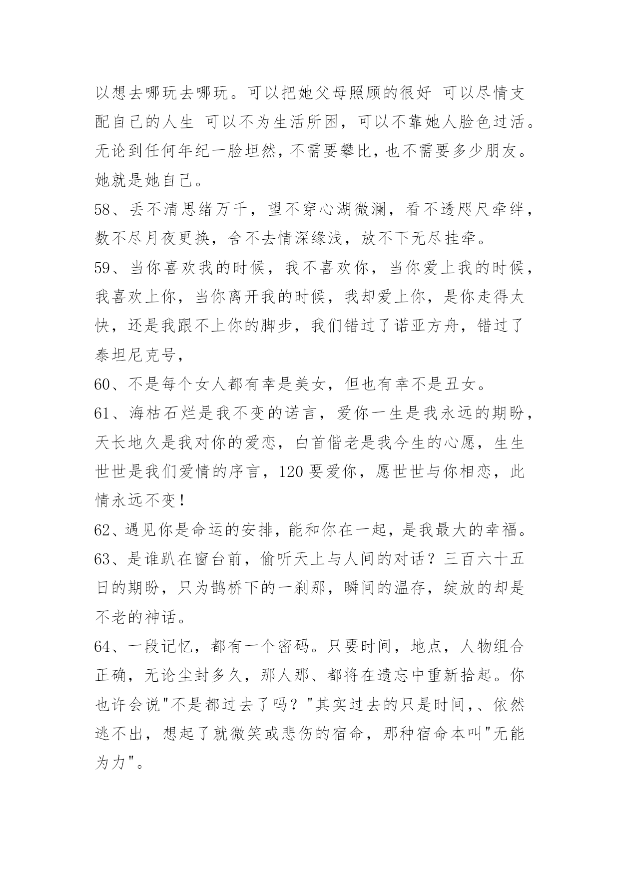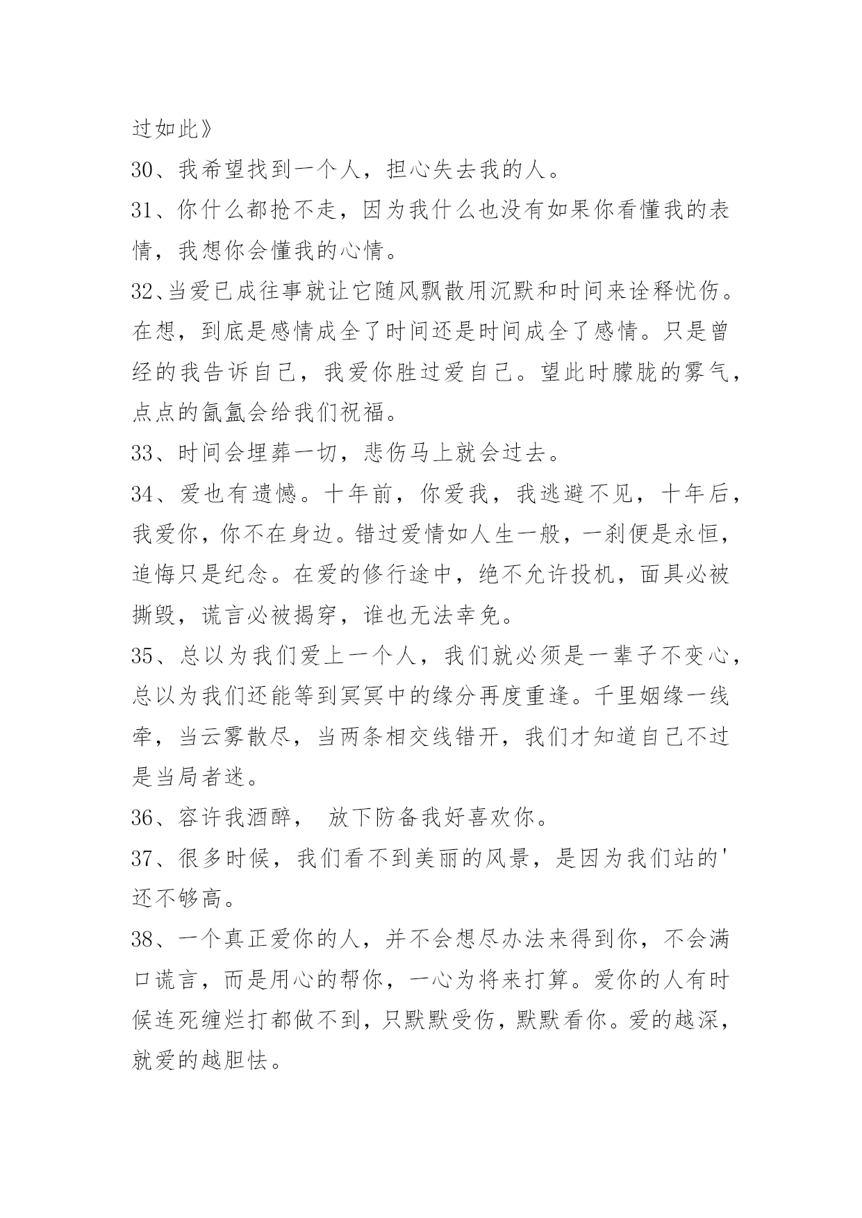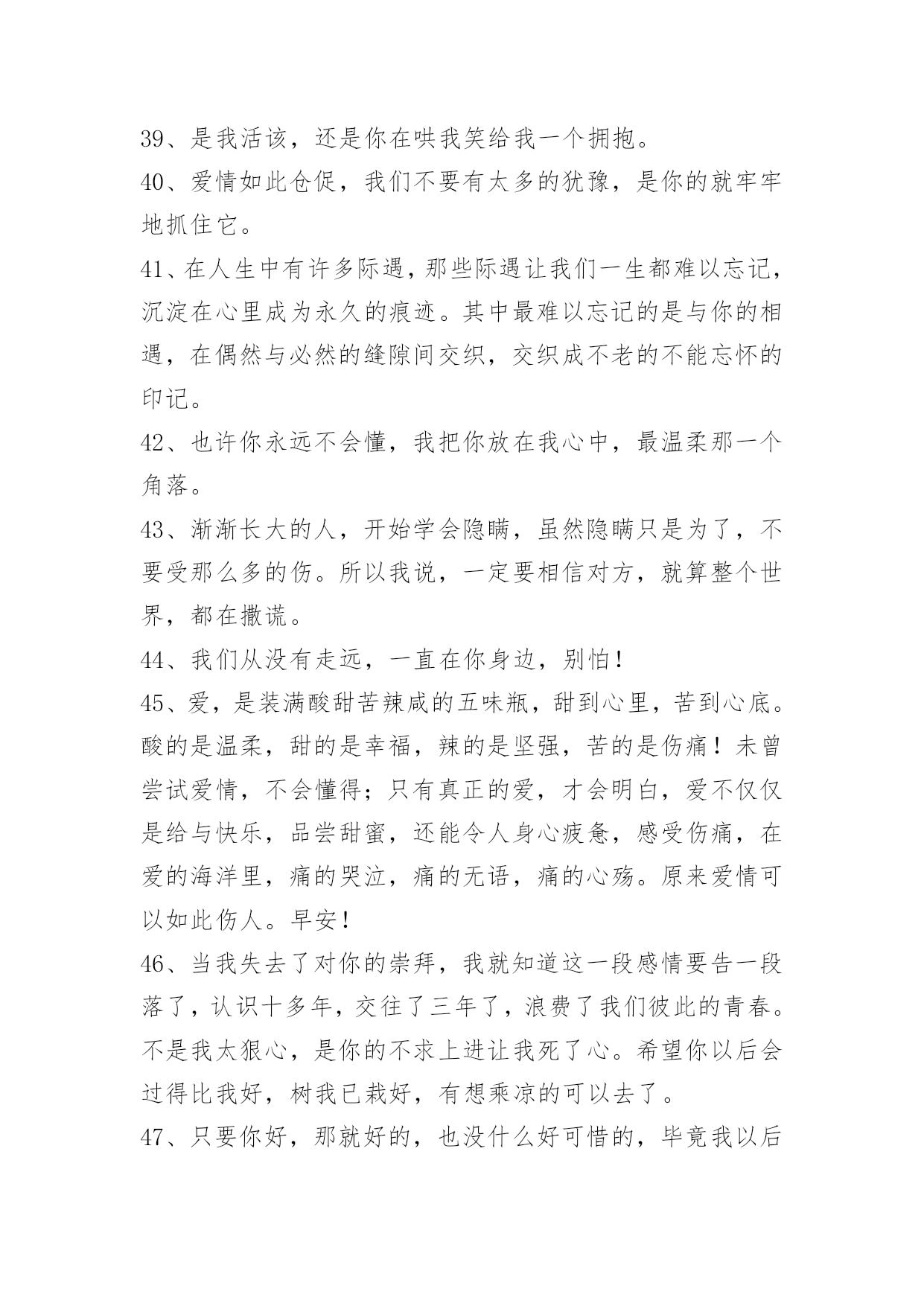 感人爱情语录75条通用感人爱情语录集锦75条女人的气质一百种,温柔的女人味通杀。以下是小编收集整理的感人爱情语录75条,欢迎阅读与收藏。1、天边的烟云抹去了淡淡的忧伤,或许我该学会调和等待与惆怅。2、一叶遮目,可以不见森林,如果有了片碧绿的叶子,我就不要森林,我喜欢的就是最好的,比如你。3、感谢上天赐予我这么美好的一段相遇,无论如何,你都是我今生最美的相遇。4、牵着你的手,我要你听我说爱你。5、有时候,一个拥抱就足够让你高兴了很久有时候一眼便知你心。6、你的出现,让我本来的人生剧本从庸俗的生活剧变成了灿烂夺目的喜剧,我会尽更大努力演绎出更多璀璨的浪漫剧情。7、我这个人运气一向不好,我这辈子最幸运的事大概就是遇见你,所以我特别特别珍惜,长这么大唯一坚持下来的事情就是爱你。8、你的一颦一笑,让我销魂;你的一举一动,让我着迷;你的一言一行,让我沉醉;你的一切一切,让我留恋。亲爱的,想着你是甜蜜的,爱上你是幸福的!9、喜欢你的味道,思念你的情调,回味你的依靠,憧憬未来美好。无限风光不及你,因为爱你总相依,今生有你,我最大的福气!10、忙碌时照顾好自己,平日里要爱惜身体;苦闷时与你爱的人分享,人生依旧很美丽;我的心,有个你。愿你平日多微笑,做个快乐的自己。11、她不会消失。消失的,不过是时间。而消失的时间,会让曾经的伤口,开出洁白而盛大的花朵,站成最纯洁的姿势,成为我们彼此温暖过存在过的最好证明。12、我最幸福的事,就是看你一个人慢慢变老。13、我以为我们会很好,我以为我有很重要。14、一笔一划诉春秋,一撇一捺绣温柔,一动一静情无限,一生一世牵你手。15、我爱你,你爱他,为了望你幸福我决定放手。16、一个人的时候,不开心,也不伤心。17、别用沉默敷衍我,我会难过。18、人类为地球上最高等的动物,贪欲可能也是最大的,明明幸福就握在手上,却不着边际地遐想,可能还有更好的,于是便放弃已握在手的幸福,去追求虚无缥缈的美好。孰不知,这样做只能换来酸涩的苦果,用那原本丰盈甜蜜的果实去换,岂不得不偿失。19、再见了,那个她会给予你幸福的。20、我们长大肋,却把幸福丢在小时候。21、独久了,碰到幸福的时候都会恐慌。22、我只记得中文里面一个最简短主谓宾俱全的短语是我爱你23、有时候不是不懂,只是不想懂;有时候不是不知道,只是不想说出来;有时候不是不明白,而是明白了也无能为力。有些话,适合藏在心里;有些痛苦,适合无声无息的忘记;有些痛,忍忍就过了,有些麻烦,忍忍就解决了,有些话,忍忍就不想说了,有些爱,忍忍就不想爱了,有些人,忍忍就不想等了。24、我们疯疯癫癫,缺爱的比谁都幸福。25、人生,不过一杯茶,满也好,少也好,争个什么!浓也好,淡也好,自有味道。急也好,缓也好,那又如何?暖也好,冷也好,相视一笑。人生,因为在乎,所以痛苦。因为怀疑,所以伤害。因为看轻,所以快乐;因为看淡,所以幸福。我们都是天地的过客,很多人事,我们都做不了主,一切随缘。26、世界上只有两种可以称之为浪漫的情感:一种叫相濡以沫,另一种叫相忘于江湖。我们要做的是争取和最爱的人相濡以沫,和次爱的人相忘于江湖。也许不是不曾心动,不是没有可能,只是有缘无份,情深缘浅,我们爱在不对的时间。27、有些爱,注定浮华一梦,转身成尘,曾经执着的爱情,散落天涯,心却,不愿离开。28、伤心是成长蜕壳时的痛,是幼稚向成熟交的税。29、人生不过如此,且行且珍惜。自己永远是自己的主角,不要总在别人的戏剧里充当着配角。――林语堂《人生不过如此》30、我希望找到一个人,担心失去我的人。31、你什么都抢不走,因为我什么也没有如果你看懂我的表情,我想你会懂我的心情。32、当爱已成往事就让它随风飘散用沉默和时间来诠释忧伤。在想,到底是感情成全了时间还是时间成全了感情。只是曾经的我告诉自己,我爱你胜过爱自己。望此时朦胧的雾气,点点的氤氲会给我们祝福。33、时间会埋葬一切,悲伤马上就会过去。34、爱也有遗憾。十年前,你爱我,我逃避不见,十年后,我爱你,你不在身边。错过爱情如人生一般,一刹便是永恒,追悔只是纪念。在爱的修行途中,绝不允许投机,面具必被撕毁,谎言必被揭穿,谁也无法幸免。35、总以为我们爱上一个人,我们就必须是一辈子不变心,总以为我们还能等到冥冥中的缘分再度重逢。千里姻缘一线牵,当云雾散尽,当两条相交线错开,我们才知道自己不过是当局者迷。36、容许我酒醉,放下防备我好喜欢你。37、很多时候,我们看不到美丽的风景,是因为我们站的'还不够高。38、一个真正爱你的人,并不会想尽办法来得到你,不会满口谎言,而是用心的帮你,一心为将来打算。爱你的人有时候连死缠烂打都做不到,只默默受伤,默默看你。爱的越深,就爱的越胆怯。39、是我活该,还是你在哄我笑给我一个拥抱。40、爱情如此仓促,我们不要有太多的犹豫,是你的就牢牢地抓