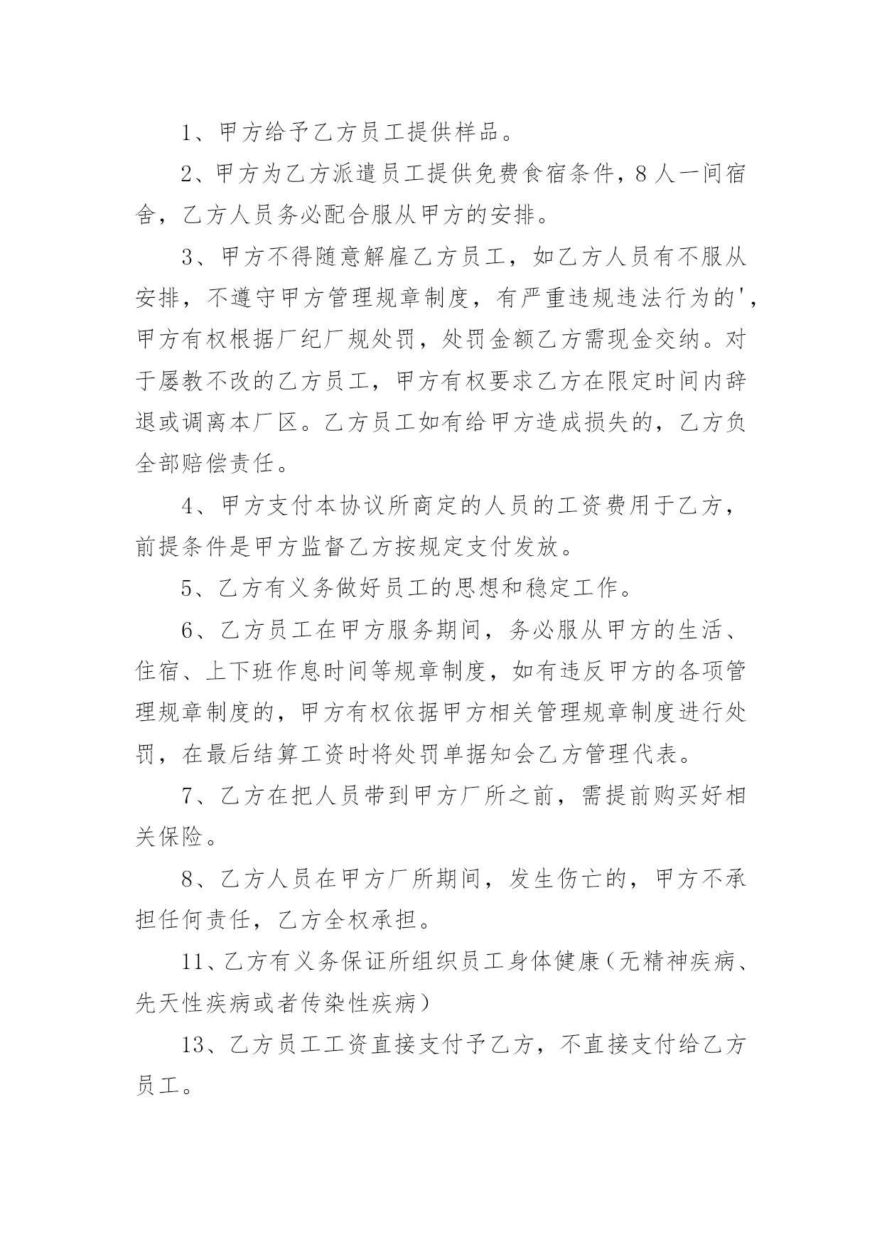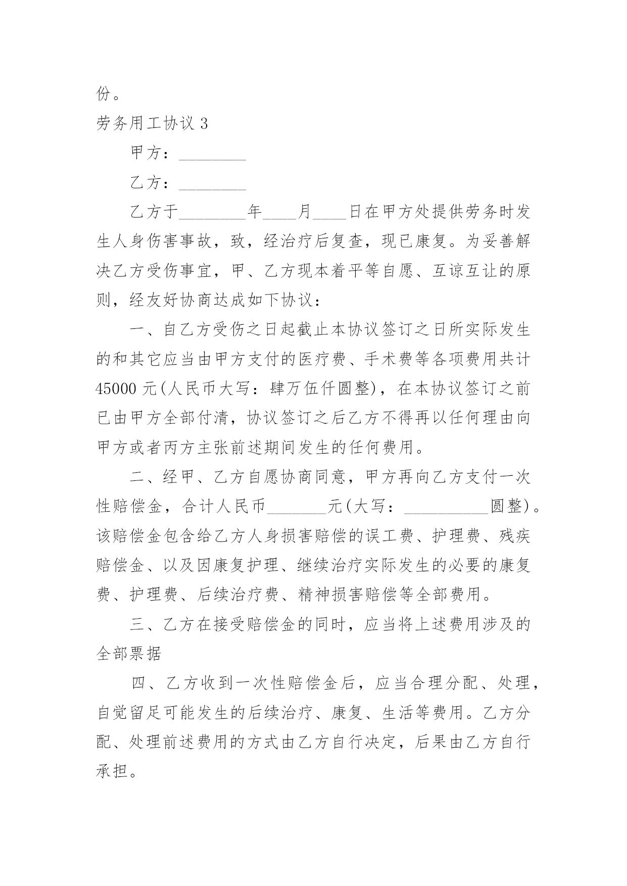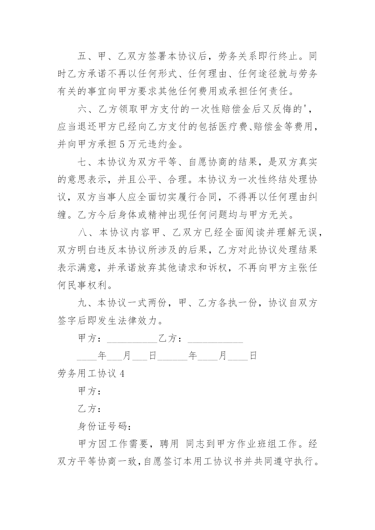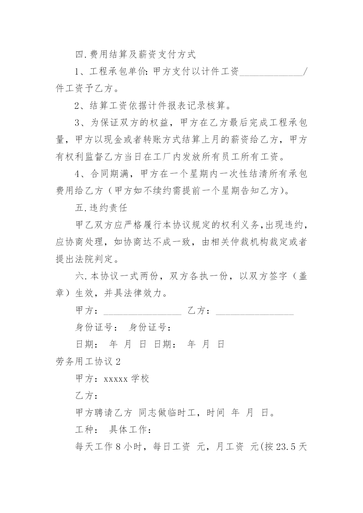 劳务用工协议劳务用工协议(合集15篇)在当下社会,协议起到的作用越来越大,协议的签订是双方或数方之间权利义务的最好规范。大家知道协议的格式吗?下面是小编精心整理的劳务用工协议,仅供参考,希望能够帮助到大家。劳务用工协议1甲方:乙方(工头):甲方代表:身份证号码:联系电话:联系电话:乙方经营承接劳务派遣,承包甲方部分技术工人的人工项目,经过甲乙双方友好协商,达成如下协议:一.协议内容甲方向乙方提供技术工人的作业场地、工具,乙方组织派遣员工负责劳务工作(乙方员工须持有有效身份证,年龄18周岁以上),乙方所派遣的员工归属乙方,不是甲方的员工。在劳务派遣中乙方承担派遣员工的所有相关法律责任事宜,包括办理(社保、保险、工伤、医疗、劳动合同等等)。甲方可以提供购买社保医疗,费用由乙方承担。二.协议有效时间自年月日至年月日止,共计个月;其他:。三.双方的权利和义务1、甲方给予乙方员工提供样品。2、甲方为乙方派遣员工提供免费食宿条件,8人一间宿舍,乙方人员务必配合服从甲方的安排。3、甲方不得随意解雇乙方员工,如乙方人员有不服从安排,不遵守甲方管理规章制度,有严重违规违法行为的',甲方有权根据厂纪厂规处罚,处罚金额乙方需现金交纳。对于屡教不改的乙方员工,甲方有权要求乙方在限定时间内辞退或调离本厂区。乙方员工如有给甲方造成损失的,乙方负全部赔偿责任。4、甲方支付本协议所商定的人员的工资费用于乙方,前提条件是甲方监督乙方按规定支付发放。5、乙方有义务做好员工的思想和稳定工作。6、乙方员工在甲方服务期间,务必服从甲方的生活、住宿、上下班作息时间等规章制度,如有违反甲方的各项管理规章制度的,甲方有权依据甲方相关管理规章制度进行处罚,在最后结算工资时将处罚单据知会乙方管理代表。7、乙方在把人员带到甲方厂所之前,需提前购买好相关保险。8、乙方人员在甲方厂所期间,发生伤亡的,甲方不承担任何责任,乙方全权承担。11、乙方有义务保证所组织员工身体健康(无精神疾病、先天性疾病或者传染性疾病)13、乙方员工工资直接支付予乙方,不直接支付给乙方员工。四.费用结算及薪资支付方式1、工程承包单价:甲方支付以计件工资_____________/件工资予乙方。2、结算工资依据计件报表记录核算。3、为保证双方的权益,甲方在乙方最后完成工程承包量,甲方以现金或者转账方式结算上月的薪资给乙方,甲方有权利监督乙方当日在工厂内发放所有员工所有工资。4、合同期满,甲方在一个星期内一次性结清所有承包费用给乙方(甲方如不续约需提前一个星期告知乙方)。五.违约责任甲乙双方应严格履行本协议规定的权利义务,出现违约,应协商处理,如协商达不成一致,由相关仲裁机构裁定或者提出法院判定。六.本协议一式两份,双方各执一份,以双方签字(盖章)生效,并具法律效力。甲方:________________乙方:________________身份证号:身份证号:日期:年月日日期:年月日劳务用工协议2甲方:xxxxx学校乙方:甲方聘请乙方同志做临时工,时间年月日。工种:具体工作:每天工作8小时,每日工资元,月工资元(按23.5天计),包括基本工资及有关福利补贴,不包括加班及部门创收分配。劳动保护用品按工种参照院工人劳保待遇发给。工伤者有医生证明经本校医生建议、报学校领导审批,一个月内工资照发,(不含完全丧失劳动能力),一个月以上一至六个月内发给l/2二资。未尽事宜,按有关劳动法规办理。事假或旷工一天扣发一天工资,连续15天不出勤,视自动离岗,解除合约。其他具体规定按“临工管理规定”执行。双方签订协议后,乙方应付押金100元(可分三个月从工资中扣)。乙方应遵纪守法,服从领导,积极工作,合同期内一般不能解除合约,如有特殊情况,须提前7天通知甲方,经双方协商同意,可以提前解除合约,乙方应退回劳动保护用品及其他学校的物品,办理离校手续,领回押金。乙方在合同期内,如有违法违约行为,甲方可提前解除合约,押金不退。甲方如因实际情况需解除合约应提前7天通知乙方,退回押金给乙方。甲方如有违约行为,则双倍返还押金给乙方。其他未尽事宜,双方协商解决。乙方签名:聘用部门盖章:学校或人事处盖章:年月日注:本协议书一式三份,乙方、聘用部门、人事处各一份。劳务用工协议3甲方:________乙方:________乙方于________年____月____日在甲方处提供劳务时发生人身伤害事故,致,经治疗后复查,现已康复。为妥善解决乙方受伤事宜,甲、乙方现本着平等自愿、互谅互让的原则,经友好协商达成如下协议:一、自乙方受伤之日起截止本协议签订之日所实际发生的和其它应当由甲方支付的医疗费、手术费等各项费用共计45000元(人民币大写:肆万伍仟圆整),在本协议签订之前已由甲方全部付清,协议签订之后乙方不得再以任何理由向甲方或者丙方主张前述期间发生的