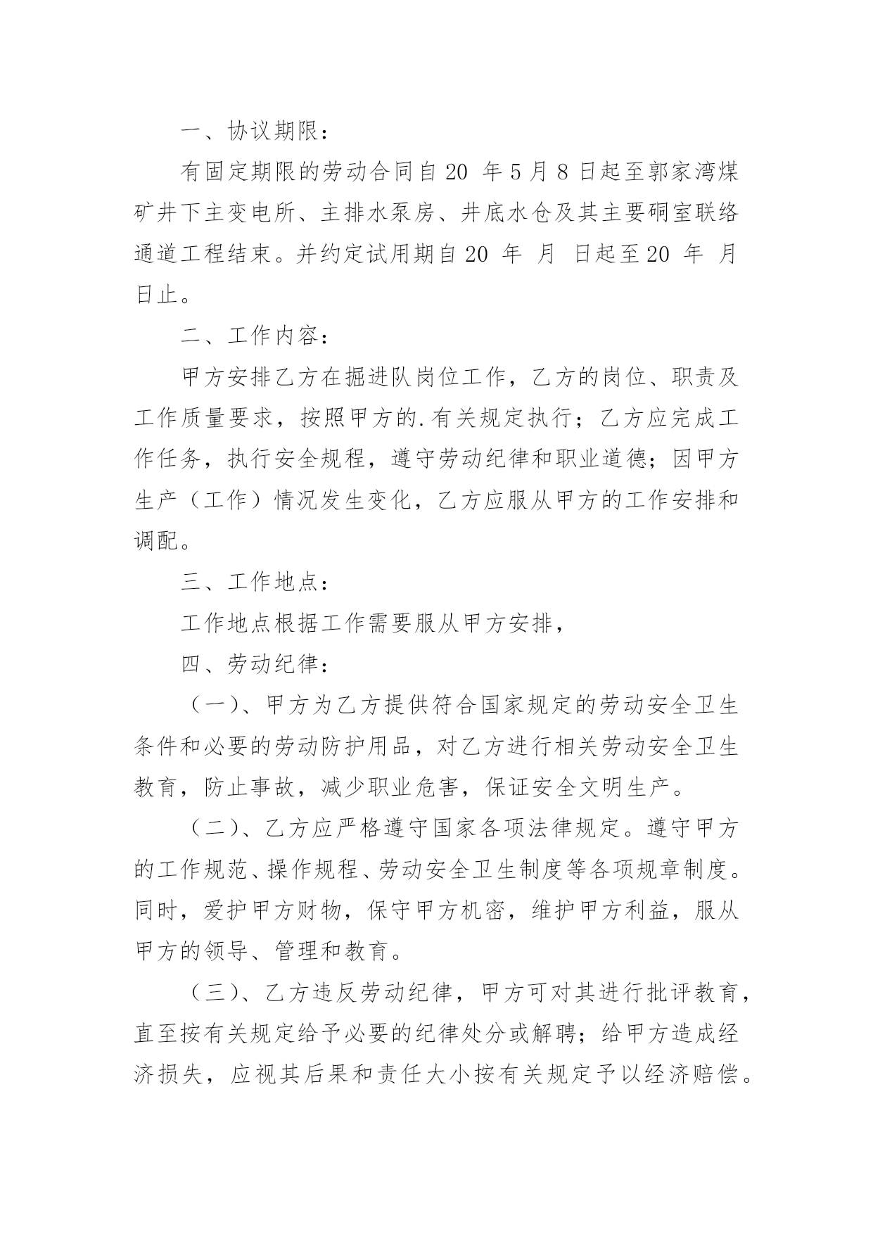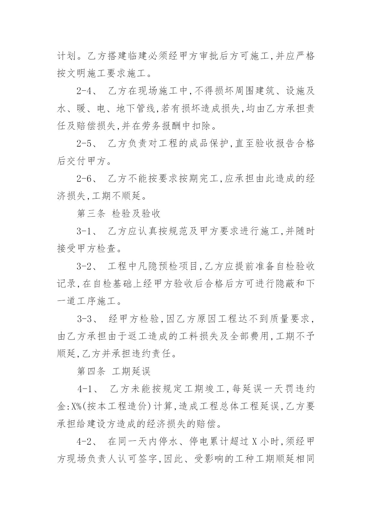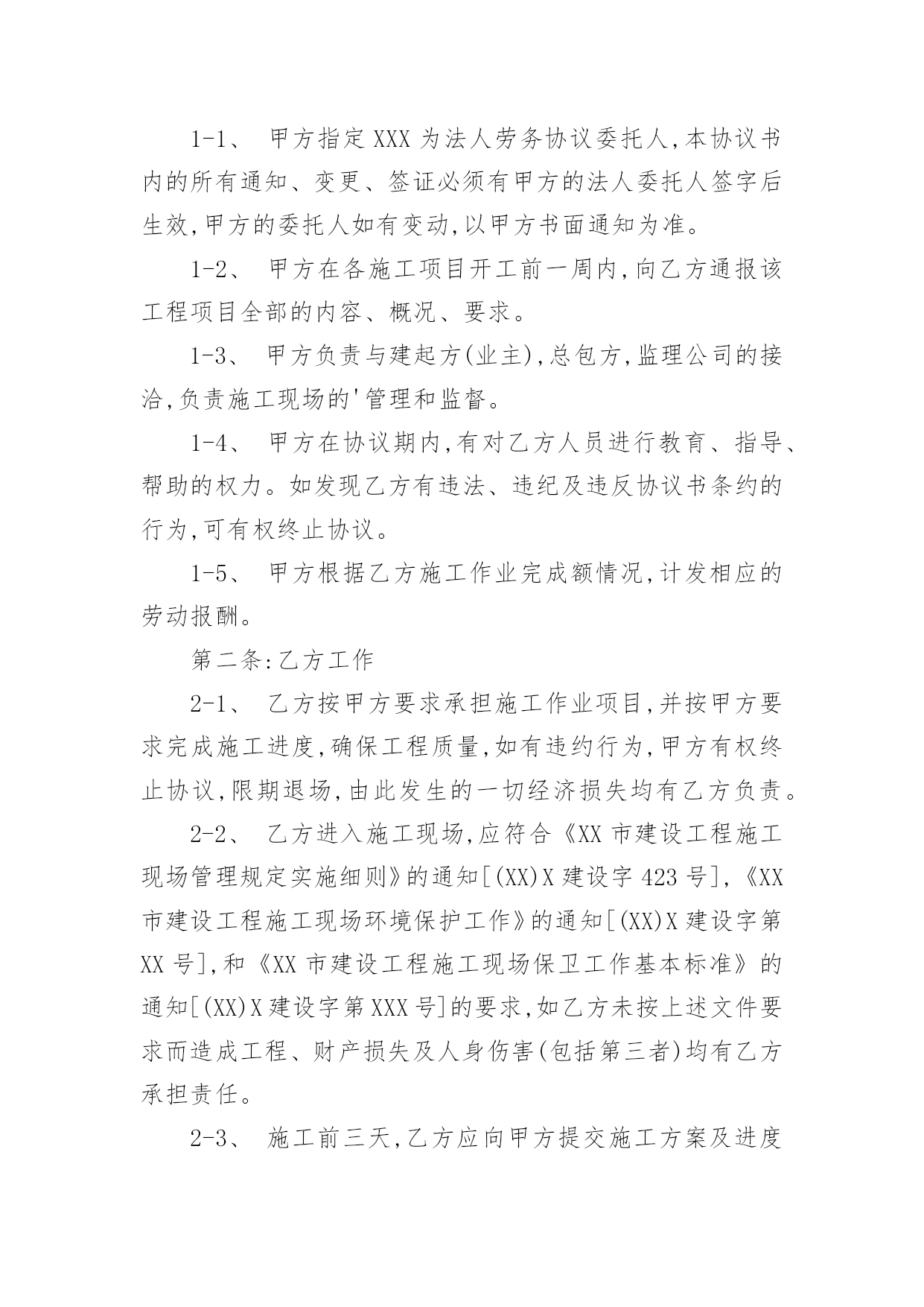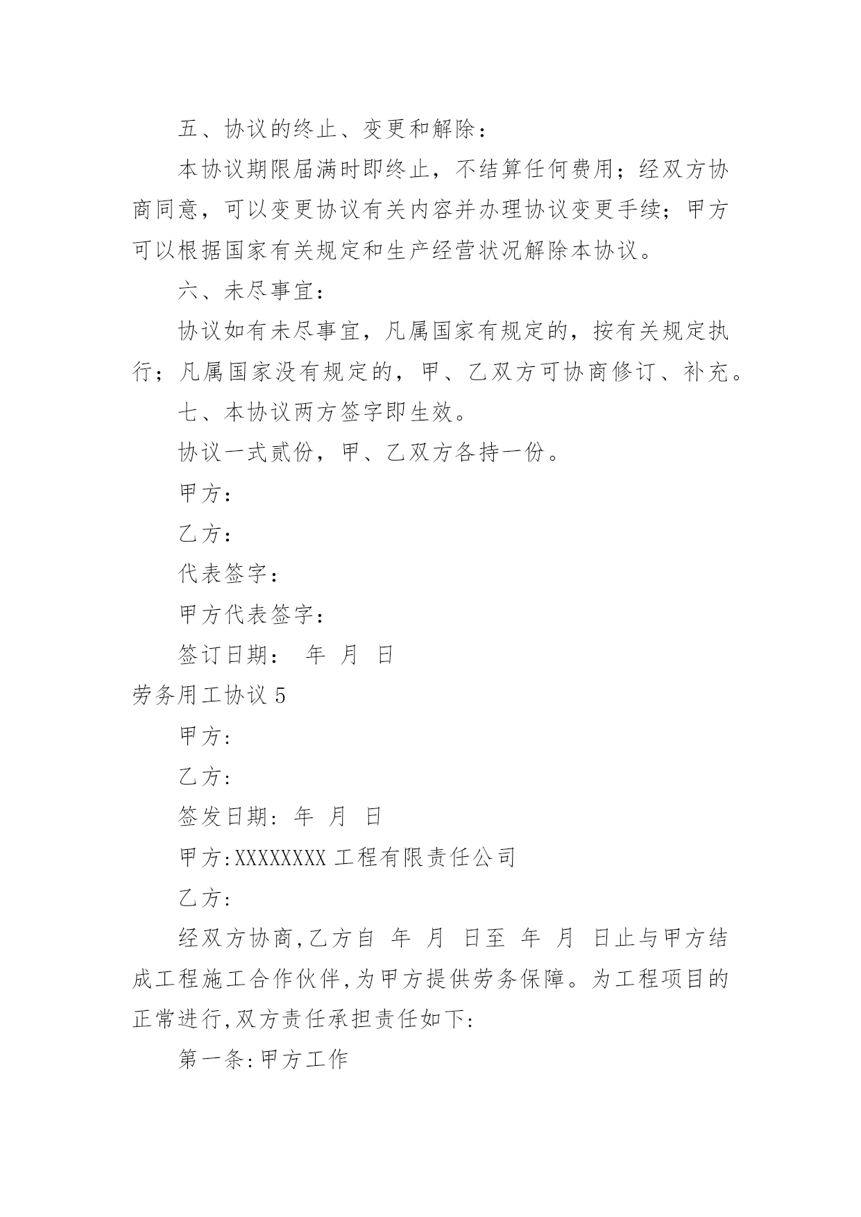 劳务用工协议劳务用工协议(合集15篇)在当下社会,协议起到的作用越来越大,协议的签订是双方或数方之间权利义务的最好规范。大家知道协议的格式吗?下面是小编精心整理的劳务用工协议,仅供参考,希望能够帮助到大家。劳务用工协议1甲方:乙方(工头):甲方代表:身份证号码:联系电话:联系电话:乙方经营承接劳务派遣,承包甲方部分技术工人的人工项目,经过甲乙双方友好协商,达成如下协议:一.协议内容甲方向乙方提供技术工人的作业场地、工具,乙方组织派遣员工负责劳务工作(乙方员工须持有有效身份证,年龄18周岁以上),乙方所派遣的员工归属乙方,不是甲方的员工。在劳务派遣中乙方承担派遣员工的所有相关法律责任事宜,包括办理(社保、保险、工伤、医疗、劳动合同等等)。甲方可以提供购买社保医疗,费用由乙方承担。二.协议有效时间自年月日至年月日止,共计个月;其他:。三.双方的权利和义务1、甲方给予乙方员工提供样品。2、甲方为乙方派遣员工提供免费食宿条件,8人一间宿舍,乙方人员务必配合服从甲方的安排。3、甲方不得随意解雇乙方员工,如乙方人员有不服从安排,不遵守甲方管理规章制度,有严重违规违法行为的',甲方有权根据厂纪厂规处罚,处罚金额乙方需现金交纳。对于屡教不改的乙方员工,甲方有权要求乙方在限定时间内辞退或调离本厂区。乙方员工如有给甲方造成损失的,乙方负全部赔偿责任。4、甲方支付本协议所商定的人员的工资费用于乙方,前提条件是甲方监督乙方按规定支付发放。5、乙方有义务做好员工的思想和稳定工作。6、乙方员工在甲方服务期间,务必服从甲方的生活、住宿、上下班作息时间等规章制度,如有违反甲方的各项管理规章制度的,甲方有权依据甲方相关管理规章制度进行处罚,在最后结算工资时将处罚单据知会乙方管理代表。7、乙方在把人员带到甲方厂所之前,需提前购买好相关保险。8、乙方人员在甲方厂所期间,发生伤亡的,甲方不承担任何责任,乙方全权承担。11、乙方有义务保证所组织员工身体健康(无精神疾病、先天性疾病或者传染性疾病)13、乙方员工工资直接支付予乙方,不直接支付给乙方员工。四.费用结算及薪资支付方式1、工程承包单价:甲方支付以计件工资_____________/件工资予乙方。2、结算工资依据计件报表记录核算。3、为保证双方的权益,甲方在乙方最后完成工程承包量,甲方以现金或者转账方式结算上月的薪资给乙方,甲方有权利监督乙方当日在工厂内发放所有员工所有工资。4、合同期满,甲方在一个星期内一次性结清所有承包费用给乙方(甲方如不续约需提前一个星期告知乙方)。五.违约责任甲乙双方应严格履行本协议规定的权利义务,出现违约,应协商处理,如协商达不成一致,由相关仲裁机构裁定或者提出法院判定。六.本协议一式两份,双方各执一份,以双方签字(盖章)生效,并具法律效力。甲方:________________乙方:________________身份证号:身份证号:日期:年月日日期:年月日劳务用工协议2甲方:xxxxx学校乙方:甲方聘请乙方同志做临时工,时间年月日。工种:具体工作:每天工作8小时,每日工资元,月工资元(按23.5天计),包括基本工资及有关福利补贴,不包括加班及部门创收分配。劳动保护用品按工种参照院工人劳保待遇发给。工伤者有医生证明经本校医生建议、报学校领导审批,一个月内工资照发,(不含完全丧失劳动能力),一个月以上一至六个月内发给l/2二资。未尽事宜,按有关劳动法规办理。事假或旷工一天扣发一天工资,连续15天不出勤,视自动离岗,解除合约。其他具体规定按“临工管理规定”执行。双方签订协议后,乙方应付押金100元(可分三个月从工资中扣)。乙方应遵纪守法,服从领导,积极工作,合同期内一般不能解除合约,如有特殊情况,须提前7天通知甲方,经双方协商同意,可以提前解除合约,乙方应退回劳动保护用品及其他学校的物品,办理离校手续,领回押金。乙方在合同期内,如有违法违约行为,甲方可提前解除合约,押金不退。甲方如因实际情况需解除合约应提前7天通知乙方,退回押金给乙方。甲方如有违约行为,则双倍返还押金给乙方。其他未尽事宜,双方协商解决。乙方签名:聘用部门盖章:学校或人事处盖章:年月日注:本协议书一式三份,乙方、聘用部门、人事处各一份。劳务用工协议3甲方:________乙方:________乙方于________年____月____日在甲方处提供劳务时发生人身伤害事故,致,经治疗后复查,现已康复。为妥善解决乙方受伤事宜,甲、乙方现本着平等自愿、互谅互让的原则,经友好协商达成如下协议:一、自乙方受伤之日起截止本协议签订之日所实际发生的和其它应当由甲方支付的医疗费、手术费等各项费用共计45000元(人民币大写:肆万伍仟圆整),在本协议签订之前已由甲方全部付清,协议签订之后乙方不得再以任何理由向甲方或者丙方主张前述期间发生的