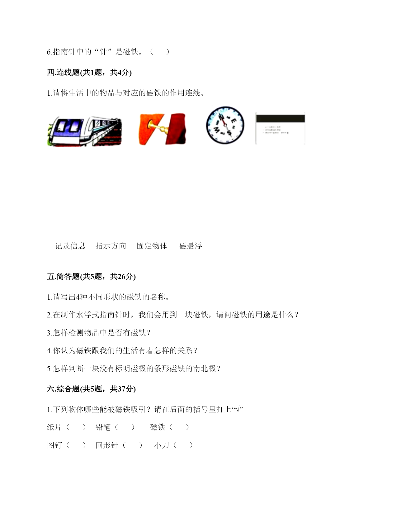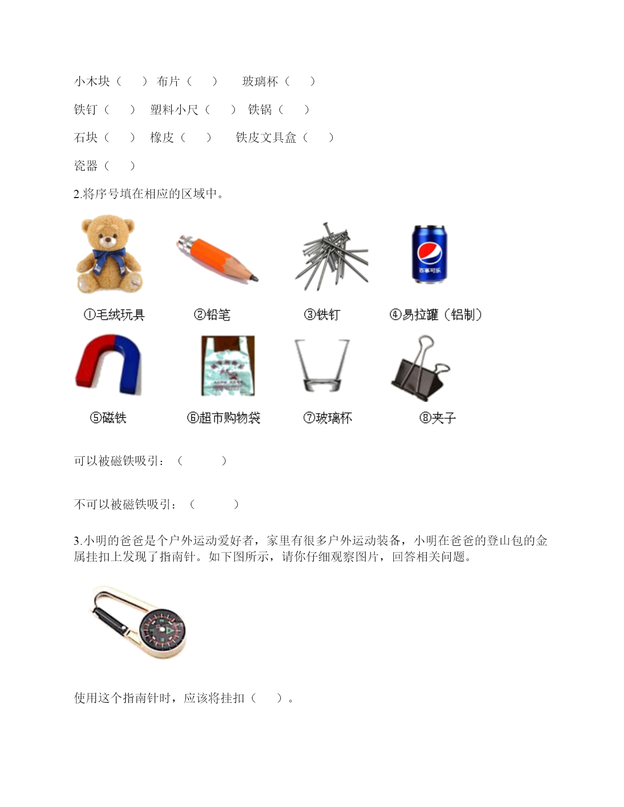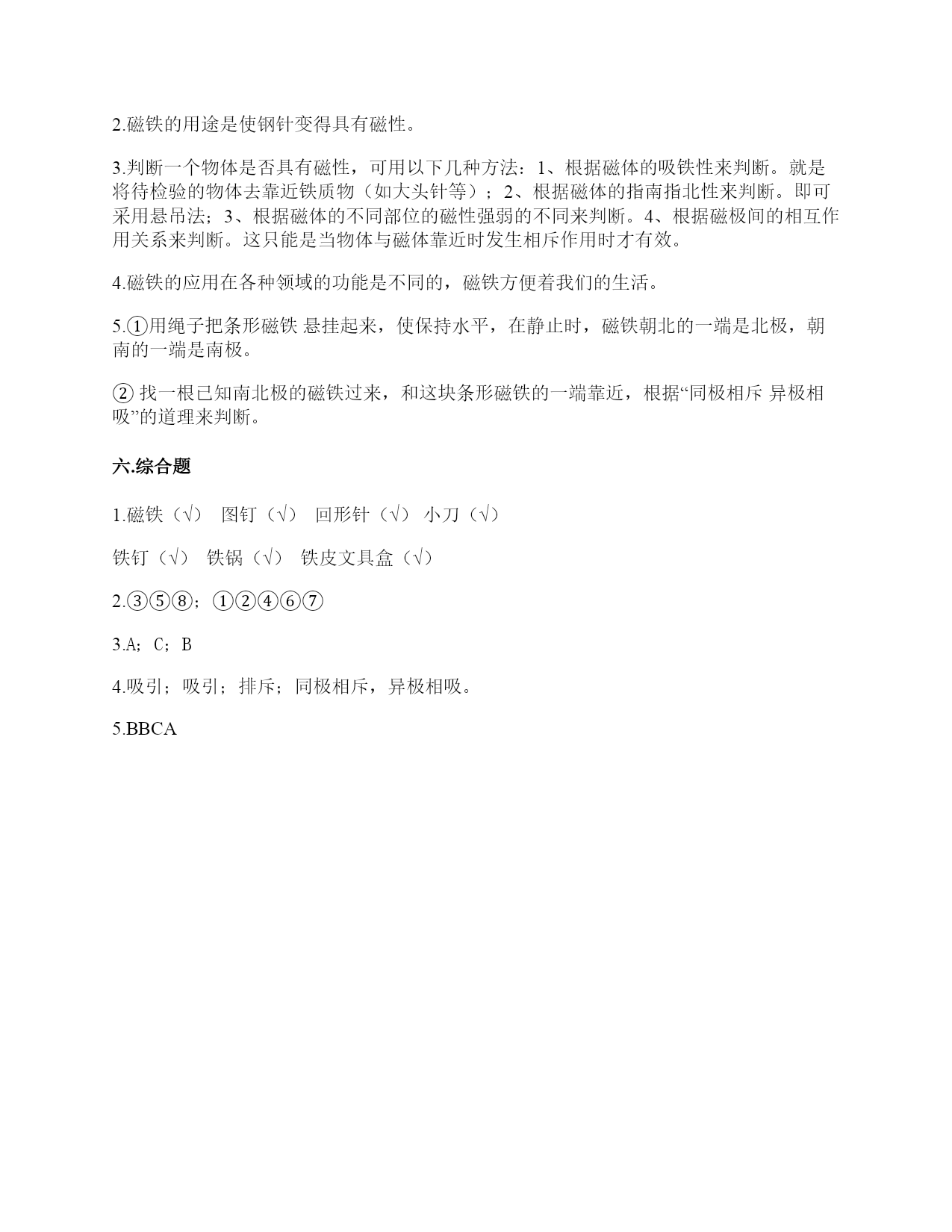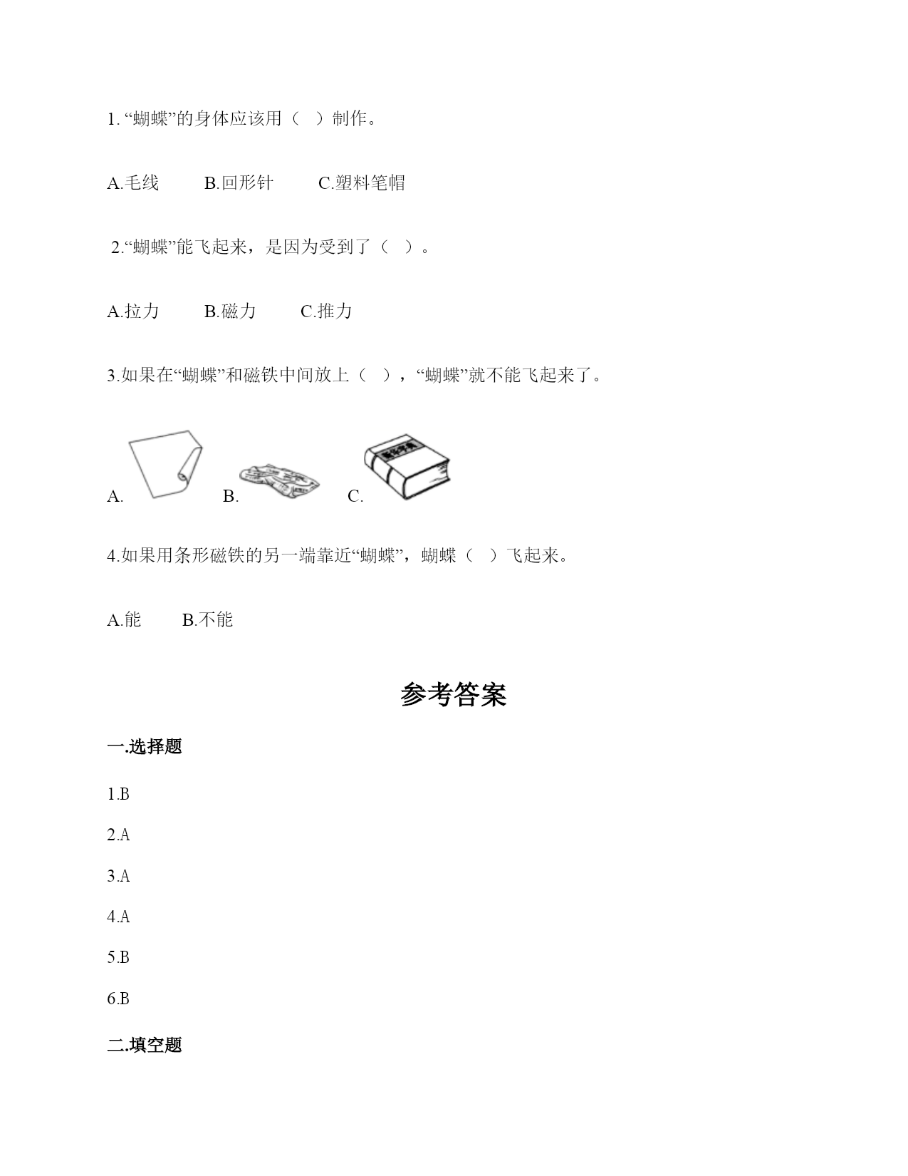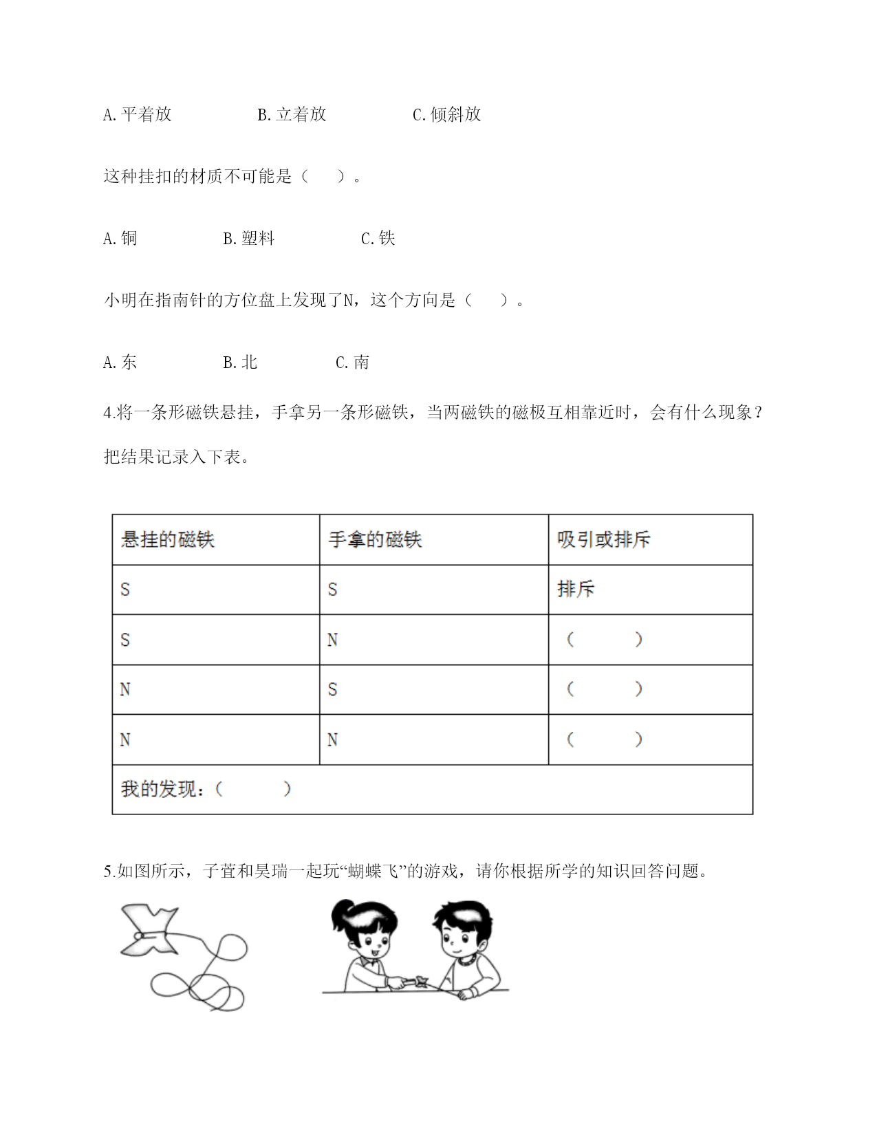 小学科学《磁铁》练习题一.选择题(共6题,共12分)1.两根用白纸包裹的磁铁按下图位置摆放,它们之间的作用是相互排斥。已知A端的磁极是N极,那么D端的磁极是()。A.南极B.北极C.东极2.如图所示,将小钢珠放置在蹄形磁铁上,最终小钢珠会滚到()处。A.AB.BC.C3.雨轩用环形磁铁指示方向时,按实际方向把纸放好后,环形磁铁的状态应该是()A.B.C.4.蹄形磁铁磁力最强的部位是()。A.两端B.中间C.各个部位都一样5.我们使用()来测试蹄形磁铁和环形磁铁的指向性。A.支架法B.悬挂法C.A、B均可6.在做“用磁铁的不同部位接触回形针”的实验时回形针一定要()。A.平覆在桌面上B.排列成一条直线C.怎么排列都可以二.填空题(共6题,共20分)1.写出三种生活中含有磁铁的物品:()、()、()。2.辨认铁制品,()比用眼看更可靠。3.磁铁()做的;磁铁有(),因为它们有不同的用途。4.磁铁有同极(),异极()的特性。5.我们可以把普通的钢针用磁铁的磁极位置沿()方向摩擦,使它变成一根磁针。6.磁铁能隔着一些物体不太厚的物体也能吸()。三.判断题(共6题,共12分)1.天然磁铁又叫磁石。()2.磁悬浮列车利用了磁极间的相互作用。()3.在判断条形磁铁能否指示方向的实验中,我们只做一次实验就可以了。()4.耳机中的磁铁利用了同极相斥的原理。()5.磁悬浮列车和磁力扣都是利用磁极的相互作用所做的发明。()6.指南针中的“针”是磁铁。()四.连线题(共1题,共4分)1.请将生活中的物品与对应的磁铁的作用连线。记录信息指示方向固定物体磁悬浮五.简答题(共5题,共26分)1.请写出4种不同形状的磁铁的名称。2.在制作水浮式指南针时,我们会用到一块磁铁,请问磁铁的用途是什么?3.怎样检测物品中是否有磁铁?4.你认为磁铁跟我们的生活有着怎样的关系?5.怎样判断一块没有标明磁极的条形磁铁的南北极?六.综合题(共5题,共37分)1.下列物体哪些能被磁铁吸引?请在后面的括号里打上“√”纸片()铅笔()磁铁()图钉()回形针()小刀()小木块()布片()玻璃杯()铁钉()塑料小尺()铁锅()石块()橡皮()铁皮文具盒()瓷器()2.将序号填在相应的区域中。可以被磁铁吸引:()不可以被磁铁吸引:()3.小明的爸爸是个户外运动爱好者,家里有很多户外运动装备,小明在爸爸的登山包的金属挂扣上发现了指南针。如下图所示,请你仔细观察图片,回答相关问题。使用这个指南针时,应该将挂扣()。A.平着放B.立着放C.倾斜放这种挂扣的材质不可能是()。A.铜B.塑料C.铁小明在指南针的方位盘上发现了N,这个方向是()。A.东B.北C.南4.将一条形磁铁悬挂,手拿另一条形磁铁,当两磁铁的磁极互相靠近时,会有什么现象?把结果记录入下表。5.如图所示,子萓和昊瑞一起玩“蝴蝶飞”的游戏,请你根据所学的知识回答问题。1.“蝴蝶”的身体应该用()制作。A.毛线B.回形针C.塑料笔帽2.“蝴蝶”能飞起来,是因为受到了()。A.拉力B.磁力C.推力3.如果在“蝴蝶”和磁铁中间放上(),“蝴蝶”就不能飞起来了。A.B.C.4.如果用条形磁铁的另一端靠近“蝴蝶”,蝴蝶()飞起来。A.能B.不能参考答案一.选择题1.B2.A3.A4.A5.B6.B二.填空题1.冰箱门;磁力扣;门吸2.使用磁铁检测3.不一定是铁;各种形状4.相斥;相吸5.一个6.铁三.判断题1.√2.√3.×4.×5.√6.√四.连线题1.如下:五.简答题1.常见的不同形状的磁铁:条形磁铁、蹄形磁铁、环形磁铁、方形磁铁、圆形磁铁等。2.磁铁的用途是使钢针变得具有磁性。3.判断一个物体是否具有磁性,可用以下几种方法:1、根据磁体的吸铁性来判断。就是将待检验的物体去靠近铁质物(如大头针等);2、根据磁体的指南指北性来判断。即可采用悬吊法;3、根据磁体的不同部位的磁性强弱的不同来判断。4、根据磁极间的相互作用关系来判断。这只能是当物体与磁体靠近时发生相斥作用时才有效。4.磁铁的应用在各种领域的功能是不同的,磁铁方便着我们的生活。5.①用绳子把条形磁铁悬挂起来,使保持水平,在静止时,磁铁朝北的一端是北极,朝南的一端是南极。②找一根已知南北极的磁铁过来,和这块条形磁铁的一端靠近,根据“同极相斥异极相吸”的道理来判断。六.综合题1.磁铁(√)图钉(√)回形针(√)小刀(√)铁钉(√)铁锅(√)铁皮文具盒(√)2.③⑤⑧;①②④⑥⑦3.A;C;B4.吸引;吸引;排斥;同极相斥,异极相吸。5.BBCA