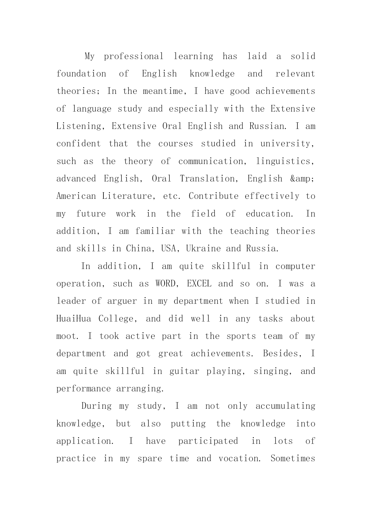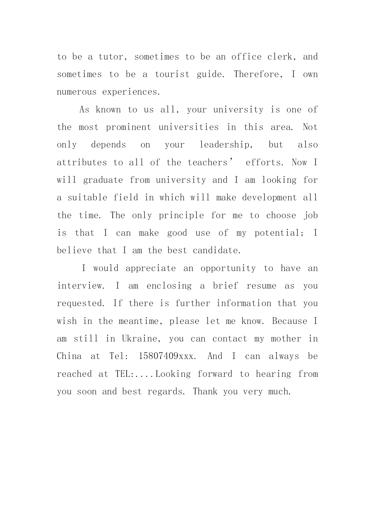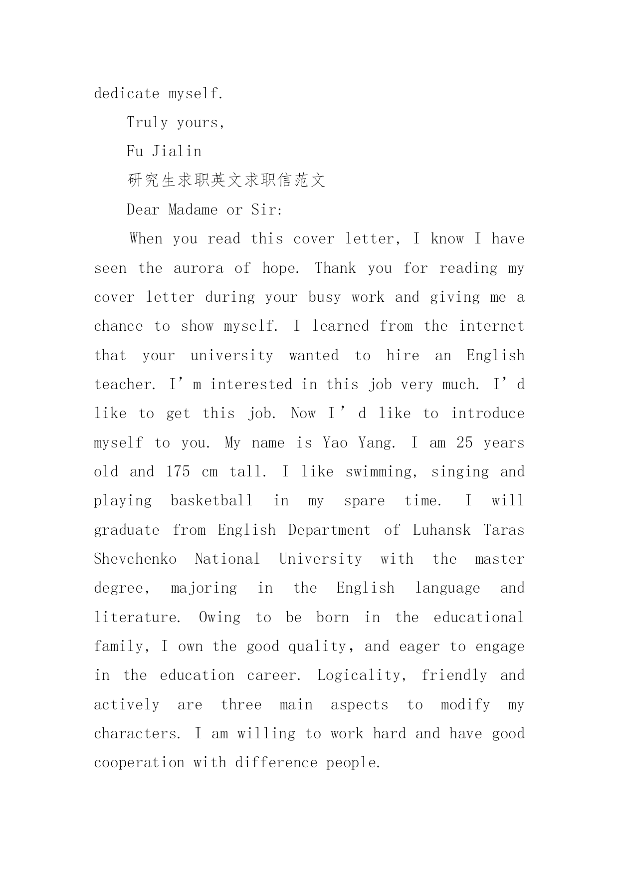 研究生英文个人求职信研究生应聘英文求职信DearMr.Director,IamcurrentlyworkingonMasterDegreeinInternationalCommerciallawatFuDanUniversity.MysupervisorMr.LiuMingyu,awell-knowprofessoroflaw,tellsmethatSFSCspecializesinrecommendingqualifiedpersonneltomuti-nationalcompaniesandsuggeststhatIcontactyouforrecommendation.DuringthetwoyearsofstudiesatFuDanUniversity,Ihavenotonlyacquiredalotofknowledgeofinternationalcommerciallaw,butlearnedtwoforeignlanguagesaswell-EnglishandJapanese.Moreover,IhavepublishedtwopapersintheuniversityjournalonproblemsthatmayariseafterChina‘sentrytoWTO.Andtheyhavebeenfavorablyaccepted.Iamenclosingaresume,copiesofmypublishedpapers,andProfessorLiu‘sletterofrecommendation.Isincerelyhopeyouwilintroducemetoafamousmulti-nationalcompany,towhichIwilldedicatemyself.Trulyyours,FuJialin研究生求职英文求职信范文DearMadameorSir:Whenyoureadthiscoverletter,IknowIhaveseentheauroraofhope.Thankyouforreadingmycoverletterduringyourbusyworkandgivingmeachancetoshowmyself.IlearnedfromtheinternetthatyouruniversitywantedtohireanEnglishteacher.I’minterestedinthisjobverymuch.I’dliketogetthisjob.NowI’dliketointroducemyselftoyou.MynameisYaoYang.Iam25yearsoldand175cmtall.Ilikeswimming,singingandplayingbasketballinmysparetime.IwillgraduatefromEnglishDepartmentofLuhanskTarasShevchenkoNationalUniversitywiththemasterdegree,majoringintheEnglishlanguageandliterature.Owingtobebornintheeducationalfamily,Iownthegoodquality,andeagertoengageintheeducationcareer.Logicality,friendlyandactivelyarethreemainaspectstomodifymycharacters.Iamwillingtoworkhardandhavegoodcooperationwithdifferencepeople.MyprofessionallearninghaslaidasolidfoundationofEnglishknowledgeandrelevanttheories;Inthemeantime,IhavegoodachievementsoflanguagestudyandespeciallywiththeExtensiveListening,ExtensiveOralEnglishandRussian.Iamconfidentthatthecoursesstudiedinuniversity,suchasthetheoryofcommunication,linguistics,advancedEnglish,OralTranslation,English&AmericanLiterature,etc.Contributeeffectivelytomyfutureworkinthefieldofeducation.Inaddition,Iamfamiliarw