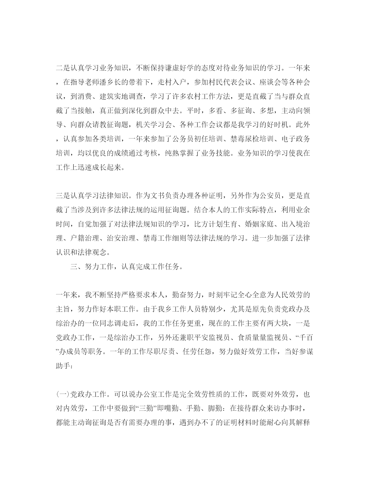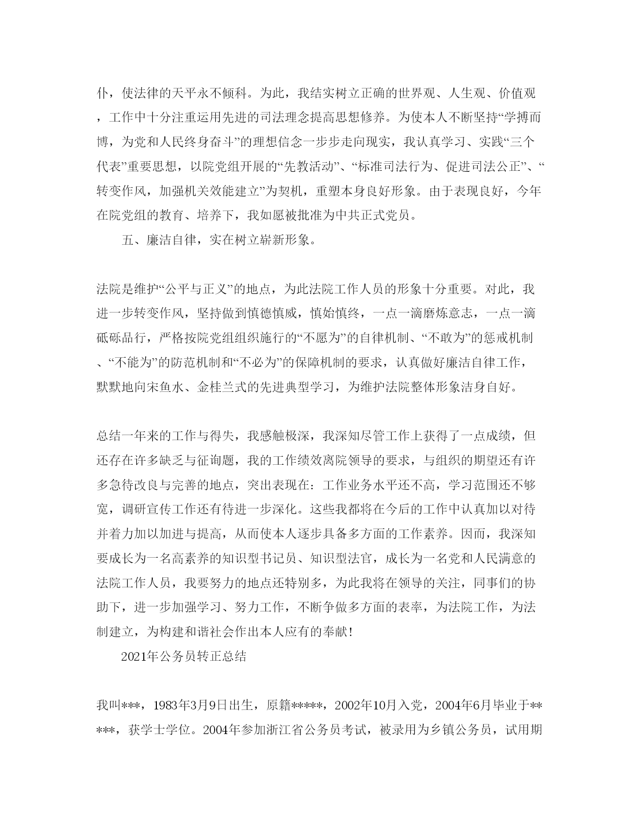 2021年公务员转正参考总结2021年公务员转正总结一、严于律已,自觉加强党性锻炼,党性修养和政治思想觉悟进一步提高一年来,我不断坚持运用马克思列宁主义的立场、观点和方法论,运用辩证唯物主义与历史唯物主义去分析和观察事物,明辨是非,坚持真理,坚持正确的世界观、人生观、价值观,用正确的世界观、人生观、价值观指导本人的学习、工作和生活实践,在思想上积极构筑抵御资产阶级民主和自由化、拜金主义、自由主义等一切腐朽思想侵蚀的稳固防线。热爱祖国,热爱中国共产党,热爱社会主义,拥护中国共产党的领导,拥护改革开放,坚信社会主义最终必定战胜资本主义,对社会主义充满必胜的决心。认真贯彻执行党的道路、方针、政策,为加快社会主义建立事业认真做好本职工作。工作积极主动,勤奋努力,不畏困难,尽职尽责,在平凡的工作岗位上作出力所能及的奉献。二、强化理论和业务学习,不断提高本身综合素养我注重加强理论和业务知识学习,在工作中,坚持一边工作一边学习,不断提高本身综合素养水平。认真学习工作业务知识,重点学习公文写作及公文处理和电脑知识。在学习方法上做到在重点中找重点,抓住重点,并结合本人在公文写作及公文处理、电脑知识方面存在哪些缺乏之处,有针对性地进展学习,不断提高本人的办公室业务工作才能。三是认真学习法律知识,结合本人工作实际特点,利用闲余时间,选择性地开展学习,学习了......等法海律法规,通过学习,进一步加强法制认识和法制观念。三、努力工作,按时完成工作任务回忆一年来的工作,我在思想上、学习上、工作上获得了新的进步,但我也认识到本人的缺乏之处,理论知识水平还比较低,现代办公技能还不强。今后,我一定认真克服缺点,发扬成绩,自觉把本人置于党组织和群众的监视之下,刻苦学习、勤奋工作,做一名合格的人民公务员,为全面建立小康社会目的作出本人的奉献!2021年公务员转正总结自XX年12月被录用为法院书记员以来,在县法院的正确领导和庭室工作人员的关心、协助下,我严格按组织要求,认真学习,扎实工作,勤于进取,本人在学习、工作上获得了一定成绩、我的司法为民思想也得到了特别大提高。现将有关情况汇报如下:一、勤于学习,努力加强先进性本领。读书学习是我的一大爱好,自去年以第一名优势被组织部门考选进国家机关工作人员队伍以来,我更加注重各方面知识的积累,学习中不仅注重学习政治理论知识,还特别学习法律知识,不断充实本身理论素养,提高业务水平。一年来,我阅读了许多法学著作,通过了法律专业自考本科考试。为使本人各方面知识平衡提高,我还注重学习文秘、新闻写作、计算机、英语、市场经济等方面知识的学习,通过学习不断提高本身素养,不断加强先进性本领。二、扎实工作,践行“司法为民”要求。进入法院系统是我的一次人生角色重要定位,我信守“以法为准,以人为本,以德为先”的工作理念。工作中,不断提高业务技能,实在履行工作职责,努力提高为人民效劳的水平和质量。考入法院后,为使本人从政府文书岗位迅速向法院书记员岗位转换好,我在谦虚学习的同时,严格按院党组的要求,在博望法庭刻苦锻炼,认真细致、高质高效地做好书记员各项工作,从而使本人及时适应了岗位之需。法院书记员是一项专业性工作特别强的法律工作岗位,实践中我认真研读书记员必备书籍,在立案受理、法律文书送达、庭前预备、参与案前协调、庭审记录等日常工作。三、发挥特长,做好宣传调研工作。由于我爱好文学,爱好写作,进入法院后利用法院题材广泛、社会关注度高,网络媒体报道量大的特点,在县院领导、院研究室、法庭庭长的高度注重下,我充分发挥我的写作特长,勤于笔耕,擅长投稿。在宣传工作中,我主要做了以下一些工作:一是勤抓传统新闻载体宣传工作。充分发挥《马鞍山日报》、《皖江晚报》、《马鞍山信息》等地点报刊优势,努力扩大宣传效果,力争上大稿、上好稿;二是重抓以《人民法院报》、《安徽法制报》、《安徽日报农村版》等代表的重要报刊的投搞工作。今年以来我先后在《人民法院报》上发表了题为《当涂法院依法审理涉农案件促消费》、《当涂法院行政审讯阳光操作》、《打造双能法官》等多篇稿件,实现了我庭在国家级新闻媒体上发表稿件零的打破;三是主抓网络新兴媒体宣传工作。明确专人定期发稿,先后在《中国法院网》、《安徽法院网》上发表了多篇稿件,填补了我庭从未在网络上发表稿件的空白;四是积极在《安徽先锋网》、《马鞍山先锋网》及其他网络媒体上发表文章。一年来,我全部完成县院交给的调研任务,并在各类新闻媒体、信息刊物后发表稿件、通讯110篇,并在中国法院网法律博客上发表了1篇题为《农村损害赔偿案件的特点、成因与对策》的调研论文,发表了1篇题为《村小学课间摔伤致死,责任如何认定》的理论研讨文章。今年我还被聘为省委办公厅信息处特约信息员,同时还被推荐参评XX年度马鞍山日报优秀通讯员。四、树