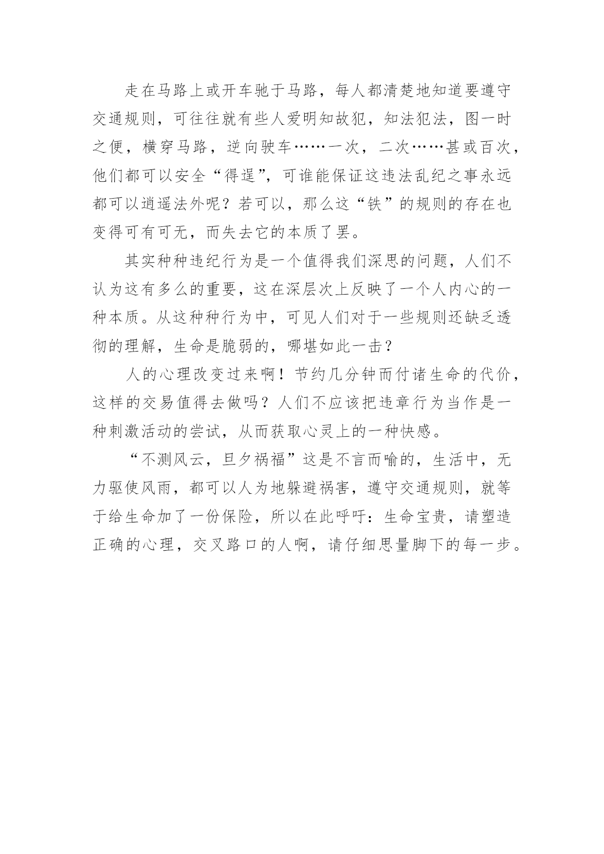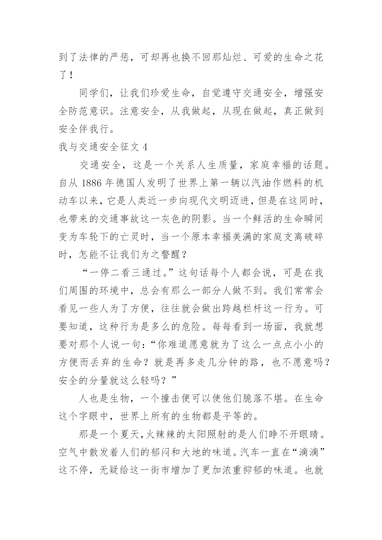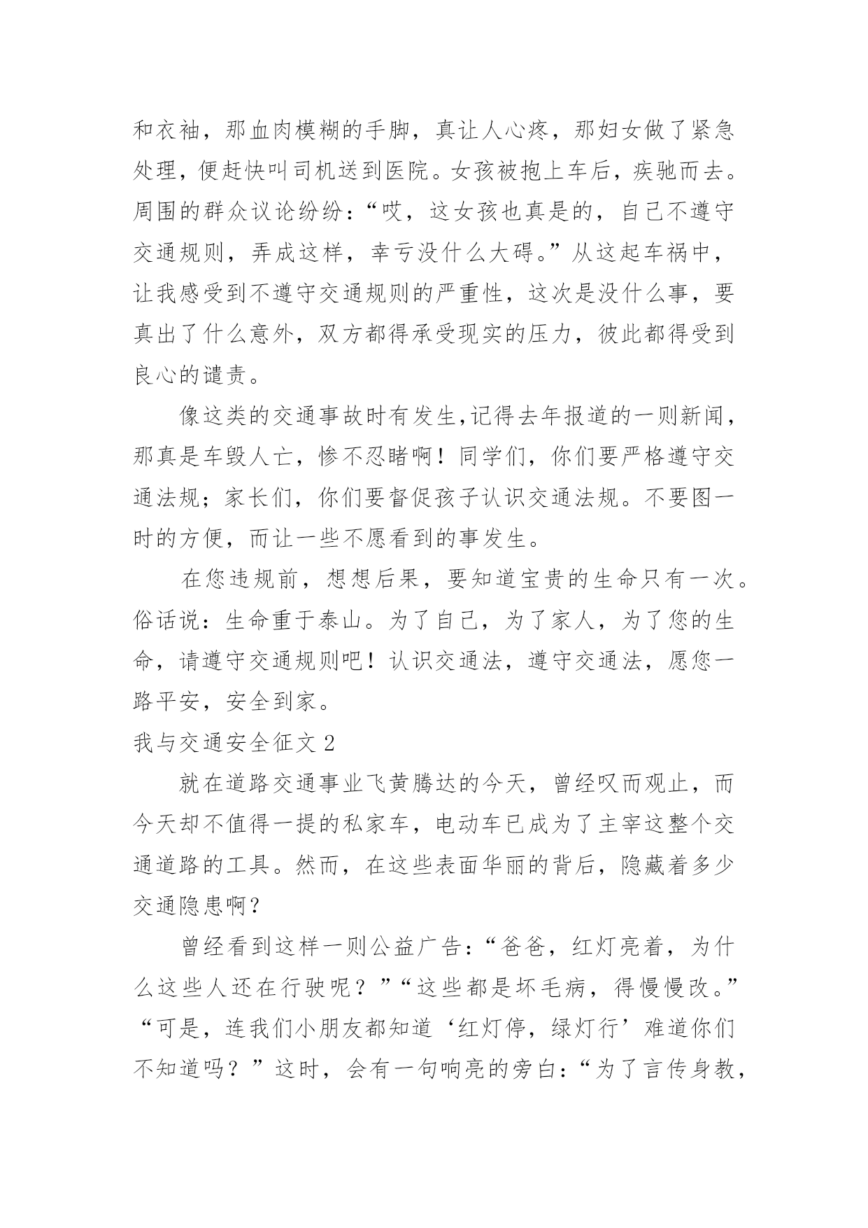 我与交通安全征文我与交通安全征文在现实生活或工作学习中,许多人都写过征文吧,通过征文可以把我们那些零零散散的思想,聚集在一块。那么问题来了,到底应如何写一篇优秀的征文呢?以下是小编精心整理的我与交通安全征文,仅供参考,希望能够帮助到大家。我与交通安全征文1生命是惟一的,是宝贵的,世界因为有了生命而变得精彩。您的生命,您珍惜吗?要想生命得到保障,请您遵守交通规则。在这经济繁荣的社会中,街上的车辆逐渐增多,在你面前疾驰而过,也许就在这时,因为您的疏忽或违规,会给交通带来不便,也会让你的心灵蒙上一层阴影。作为父母,总会在孩子外出时,说一句:“注意安全。”在过马路时,会说:“看好红绿灯。”也就在红与绿一会儿的转变中,车祸便悄悄降临了。这天,我和妈妈在逛街,猛得听见身后一片惊叫。我急忙向后看去,一辆卡车已经停在一个摔倒在地的小女孩面前。同时,一群人向那边涌去。我和妈妈也挤了过去。那女孩脸色惨白,胸脯急促地起伏着,过了好一会儿,才“哇”地一声哭了起来。年轻的司机慌了,旁边的一位中年妇女俯下身,撩起小女孩的`裤管和衣袖,那血肉模糊的手脚,真让人心疼,那妇女做了紧急处理,便赶快叫司机送到医院。女孩被抱上车后,疾驰而去。周围的群众议论纷纷:“哎,这女孩也真是的,自己不遵守交通规则,弄成这样,幸亏没什么大碍。”从这起车祸中,让我感受到不遵守交通规则的严重性,这次是没什么事,要真出了什么意外,双方都得承受现实的压力,彼此都得受到良心的谴责。像这类的交通事故时有发生,记得去年报道的一则新闻,那真是车毁人亡,惨不忍睹啊!同学们,你们要严格遵守交通法规;家长们,你们要督促孩子认识交通法规。不要图一时的方便,而让一些不愿看到的事发生。在您违规前,想想后果,要知道宝贵的生命只有一次。俗话说:生命重于泰山。为了自己,为了家人,为了您的生命,请遵守交通规则吧!认识交通法,遵守交通法,愿您一路平安,安全到家。我与交通安全征文2就在道路交通事业飞黄腾达的今天,曾经叹而观止,而今天却不值得一提的私家车,电动车已成为了主宰这整个交通道路的工具。然而,在这些表面华丽的背后,隐藏着多少交通隐患啊?曾经看到这样一则公益广告:“爸爸,红灯亮着,为什么这些人还在行驶呢?”“这些都是坏毛病,得慢慢改。”“可是,连我们小朋友都知道‘红灯停,绿灯行’难道你们不知道吗?”这时,会有一句响亮的旁白:“为了言传身教,请注意交通安全!”这则广告也许说不上经典,谈不上特殊,可就是这么普通的一句话,有几个人放在心上?又有几个人注意到交通安全的重要呢?赶时间,往往是出现事故的主要原因之一。有人为了争时间,拼命地向前冲,当黄灯在眨眼时,人已在马路中央了,真是进退两难!事故就这样无情的发生了。所谓“能等三分,不急一秒”也有人缺乏耐心或因为急事,看周围没有人就放心地前行,有谁能料到事故会不会发生呢?人的生命只有一次,有什么比生命还重要的呢?何必要拿生命做赌注呢?还有酒后驾车,不系安全带也是发生事故的原因。经常和马路,交通打交道的'朋友们,注意脚下,珍惜好自己的生命!路上匆匆,安全是最重要的,要把握生命的美好,安全驾驶。我与交通安全征文3上周星期五第一、二节课时,我们全校师生到操场参加了“怎样确保安全”的安全教育大会。当我听了陈洁老师的讲话,我的眼泪忍不住“滴答、滴答、滴答”地掉了下来。她讲话的主要内容是这样的,石门一中一位高中的大姐姐下晚自习后,她借了朋友的自行车回家。当她快到家时,不幸的'事发生了,一辆的士车撞倒了大姐姐的自行车,一阵凄惨的叫声划破夜空的宁静。当交警赶到现场时,太晚了,已经太晚了,大姐姐走了。她走得那么凄凉,那么悲惨。如果她能住宿,如果司机能够不闯红灯,大姐姐就不会走得这么早。可是,有再多的如果又有什么用呢?虽然司机已经受到了法律的严惩,可却再也换不回那灿烂、可爱的生命之花了!同学们,让我们珍爱生命,自觉遵守交通安全,增强安全防范意识。注意安全,从我做起,从现在做起,真正做到安全伴我行。我与交通安全征文4交通安全,这是一个关系人生质量,家庭幸福的话题。自从1886年德国人发明了世界上第一辆以汽油作燃料的机动车以来,它是人类近一步向现代文明迈进,但是在这同时,也带来的交通事故这一灰色的阴影。当一个鲜活的生命瞬间变为车轮下的亡灵时,当一个原本幸福美满的家庭支离破碎时,怎能不让我们为之警醒?“一停二看三通过。”这句话每个人都会说,可是在我们周围的环境中,总会有那么一部分人做不到。我们常常会看见一些人为了方便,往往就会做出跨越栏杆这一行为。可要知道,这种行为是多么的危险。每每看到一场面,我就想要对那个人说一句:“你难道愿意就为了这么一点点小小的方便而丢弃的生命?就是再多走几分钟的路,也不愿意吗?安全的分量就这么轻吗?”人也是生物,一个撞击便可以使他们脆落不堪。在生命这个字眼中,世界上所有的生