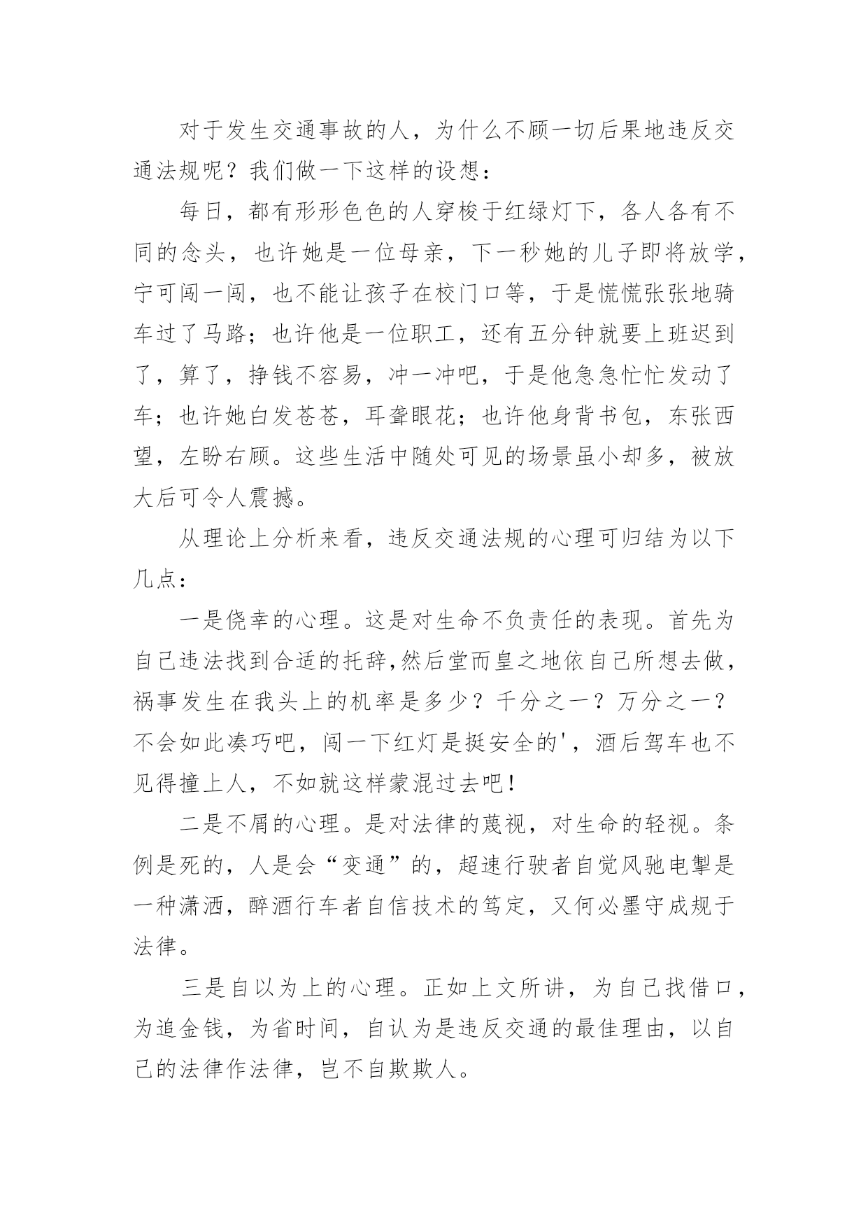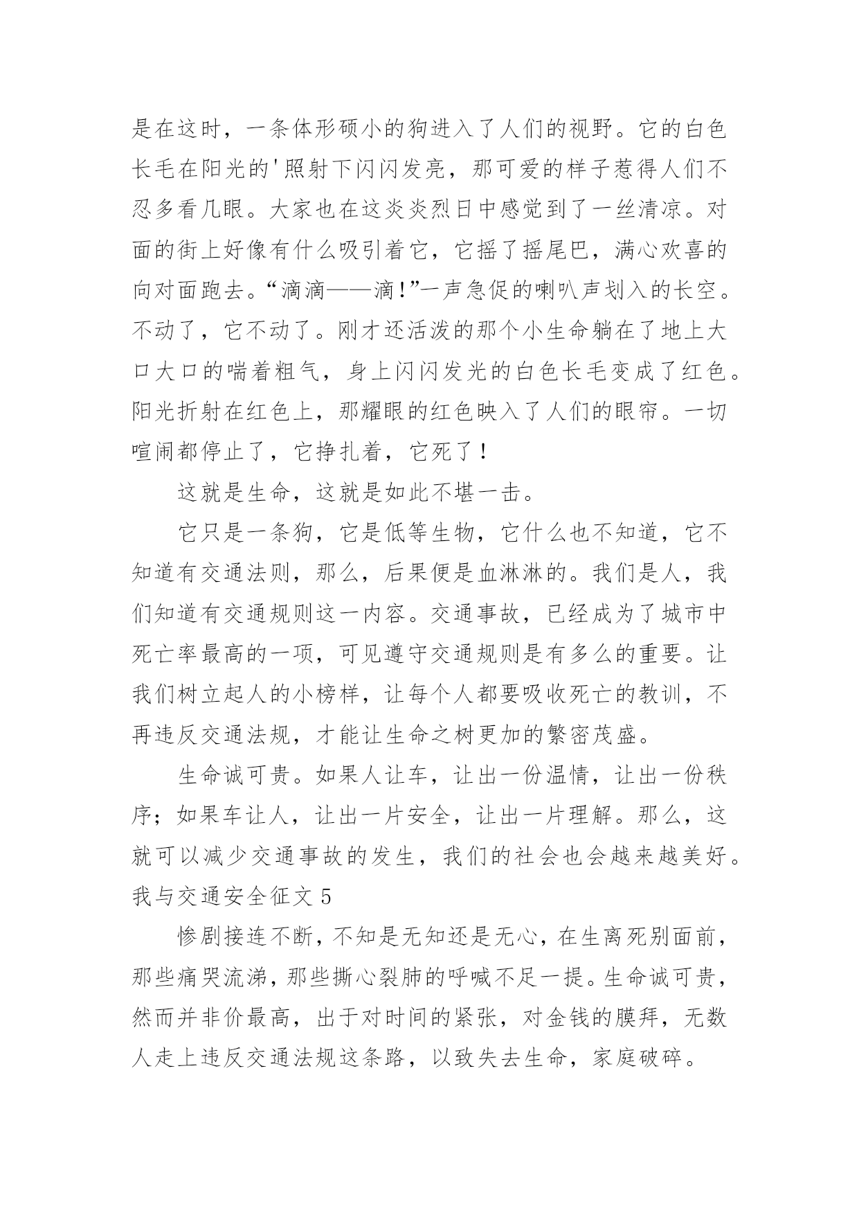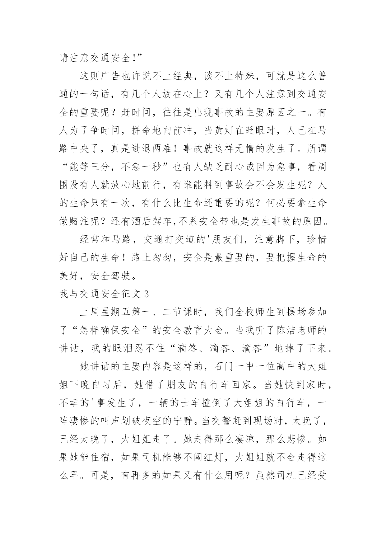 我与交通安全征文我与交通安全征文在现实生活或工作学习中,许多人都写过征文吧,通过征文可以把我们那些零零散散的思想,聚集在一块。那么问题来了,到底应如何写一篇优秀的征文呢?以下是小编精心整理的我与交通安全征文,仅供参考,希望能够帮助到大家。我与交通安全征文1生命是惟一的,是宝贵的,世界因为有了生命而变得精彩。您的生命,您珍惜吗?要想生命得到保障,请您遵守交通规则。在这经济繁荣的社会中,街上的车辆逐渐增多,在你面前疾驰而过,也许就在这时,因为您的疏忽或违规,会给交通带来不便,也会让你的心灵蒙上一层阴影。作为父母,总会在孩子外出时,说一句:“注意安全。”在过马路时,会说:“看好红绿灯。”也就在红与绿一会儿的转变中,车祸便悄悄降临了。这天,我和妈妈在逛街,猛得听见身后一片惊叫。我急忙向后看去,一辆卡车已经停在一个摔倒在地的小女孩面前。同时,一群人向那边涌去。我和妈妈也挤了过去。那女孩脸色惨白,胸脯急促地起伏着,过了好一会儿,才“哇”地一声哭了起来。年轻的司机慌了,旁边的一位中年妇女俯下身,撩起小女孩的`裤管和衣袖,那血肉模糊的手脚,真让人心疼,那妇女做了紧急处理,便赶快叫司机送到医院。女孩被抱上车后,疾驰而去。周围的群众议论纷纷:“哎,这女孩也真是的,自己不遵守交通规则,弄成这样,幸亏没什么大碍。”从这起车祸中,让我感受到不遵守交通规则的严重性,这次是没什么事,要真出了什么意外,双方都得承受现实的压力,彼此都得受到良心的谴责。像这类的交通事故时有发生,记得去年报道的一则新闻,那真是车毁人亡,惨不忍睹啊!同学们,你们要严格遵守交通法规;家长们,你们要督促孩子认识交通法规。不要图一时的方便,而让一些不愿看到的事发生。在您违规前,想想后果,要知道宝贵的生命只有一次。俗话说:生命重于泰山。为了自己,为了家人,为了您的生命,请遵守交通规则吧!认识交通法,遵守交通法,愿您一路平安,安全到家。我与交通安全征文2就在道路交通事业飞黄腾达的今天,曾经叹而观止,而今天却不值得一提的私家车,电动车已成为了主宰这整个交通道路的工具。然而,在这些表面华丽的背后,隐藏着多少交通隐患啊?曾经看到这样一则公益广告:“爸爸,红灯亮着,为什么这些人还在行驶呢?”“这些都是坏毛病,得慢慢改。”“可是,连我们小朋友都知道‘红灯停,绿灯行’难道你们不知道吗?”这时,会有一句响亮的旁白:“为了言传身教,请注意交通安全!”这则广告也许说不上经典,谈不上特殊,可就是这么普通的一句话,有几个人放在心上?又有几个人注意到交通安全的重要呢?赶时间,往往是出现事故的主要原因之一。有人为了争时间,拼命地向前冲,当黄灯在眨眼时,人已在马路中央了,真是进退两难!事故就这样无情的发生了。所谓“能等三分,不急一秒”也有人缺乏耐心或因为急事,看周围没有人就放心地前行,有谁能料到事故会不会发生呢?人的生命只有一次,有什么比生命还重要的呢?何必要拿生命做赌注呢?还有酒后驾车,不系安全带也是发生事故的原因。经常和马路,交通打交道的'朋友们,注意脚下,珍惜好自己的生命!路上匆匆,安全是最重要的,要把握生命的美好,安全驾驶。我与交通安全征文3上周星期五第一、二节课时,我们全校师生到操场参加了“怎样确保安全”的安全教育大会。当我听了陈洁老师的讲话,我的眼泪忍不住“滴答、滴答、滴答”地掉了下来。她讲话的主要内容是这样的,石门一中一位高中的大姐姐下晚自习后,她借了朋友的自行车回家。当她快到家时,不幸的'事发生了,一辆的士车撞倒了大姐姐的自行车,一阵凄惨的叫声划破夜空的宁静。当交警赶到现场时,太晚了,已经太晚了,大姐姐走了。她走得那么凄凉,那么悲惨。如果她能住宿,如果司机能够不闯红灯,大姐姐就不会走得这么早。可是,有再多的如果又有什么用呢?虽然司机已经受到了法律的严惩,可却再也换不回那灿烂、可爱的生命之花了!同学们,让我们珍爱生命,自觉遵守交通安全,增强安全防范意识。注意安全,从我做起,从现在做起,真正做到安全伴我行。我与交通安全征文4交通安全,这是一个关系人生质量,家庭幸福的话题。自从1886年德国人发明了世界上第一辆以汽油作燃料的机动车以来,它是人类近一步向现代文明迈进,但是在这同时,也带来的交通事故这一灰色的阴影。当一个鲜活的生命瞬间变为车轮下的亡灵时,当一个原本幸福美满的家庭支离破碎时,怎能不让我们为之警醒?“一停二看三通过。”这句话每个人都会说,可是在我们周围的环境中,总会有那么一部分人做不到。我们常常会看见一些人为了方便,往往就会做出跨越栏杆这一行为。可要知道,这种行为是多么的危险。每每看到一场面,我就想要对那个人说一句:“你难道愿意就为了这么一点点小小的方便而丢弃的生命?就是再多走几分钟的路,也不愿意吗?安全的分量就这么轻吗?”人也是生物,一个撞击便可以使他们脆落不堪。在生命这个字眼中,世界上所有的生