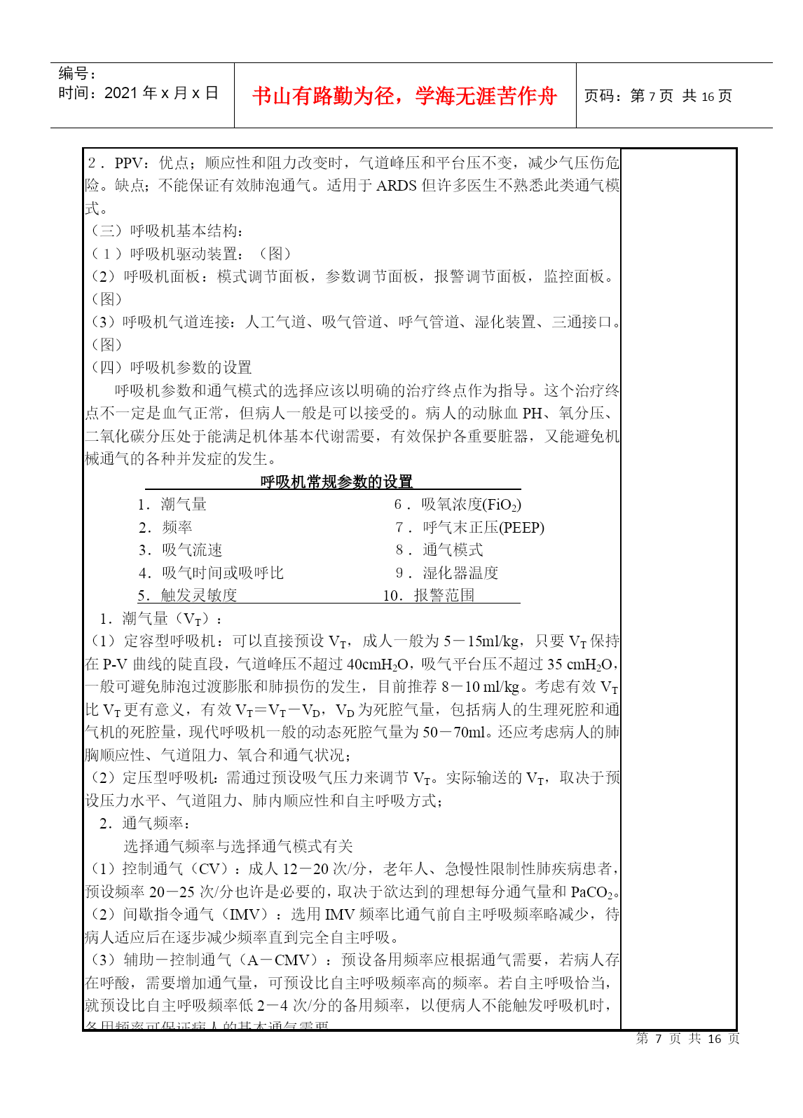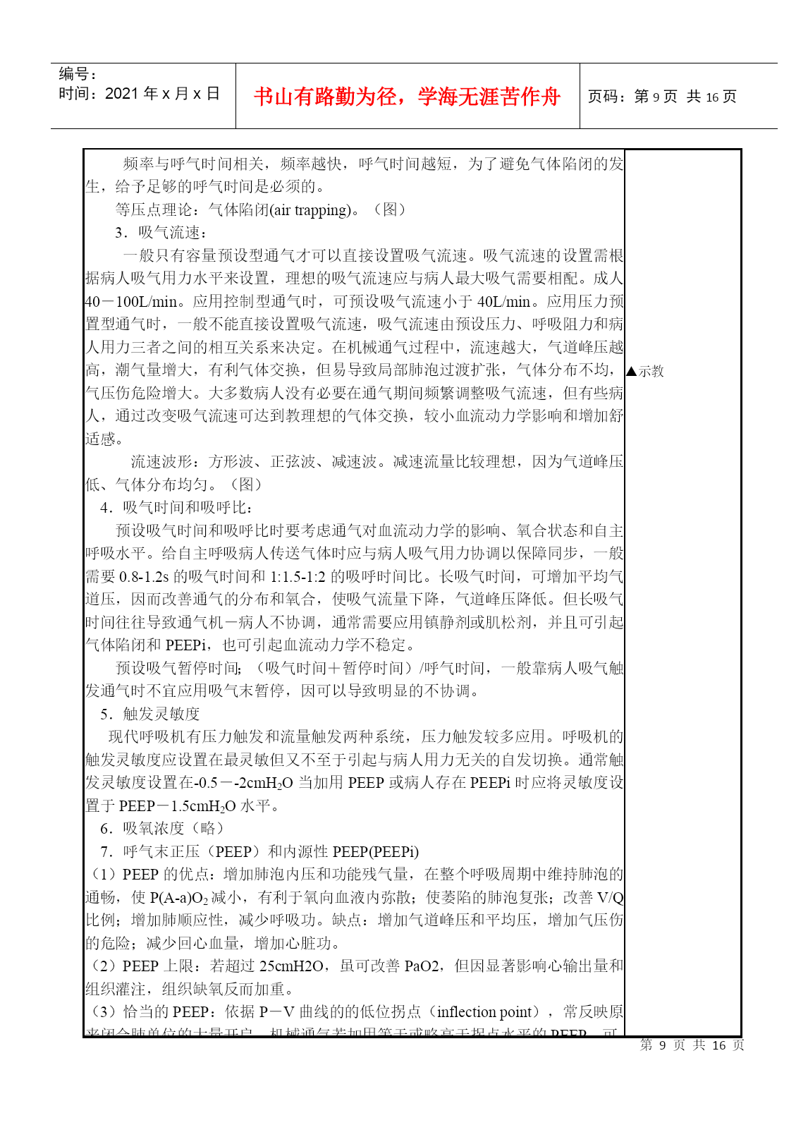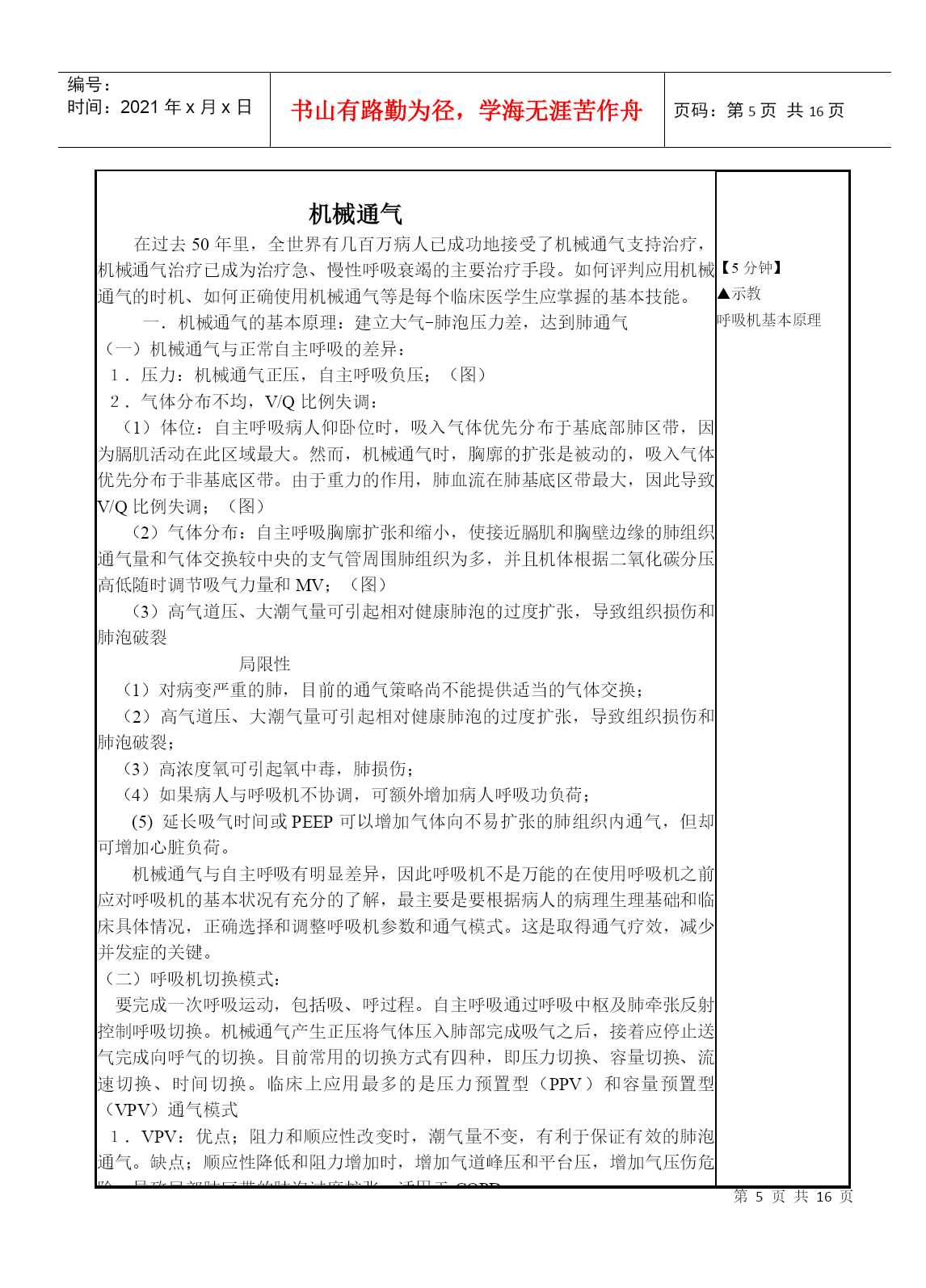 编号:时间:2021年x月x日书山有路勤为径,学海无涯苦作舟页码:第PAGE16页共NUMPAGES16页第PAGE\*MERGEFORMAT16页共NUMPAGES\*MERGEFORMAT16页机械通气临床应用教案第1次课教学方式小班课授课时间04年6月31日题机械通气临床应用教学班次01级目学时数3本课目的、重点和难点目的:1.了解呼吸机应用的原理;2.熟练掌握呼吸机常用参数;3.初步掌握机械通气应用中的评价重点:1.压力切换、容量切换;2.机械通气参数的调整和设置;3.PEEP;4.等压点;5.报警原因难点:1.机械通气参数的调整和设置;2.拐点;3.等压点、PEEPi。授课设计教员讲解;全课总结讲评,指出重、难点并举例说明;课后床边实物演示。教研室审阅竟见(教学组长或主任签名)授课单位:长征医院内科教研室授课教员:内容呼吸机应用的原理:机械通气参数的设置:机械通气参数的调整;本次课复习要点1.机械通气参数的调整和设置;2.PEEP;3.等压点;4.报警原因实施情况参考新近文献1.现代机械通气的理论和实践内容教具及时间分配机械通气在过去50年里,全世界有几百万病人已成功地接受了机械通气支持治疗,机械通气治疗已成为治疗急、慢性呼吸衰竭的主要治疗手段。如何评判应用机械通气的时机、如何正确使用机械通气等是每个临床医学生应掌握的基本技能。一.机械通气的基本原理:建立大气-肺泡压力差,达到肺通气(一)机械通气与正常自主呼吸的差异:1.压力:机械通气正压,自主呼吸负压;(图)2.气体分布不均,V/Q比例失调:(1)体位:自主呼吸病人仰卧位时,吸入气体优先分布于基底部肺区带,因为膈肌活动在此区域最大。然而,机械通气时,胸廓的扩张是被动的,吸入气体优先分布于非基底区带。由于重力的作用,肺血流在肺基底区带最大,因此导致V/Q比例失调;(图)(2)气体分布:自主呼吸胸廓扩张和缩小,使接近膈肌和胸壁边缘的肺组织通气量和气体交换较中央的支气管周围肺组织为多,并且机体根据二氧化碳分压高低随时调节吸气力量和MV;(图)(3)高气道压、大潮气量可引起相对健康肺泡的过度扩张,导致组织损伤和肺泡破裂局限性(1)对病变严重的肺,目前的通气策略尚不能提供适当的气体交换;(2)高气道压、大潮气量可引起相对健康肺泡的过度扩张,导致组织损伤和肺泡破裂;(3)高浓度氧可引起氧中毒,肺损伤;(4)如果病人与呼吸机不协调,可额外增加病人呼吸功负荷;(5)延长吸气时间或PEEP可以增加气体向不易扩张的肺组织内通气,但却可增加心脏负荷。机械通气与自主呼吸有明显差异,因此呼吸机不是万能的在使用呼吸机之前应对呼吸机的基本状况有充分的了解,最主要是要根据病人的病理生理基础和临床具体情况,正确选择和调整呼吸机参数和通气模式。这是取得通气疗效,减少并发症的关键。(二)呼吸机切换模式:要完成一次呼吸运动,包括吸、呼过程。自主呼吸通过呼吸中枢及肺牵张反射控制呼吸切换。机械通气产生正压将气体压入肺部完成吸气之后,接着应停止送气完成向呼气的切换。目前常用的切换方式有四种,即压力切换、容量切换、流速切换、时间切换。临床上应用最多的是压力预置型(PPV)和容量预置型(VPV)通气模式1.VPV:优点;阻力和顺应性改变时,潮气量不变,有利于保证有效的肺泡通气。缺点;顺应性降低和阻力增加时,增加气道峰压和平台压,增加气压伤危险,导致局部肺区带的肺泡过度扩张。适用于COPD【5分钟】▲示教呼吸机基本原理TXM内容教具及时间分配2.PPV:优点;顺应性和阻力改变时,气道峰压和平台压不变,减少气压伤危险。缺点;不能保证有效肺泡通气。适用于ARDS但许多医生不熟悉此类通气模式。(三)呼吸机基本结构:(1)呼吸机驱动装置:(图)(2)呼吸机面板:模式调节面板,参数调节面板,报警调节面板,监控面板。(图)(3)呼吸机气道连接:人工气道、吸气管道、呼气管道、湿化装置、三通接口。(图)(四)呼吸机参数的设置呼吸机参数和通气模式的选择应该以明确的治疗终点作为指导。这个治疗终点不一定是血气正常,但病人一般是可以接受的。病人的动脉血PH、氧分压、二氧化碳分压处于能满足机体基本代谢需要,有效保护各重要脏器,又能避免机械通气的各种并发症的发生。呼吸机常规参数的设置1.潮气量6.吸氧浓度(FiO2)2.频率7.呼气末正压(PEEP)3.吸气流速8.通气模式4.吸气时间或吸呼比9.湿化器温度5.触发灵敏度10.报警范围1.潮气