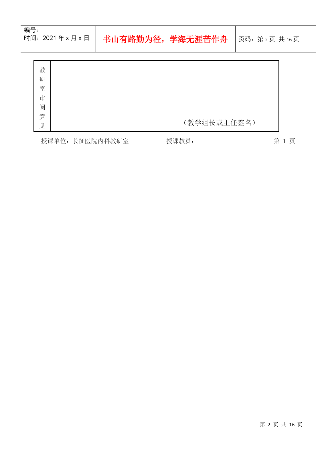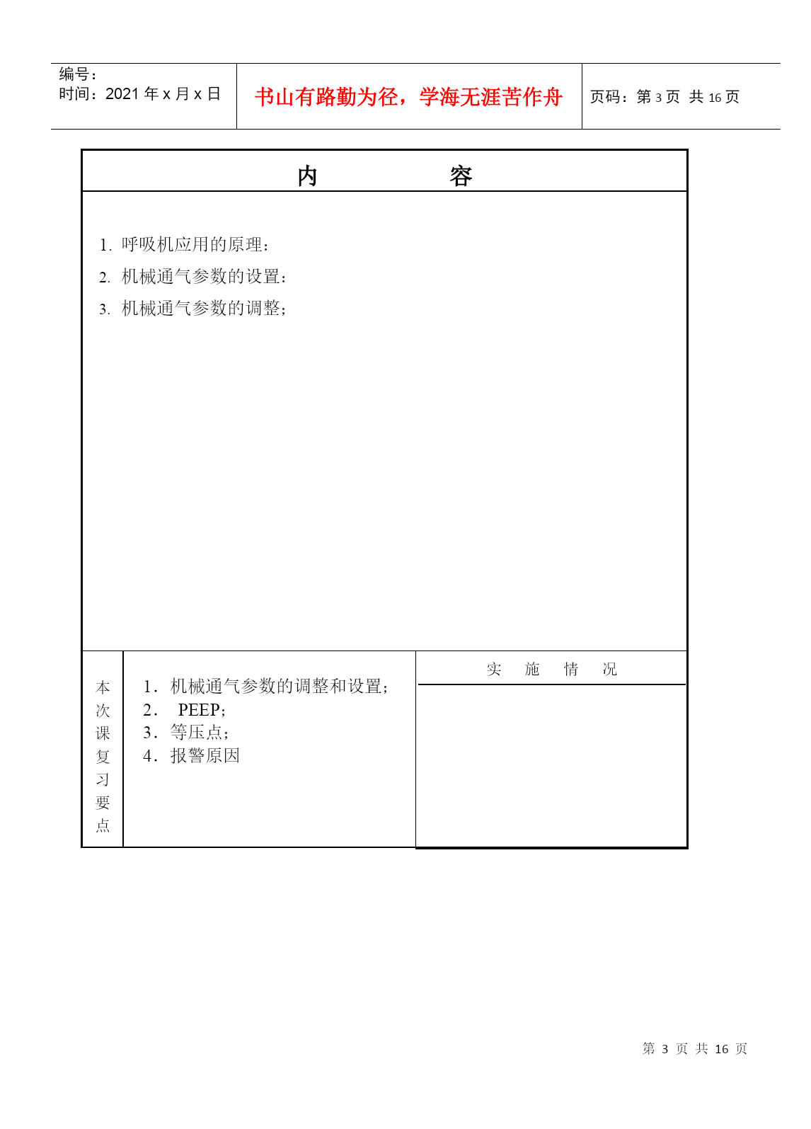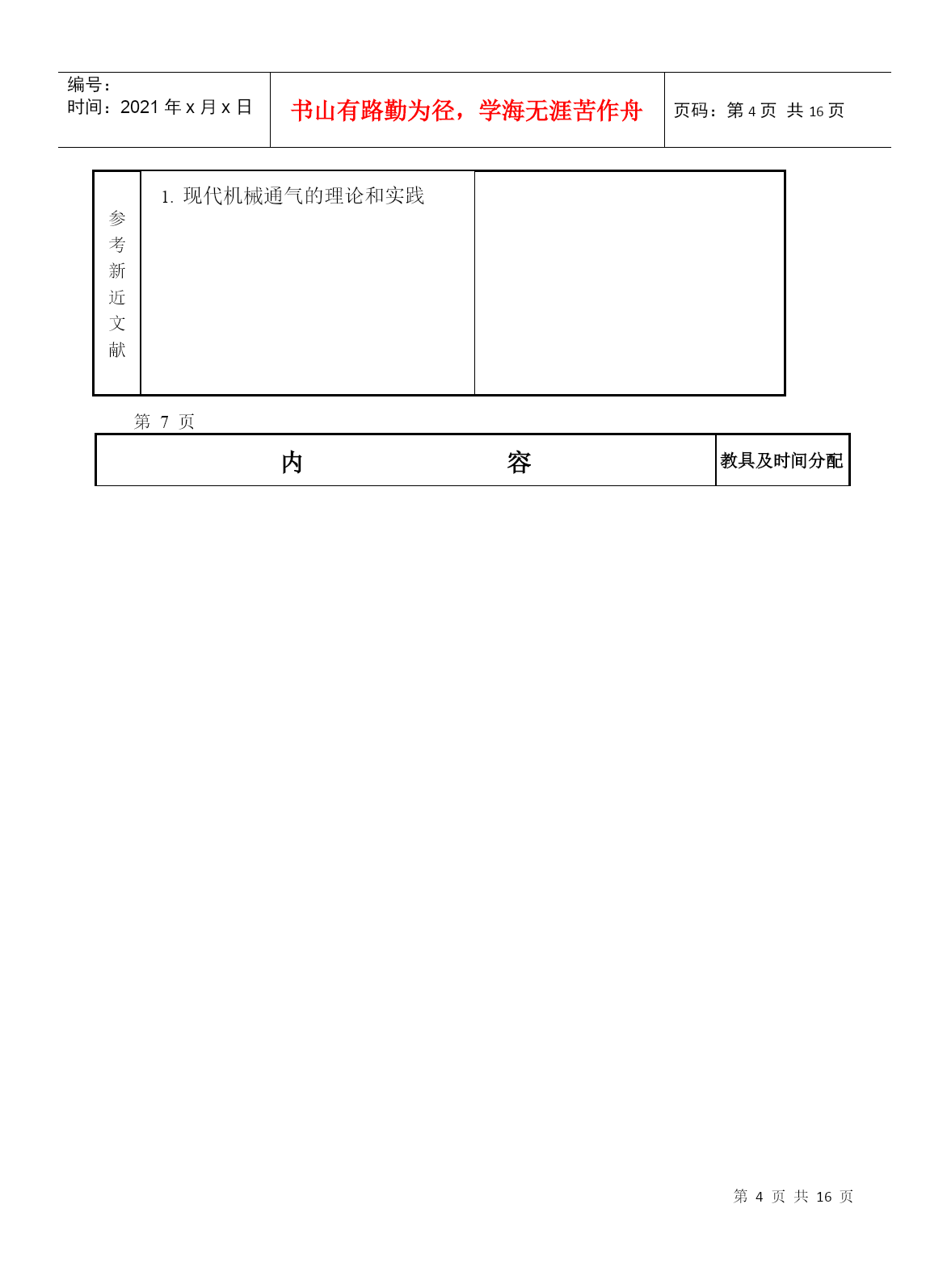 编号:时间:2021年x月x日书山有路勤为径,学海无涯苦作舟页码:第PAGE16页共NUMPAGES16页第PAGE\*MERGEFORMAT16页共NUMPAGES\*MERGEFORMAT16页机械通气临床应用教案第1次课教学方式小班课授课时间04年6月31日题机械通气临床应用教学班次01级目学时数3本课目的、重点和难点目的:1.了解呼吸机应用的原理;2.熟练掌握呼吸机常用参数;3.初步掌握机械通气应用中的评价重点:1.压力切换、容量切换;2.机械通气参数的调整和设置;3.PEEP;4.等压点;5.报警原因难点:1.机械通气参数的调整和设置;2.拐点;3.等压点、PEEPi。授课设计教员讲解;全课总结讲评,指出重、难点并举例说明;课后床边实物演示。教研室审阅竟见(教学组长或主任签名)授课单位:长征医院内科教研室授课教员:内容呼吸机应用的原理:机械通气参数的设置:机械通气参数的调整;本次课复习要点1.机械通气参数的调整和设置;2.PEEP;3.等压点;4.报警原因实施情况参考新近文献1.现代机械通气的理论和实践内容教具及时间分配机械通气在过去50年里,全世界有几百万病人已成功地接受了机械通气支持治疗,机械通气治疗已成为治疗急、慢性呼吸衰竭的主要治疗手段。如何评判应用机械通气的时机、如何正确使用机械通气等是每个临床医学生应掌握的基本技能。一.机械通气的基本原理:建立大气-肺泡压力差,达到肺通气(一)机械通气与正常自主呼吸的差异:1.压力:机械通气正压,自主呼吸负压;(图)2.气体分布不均,V/Q比例失调:(1)体位:自主呼吸病人仰卧位时,吸入气体优先分布于基底部肺区带,因为膈肌活动在此区域最大。然而,机械通气时,胸廓的扩张是被动的,吸入气体优先分布于非基底区带。由于重力的作用,肺血流在肺基底区带最大,因此导致V/Q比例失调;(图)(2)气体分布:自主呼吸胸廓扩张和缩小,使接近膈肌和胸壁边缘的肺组织通气量和气体交换较中央的支气管周围肺组织为多,并且机体根据二氧化碳分压高低随时调节吸气力量和MV;(图)(3)高气道压、大潮气量可引起相对健康肺泡的过度扩张,导致组织损伤和肺泡破裂局限性(1)对病变严重的肺,目前的通气策略尚不能提供适当的气体交换;(2)高气道压、大潮气量可引起相对健康肺泡的过度扩张,导致组织损伤和肺泡破裂;(3)高浓度氧可引起氧中毒,肺损伤;(4)如果病人与呼吸机不协调,可额外增加病人呼吸功负荷;(5)延长吸气时间或PEEP可以增加气体向不易扩张的肺组织内通气,但却可增加心脏负荷。机械通气与自主呼吸有明显差异,因此呼吸机不是万能的在使用呼吸机之前应对呼吸机的基本状况有充分的了解,最主要是要根据病人的病理生理基础和临床具体情况,正确选择和调整呼吸机参数和通气模式。这是取得通气疗效,减少并发症的关键。(二)呼吸机切换模式:要完成一次呼吸运动,包括吸、呼过程。自主呼吸通过呼吸中枢及肺牵张反射控制呼吸切换。机械通气产生正压将气体压入肺部完成吸气之后,接着应停止送气完成向呼气的切换。目前常用的切换方式有四种,即压力切换、容量切换、流速切换、时间切换。临床上应用最多的是压力预置型(PPV)和容量预置型(VPV)通气模式1.VPV:优点;阻力和顺应性改变时,潮气量不变,有利于保证有效的肺泡通气。缺点;顺应性降低和阻力增加时,增加气道峰压和平台压,增加气压伤危险,导致局部肺区带的肺泡过度扩张。适用于COPD【5分钟】▲示教呼吸机基本原理TXM内容教具及时间分配2.PPV:优点;顺应性和阻力改变时,气道峰压和平台压不变,减少气压伤危险。缺点;不能保证有效肺泡通气。适用于ARDS但许多医生不熟悉此类通气模式。(三)呼吸机基本结构:(1)呼吸机驱动装置:(图)(2)呼吸机面板:模式调节面板,参数调节面板,报警调节面板,监控面板。(图)(3)呼吸机气道连接:人工气道、吸气管道、呼气管道、湿化装置、三通接口。(图)(四)呼吸机参数的设置呼吸机参数和通气模式的选择应该以明确的治疗终点作为指导。这个治疗终点不一定是血气正常,但病人一般是可以接受的。病人的动脉血PH、氧分压、二氧化碳分压处于能满足机体基本代谢需要,有效保护各重要脏器,又能避免机械通气的各种并发症的发生。呼吸机常规参数的设置1.潮气量6.吸氧浓度(FiO2)2.频率7.呼气末正压(PEEP)3.吸气流速8.通气模式4.吸气时间或吸呼比9.湿化器温度5.触发灵敏度10.报警范围1.潮气
