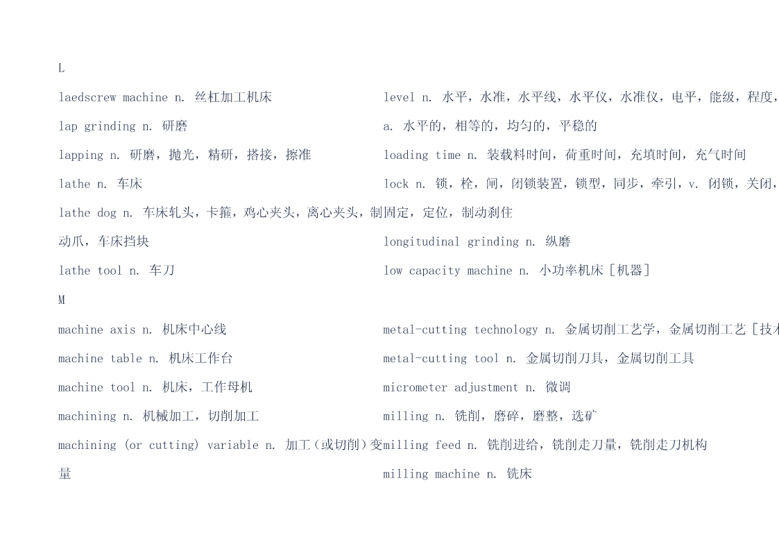 Aabrasionn.磨料,研磨材料,磨蚀剂,a.磨损的,磨蚀的anglemillingcuttern.角铣刀abrasivebeltn.砂带angulargrindingn.斜面磨削,斜磨法abrasivebeltgrindingn.砂带磨削,用研磨带磨光angularmillingn.斜面铣削abrasivecut-offmachinen.砂轮切断机angularplungegrindingn.斜向切入磨削abrasivedressingwheeln.砂轮修整轮angularturningn.斜面车削abrasivegrainn.磨料粒度arbourn.刀杆,心轴,柄轴,轴,辊轴abrasivegritn.研磨用磨料,铁粒attachmentn.附件,附件机构,联结,固接,联结法abrasivelappingwheeln.磨料研磨轮automaticbarmachinen.棒料自动车床accuracyofpositionn.位置精度automaticboringmachinen.自动镗床accuracytoshapen.形状精度automaticcopyinglathen.自动仿形车床activecuttingedgen.主切削刃automaticdouble-headmillingmachinen.自动双轴铣床adapterflangen.连接器法兰盘automaticlathen.自动车床adjointingflanksn.共軛齿廓automaticturretlathen.自动转塔车床alignn.找中(心),找正,对中,对准,找平,调直,校直,调整,调准Bbeltgrindingmachinen.砂带磨床boringfixturen.镗孔夹具benchlathen.台式车床boringmachinen.镗床beveln.斜角,斜面,倾斜,斜切,斜角规,万能角尺,boringtooln.镗刀圆锥的,倾斜的,斜边,伞齿轮,锥齿轮boring,drillingandmillingmachinen.镗铣床bevelgearcuttingmachinen.锥齿轮切削机床broachingmachinen.拉床,铰孔机,剥孔机bevelgeartoothsystemn.锥齿轮系,锥齿轮传动系统broachingtooln.拉刀boreholen.镗孔,镗出的孔,钻眼broadfinishingtooln.宽刃精切刀,宽刃精车刀,宽刃光切刀boringn.镗孔,钻孔,穿孔CCalibratevt.校准[正],刻度,分度,检查[验],contactpatternn.靠模定标,标定,使标准化,使符合标准continuouschipn.连续切屑camcontourgrindern.凸轮仿形磨床continuousspiralchipn.连续螺旋切屑carbidetipn.硬质合金刀片contourn.轮廓,外形,外貌,轮廓线,回路,网路,电路,等高线,等值carbideturningtooln.硬质合金车刀线,轮廓等高距a.仿形的,靠模的carbide-tippedtooln.硬质合金刀具contourgrindingn.仿形磨削,成形磨削castironmachiningn.铸铁加工,铸铁切削加工contourmillingn.成形铣削,外形铣削,等高走刀曲面仿形法centerlesscylindricalgrindern.无心外圆磨床convexmillingattachmentn.凸面铣削附件ceramiccuttingtooln.金属陶瓷刀具convexturningattachmentn.中凸车削附件,凸面车削附件chamfern.;vt.倒角,倒棱coolantlubricantn.冷却润滑剂chamferedcuttingedgen.倒角刀刃coolantlubricantemulsionn.冷却润滑乳液[剂]champv.焦急copyn.样板,仿形,靠模工作法,拷贝复制品,v.复制,模仿,抄录champingfixturen.快换夹具copygrindingn.仿形磨床champingjawn.快换卡爪copy-milln.仿形铣chasern.螺纹梳刀,梳刀盘,板牙copyingturretlathen.仿形转塔车床chattervi.;n.振动,振荡,震颤,刀振cornern.角,弯[管]头,弯管cherryn.;a.樱桃,鲜红的,樱桃木制的counterboren.埋头孔,沉孔,锥口孔,平底扩孔钻,平底锪钻,n.;vt.扩chipn.切屑,铁屑