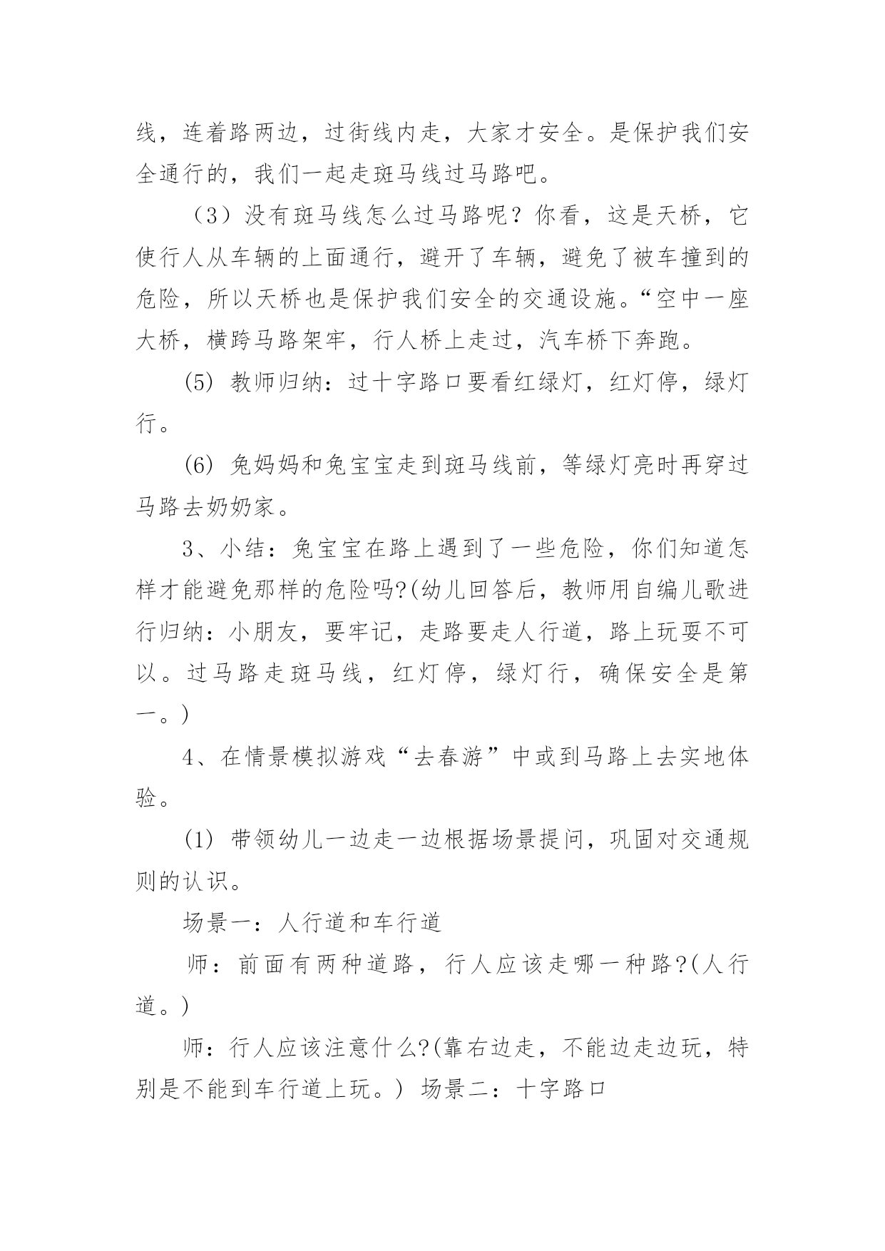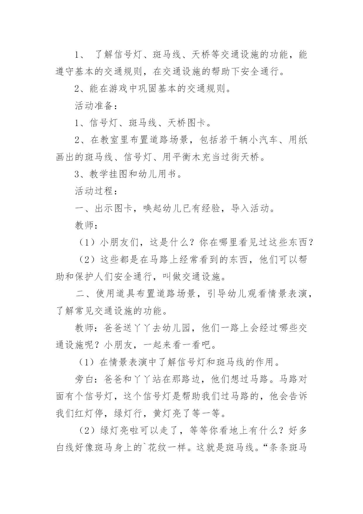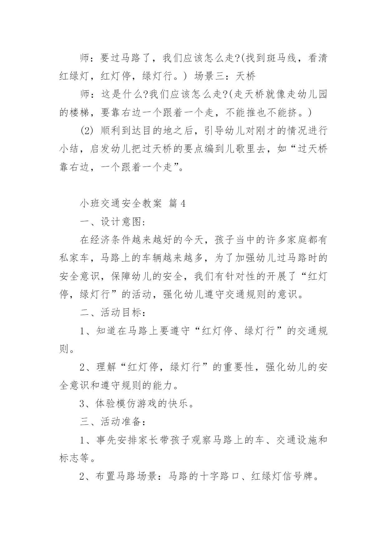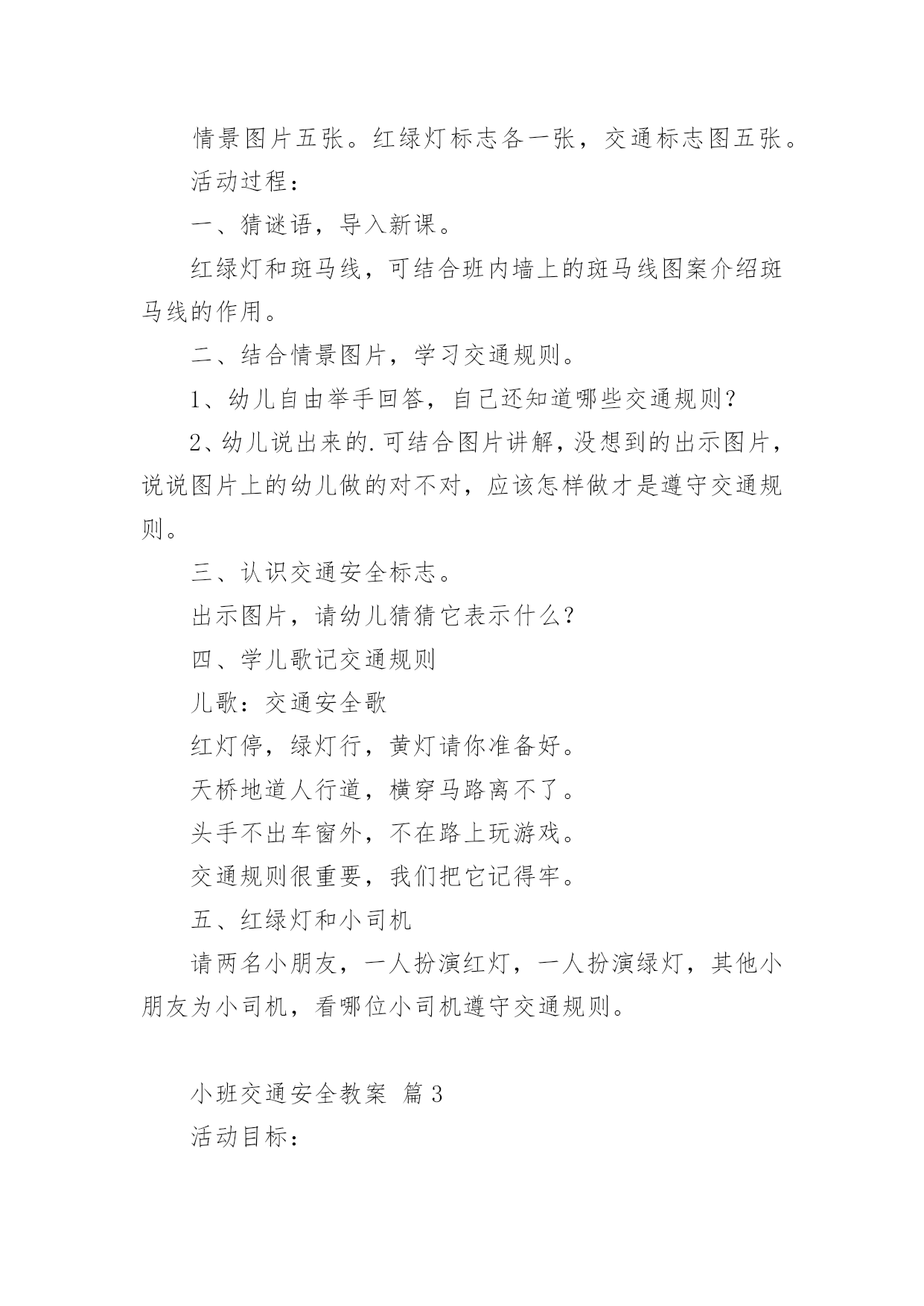 小班交通安全教案作为一位不辞辛劳的人民教师,时常要开展教案准备工作,借助教案可以提高教学质量,收到预期的教学效果。如何把教案做到重点突出呢?以下是小编为大家收集的小班交通安全教案,仅供参考,希望能够帮助到大家。小班交通安全教案篇1设计意图:城市交通的不断发展促使我们加强交通安全教育,让幼儿了解一些危险因素,知道遵守交通规则的重要性,懂得如何保护自己。设计这个活动时,我首先根据小班幼儿的已有生活经验与认知发展水平,将目标定位为:了解行人在马路上应该遵守的一些交通规则,培养初步的安全意识与自我保护意识。由于小班幼儿注意力集中的时间很短,因而活动内容不能过于繁杂,而应简单明确。为此,我选择了幼儿日常生活中经常会遇到的几个场景,教育幼儿不在马路上玩耍,要走人行道,过马路要走斑马线等。我采用多媒体课件、情景模拟游戏等引导幼儿参与活动,并请家长在平时参与教育活动,实现家园共育,以增强幼儿的安全意识、自我保护意识和能力。活动目标:1.了解行人在马路上应该遵守的一些交通规则。2.形成初步的安全意识与自我保护意识,提高自我保护能力。3.能说出不易玩耍的地方存在什么样的安全隐患。4.增强安全意识,克制自己的好奇心,不去危险的地方玩耍。活动准备:1.幼儿有与成人一起外出的`经验。2.有关模拟游戏的情景创设。3.课件《看望兔奶奶》。活动过程:1.边观看课件(一)边讨论。(1)兔奶奶生病了,兔妈妈带兔宝宝去看望她。半路上,兔妈妈到水果店给奶奶买水果,兔宝宝就跑到了马路上。她看到花丛中有一只漂亮的蝴蝶,就去捉蝴蝶玩。蝴蝶飞到了马路中央,兔宝宝就一路追过去,差点被车撞上。(2)为什么兔宝宝差点被车撞到?(3)教师归纳:兔宝宝离开妈妈在马路上玩耍,差点被车撞上。这样太危险了,不管什么情况我们都不能在马路上玩。2.边观看课件(二)边讨论。(1)兔妈妈和兔宝宝继续往前走。奶奶家就在马路对面,兔宝宝兴奋地想冲过马路见奶奶,可是被兔妈妈一把拉住了。(2)兔妈妈为什么要拉住兔宝宝?过马路应该走哪里?(3)教师归纳:过马路要走斑马线。(4)十字路口有斑马线,行人是不是什么时候都可以走呢?什么时候可以走?(5)教师归纳:过十字路口要看红绿灯,红灯停,绿灯行。(6)兔妈妈和兔宝宝走到斑马线前,等绿灯亮时再穿过马路去奶奶家。3.小结:兔宝宝在路上遇到了一些危险,你们知道怎样才能避免那样的危险吗?(幼儿回答后,教师用自编儿歌进行归纳:小朋友,要牢记,走路要走人行道,路上玩耍不可以。过马路走斑马线,红灯停,绿灯行,确保安全是第一。)4.在情景模拟游戏“去春游”中或到马路上去实地体验。(1)带领幼儿一边走一边根据场景提问,巩固对交通规则的认识。场景一:人行道和车行道师:前面有两种道路,行人应该走哪一种路?(人行道。)师:行人应该注意什么?(靠右边走,不能边走边玩,特别是不能到车行道上玩。)场景二:十字路口师:要过马路了,我们应该怎么走?(找到斑马线,看清红绿灯,红灯停,绿灯行。)场景三:天桥师:这是什么?我们应该怎么走?(走天桥就像走幼儿园的楼梯,要靠右边一个跟着一个走,不能推也不能挤。)(2)顺利到达目的地之后,引导幼儿对刚才的情况进行小结,启发幼儿把过天桥的要点编到儿歌里去,如“过天桥靠右边,一个跟着一个走”。延伸活动:行人走在马路上还应该注意什么?请和爸爸妈妈一起找一找,然后把它们也编到儿歌里去好吗?教学反思:设计这个活动时,我首先根据小班幼儿的已有生活经验与认知发展水平,将目标定位为:了解行人在马路上应该遵守的一些交通规则,培养初步的安全意识与自我保护意识。由于小班幼儿注意力集中的时间很短,因而活动内容不能过于繁杂,而应简单明确。为此,我选择了幼儿日常生活中经常会遇到的场景,教育幼儿不在马路上玩耍,要走人行道,过马路要走斑马线等。我采用直观图片、情景模拟游戏等引导幼儿参与活动,让幼儿了解交通知识。正所谓实践出真知,所以我在活动后请家长在平时生活中引导幼儿,而且做给孩子看,给孩子做个好榜样,实现家园共育,以增强幼儿的安全意识、自我保护意识和能力。小班交通安全教案篇2活动目标:1、教幼儿学习一些交通规则,认识一些交通安全标志。2、幼儿能从小养成遵守交通规则的习惯。3、培养幼儿敏锐的观察能力。4、遵守社会行为规则,不做“禁止”的事。5、加强幼儿的安全意识。活动准备:情景图片五张。红绿灯标志各一张,交通标志图五张。活动过程:一、猜谜语,导入新课。红绿灯和斑马线,可结合班内墙上的斑马线图案介绍斑马线的作用。二、结合情景图片,学习交通规则。1、幼儿自由举手回答,自己还知道哪些交通规则?2、幼儿说出来的.可结合图片讲解,没想到的出示图片,说说图片上的幼儿做的对不对,应该怎样做才是遵守交通规则。三、认识交通安全标志。出示图片,请幼儿猜猜它表示什么?四、学儿歌记交通规则儿歌:交通安全歌红
