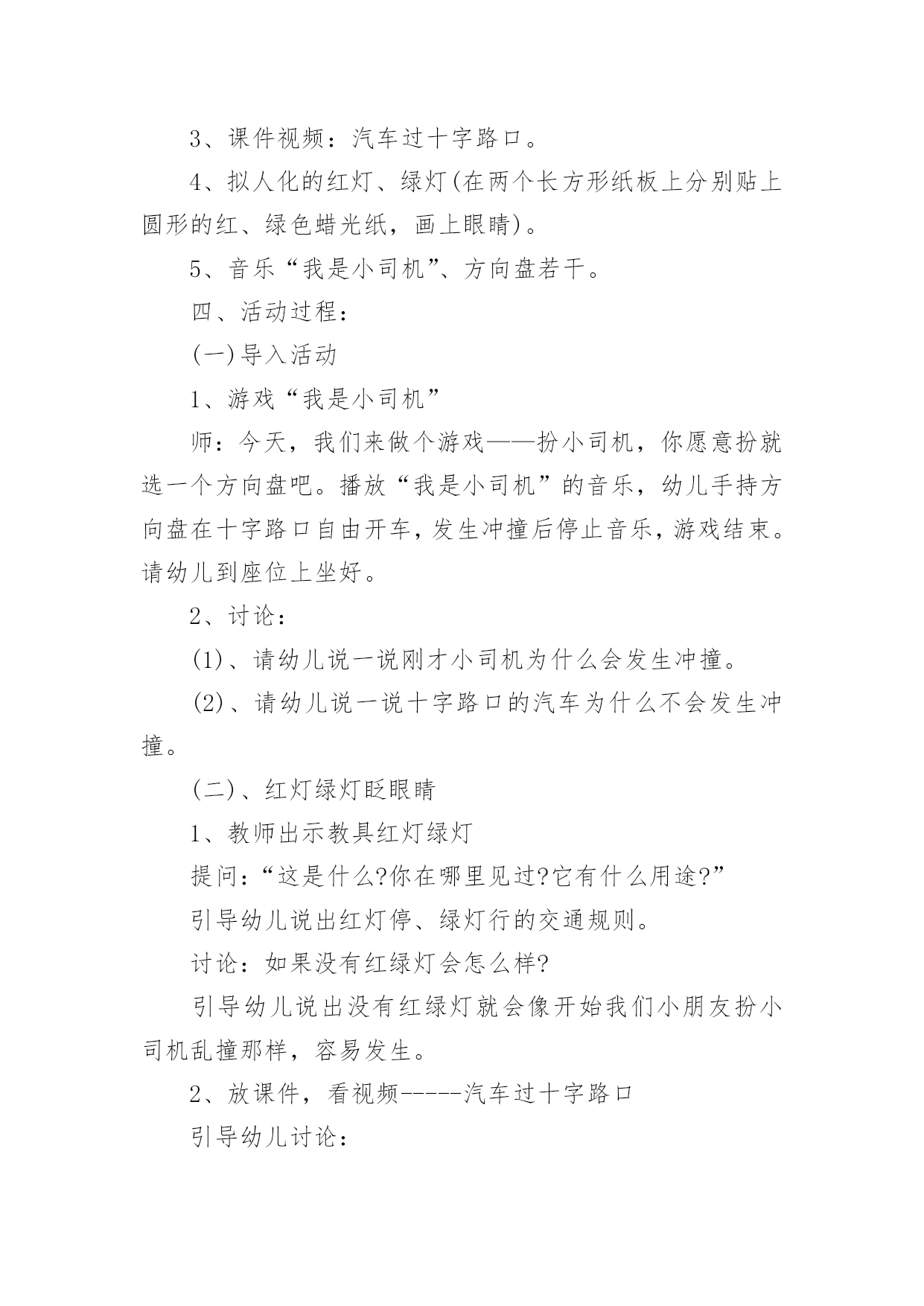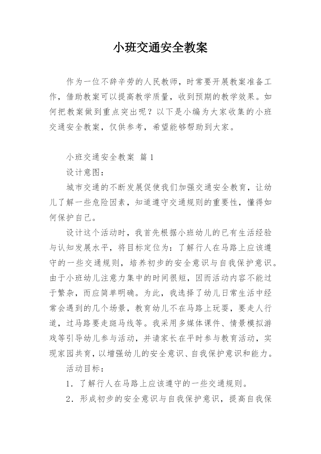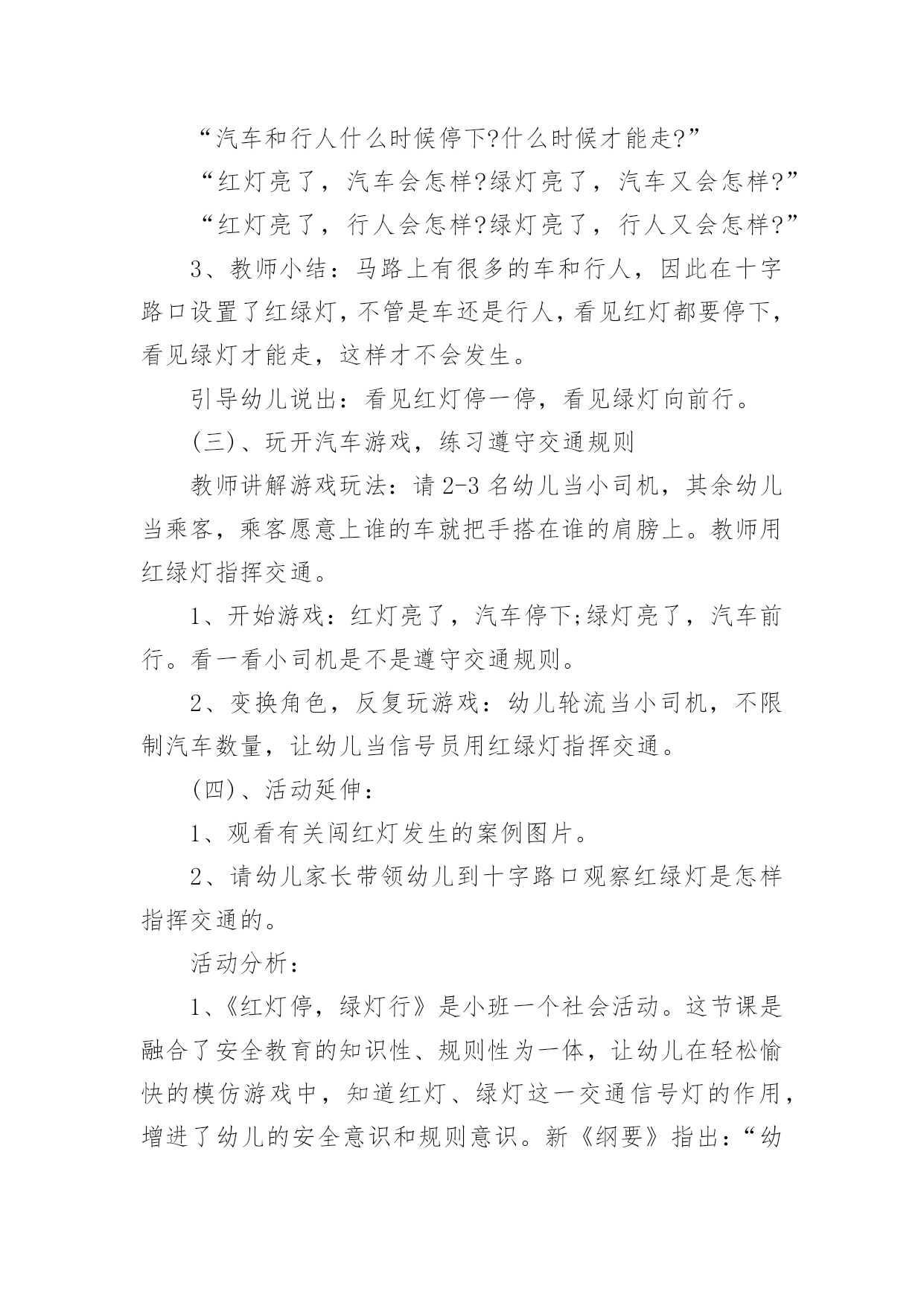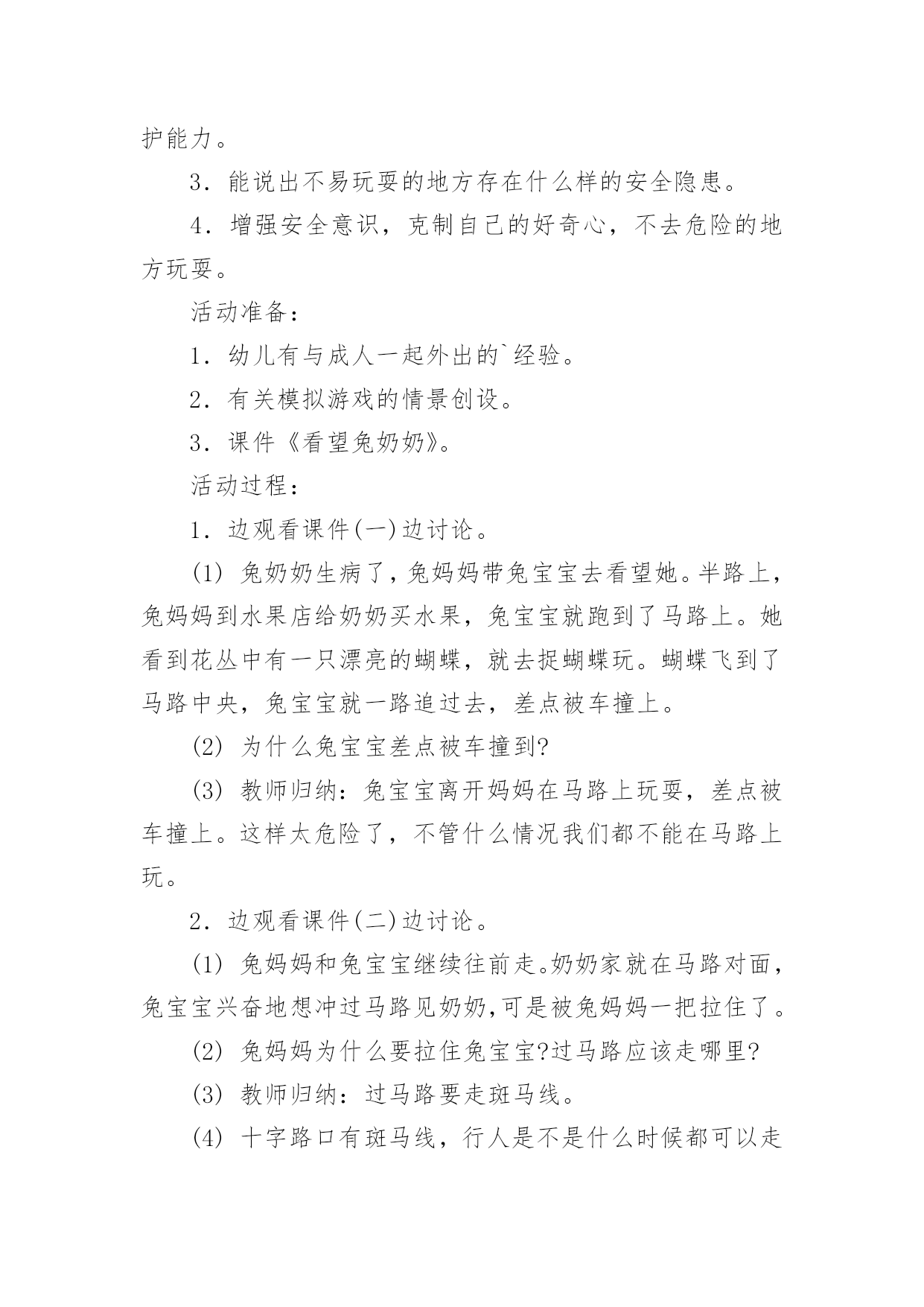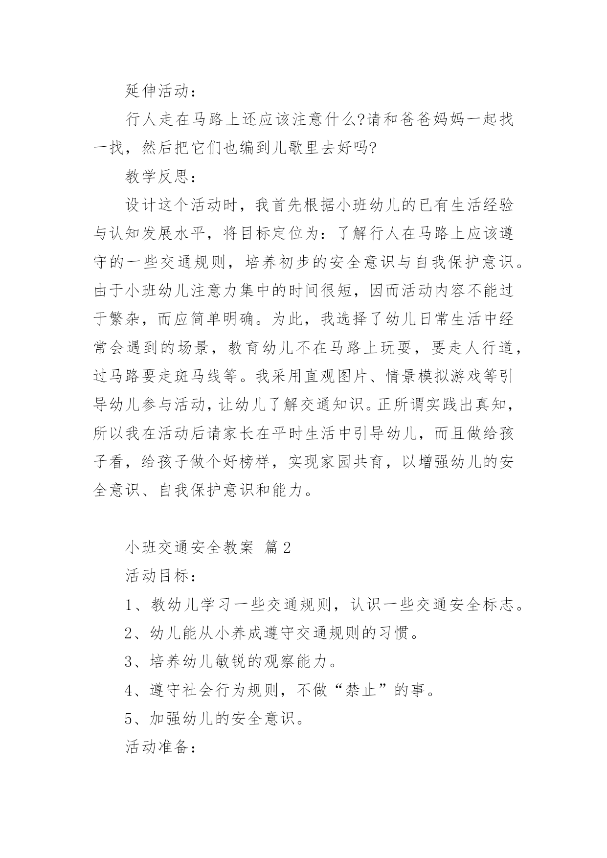 小班交通安全教案作为一位不辞辛劳的人民教师,时常要开展教案准备工作,借助教案可以提高教学质量,收到预期的教学效果。如何把教案做到重点突出呢?以下是小编为大家收集的小班交通安全教案,仅供参考,希望能够帮助到大家。小班交通安全教案篇1设计意图:城市交通的不断发展促使我们加强交通安全教育,让幼儿了解一些危险因素,知道遵守交通规则的重要性,懂得如何保护自己。设计这个活动时,我首先根据小班幼儿的已有生活经验与认知发展水平,将目标定位为:了解行人在马路上应该遵守的一些交通规则,培养初步的安全意识与自我保护意识。由于小班幼儿注意力集中的时间很短,因而活动内容不能过于繁杂,而应简单明确。为此,我选择了幼儿日常生活中经常会遇到的几个场景,教育幼儿不在马路上玩耍,要走人行道,过马路要走斑马线等。我采用多媒体课件、情景模拟游戏等引导幼儿参与活动,并请家长在平时参与教育活动,实现家园共育,以增强幼儿的安全意识、自我保护意识和能力。活动目标:1.了解行人在马路上应该遵守的一些交通规则。2.形成初步的安全意识与自我保护意识,提高自我保护能力。3.能说出不易玩耍的地方存在什么样的安全隐患。4.增强安全意识,克制自己的好奇心,不去危险的地方玩耍。活动准备:1.幼儿有与成人一起外出的`经验。2.有关模拟游戏的情景创设。3.课件《看望兔奶奶》。活动过程:1.边观看课件(一)边讨论。(1)兔奶奶生病了,兔妈妈带兔宝宝去看望她。半路上,兔妈妈到水果店给奶奶买水果,兔宝宝就跑到了马路上。她看到花丛中有一只漂亮的蝴蝶,就去捉蝴蝶玩。蝴蝶飞到了马路中央,兔宝宝就一路追过去,差点被车撞上。(2)为什么兔宝宝差点被车撞到?(3)教师归纳:兔宝宝离开妈妈在马路上玩耍,差点被车撞上。这样太危险了,不管什么情况我们都不能在马路上玩。2.边观看课件(二)边讨论。(1)兔妈妈和兔宝宝继续往前走。奶奶家就在马路对面,兔宝宝兴奋地想冲过马路见奶奶,可是被兔妈妈一把拉住了。(2)兔妈妈为什么要拉住兔宝宝?过马路应该走哪里?(3)教师归纳:过马路要走斑马线。(4)十字路口有斑马线,行人是不是什么时候都可以走呢?什么时候可以走?(5)教师归纳:过十字路口要看红绿灯,红灯停,绿灯行。(6)兔妈妈和兔宝宝走到斑马线前,等绿灯亮时再穿过马路去奶奶家。3.小结:兔宝宝在路上遇到了一些危险,你们知道怎样才能避免那样的危险吗?(幼儿回答后,教师用自编儿歌进行归纳:小朋友,要牢记,走路要走人行道,路上玩耍不可以。过马路走斑马线,红灯停,绿灯行,确保安全是第一。)4.在情景模拟游戏“去春游”中或到马路上去实地体验。(1)带领幼儿一边走一边根据场景提问,巩固对交通规则的认识。场景一:人行道和车行道师:前面有两种道路,行人应该走哪一种路?(人行道。)师:行人应该注意什么?(靠右边走,不能边走边玩,特别是不能到车行道上玩。)场景二:十字路口师:要过马路了,我们应该怎么走?(找到斑马线,看清红绿灯,红灯停,绿灯行。)场景三:天桥师:这是什么?我们应该怎么走?(走天桥就像走幼儿园的楼梯,要靠右边一个跟着一个走,不能推也不能挤。)(2)顺利到达目的地之后,引导幼儿对刚才的情况进行小结,启发幼儿把过天桥的要点编到儿歌里去,如“过天桥靠右边,一个跟着一个走”。延伸活动:行人走在马路上还应该注意什么?请和爸爸妈妈一起找一找,然后把它们也编到儿歌里去好吗?教学反思:设计这个活动时,我首先根据小班幼儿的已有生活经验与认知发展水平,将目标定位为:了解行人在马路上应该遵守的一些交通规则,培养初步的安全意识与自我保护意识。由于小班幼儿注意力集中的时间很短,因而活动内容不能过于繁杂,而应简单明确。为此,我选择了幼儿日常生活中经常会遇到的场景,教育幼儿不在马路上玩耍,要走人行道,过马路要走斑马线等。我采用直观图片、情景模拟游戏等引导幼儿参与活动,让幼儿了解交通知识。正所谓实践出真知,所以我在活动后请家长在平时生活中引导幼儿,而且做给孩子看,给孩子做个好榜样,实现家园共育,以增强幼儿的安全意识、自我保护意识和能力。小班交通安全教案篇2活动目标:1、教幼儿学习一些交通规则,认识一些交通安全标志。2、幼儿能从小养成遵守交通规则的习惯。3、培养幼儿敏锐的观察能力。4、遵守社会行为规则,不做“禁止”的事。5、加强幼儿的安全意识。活动准备:情景图片五张。红绿灯标志各一张,交通标志图五张。活动过程:一、猜谜语,导入新课。红绿灯和斑马线,可结合班内墙上的斑马线图案介绍斑马线的作用。二、结合情景图片,学习交通规则。1、幼儿自由举手回答,自己还知道哪些交通规则?2、幼儿说出来的.可结合图片讲解,没想到的出示图片,说说图片上的幼儿做的对不对,应该怎样做才是遵守交通规则。三、认识交通安全标志。出示图片,请幼儿猜猜它表示什么?四、学儿歌记交通规则儿歌:交通安全歌红