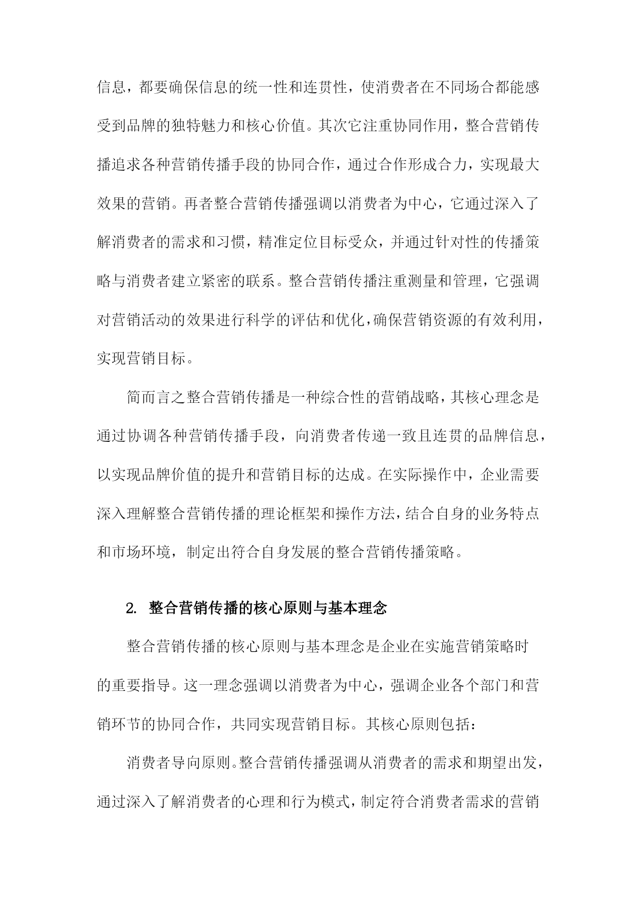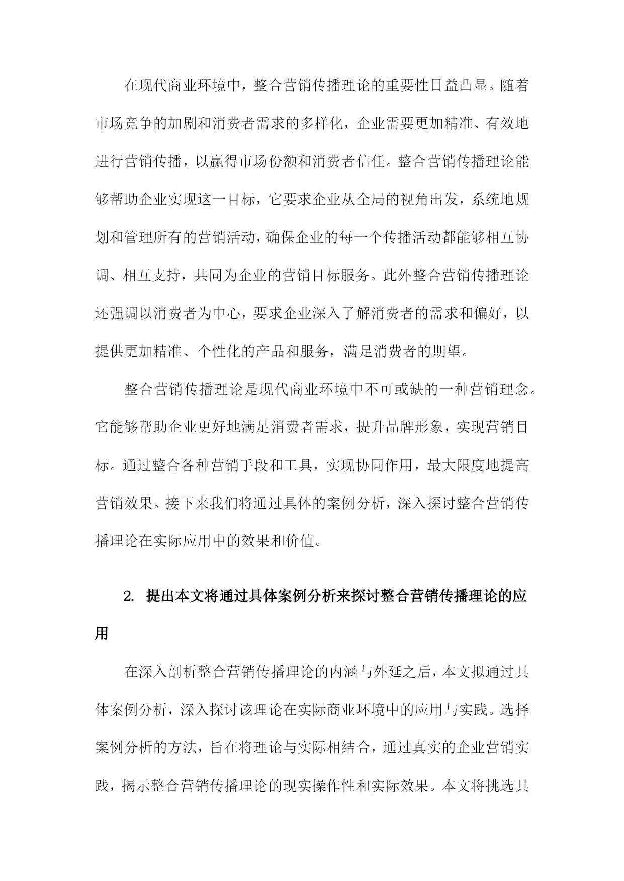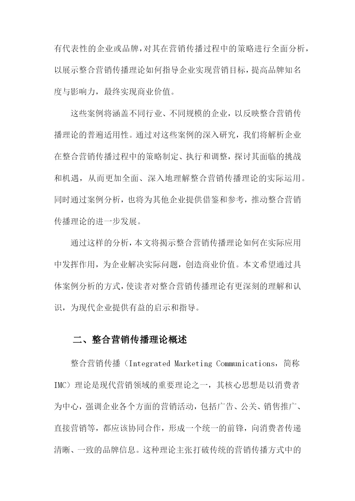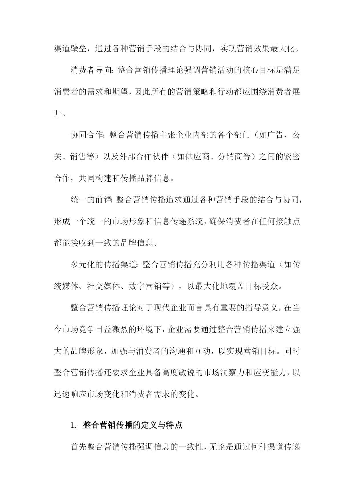 整合营销传播理论案例分析一、概要本文旨在分析整合营销传播理论(IMC理论)在实际案例中的应用情况。整合营销传播作为一种强调协调所有营销传播活动的战略方法,以实现品牌信息的一致性和最大化效果。本文将选取某一具有代表性的企业或品牌作为案例研究对象,通过对其营销传播策略进行深入剖析,探讨其如何运用整合营销传播理论来推动品牌发展、增强品牌影响力以及提高市场占有率。文章将围绕案例的背景介绍、IMC理论的运用、实际效果评估以及启示等方面展开,为读者呈现一个生动且实用的整合营销传播理论案例分析。1.介绍整合营销传播理论的概念及其在现代商业中的重要性整合营销传播(IMC,IntegratedMarketingCommunication)理论,作为一种新型的营销理念,是现代营销传播领域的重要组成部分。其核心理念在于以消费者为中心,以市场营销原理和策略为基础,通过协同的、一体化的传播手段,传递清晰、一致的品牌或产品讯息,以实现营销目标。整合营销传播理论强调的不仅是各种营销工具和手段的简单结合,更强调各个部分之间的协同作用,以实现资源的最优配置和最大的营销效果。在现代商业环境中,整合营销传播理论的重要性日益凸显。随着市场竞争的加剧和消费者需求的多样化,企业需要更加精准、有效地进行营销传播,以赢得市场份额和消费者信任。整合营销传播理论能够帮助企业实现这一目标,它要求企业从全局的视角出发,系统地规划和管理所有的营销活动,确保企业的每一个传播活动都能够相互协调、相互支持,共同为企业的营销目标服务。此外整合营销传播理论还强调以消费者为中心,要求企业深入了解消费者的需求和偏好,以提供更加精准、个性化的产品和服务,满足消费者的期望。整合营销传播理论是现代商业环境中不可或缺的一种营销理念。它能够帮助企业更好地满足消费者需求,提升品牌形象,实现营销目标。通过整合各种营销手段和工具,实现协同作用,最大限度地提高营销效果。接下来我们将通过具体的案例分析,深入探讨整合营销传播理论在实际应用中的效果和价值。2.提出本文将通过具体案例分析来探讨整合营销传播理论的应用在深入剖析整合营销传播理论的内涵与外延之后,本文拟通过具体案例分析,深入探讨该理论在实际商业环境中的应用与实践。选择案例分析的方法,旨在将理论与实际相结合,通过真实的企业营销实践,揭示整合营销传播理论的现实操作性和实际效果。本文将挑选具有代表性的企业或品牌,对其在营销传播过程中的策略进行全面分析,以展示整合营销传播理论如何指导企业实现营销目标,提高品牌知名度与影响力,最终实现商业价值。这些案例将涵盖不同行业、不同规模的企业,以反映整合营销传播理论的普遍适用性。通过对这些案例的深入研究,我们将解析企业在整合营销传播过程中的策略制定、执行和调整,探讨其面临的挑战和机遇,从而更加全面、深入地理解整合营销传播理论的实际运用。同时通过案例分析,也将为其他企业提供借鉴和参考,推动整合营销传播理论的进一步发展。通过这样的分析,本文将揭示整合营销传播理论如何在实际应用中发挥作用,为企业解决实际问题,创造商业价值。本文希望通过具体案例分析的方式,使读者对整合营销传播理论有更深刻的理解和认识,为现代企业提供有益的启示和指导。二、整合营销传播理论概述整合营销传播(IntegratedMarketingCommunications,简称IMC)理论是现代营销领域的重要理论之一,其核心思想是以消费者为中心,强调企业各个方面的营销活动,包括广告、公关、销售推广、直接营销等,都应该协同合作,形成一个统一的前锋,向消费者传递清晰、一致的品牌信息。这种理论主张打破传统的营销传播方式中的渠道壁垒,通过各种营销手段的结合与协同,实现营销效果最大化。消费者导向:整合营销传播理论强调营销活动的核心目标是满足消费者的需求和期望,因此所有的营销策略和行动都应围绕消费者展开。协同合作:整合营销传播主张企业内部的各个部门(如广告、公关、销售等)以及外部合作伙伴(如供应商、分销商等)之间的紧密合作,共同构建和传播品牌信息。统一的前锋:整合营销传播追求通过各种营销手段的结合与协同,形成一个统一的市场形象和信息传递系统,确保消费者在任何接触点都能接收到一致的品牌信息。多元化的传播渠道:整合营销传播充分利用各种传播渠道(如传统媒体、社交媒体、数字营销等),以最大化地覆盖目标受众。整合营销传播理论对于现代企业而言具有重要的指导意义,在当今市场竞争日益激烈的环境下,企业需要通过整合营销传播来建立强大的品牌形象,加强与消费者的沟通和互动,以实现营销目标。同时整合营销传播还要求企业具备高度敏锐的市场洞察力和应变能力,以迅速响应市场变化和消费者需求的变化。1.整合营销传播的定义与特点首先整合营销传播强调信息的一致性,无论是通过何种渠道传递信息