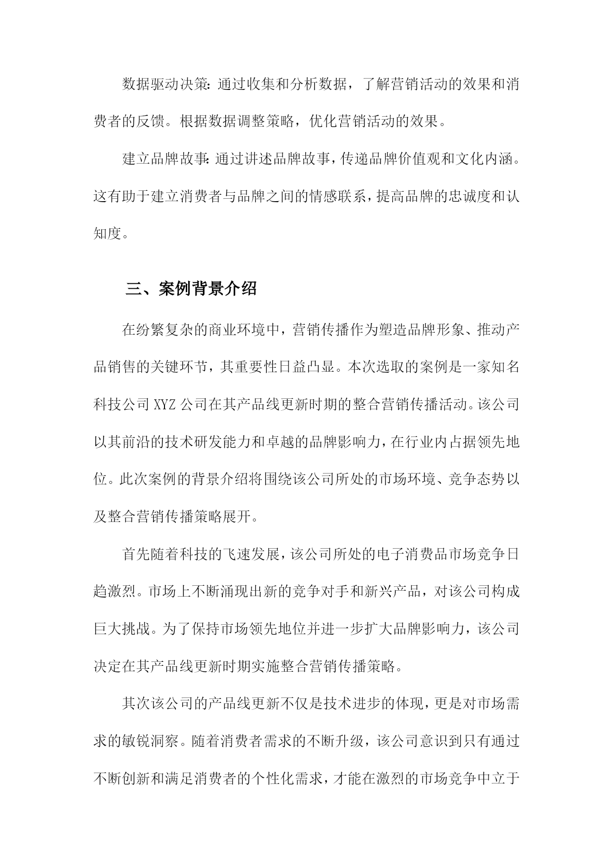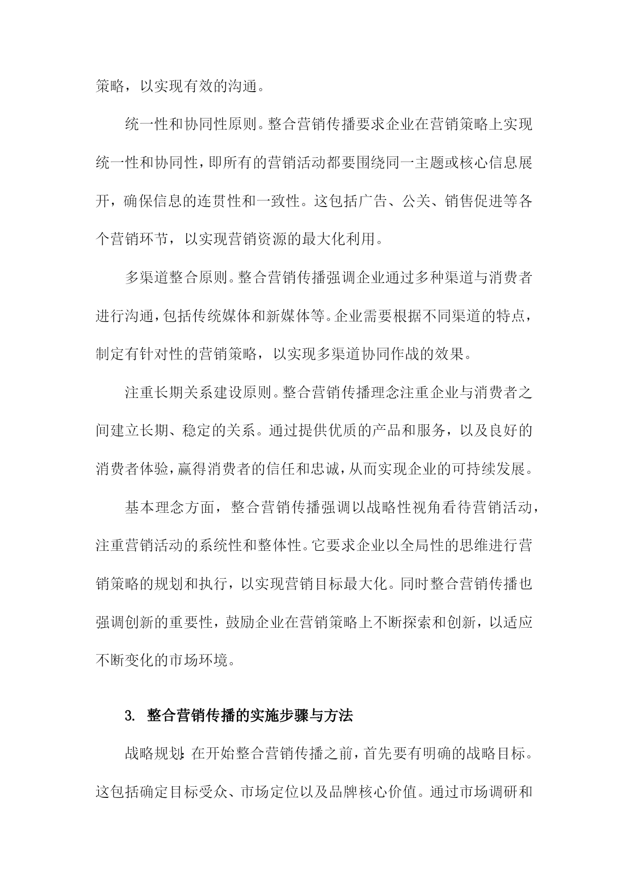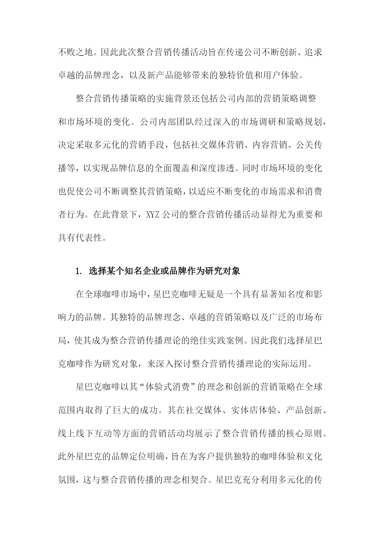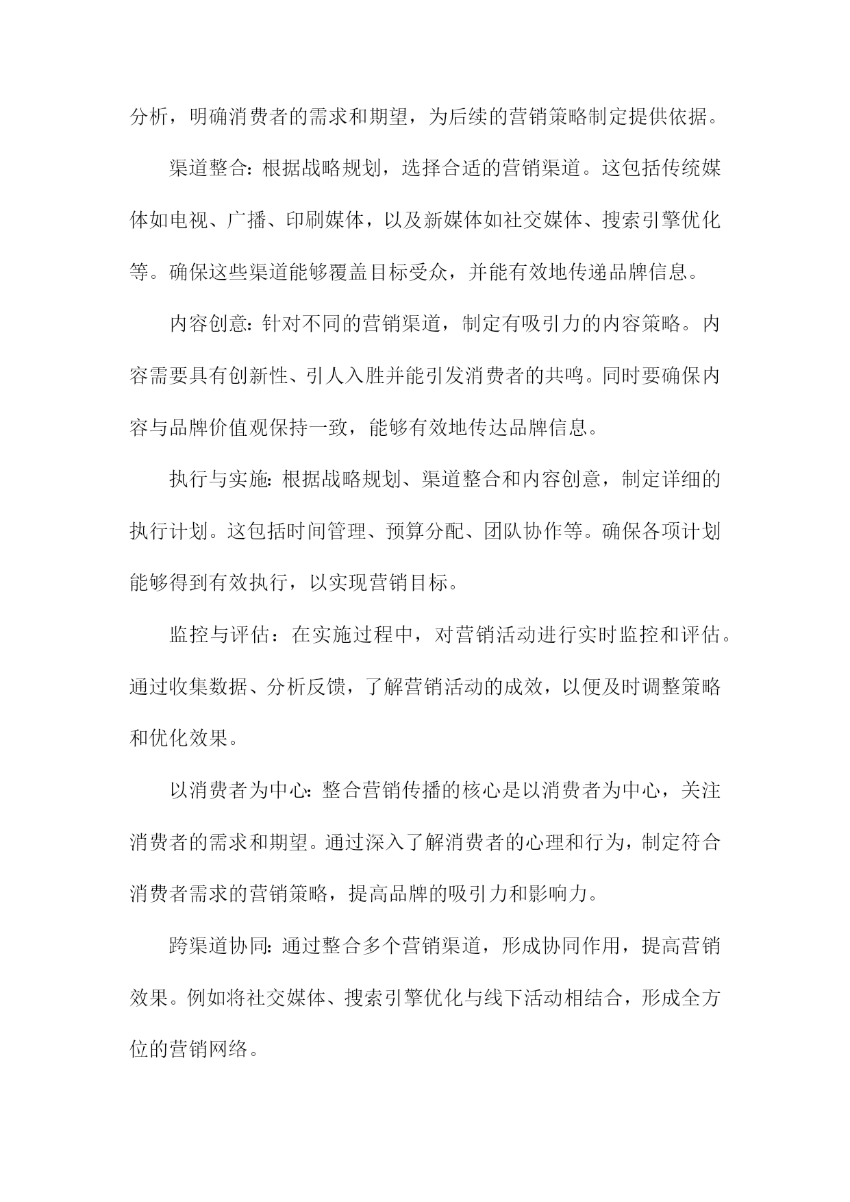 整合营销传播理论案例分析一、概要本文旨在分析整合营销传播理论(IMC理论)在实际案例中的应用情况。整合营销传播作为一种强调协调所有营销传播活动的战略方法,以实现品牌信息的一致性和最大化效果。本文将选取某一具有代表性的企业或品牌作为案例研究对象,通过对其营销传播策略进行深入剖析,探讨其如何运用整合营销传播理论来推动品牌发展、增强品牌影响力以及提高市场占有率。文章将围绕案例的背景介绍、IMC理论的运用、实际效果评估以及启示等方面展开,为读者呈现一个生动且实用的整合营销传播理论案例分析。1.介绍整合营销传播理论的概念及其在现代商业中的重要性整合营销传播(IMC,IntegratedMarketingCommunication)理论,作为一种新型的营销理念,是现代营销传播领域的重要组成部分。其核心理念在于以消费者为中心,以市场营销原理和策略为基础,通过协同的、一体化的传播手段,传递清晰、一致的品牌或产品讯息,以实现营销目标。整合营销传播理论强调的不仅是各种营销工具和手段的简单结合,更强调各个部分之间的协同作用,以实现资源的最优配置和最大的营销效果。在现代商业环境中,整合营销传播理论的重要性日益凸显。随着市场竞争的加剧和消费者需求的多样化,企业需要更加精准、有效地进行营销传播,以赢得市场份额和消费者信任。整合营销传播理论能够帮助企业实现这一目标,它要求企业从全局的视角出发,系统地规划和管理所有的营销活动,确保企业的每一个传播活动都能够相互协调、相互支持,共同为企业的营销目标服务。此外整合营销传播理论还强调以消费者为中心,要求企业深入了解消费者的需求和偏好,以提供更加精准、个性化的产品和服务,满足消费者的期望。整合营销传播理论是现代商业环境中不可或缺的一种营销理念。它能够帮助企业更好地满足消费者需求,提升品牌形象,实现营销目标。通过整合各种营销手段和工具,实现协同作用,最大限度地提高营销效果。接下来我们将通过具体的案例分析,深入探讨整合营销传播理论在实际应用中的效果和价值。2.提出本文将通过具体案例分析来探讨整合营销传播理论的应用在深入剖析整合营销传播理论的内涵与外延之后,本文拟通过具体案例分析,深入探讨该理论在实际商业环境中的应用与实践。选择案例分析的方法,旨在将理论与实际相结合,通过真实的企业营销实践,揭示整合营销传播理论的现实操作性和实际效果。本文将挑选具有代表性的企业或品牌,对其在营销传播过程中的策略进行全面分析,以展示整合营销传播理论如何指导企业实现营销目标,提高品牌知名度与影响力,最终实现商业价值。这些案例将涵盖不同行业、不同规模的企业,以反映整合营销传播理论的普遍适用性。通过对这些案例的深入研究,我们将解析企业在整合营销传播过程中的策略制定、执行和调整,探讨其面临的挑战和机遇,从而更加全面、深入地理解整合营销传播理论的实际运用。同时通过案例分析,也将为其他企业提供借鉴和参考,推动整合营销传播理论的进一步发展。通过这样的分析,本文将揭示整合营销传播理论如何在实际应用中发挥作用,为企业解决实际问题,创造商业价值。本文希望通过具体案例分析的方式,使读者对整合营销传播理论有更深刻的理解和认识,为现代企业提供有益的启示和指导。二、整合营销传播理论概述整合营销传播(IntegratedMarketingCommunications,简称IMC)理论是现代营销领域的重要理论之一,其核心思想是以消费者为中心,强调企业各个方面的营销活动,包括广告、公关、销售推广、直接营销等,都应该协同合作,形成一个统一的前锋,向消费者传递清晰、一致的品牌信息。这种理论主张打破传统的营销传播方式中的渠道壁垒,通过各种营销手段的结合与协同,实现营销效果最大化。消费者导向:整合营销传播理论强调营销活动的核心目标是满足消费者的需求和期望,因此所有的营销策略和行动都应围绕消费者展开。协同合作:整合营销传播主张企业内部的各个部门(如广告、公关、销售等)以及外部合作伙伴(如供应商、分销商等)之间的紧密合作,共同构建和传播品牌信息。统一的前锋:整合营销传播追求通过各种营销手段的结合与协同,形成一个统一的市场形象和信息传递系统,确保消费者在任何接触点都能接收到一致的品牌信息。多元化的传播渠道:整合营销传播充分利用各种传播渠道(如传统媒体、社交媒体、数字营销等),以最大化地覆盖目标受众。整合营销传播理论对于现代企业而言具有重要的指导意义,在当今市场竞争日益激烈的环境下,企业需要通过整合营销传播来建立强大的品牌形象,加强与消费者的沟通和互动,以实现营销目标。同时整合营销传播还要求企业具备高度敏锐的市场洞察力和应变能力,以迅速响应市场变化和消费者需求的变化。1.整合营销传播的定义与特点首先整合营销传播强调信息的一致性,无论是通过何种渠道传递信息